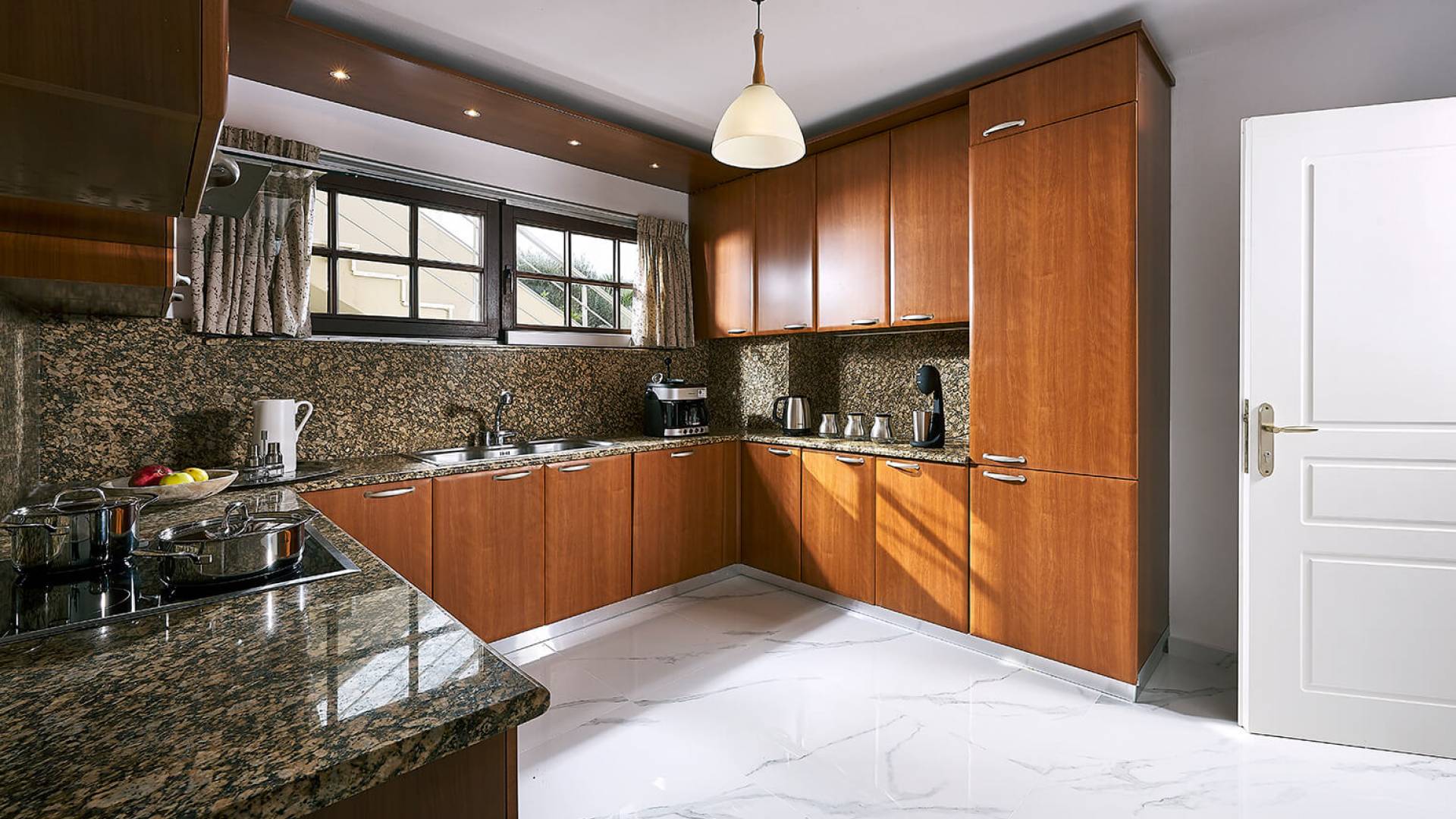 Στο ισόγειο της βίλας (στο επίπεδο της πισίνας) υπάρχει ένα μεγάλο σαλόνι, μια μελέτη με επιφάνεια εργασίας και ένα μπάνιο με ντους. Επίσης στο ισόγειο, υπάρχει γυμναστήριο με εξοπλισμό γυμναστικής. Στον πρώτο όροφο (ισόγειο από την κύρια είσοδο της βίλας) υπάρχει μεγάλο σαλόνι και τραπεζαρία, κουζίνα, μπάνιο με τζακούζι, άλλο μπάνιο με ντους και μεγάλη βεράντα με υπέροχη θέα στη θάλασσα και στην πισίνα Ε Υπάρχει επίσης μεγάλη τηλεόραση και κλιματισμός.