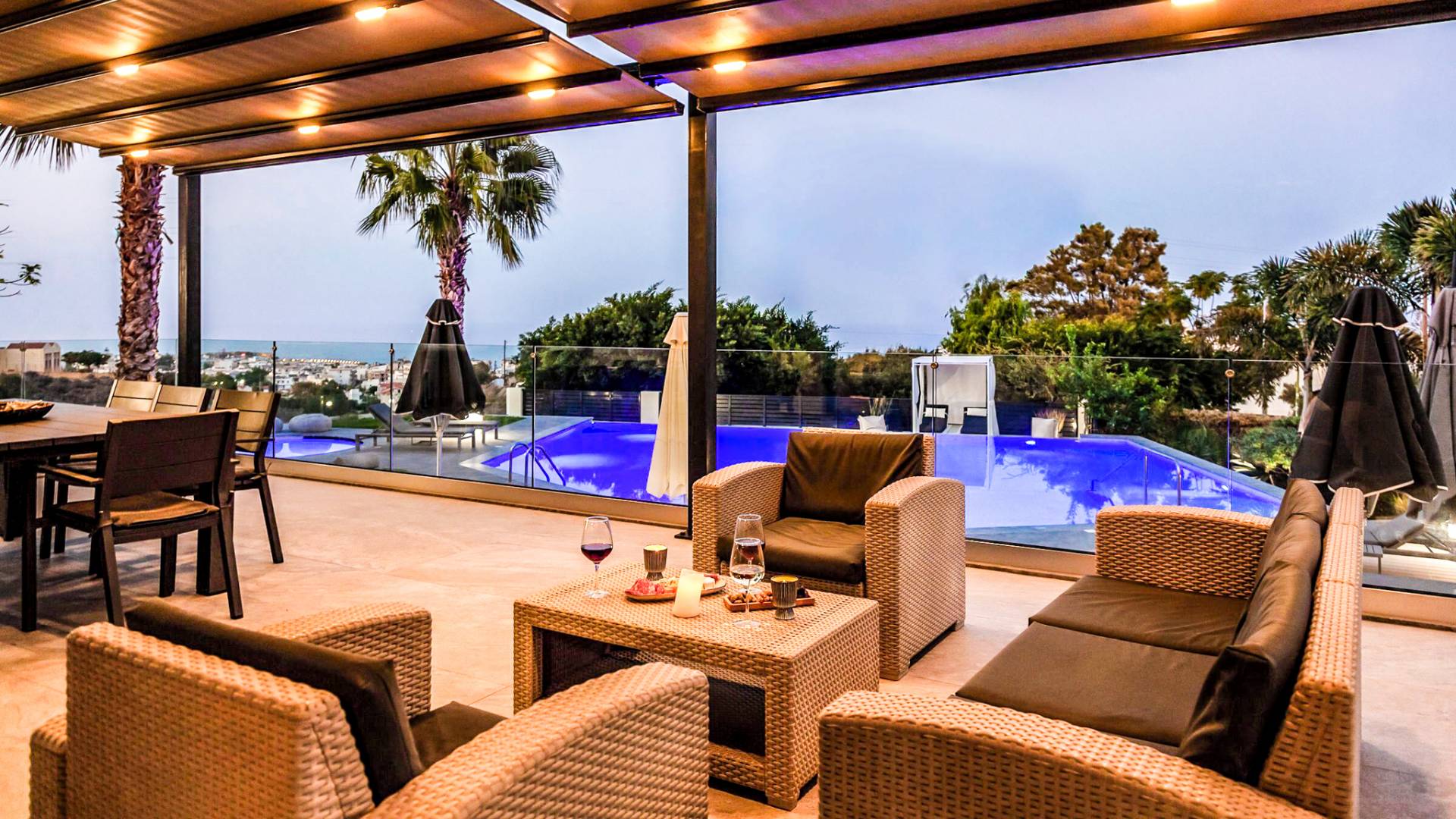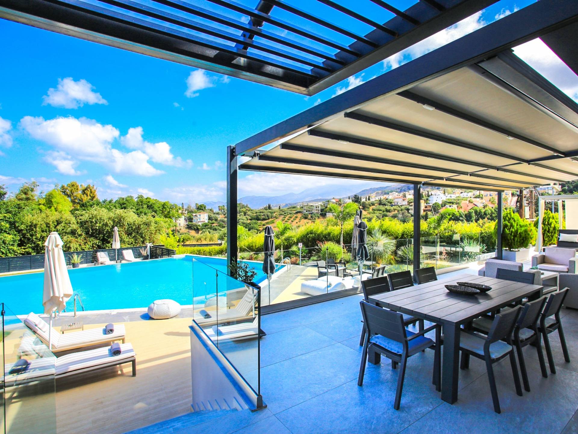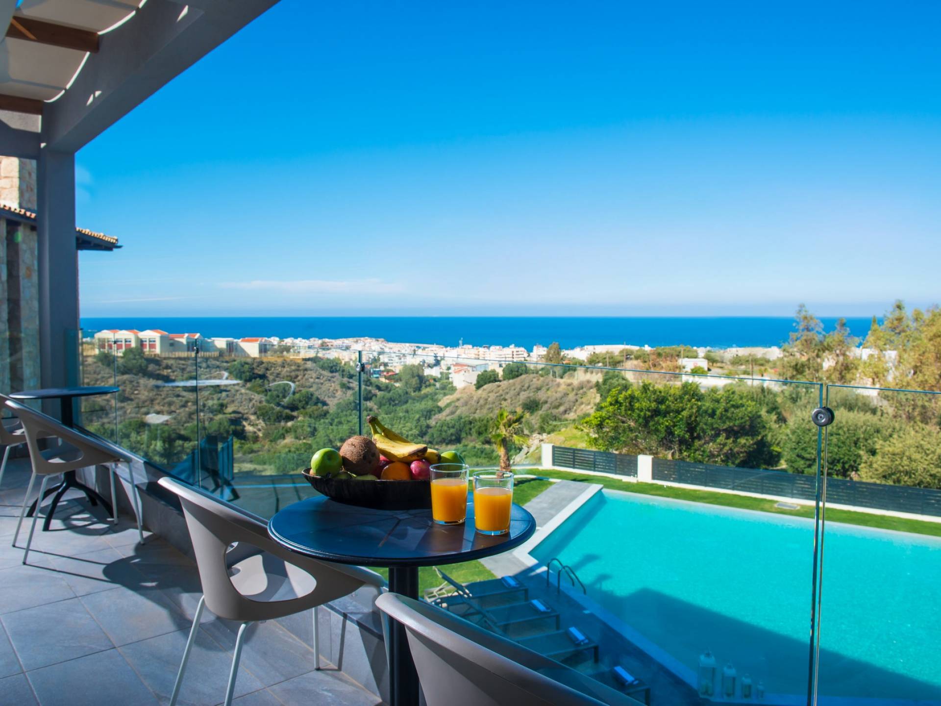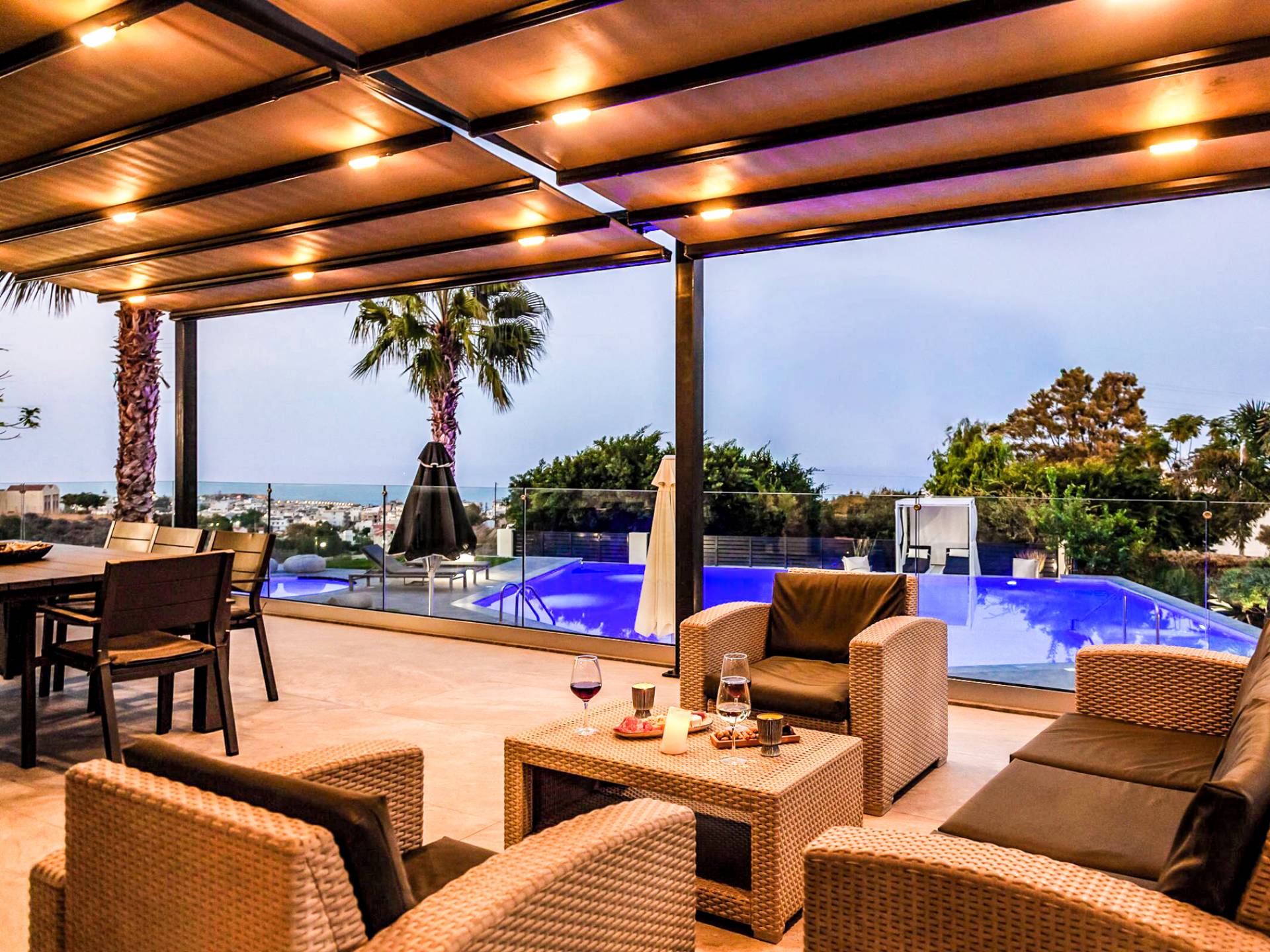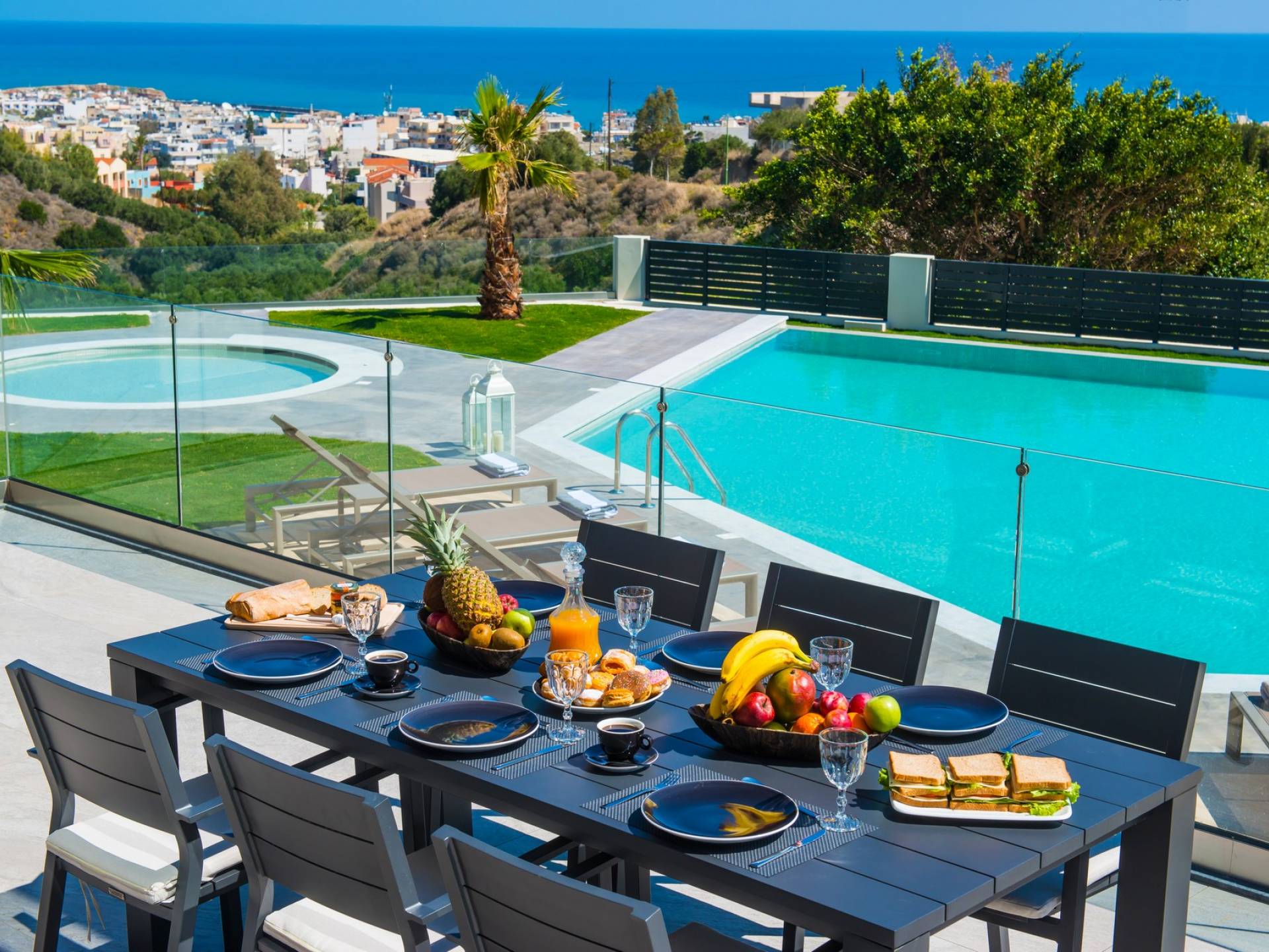 Στο ισόγειο μεγάλα παράθυρα που ανοίγουν στη μεγάλη βεράντα, επιπλωμένα με μεγάλη τραπεζαρία με 8 καρέκλες, άνετο σαλόνι και χώρο μπάρμπεκιου, με θέα στον όμορφο απομονωμένο κήπο με τις πισίνες και θέα στο Αιγαίο και το λιμάνι της Χερσονήσου. Η υπαίθρια ζωή δεν θα μπορούσε να είναι πιο διασκεδαστική και χαλαρωτική ταυτόχρονα. Λίγα σκαλοπάτια και μια ράμπα που οδηγεί στο γκαζόν και τη μεγάλη πισίνα υπερχείλισης (126μ²) και την ξεχωριστή παιδική πισίνα, υπαίθριο ντους, άνετες ξαπλώστρες, μικρά τραπεζάκια και ομπρέλες.