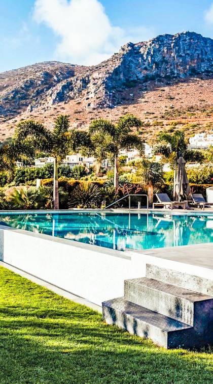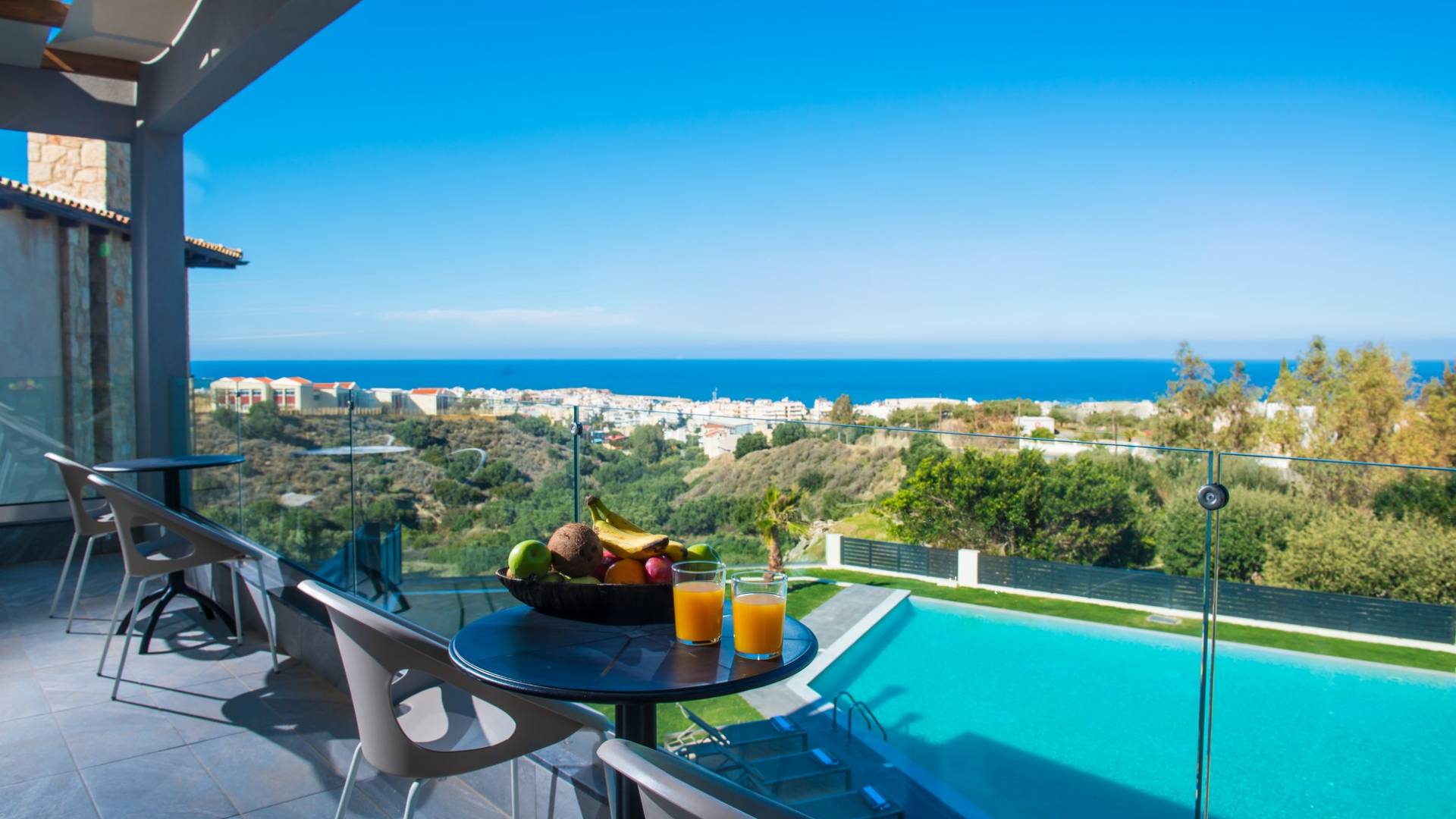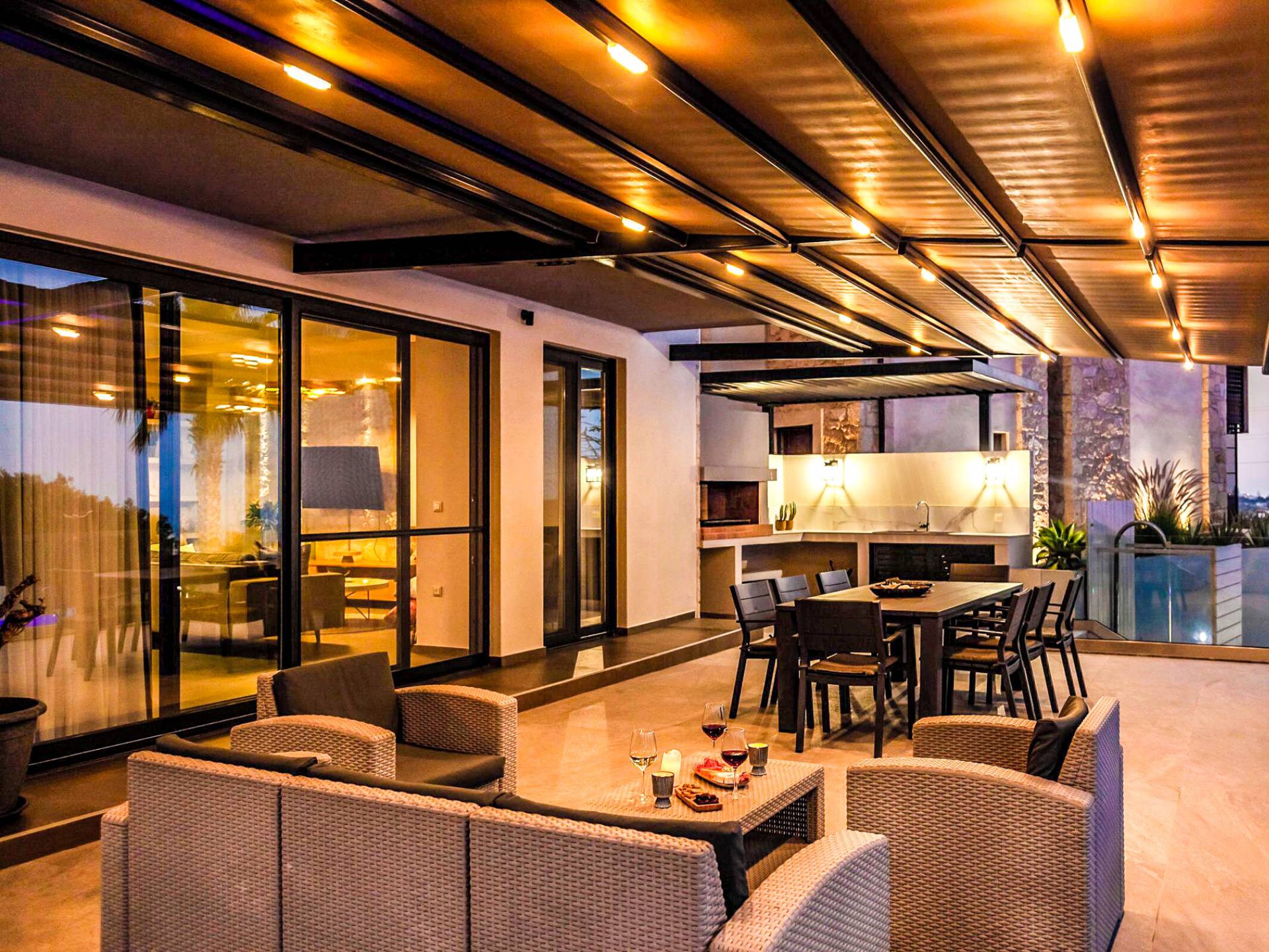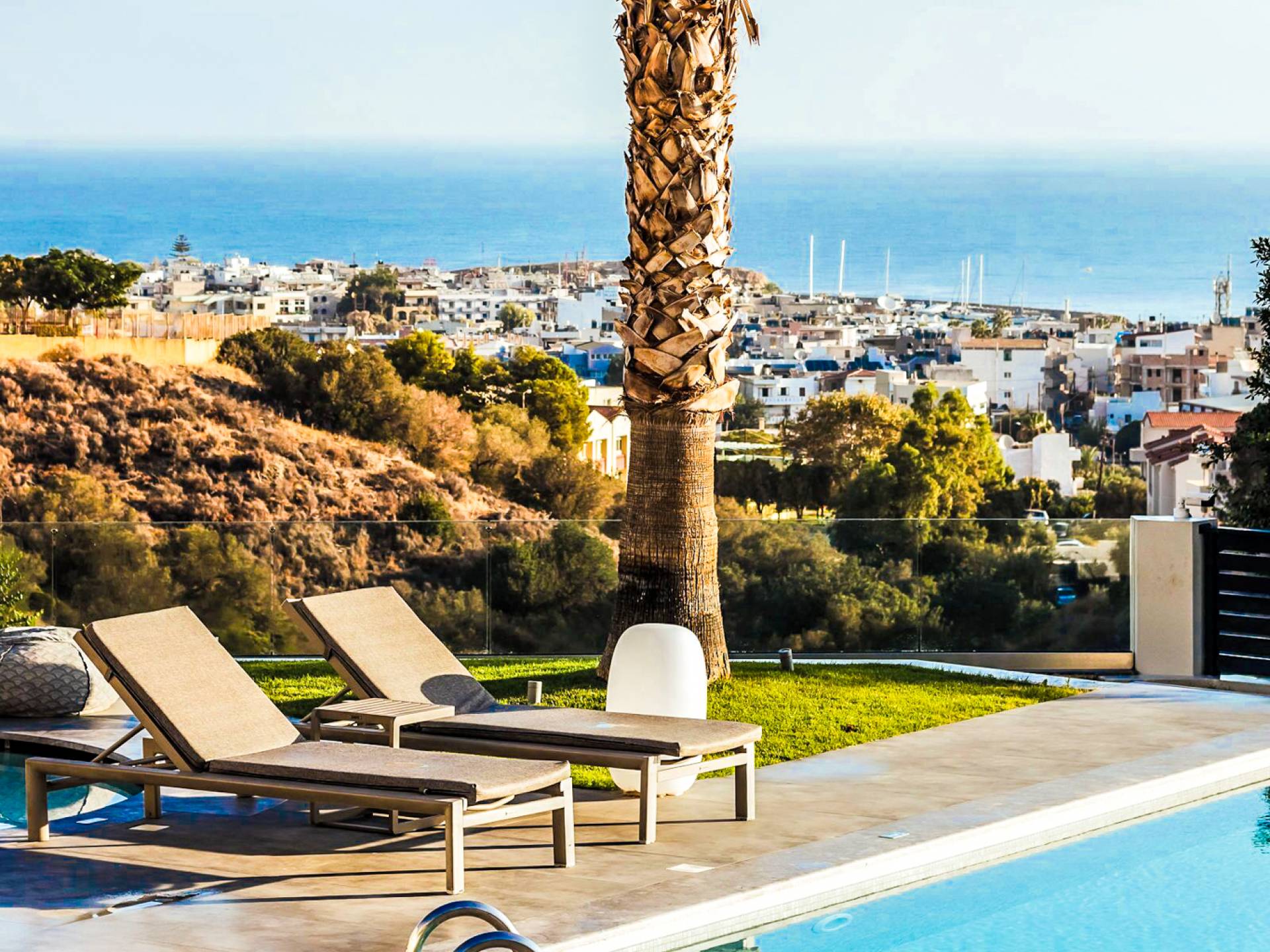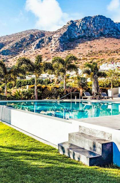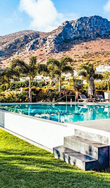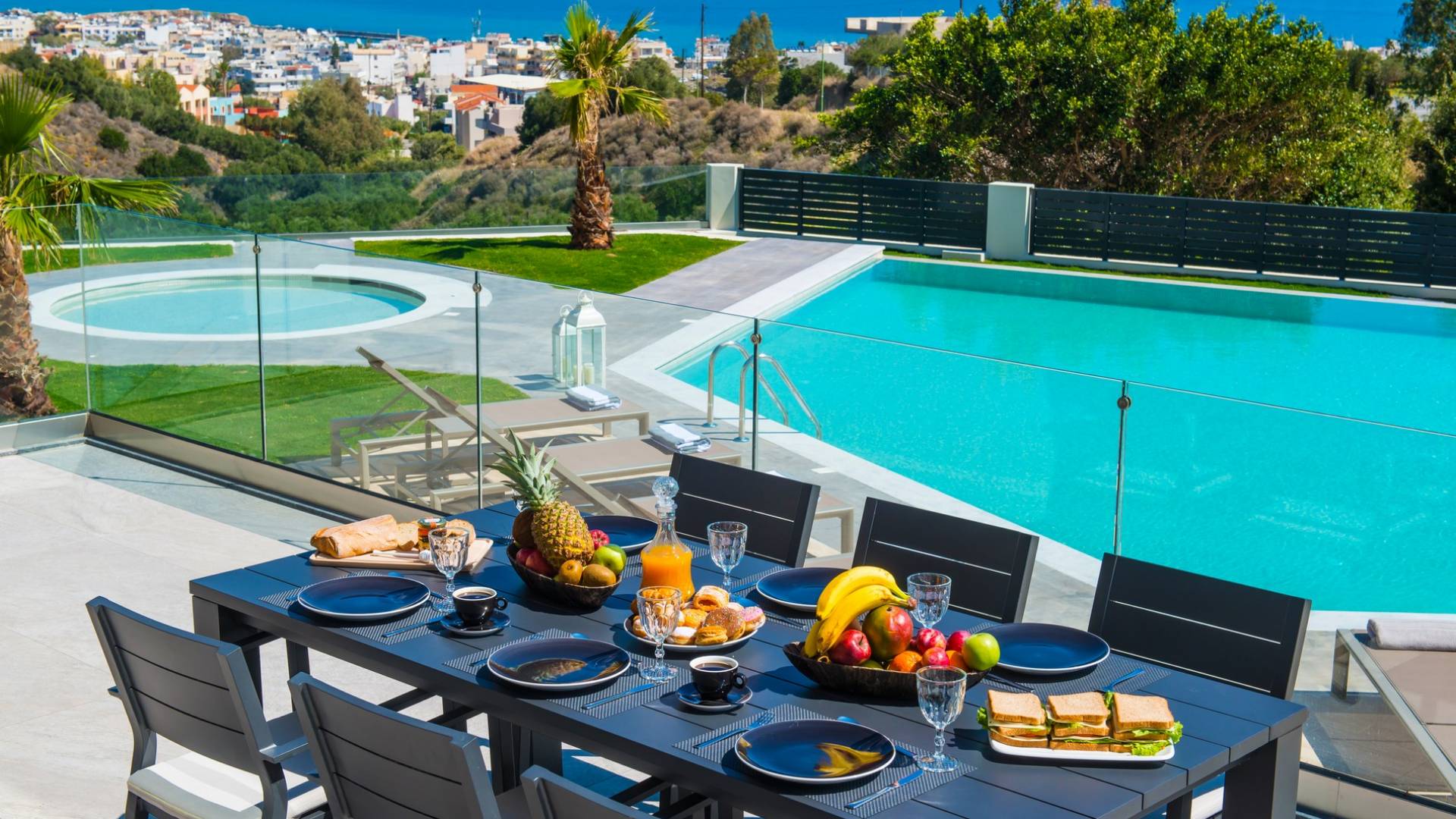 Στο ισόγειο μεγάλα παράθυρα που ανοίγουν στη μεγάλη βεράντα, επιπλωμένα με μεγάλη τραπεζαρία με 8 καρέκλες, άνετο σαλόνι και χώρο μπάρμπεκιου, με θέα στον όμορφο απομονωμένο κήπο με τις πισίνες και θέα στο Αιγαίο και το λιμάνι της Χερσονήσου. Η υπαίθρια ζωή δεν θα μπορούσε να είναι πιο διασκεδαστική και χαλαρωτική ταυτόχρονα. Λίγα σκαλοπάτια και μια ράμπα που οδηγεί στο γκαζόν και τη μεγάλη πισίνα υπερχείλισης (126μ²) και την ξεχωριστή παιδική πισίνα, υπαίθριο ντους, άνετες ξαπλώστρες, μικρά τραπεζάκια και ομπρέλες.