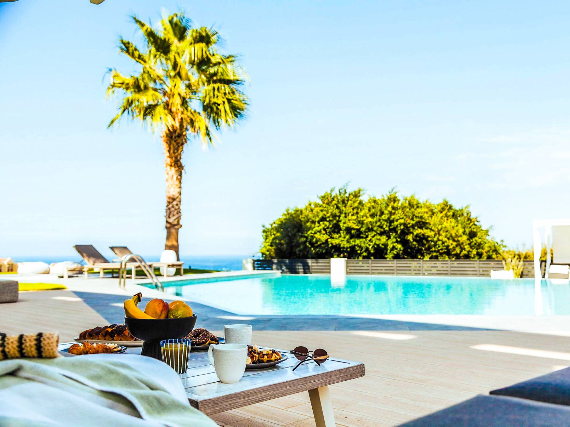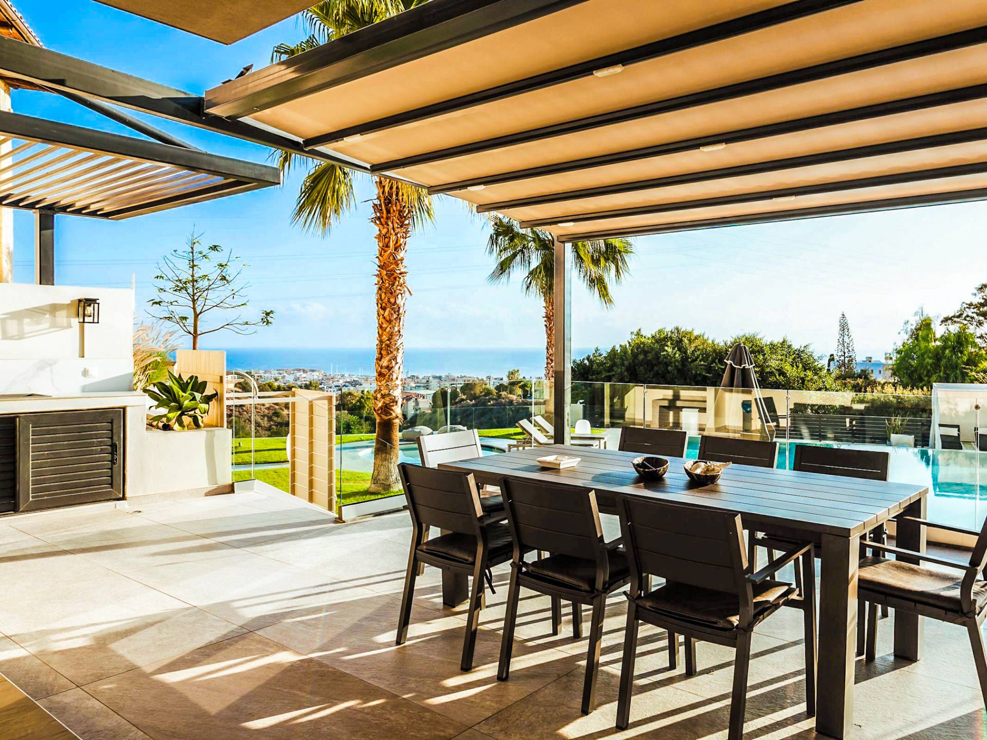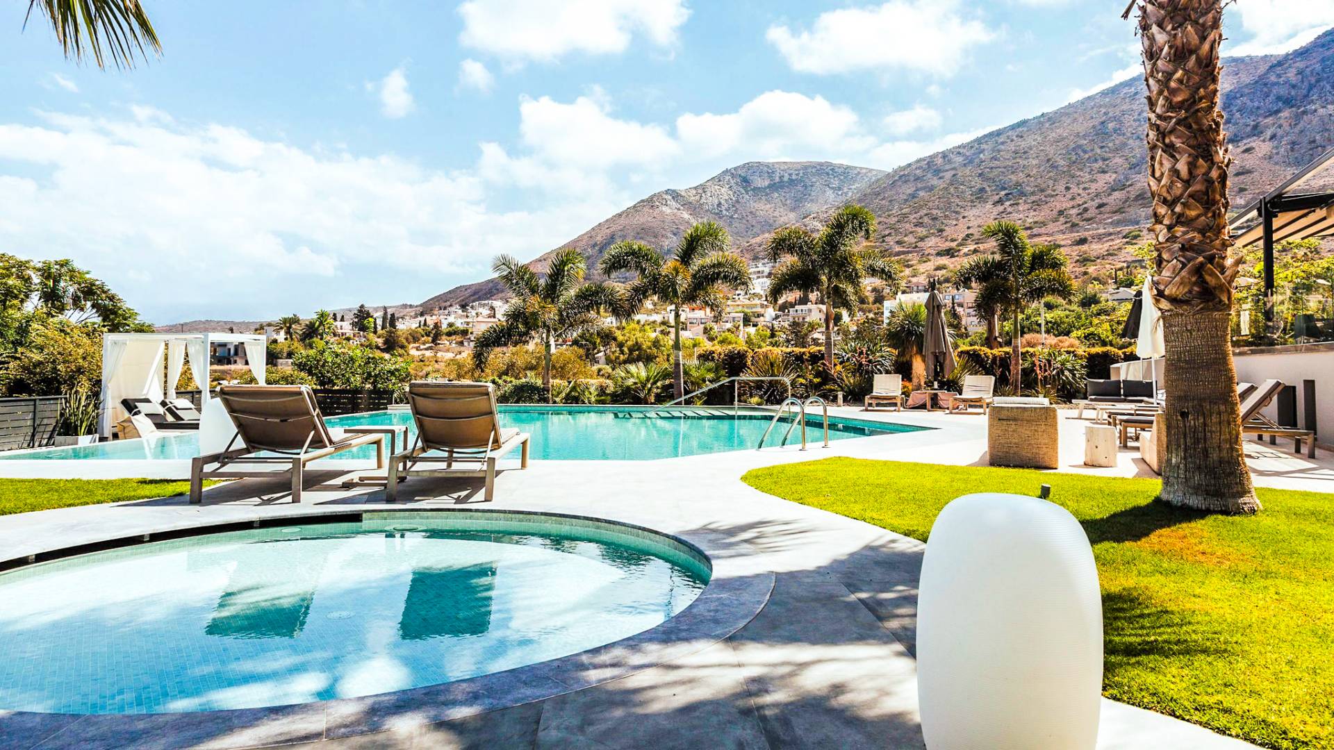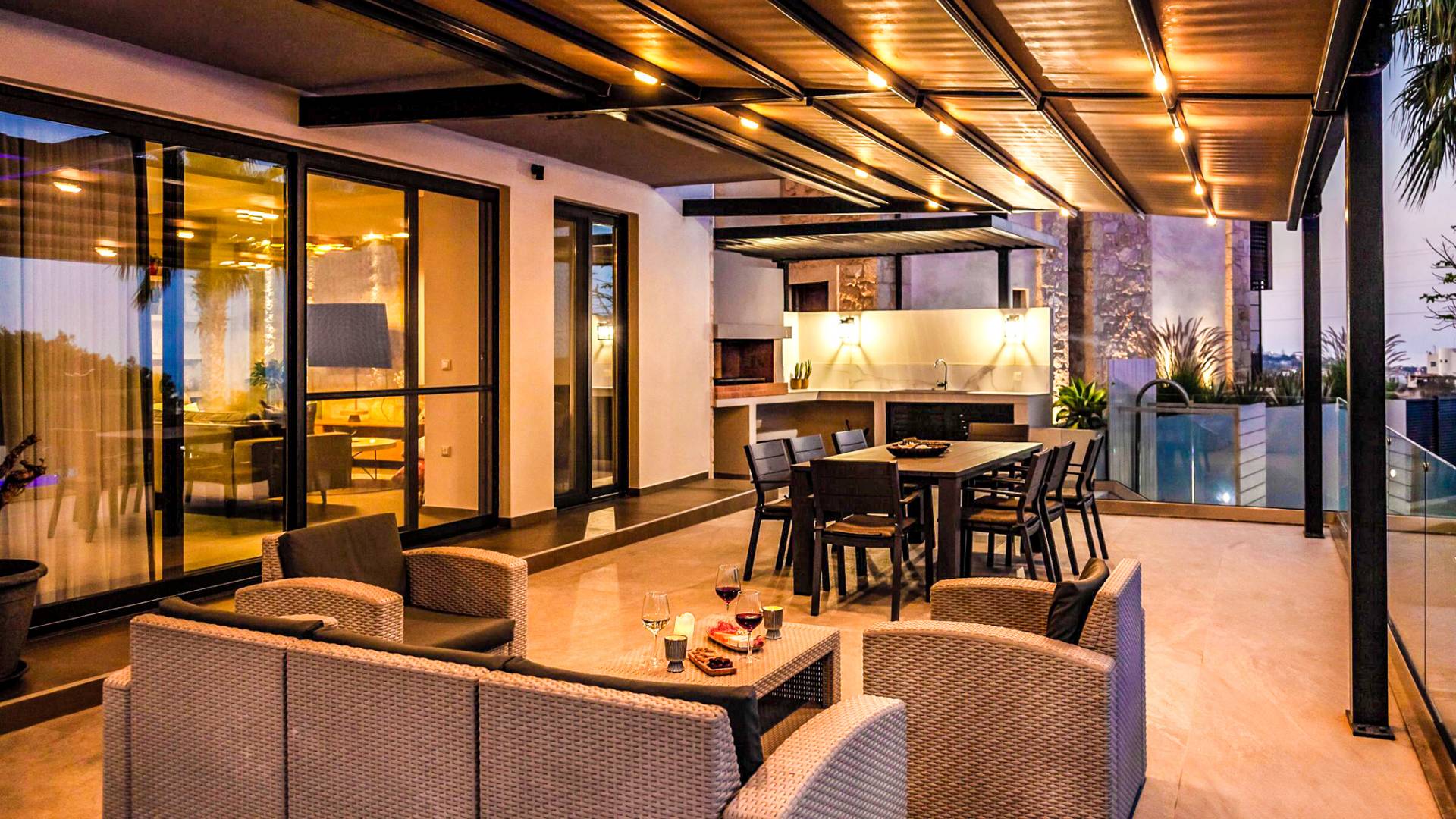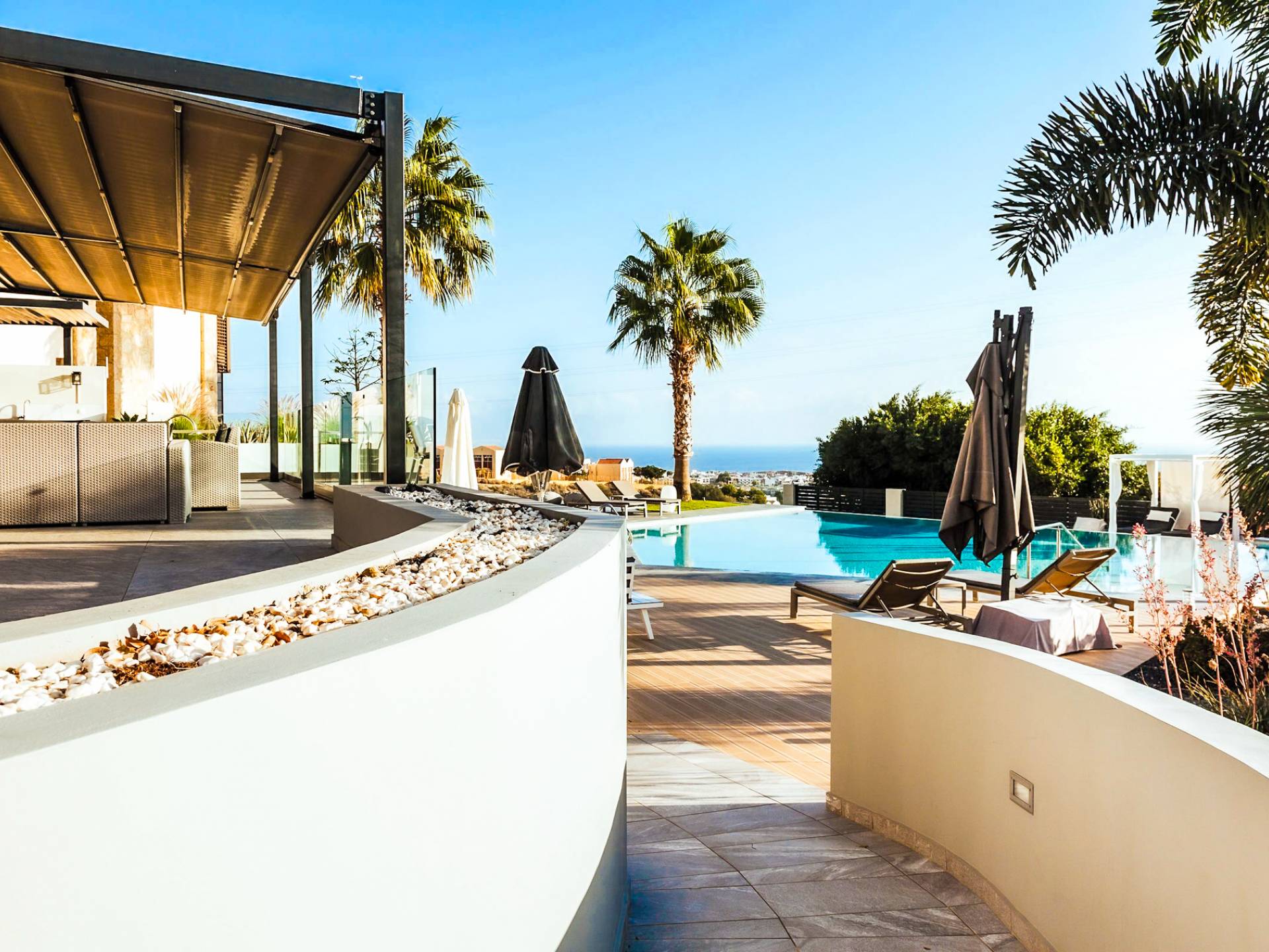 Στο ισόγειο μεγάλα παράθυρα που ανοίγουν στη μεγάλη βεράντα, επιπλωμένα με μεγάλη τραπεζαρία με 8 καρέκλες, άνετο σαλόνι και χώρο μπάρμπεκιου, με θέα στον όμορφο απομονωμένο κήπο με τις πισίνες και θέα στο Αιγαίο και το λιμάνι της Χερσονήσου. Η υπαίθρια ζωή δεν θα μπορούσε να είναι πιο διασκεδαστική και χαλαρωτική ταυτόχρονα. Λίγα σκαλοπάτια και μια ράμπα που οδηγεί στο γκαζόν και τη μεγάλη πισίνα υπερχείλισης (126μ²) και την ξεχωριστή παιδική πισίνα, υπαίθριο ντους, άνετες ξαπλώστρες, μικρά τραπεζάκια και ομπρέλες.