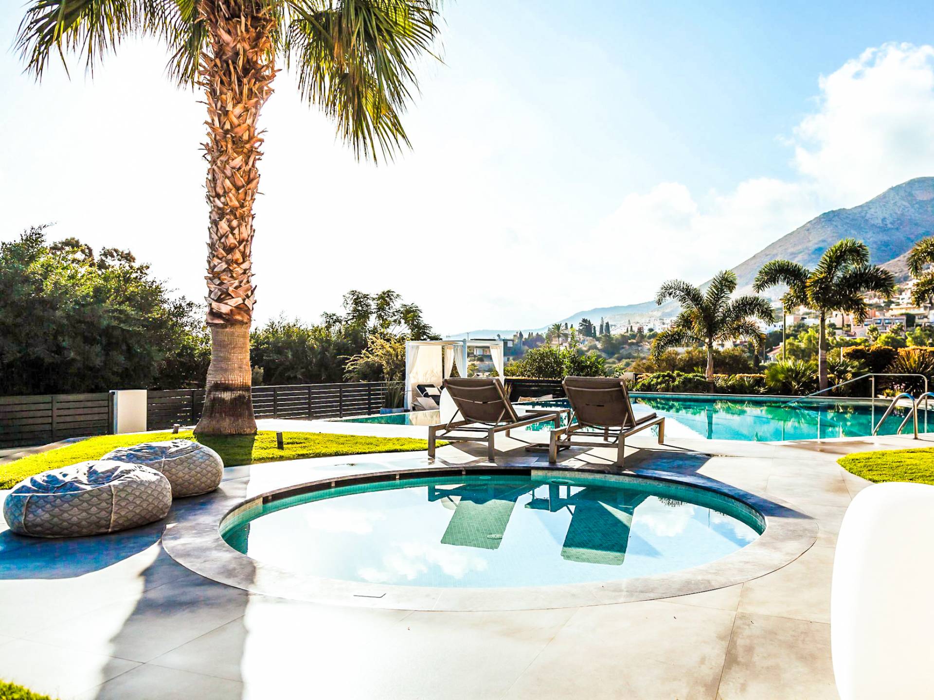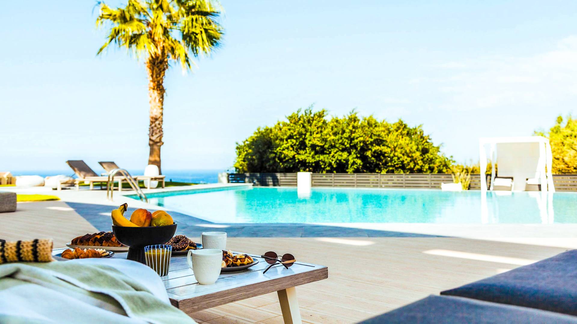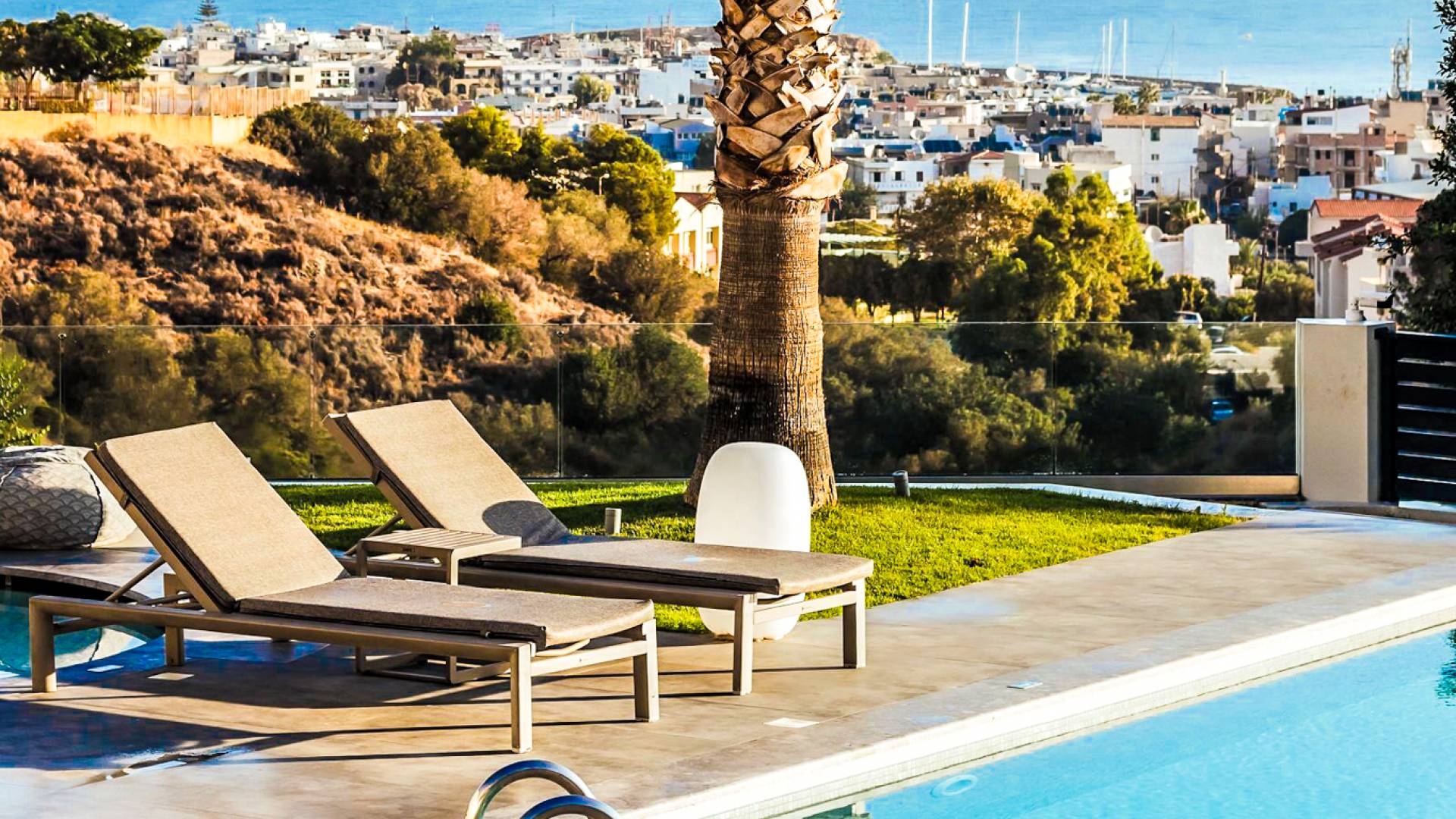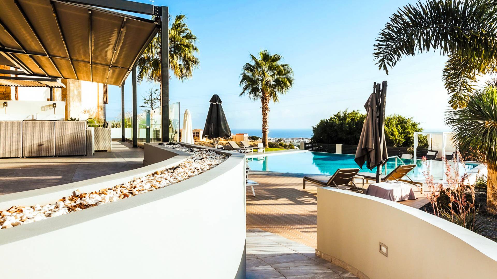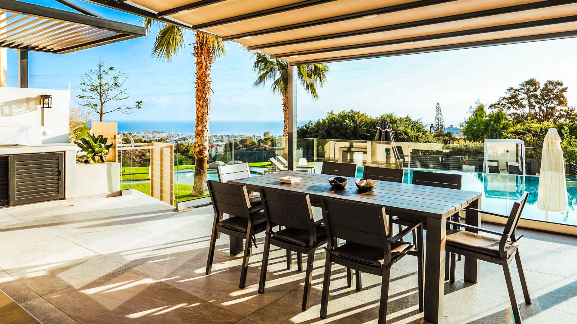 Στο ισόγειο μεγάλα παράθυρα που ανοίγουν στη μεγάλη βεράντα, επιπλωμένα με μεγάλη τραπεζαρία με 8 καρέκλες, άνετο σαλόνι και χώρο μπάρμπεκιου, με θέα στον όμορφο απομονωμένο κήπο με τις πισίνες και θέα στο Αιγαίο και το λιμάνι της Χερσονήσου. Η υπαίθρια ζωή δεν θα μπορούσε να είναι πιο διασκεδαστική και χαλαρωτική ταυτόχρονα. Λίγα σκαλοπάτια και μια ράμπα που οδηγεί στο γκαζόν και τη μεγάλη πισίνα υπερχείλισης (126μ²) και την ξεχωριστή παιδική πισίνα, υπαίθριο ντους, άνετες ξαπλώστρες, μικρά τραπεζάκια και ομπρέλες.