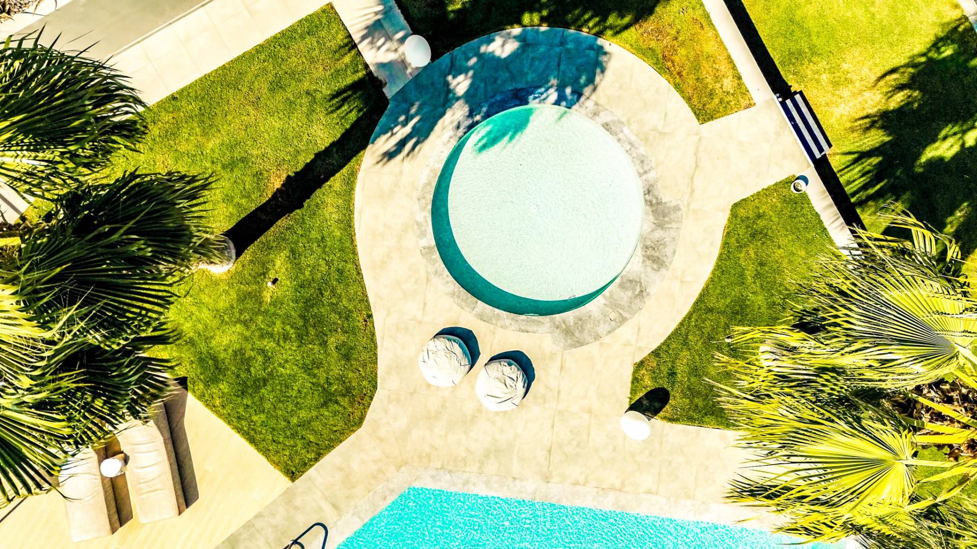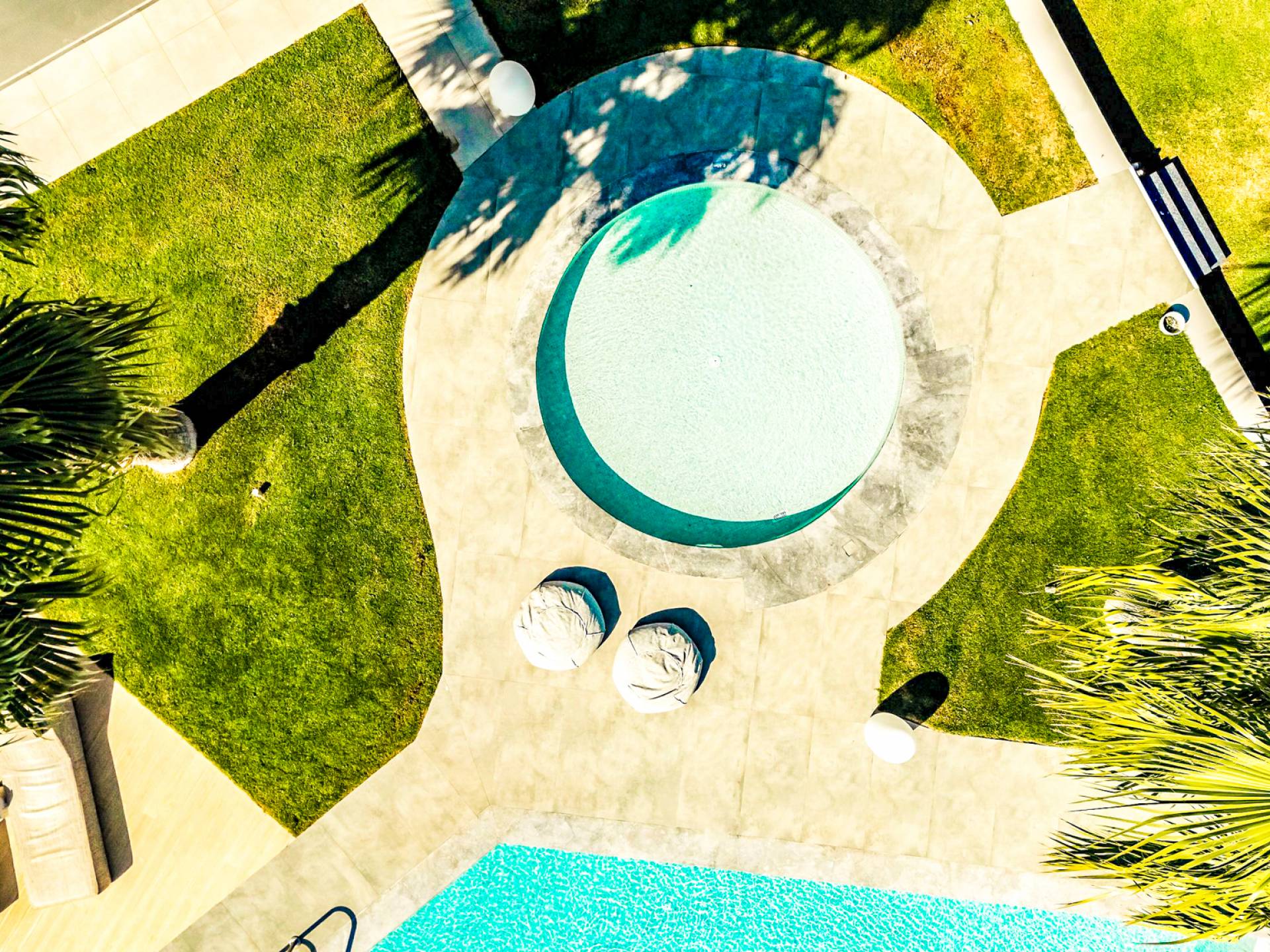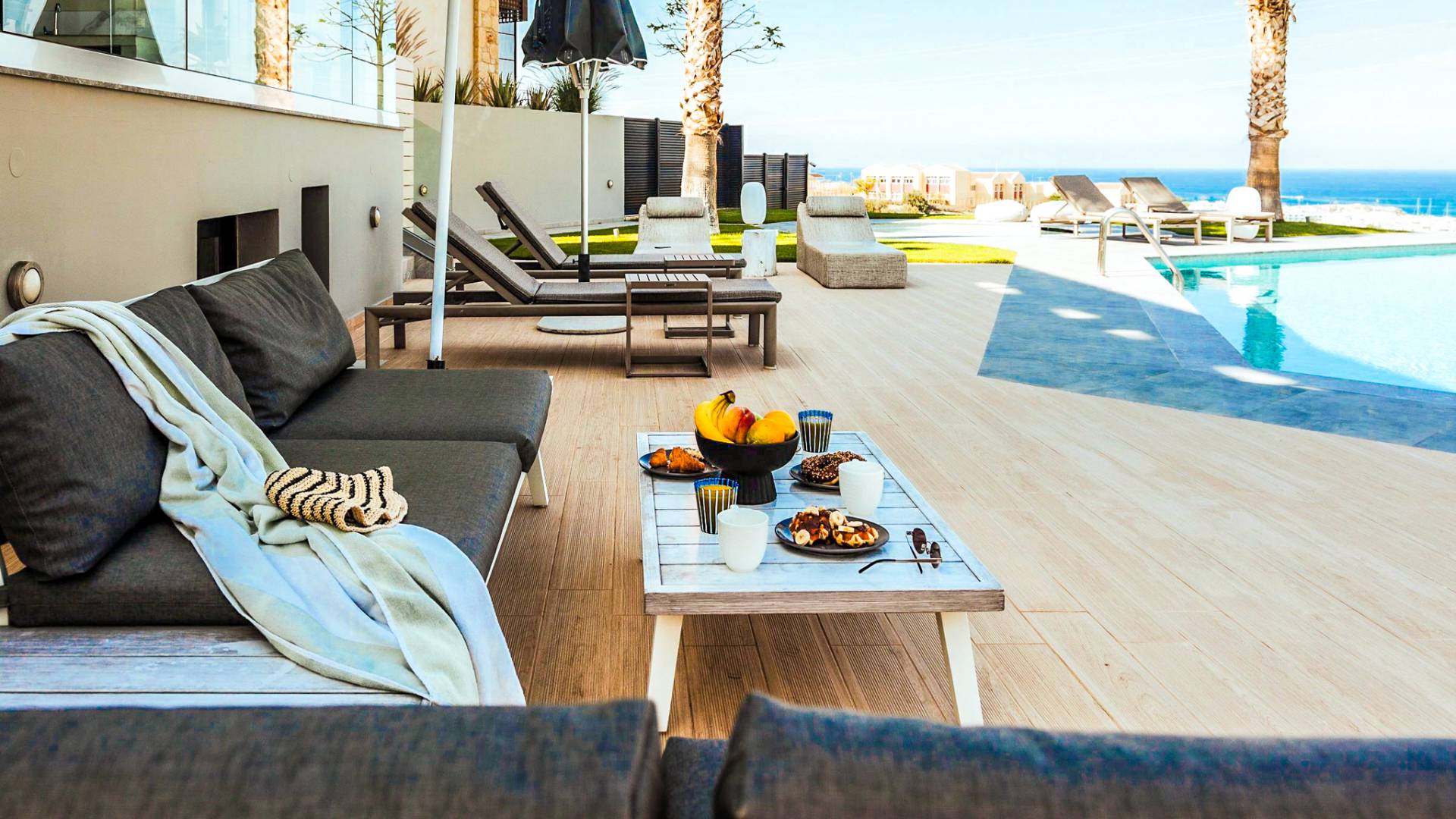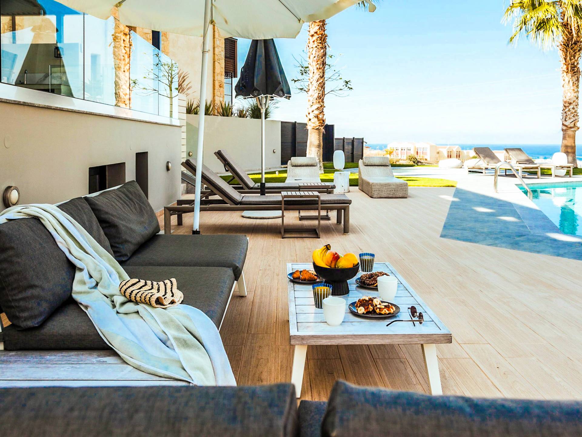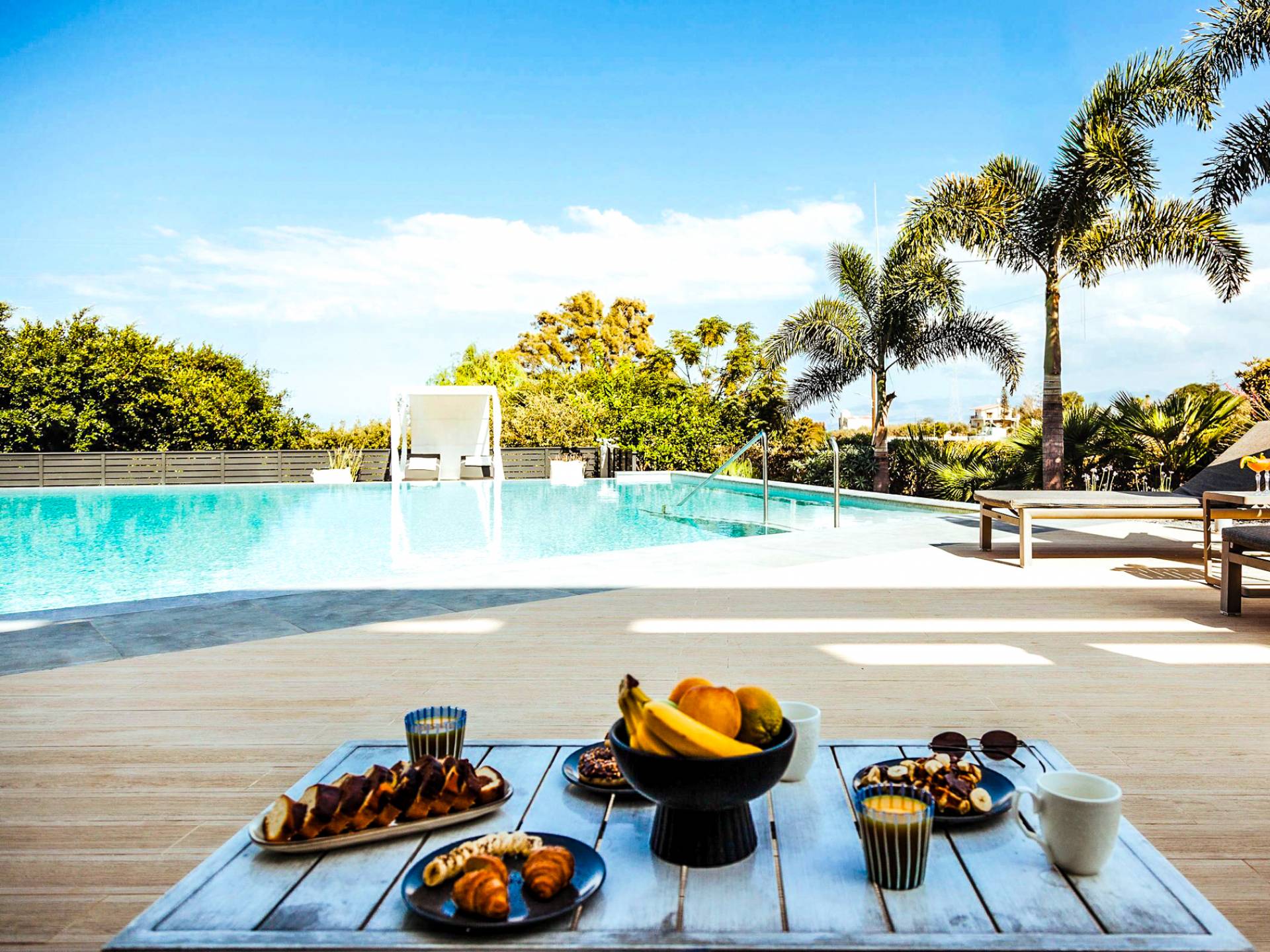 Στο ισόγειο μεγάλα παράθυρα που ανοίγουν στη μεγάλη βεράντα, επιπλωμένα με μεγάλη τραπεζαρία με 8 καρέκλες, άνετο σαλόνι και χώρο μπάρμπεκιου, με θέα στον όμορφο απομονωμένο κήπο με τις πισίνες και θέα στο Αιγαίο και το λιμάνι της Χερσονήσου. Η υπαίθρια ζωή δεν θα μπορούσε να είναι πιο διασκεδαστική και χαλαρωτική ταυτόχρονα. Λίγα σκαλοπάτια και μια ράμπα που οδηγεί στο γκαζόν και τη μεγάλη πισίνα υπερχείλισης (126μ²) και την ξεχωριστή παιδική πισίνα, υπαίθριο ντους, άνετες ξαπλώστρες, μικρά τραπεζάκια και ομπρέλες.