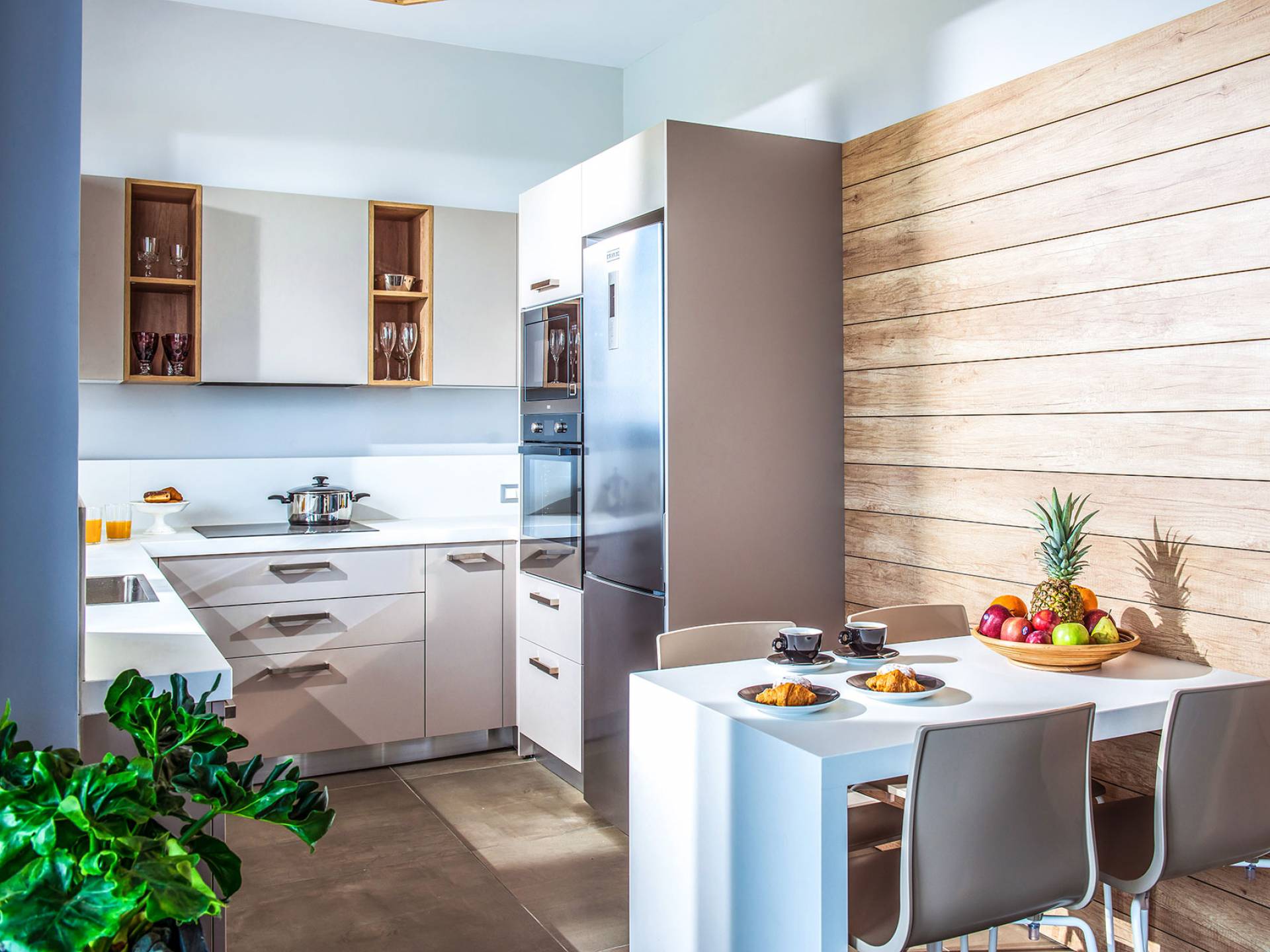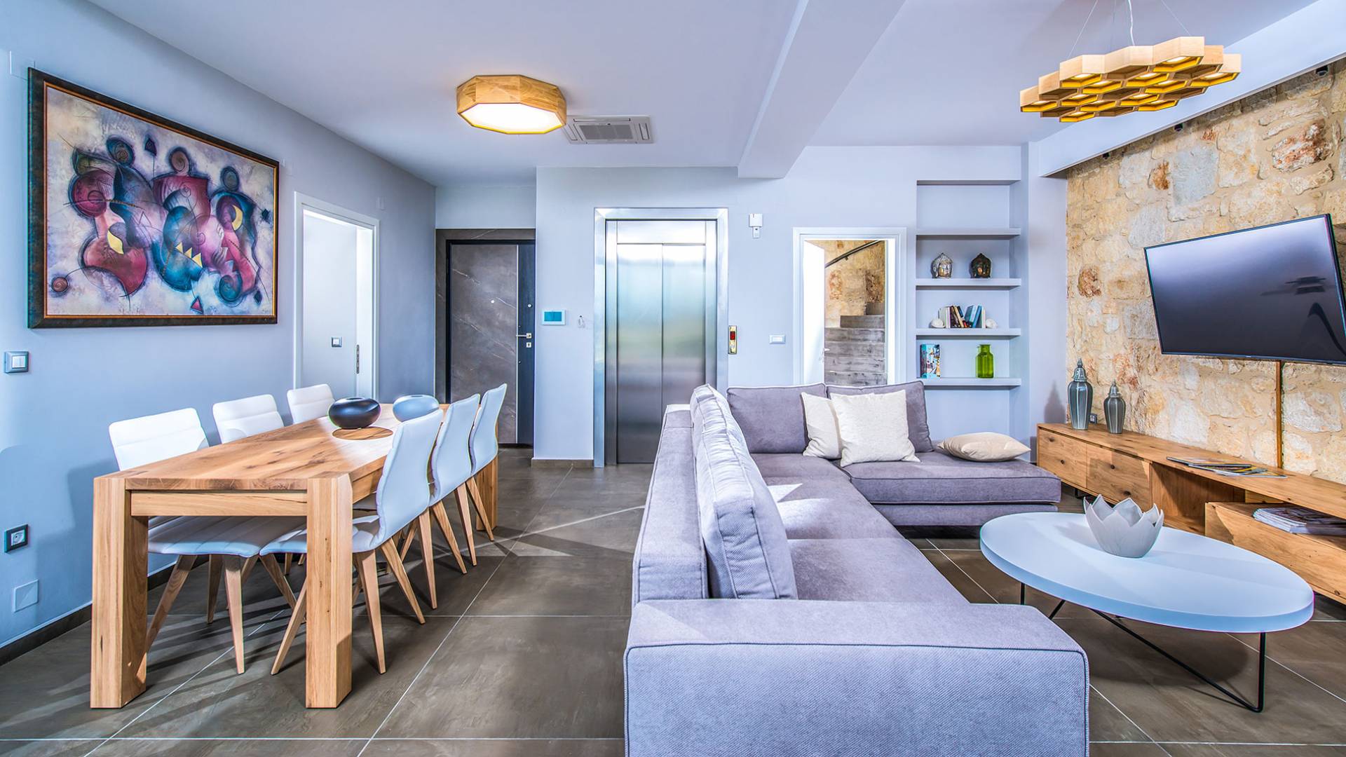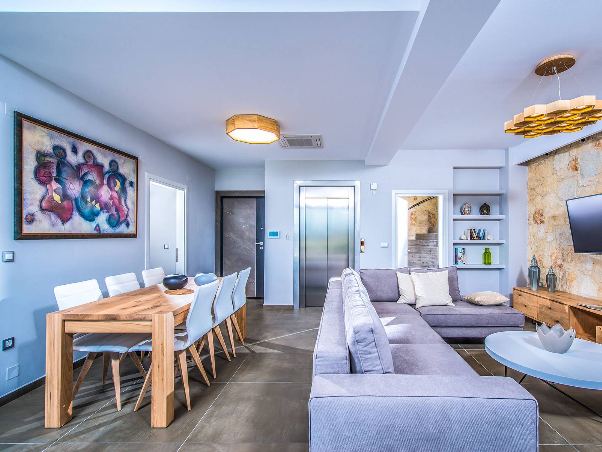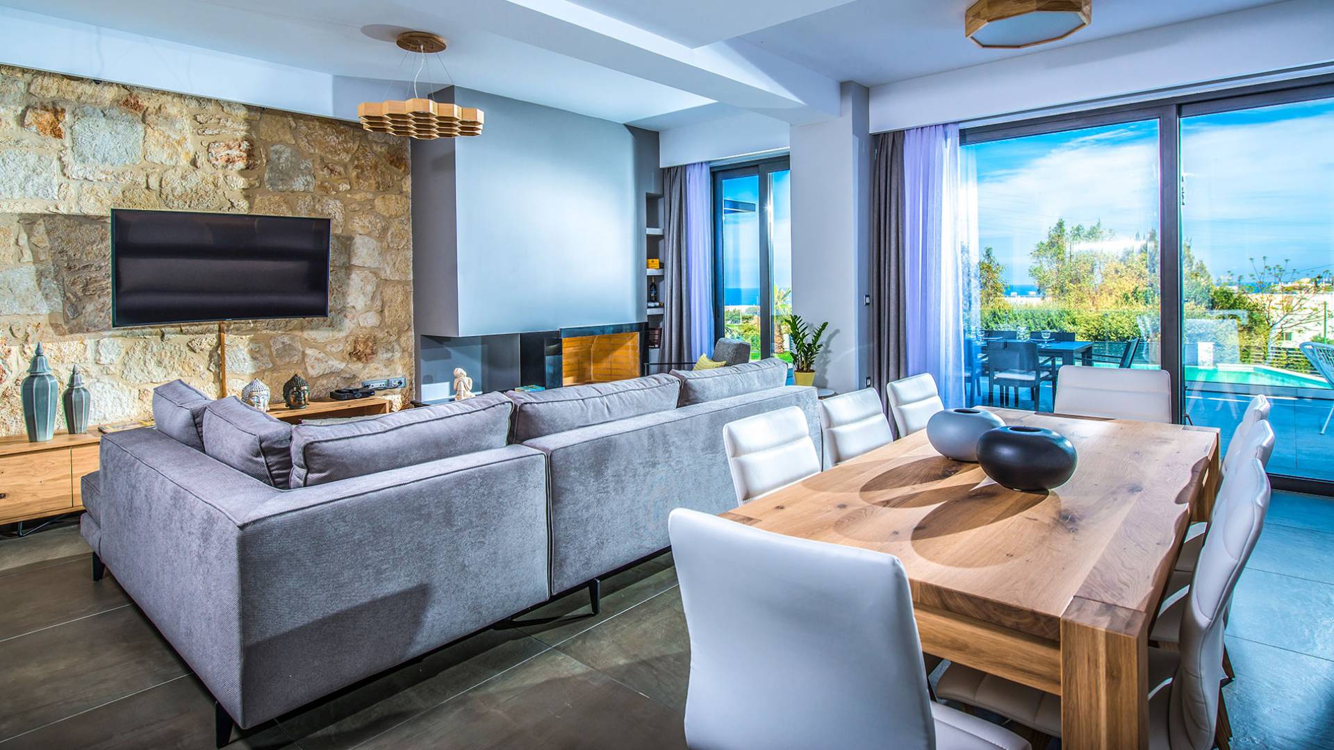 Το άνετο καθιστικό/τραπεζαρία αποτελείται από έναν μοντέρνο γωνιακό καναπέ με τραπεζάκι, έπιπλα υψηλής ποιότητας, τζάκι, Smart TV και τραπεζαρία με 8 άνετες καρέκλες. Η μοντέρνα πλήρως εξοπλισμένη κουζίνα διαθέτει μπαρ με χαμηλή κουζίνα με 4 καρέκλες, ψυγείο/καταψύκτη, πλυντήριο πιάτων, 4 εστίες μαγειρέματος, φούρνο, ενσωματωμένο φούρνο μικροκυμάτων, καφετιέρα εσπρέσο/φίλτρο, τοστιέρα, βραστήρα και αποχυμωτή.