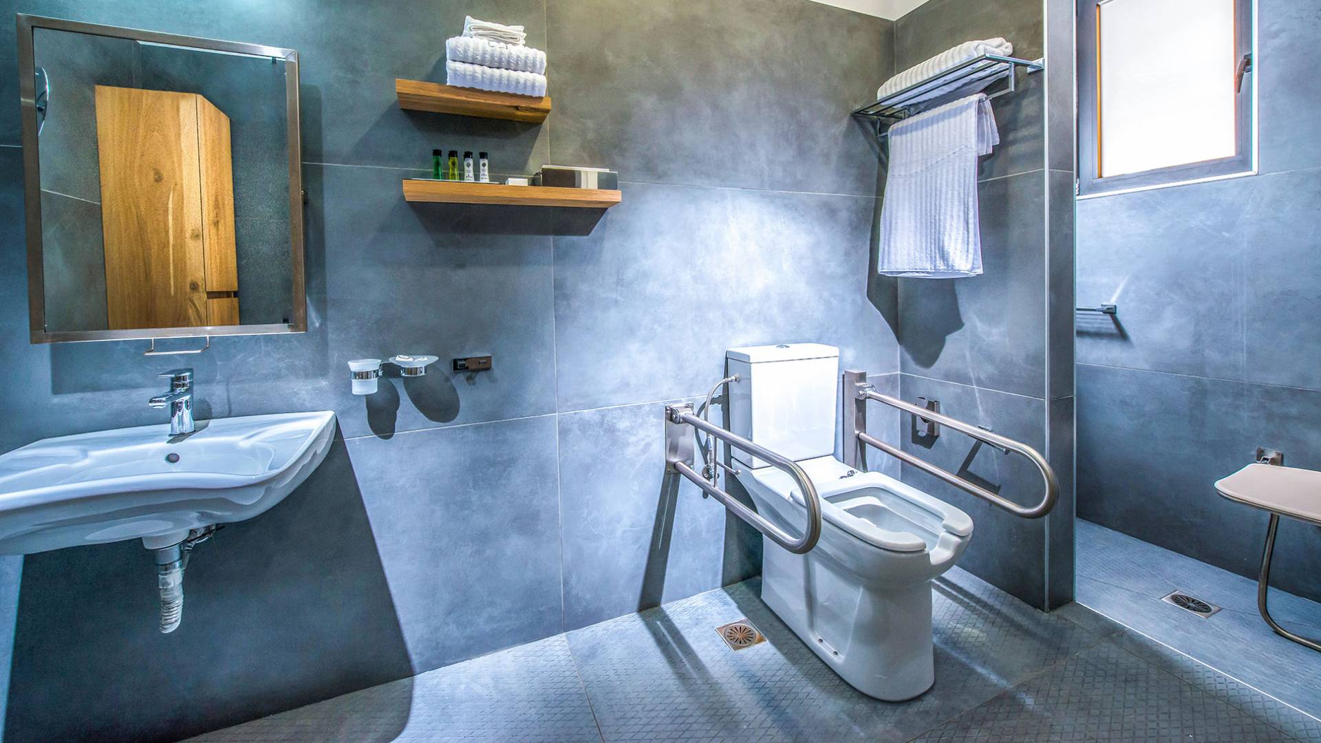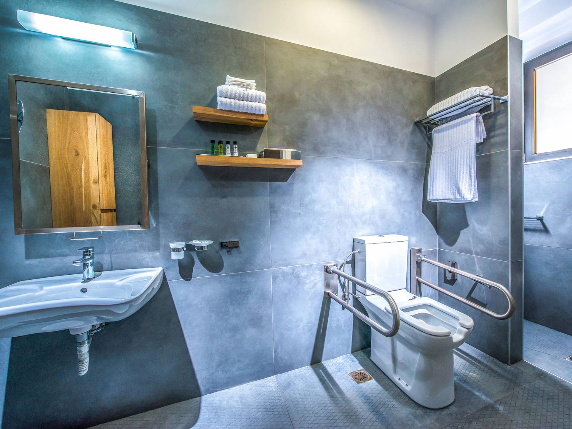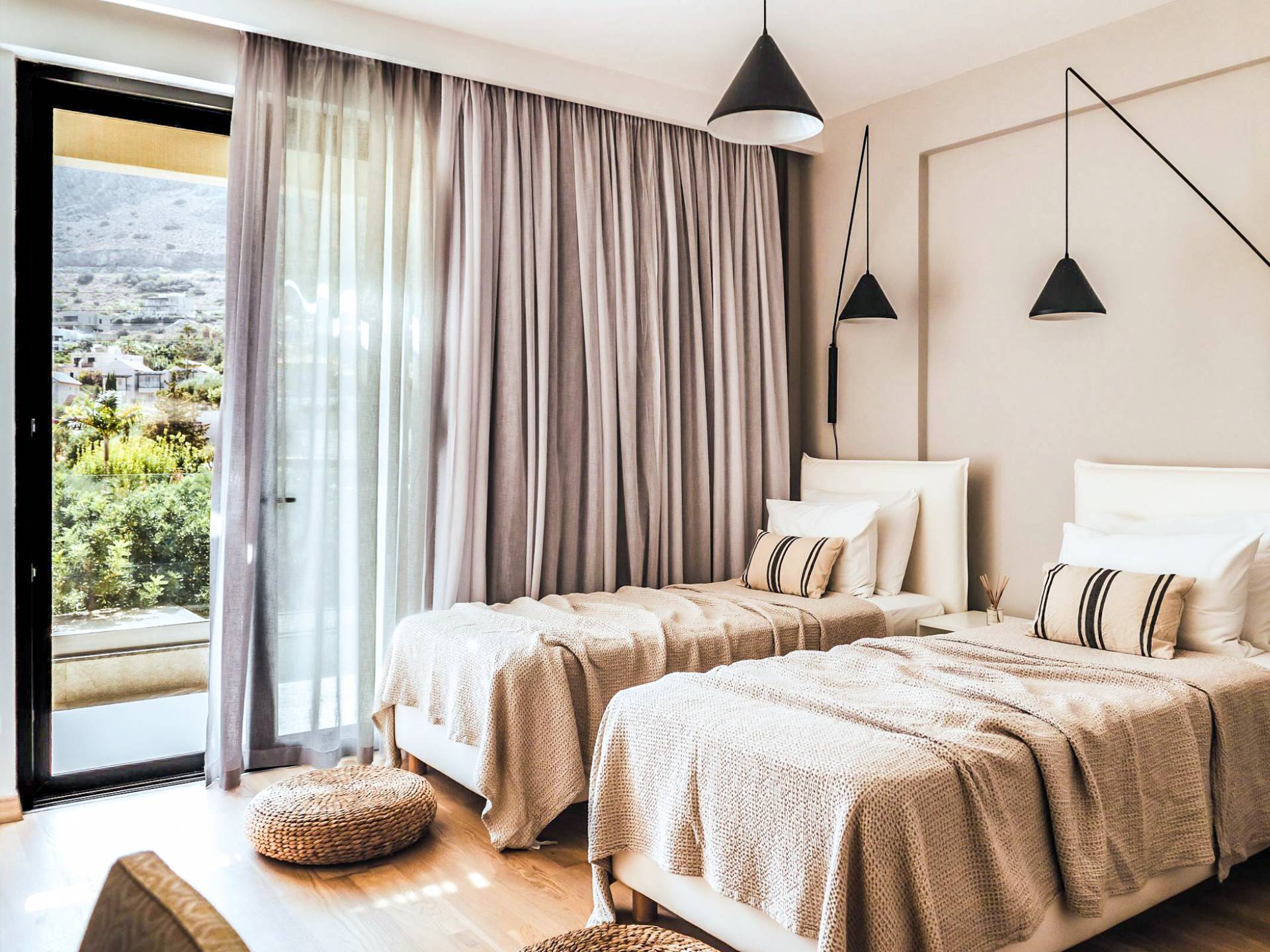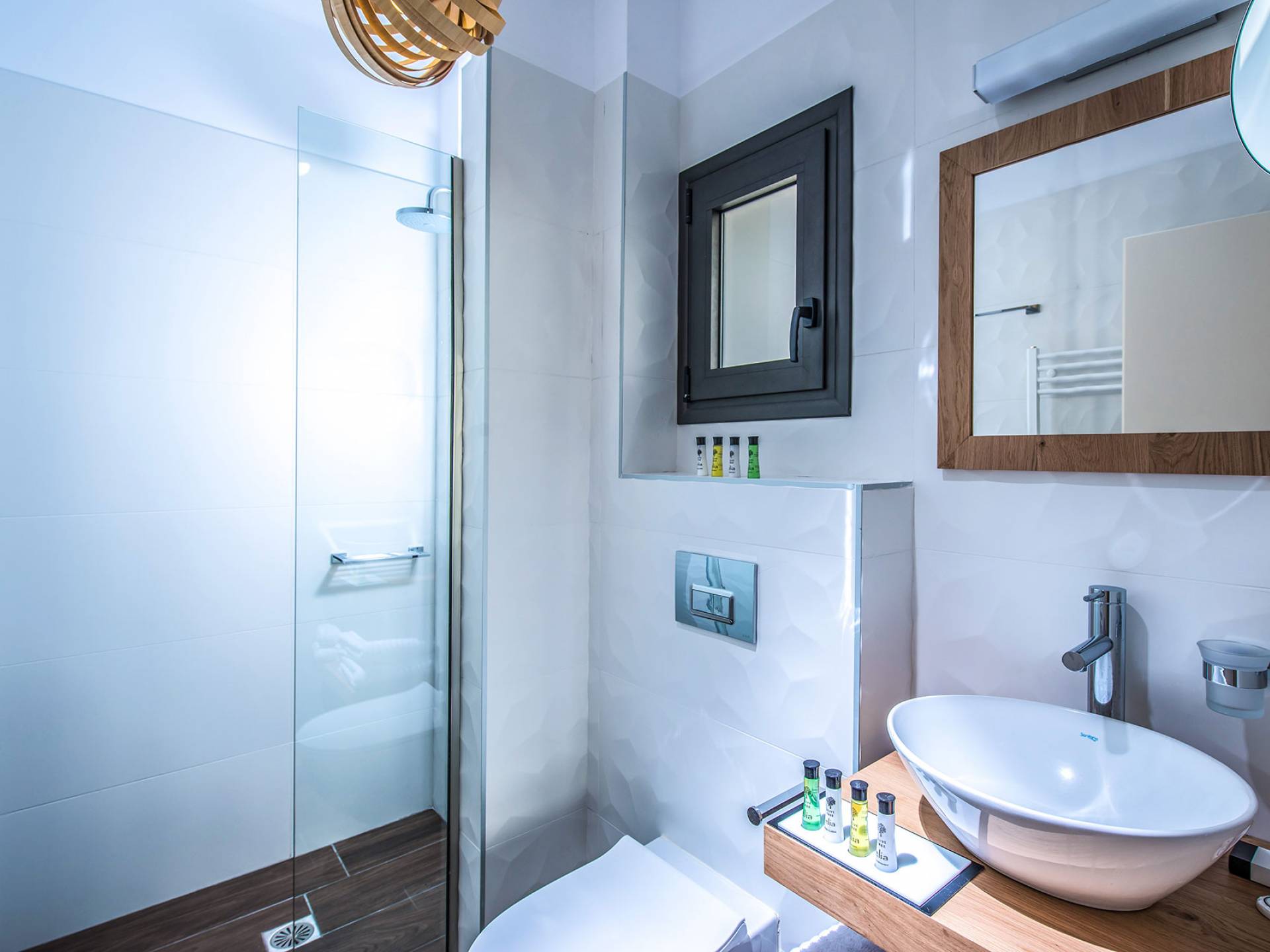Η βίλα με πολυτελή διακόσμηση σε μίνιμαλ στυλ είναι χτισμένη σε τρεις ορόφους, ενώ ένας ανελκυστήρας σας παρέχει εύκολη πρόσβαση σε όλους τους ορόφους. Το γυμναστήριο, η σάουνα, το τζακούζι, η πρόσβαση Wi-Fi, οι τηλεοράσεις Smart σε όλα τα δωμάτια, είναι μερικές από τις ανέσεις του ξενοδοχείου που μπορείτε να απολαύσετε. Η βίλα βρίσκεται στο ισόγειο, το οποίο διαθέτει ενιαίο χώρο καθιστικού/τραπεζαρίας/κουζίνας και ένα υπνοδωμάτιο με δύο μονά κρεβάτια με ιδιωτικό μπάνιο (κάτω νιπτήρας, ψηλότερη τουαλέτα με λαβές στήριξης, ντους roll-in, κάθισμα ντους), προσβάσιμο σε αναπηρικά αμαξίδια, με αυτόνομο κλιματισμό και θέρμανση, τηλεόραση Smart και άνετα κλινοσκεπάσματα. Τα δύο μονά κρεβάτια μπορούν να μετατραπούν σε διπλό κρεβάτι με κάλυμμα στρώματος.