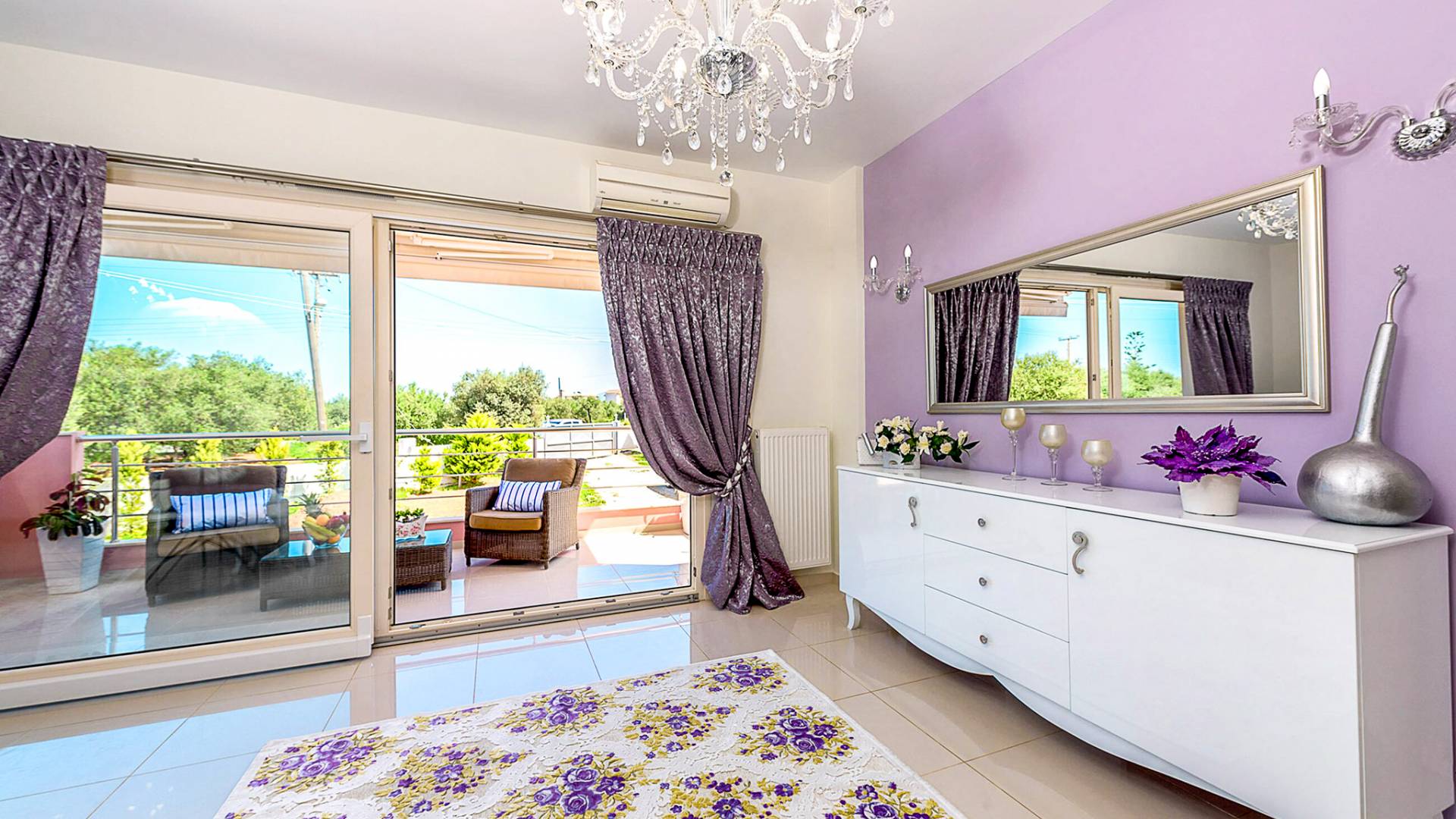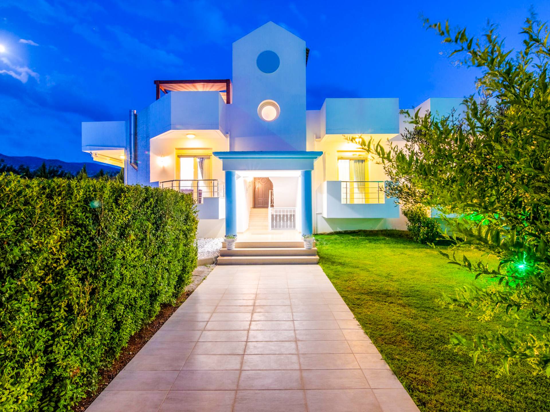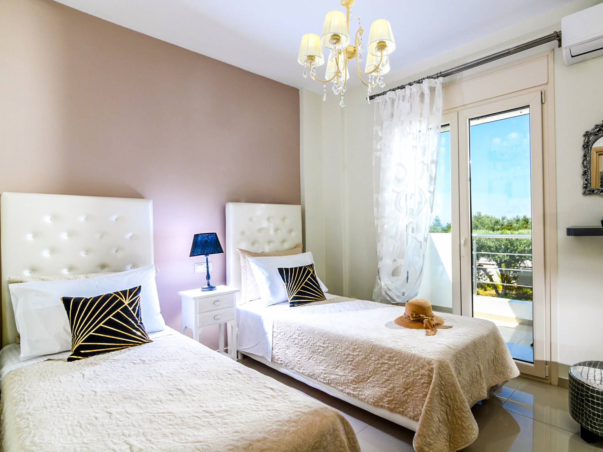 Villa Auro Hersonissos - Η νεόδμητη βίλα είναι μια πολυτελής βίλα ενοικίασης 2000 τμ με λουλούδια, γκαζόν και ελαιώνα. Είναι 140 τμ. Το ισόγειο είναι υπερυψωμένο αρχιτεκτονικό και εξοπλισμένο ως εξής: 1ο υπνοδωμάτιο με queen κρεβάτι, ιδιωτικό WC, γκαρνταρόμπα, τηλεόραση και μπαλκόνι με θέα στον ελαιώνα.