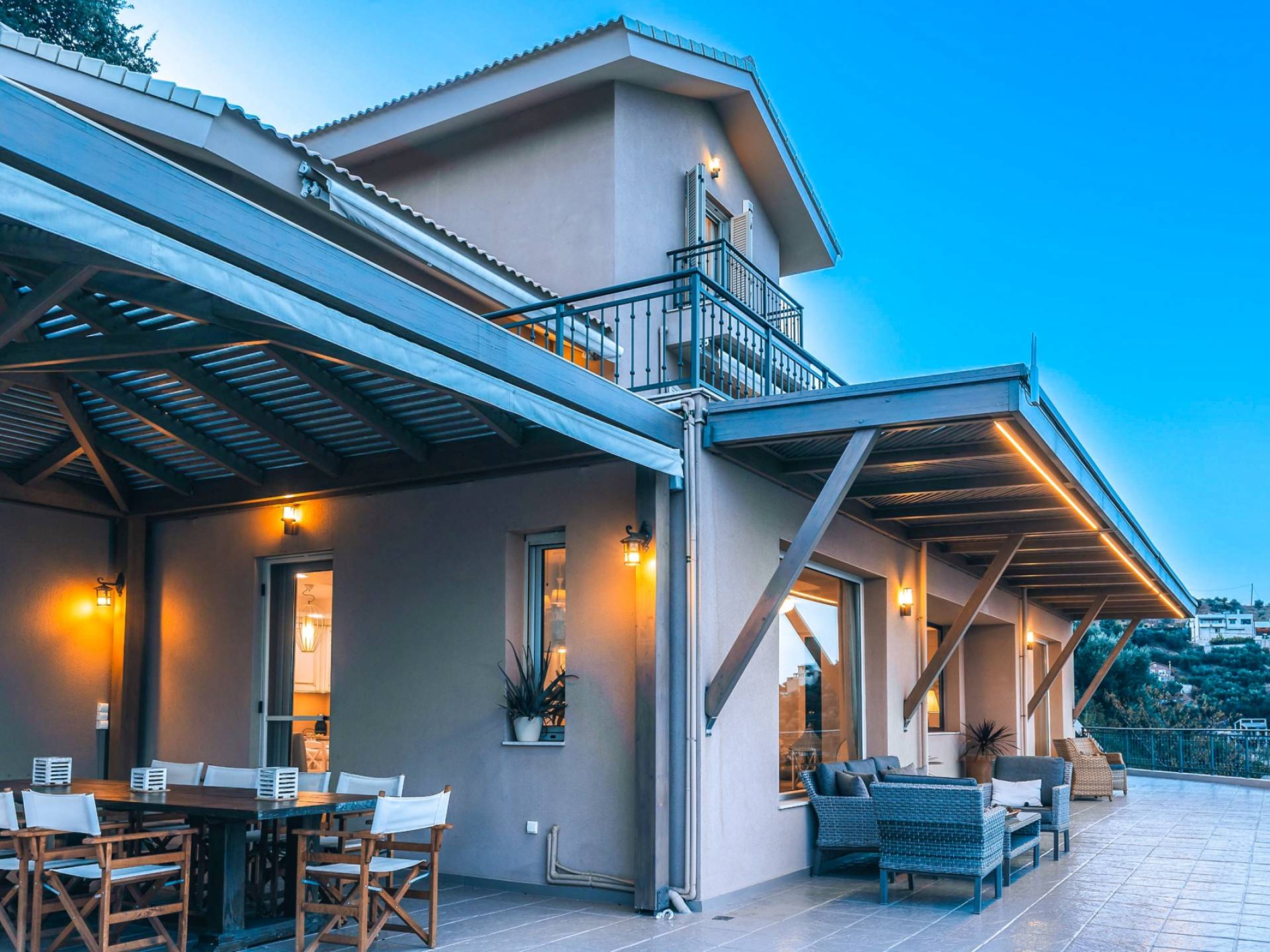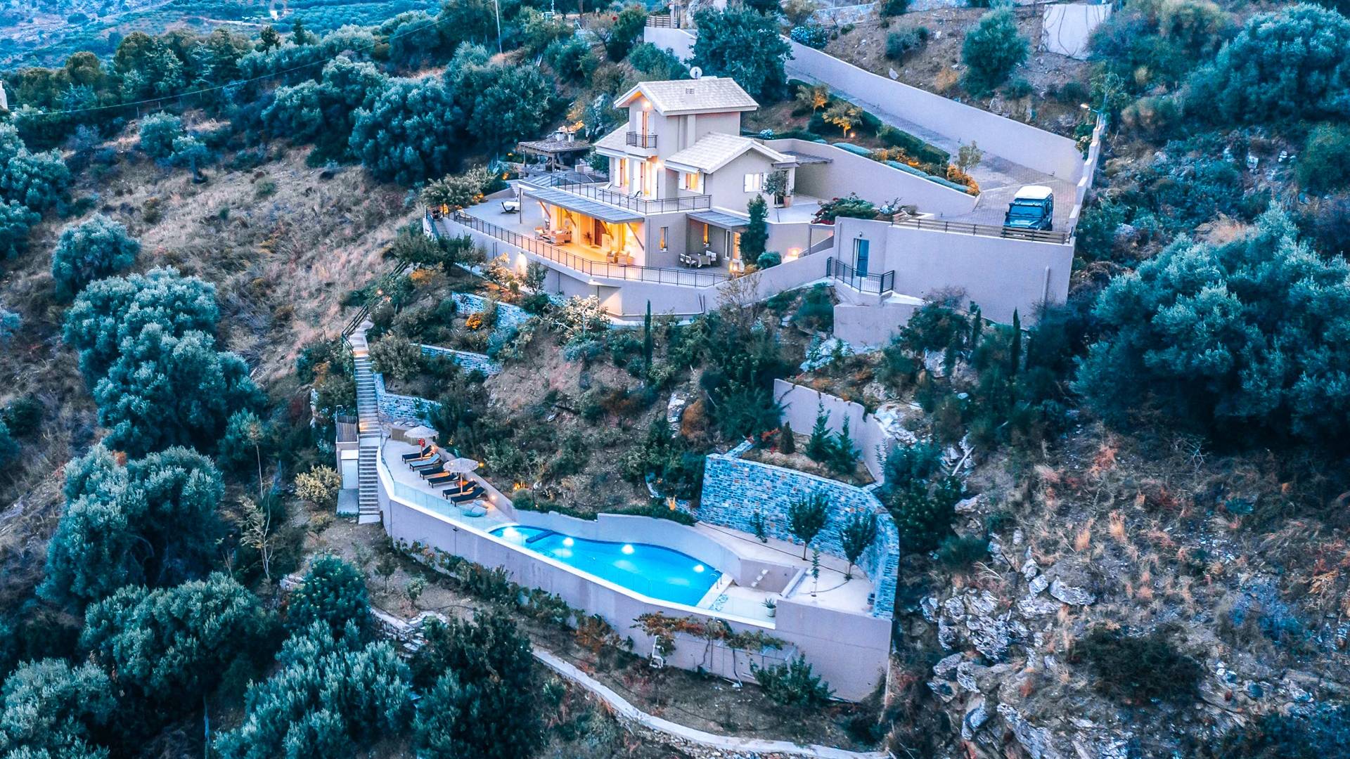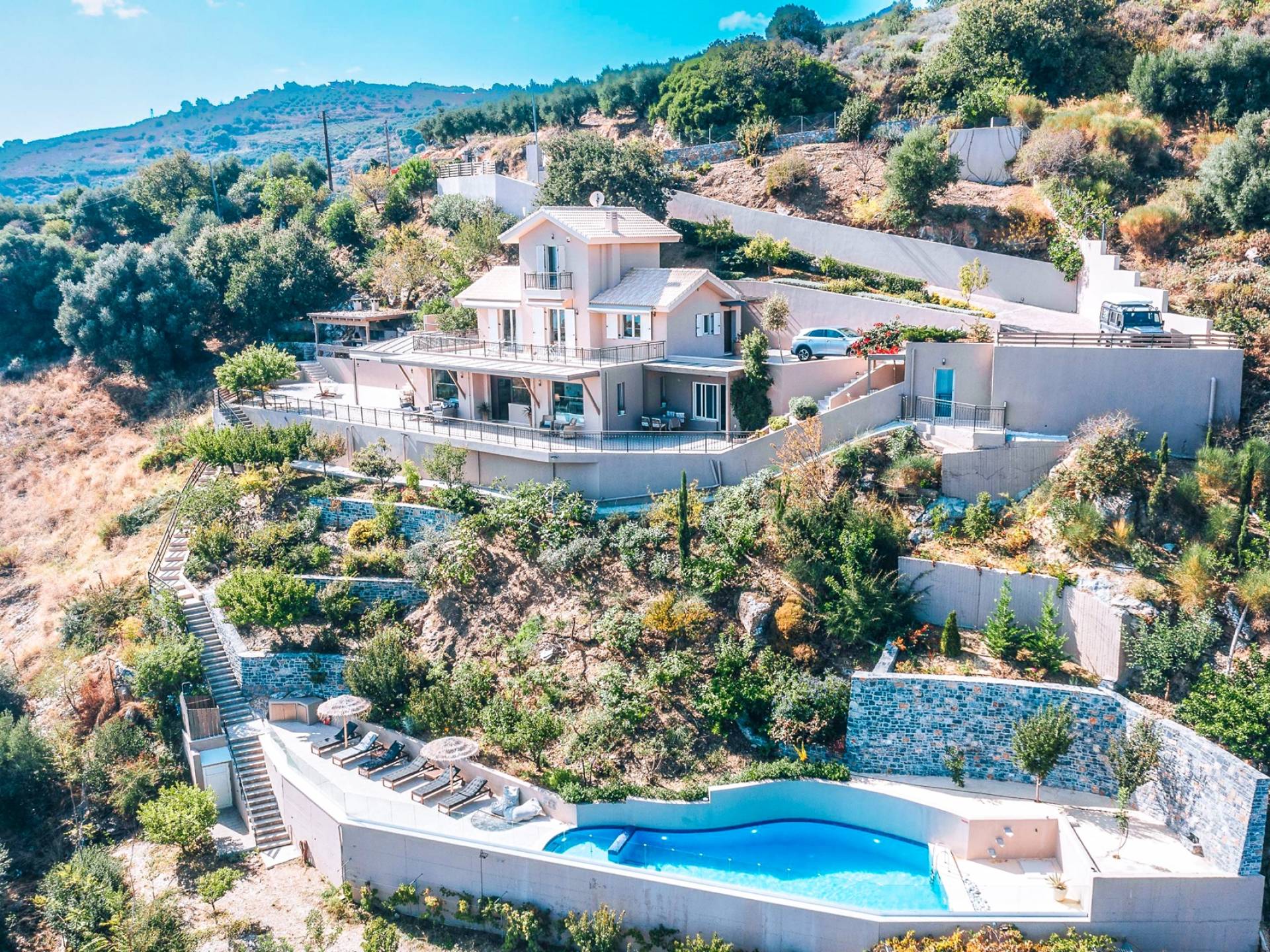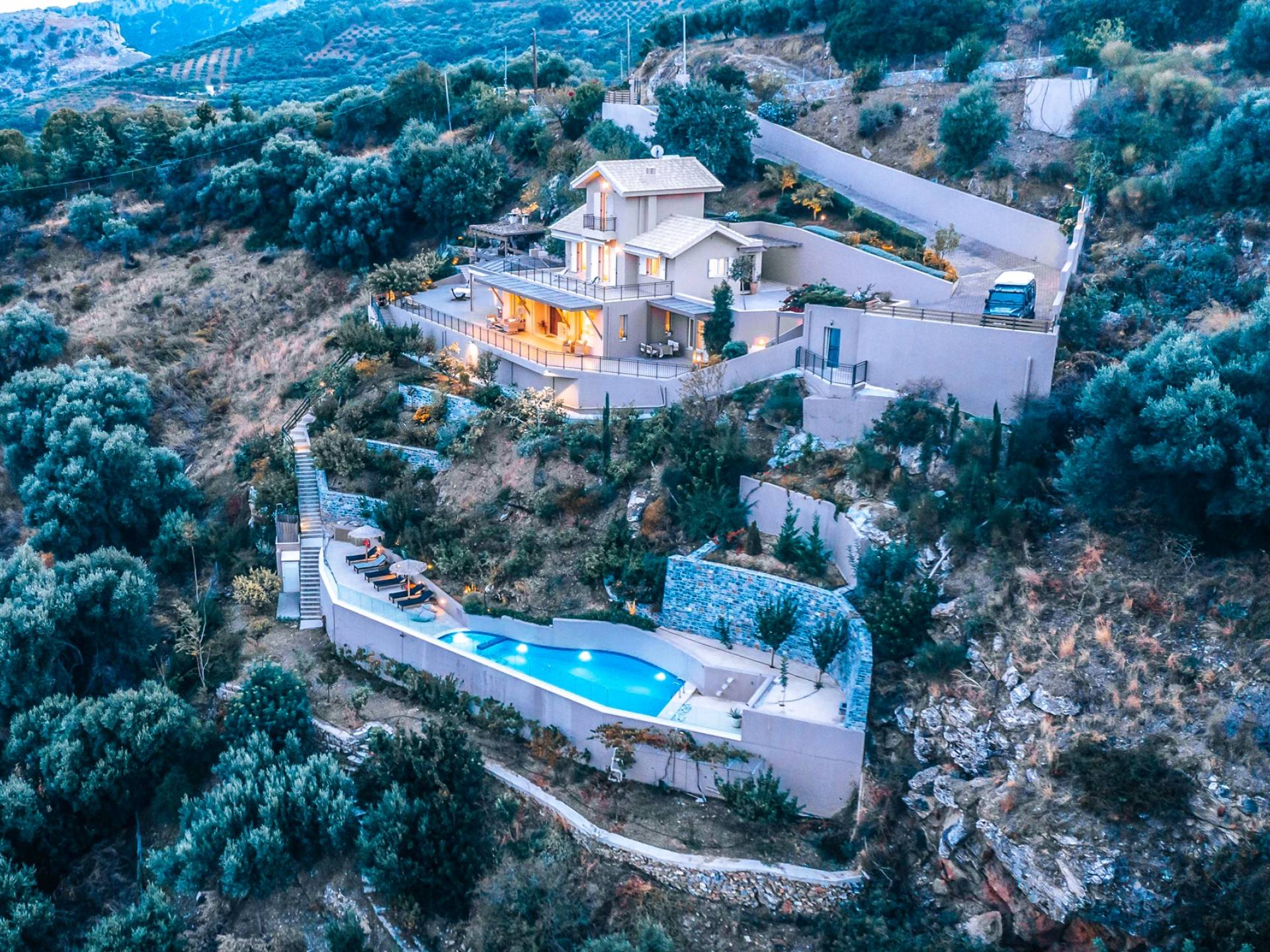 Η μοντέρνα αρχιτεκτονική της βίλας είναι σε απόλυτη αρμονία με το φυσικό τοπίο, χτισμένη αμφιθεατρικά, δίνοντας ένα εξαιρετικό παράδειγμα αποκλειστικού στυλ σε συνδυασμό με τα φυσικά στοιχεία της Κρήτης! Κάθε λεπτομέρεια έχει σχεδιαστεί με προσοχή, με σκοπό να δημιουργήσει έναν γαλήνιο όρμο που προσφέρει πλήρη ιδιωτικότητα. Οι εσωτερικοί χώροι είναι πλήρως εξοπλισμένοι και όμορφα διακοσμημένοι σε γήινους τόνους ώστε να δίνουν μια επιπλέον νότα χαλάρωσης, κομψότητας και πολυτέλειας. Η κατοικία 250 m2 χωρίζεται σε 3 ορόφους και διαθέτει 5 υπνοδωμάτια και μπορεί να φιλοξενήσει 10 άτομα και έως 11 αν χρειαστεί! Μπαίνοντας στο ισόγειο, οι επισκέπτες μπορούν να βρουν το σαλόνι στα δεξιά τους και την κουζίνα και την τραπεζαρία στα αριστερά τους. Το καθιστικό συμπληρώνεται από 3 άνετους άνετους καναπέδες με διάφορα τραπεζάκια, τζάκι, Smart TV, Playstation 5 και ηχείο Bluetooth.