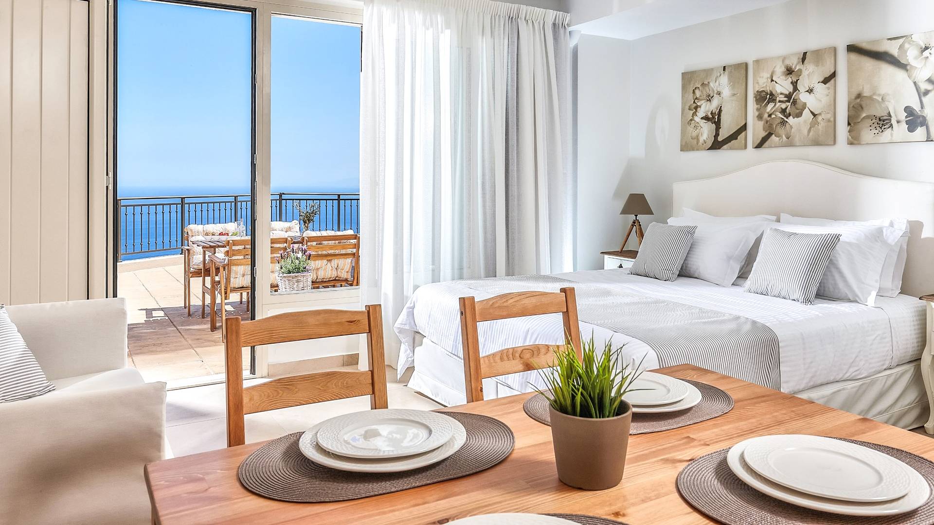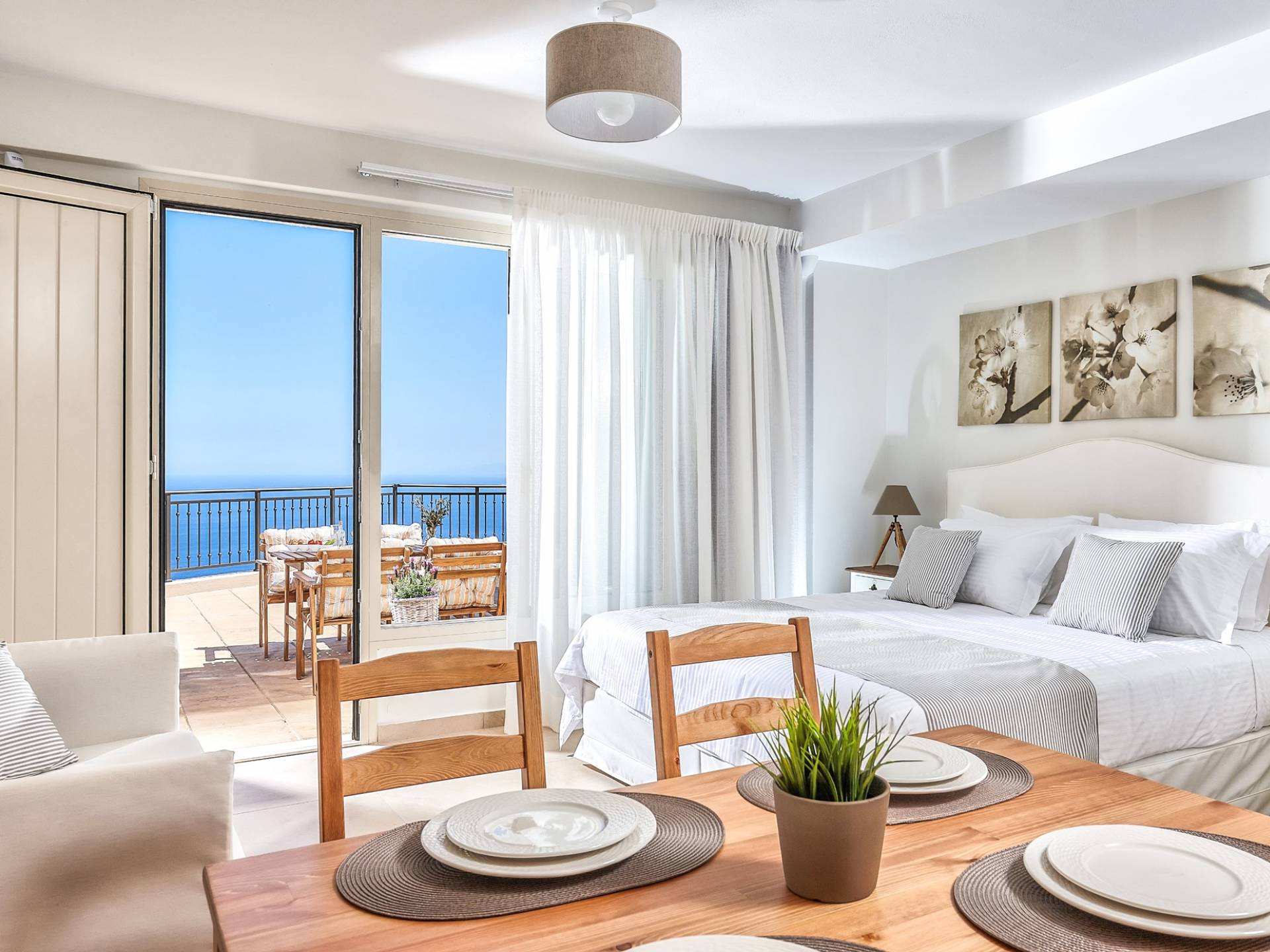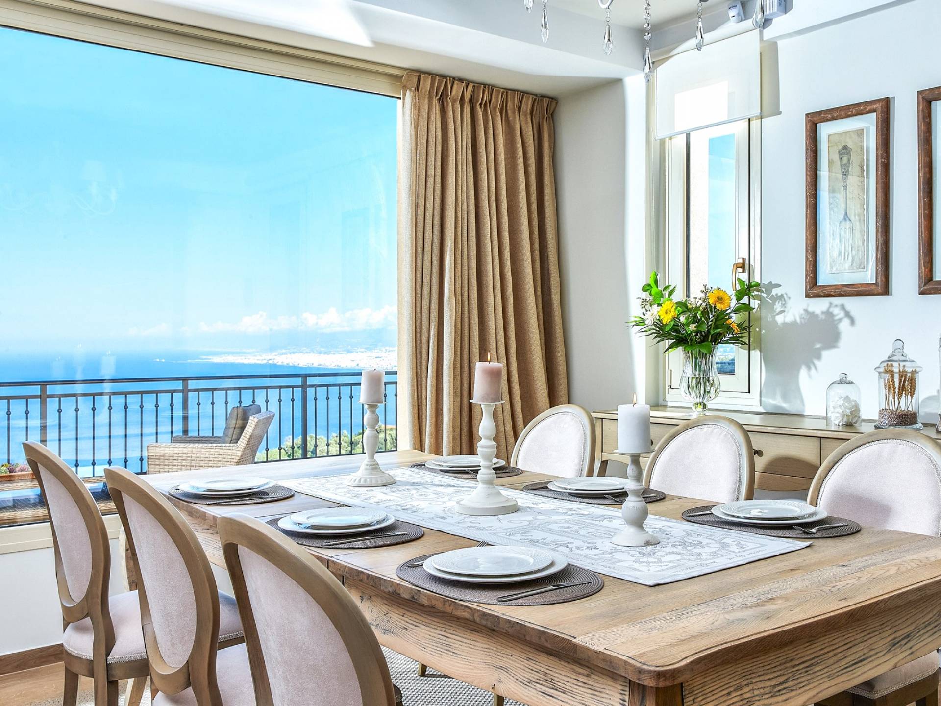 Η κουζίνα προσφέρει όλες τις απαραίτητες συσκευές για την προετοιμασία των γευμάτων σας, καθώς και ένα τραπέζι πρωινού για 4 άτομα. Η διπλανή εσωτερική τραπεζαρία για 8 άτομα απολαμβάνει επίσης εκπληκτική θέα στη θάλασσα. Από την κουζίνα οι επισκέπτες μπορούν επίσης να έχουν πρόσβαση σε μια δεύτερη τραπεζαρία στη βεράντα με μοναστηριακή τραπεζαρία για 10 άτομα, για να διαλέξουν ανάλογα με τις προτιμήσεις τους. Το σαλόνι και η τραπεζαρία απολαμβάνουν απίστευτη θέα και ευχάριστο θαλασσινό αεράκι. Σε αυτό το επίπεδο διατίθεται και WC. Στο ίδιο επίπεδο, υπάρχει ένα ξεχωριστό στούντιο με τη δική του ιδιωτική είσοδο που περιλαμβάνει 2 μονά κρεβάτια (0,90 x 2,00 ) που μπορεί να διαμορφωθεί ως κρεβάτι queen size κατόπιν αιτήματος και ένας καναπές που μετατρέπεται σε βολικό κρεβάτι για έναν τρίτο επισκέπτη. Το αυτόνομο διαμέρισμα προσφέρει επίσης όμορφη θέα στη θάλασσα και διαθέτει πλήρως εξοπλισμένη κουζίνα, τραπεζαρία για 4 άτομα και ιδιωτικό μπάνιο.