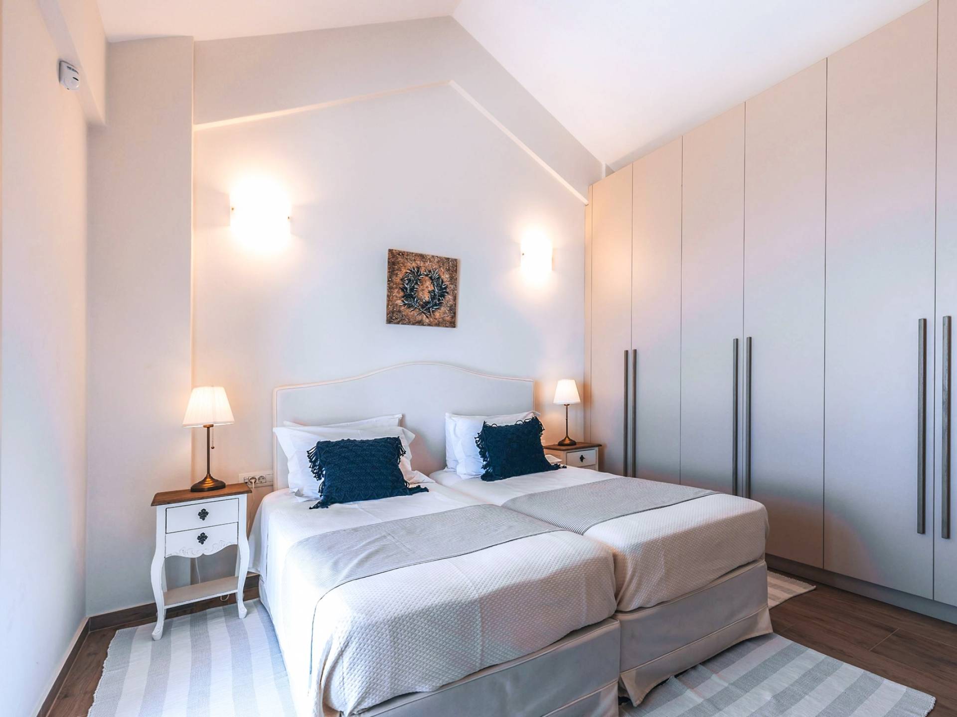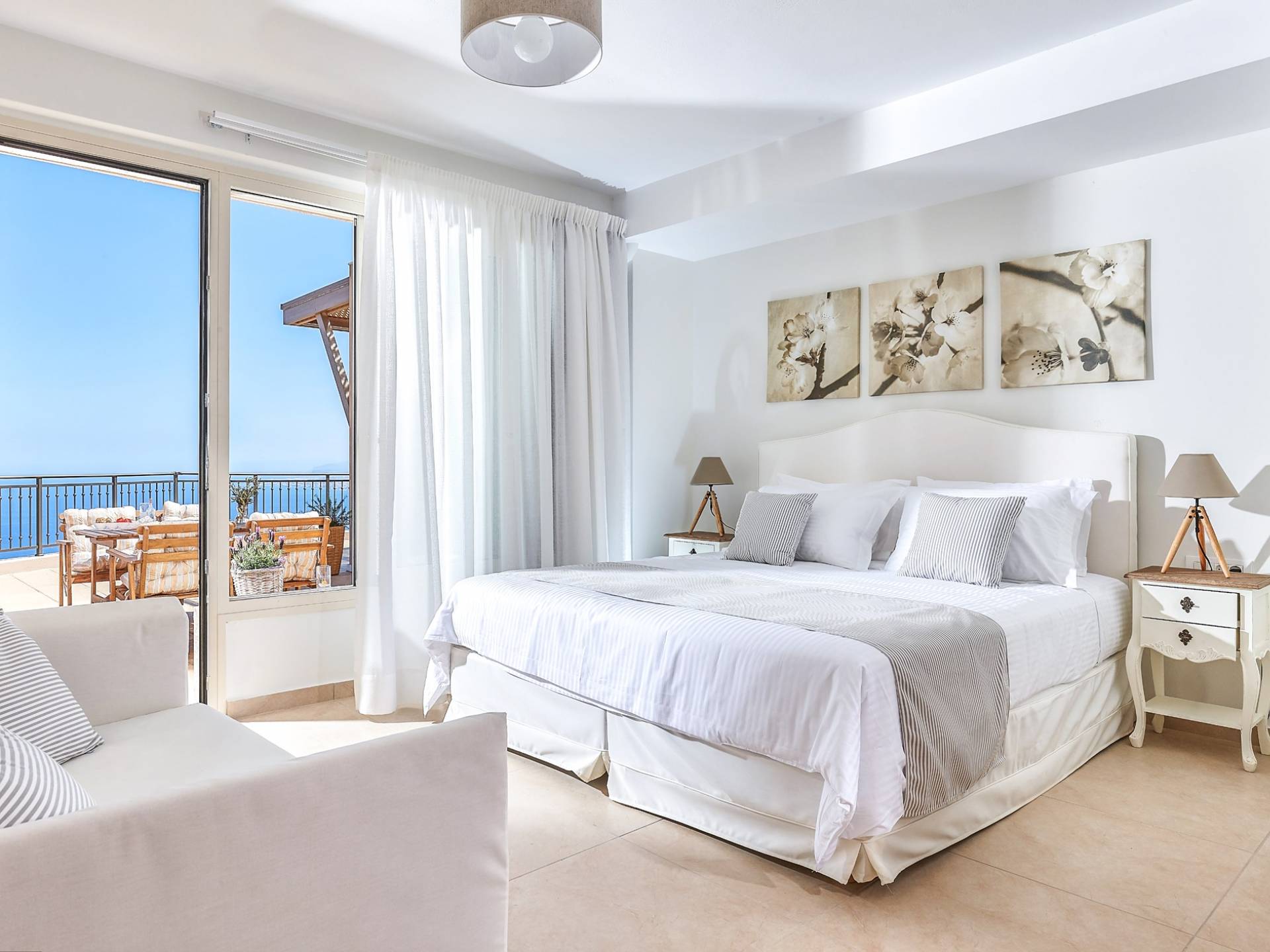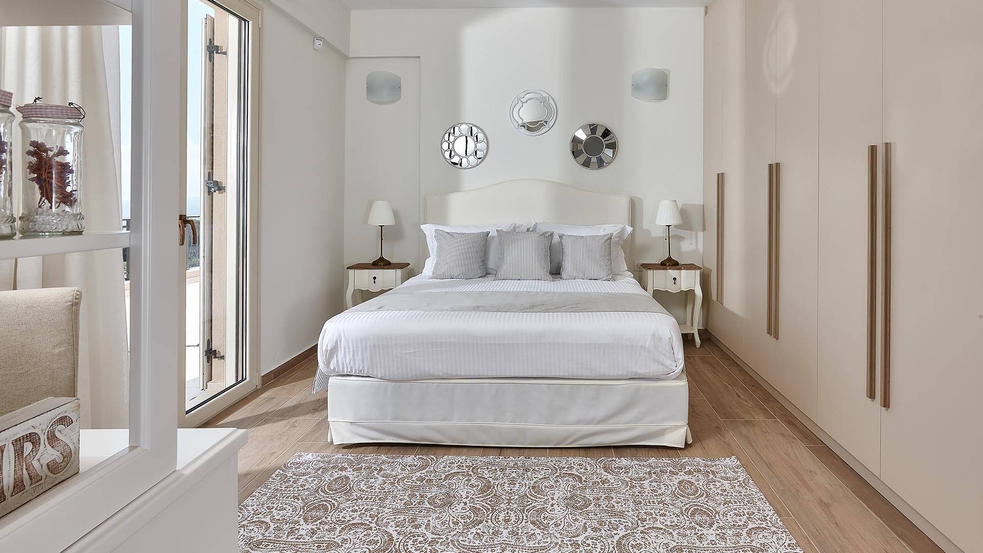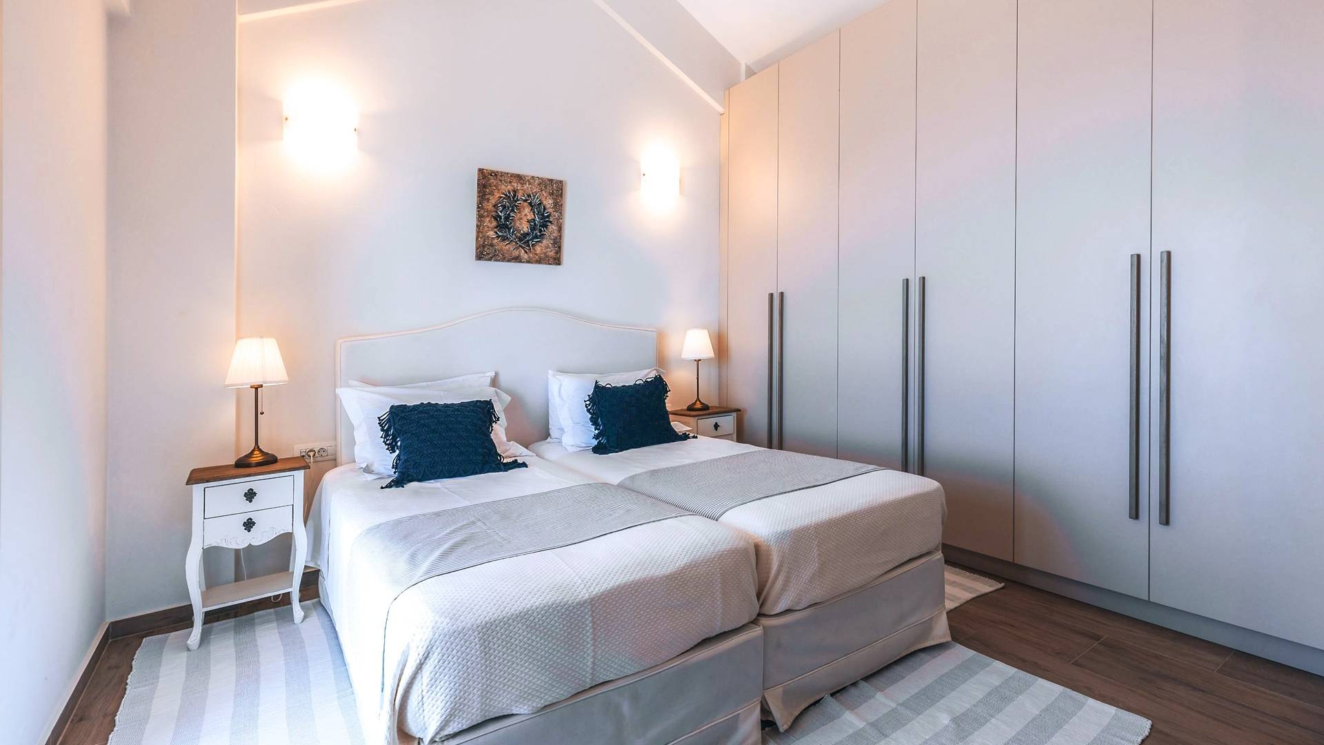 Φτάνοντας στον πρώτο όροφο οι επισκέπτες μπορούν να βρουν τρία υπνοδωμάτια. Το ευρύχωρο κύριο υπνοδωμάτιο διαθέτει κρεβάτι 1,60 x 2,00, άφθονο χώρο ντουλάπας, νιπτήρα, κλιματισμό, τηλεόραση, θυρίδα ασφαλείας και ιδιωτικό μπάνιο με διπλούς νιπτήρες και καμπίνα ντους με στήλη υδρομασάζ. Το δεύτερο υπνοδωμάτιο διαθέτει κρεβάτι 1,80 x 2,00 και ιδιωτικό μπάνιο με καμπίνα ντους. Το τρίτο υπνοδωμάτιο διαθέτει 2 μονά κρεβάτια (0,90 x 2,00 ) που μπορούν να διαμορφωθούν ως κρεβάτι queen size κατόπιν αιτήματος, A/C, τηλεόραση και νιπτήρα. Και τα δύο υπνοδωμάτια έχουν πρόσβαση σε μια ευρύχωρη βεράντα εξοπλισμένη με ξαπλώστρες, το τέλειο μέρος για να απολαύσετε το ηλιοβασίλεμα με ένα δροσιστικό ποτό στο χέρι. Στον πρώτο όροφο υπάρχει επίσης ένα επιπλέον μπάνιο με καμπίνα ντους με στήλη υδρομασάζ.