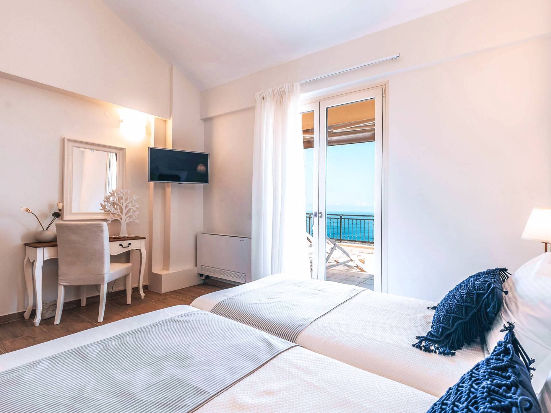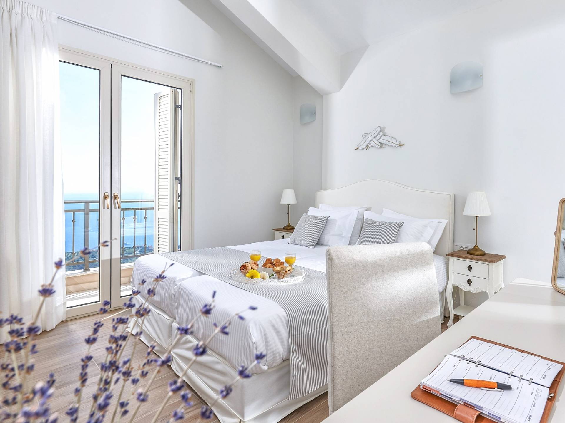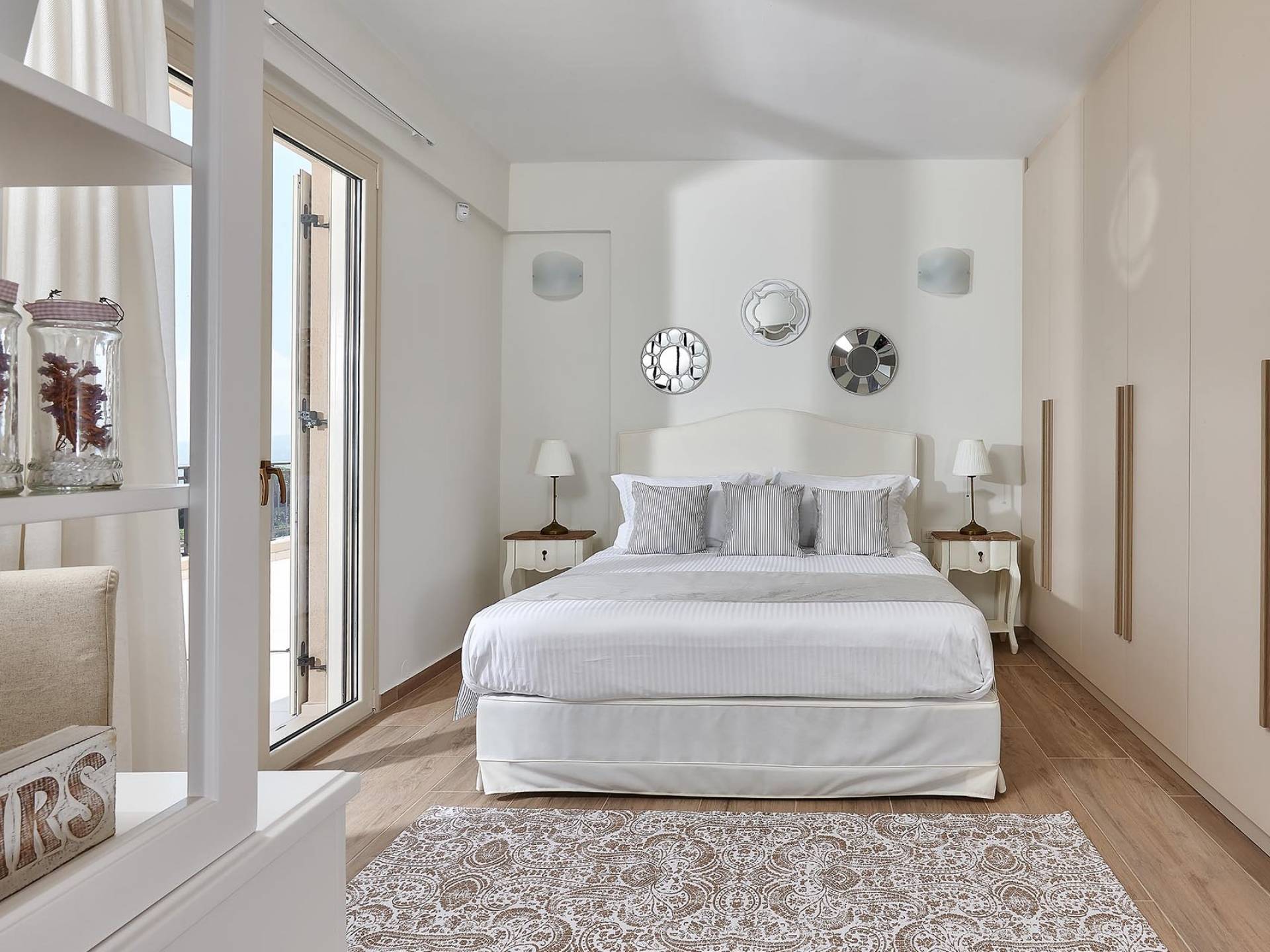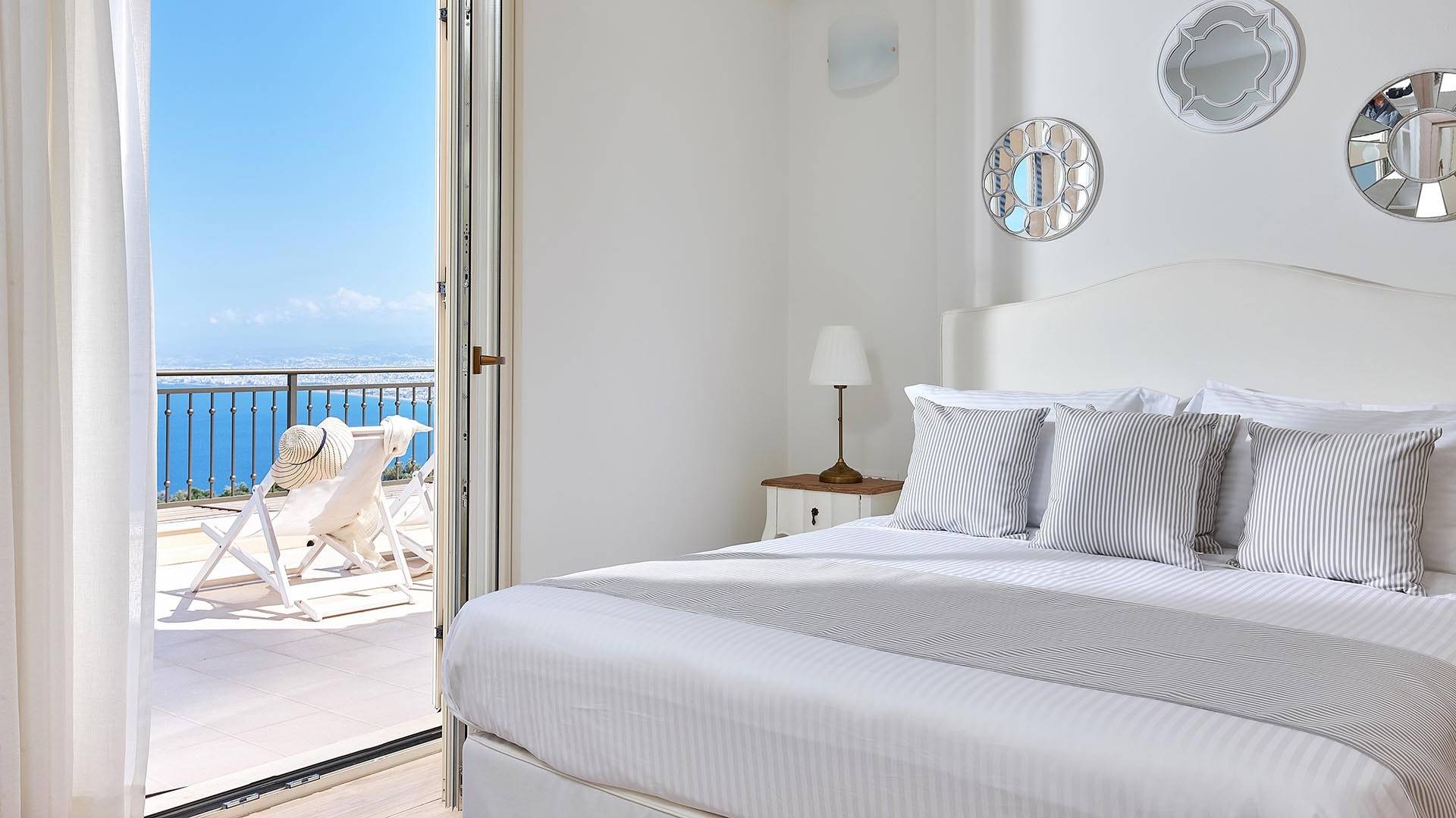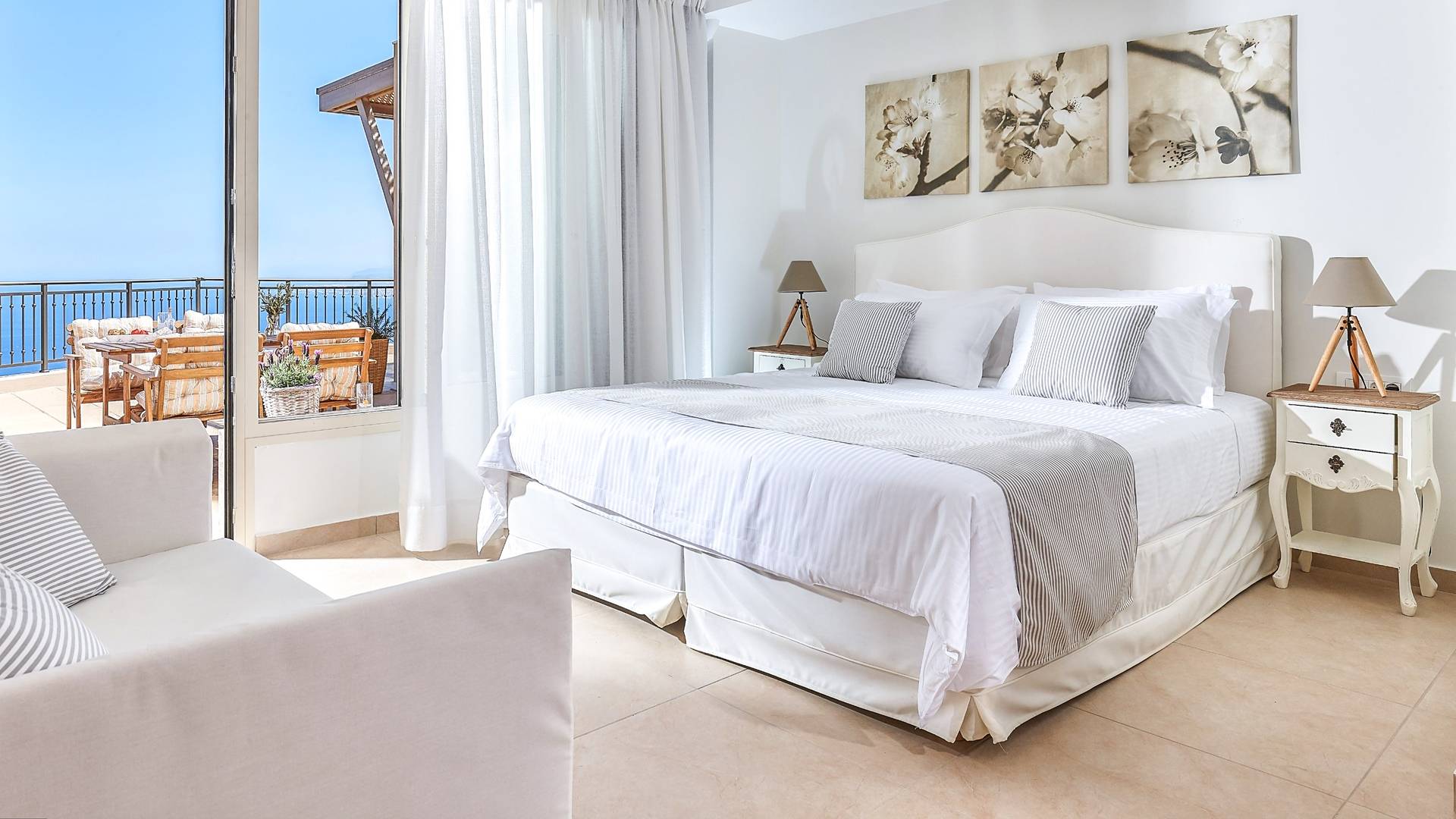 Φτάνοντας στον πρώτο όροφο οι επισκέπτες μπορούν να βρουν τρία υπνοδωμάτια. Το ευρύχωρο κύριο υπνοδωμάτιο διαθέτει κρεβάτι 1,60 x 2,00, άφθονο χώρο ντουλάπας, νιπτήρα, κλιματισμό, τηλεόραση, θυρίδα ασφαλείας και ιδιωτικό μπάνιο με διπλούς νιπτήρες και καμπίνα ντους με στήλη υδρομασάζ. Το δεύτερο υπνοδωμάτιο διαθέτει κρεβάτι 1,80 x 2,00 και ιδιωτικό μπάνιο με καμπίνα ντους. Το τρίτο υπνοδωμάτιο διαθέτει 2 μονά κρεβάτια (0,90 x 2,00 ) που μπορούν να διαμορφωθούν ως κρεβάτι queen size κατόπιν αιτήματος, A/C, τηλεόραση και νιπτήρα. Και τα δύο υπνοδωμάτια έχουν πρόσβαση σε μια ευρύχωρη βεράντα εξοπλισμένη με ξαπλώστρες, το τέλειο μέρος για να απολαύσετε το ηλιοβασίλεμα με ένα δροσιστικό ποτό στο χέρι. Στον πρώτο όροφο υπάρχει επίσης ένα επιπλέον μπάνιο με καμπίνα ντους με στήλη υδρομασάζ.
