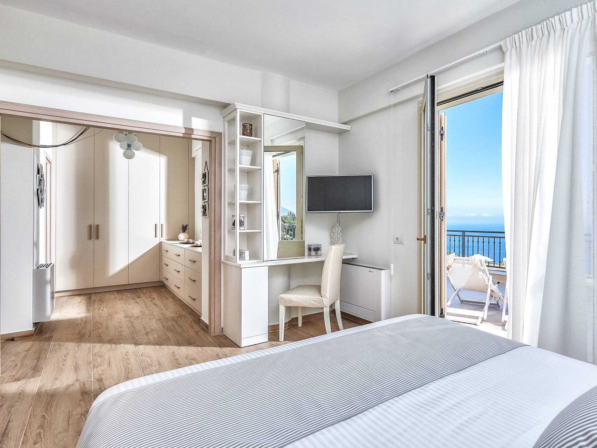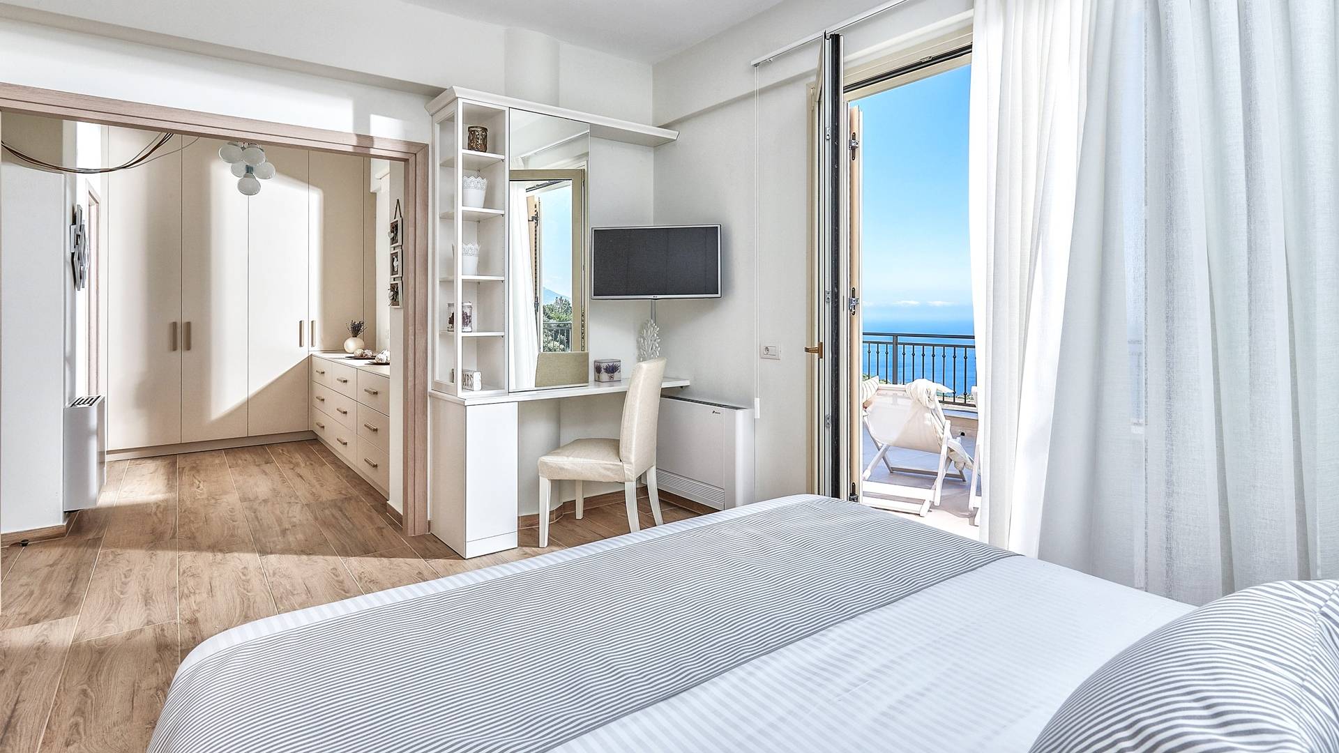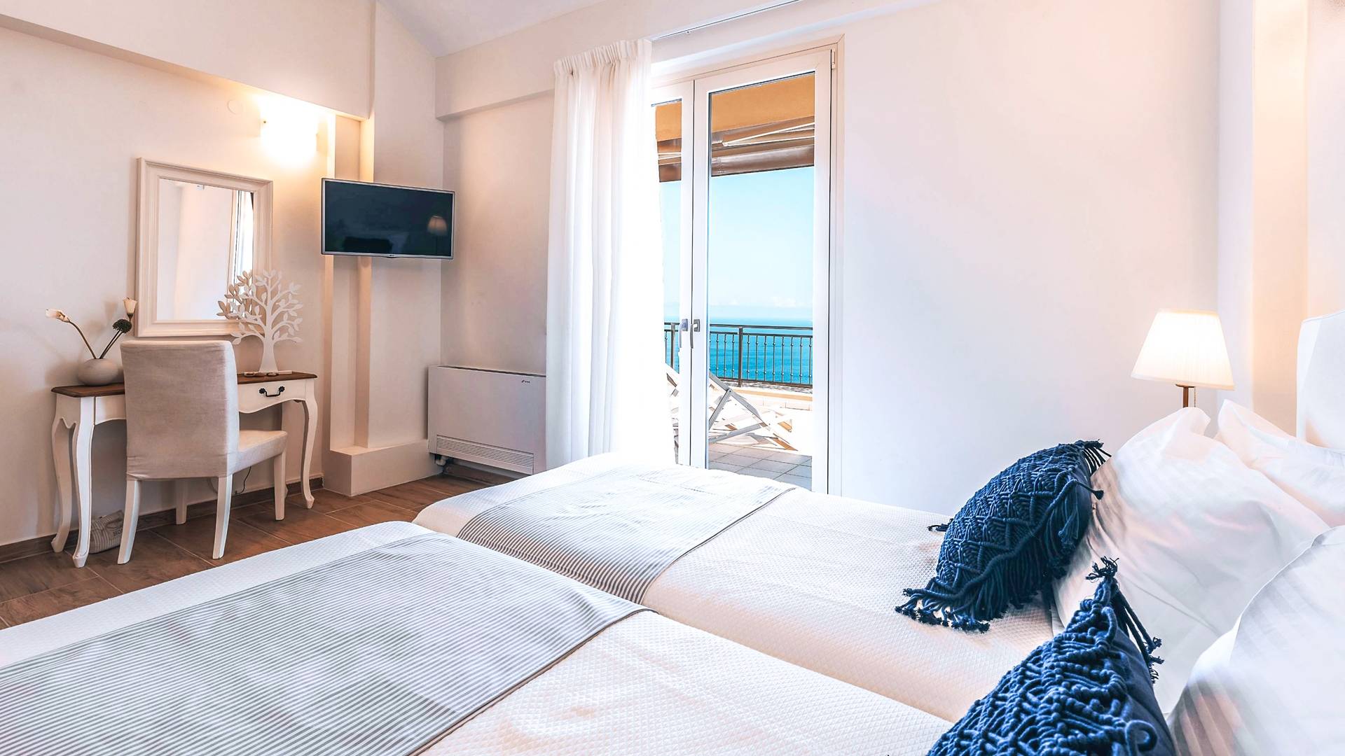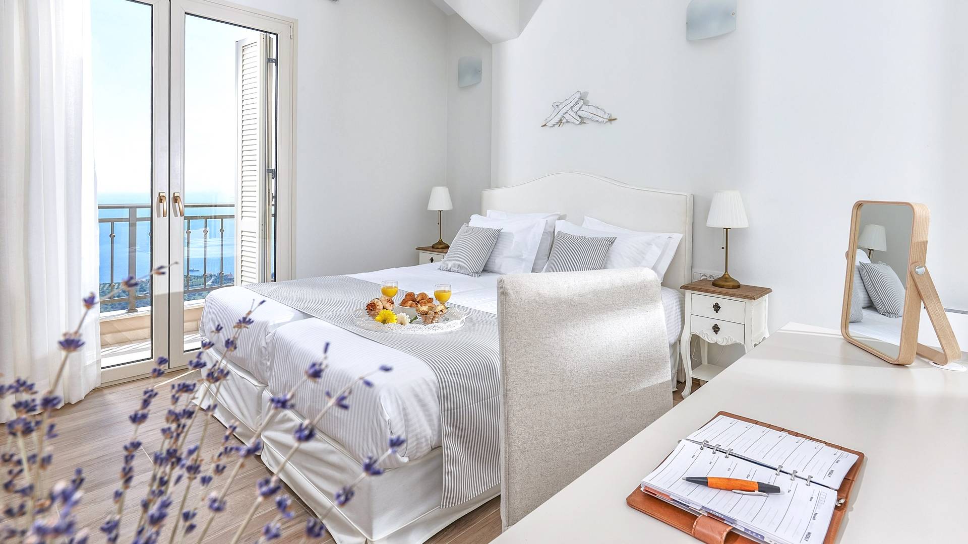 Φτάνοντας στον πρώτο όροφο οι επισκέπτες μπορούν να βρουν τρία υπνοδωμάτια. Το ευρύχωρο κύριο υπνοδωμάτιο διαθέτει κρεβάτι 1,60 x 2,00, άφθονο χώρο ντουλάπας, νιπτήρα, κλιματισμό, τηλεόραση, θυρίδα ασφαλείας και ιδιωτικό μπάνιο με διπλούς νιπτήρες και καμπίνα ντους με στήλη υδρομασάζ. Το δεύτερο υπνοδωμάτιο διαθέτει κρεβάτι 1,80 x 2,00 και ιδιωτικό μπάνιο με καμπίνα ντους. Το τρίτο υπνοδωμάτιο διαθέτει 2 μονά κρεβάτια (0,90 x 2,00 ) που μπορούν να διαμορφωθούν ως κρεβάτι queen size κατόπιν αιτήματος, A/C, τηλεόραση και νιπτήρα. Και τα δύο υπνοδωμάτια έχουν πρόσβαση σε μια ευρύχωρη βεράντα εξοπλισμένη με ξαπλώστρες, το τέλειο μέρος για να απολαύσετε το ηλιοβασίλεμα με ένα δροσιστικό ποτό στο χέρι. Στον πρώτο όροφο υπάρχει επίσης ένα επιπλέον μπάνιο με καμπίνα ντους με στήλη υδρομασάζ.