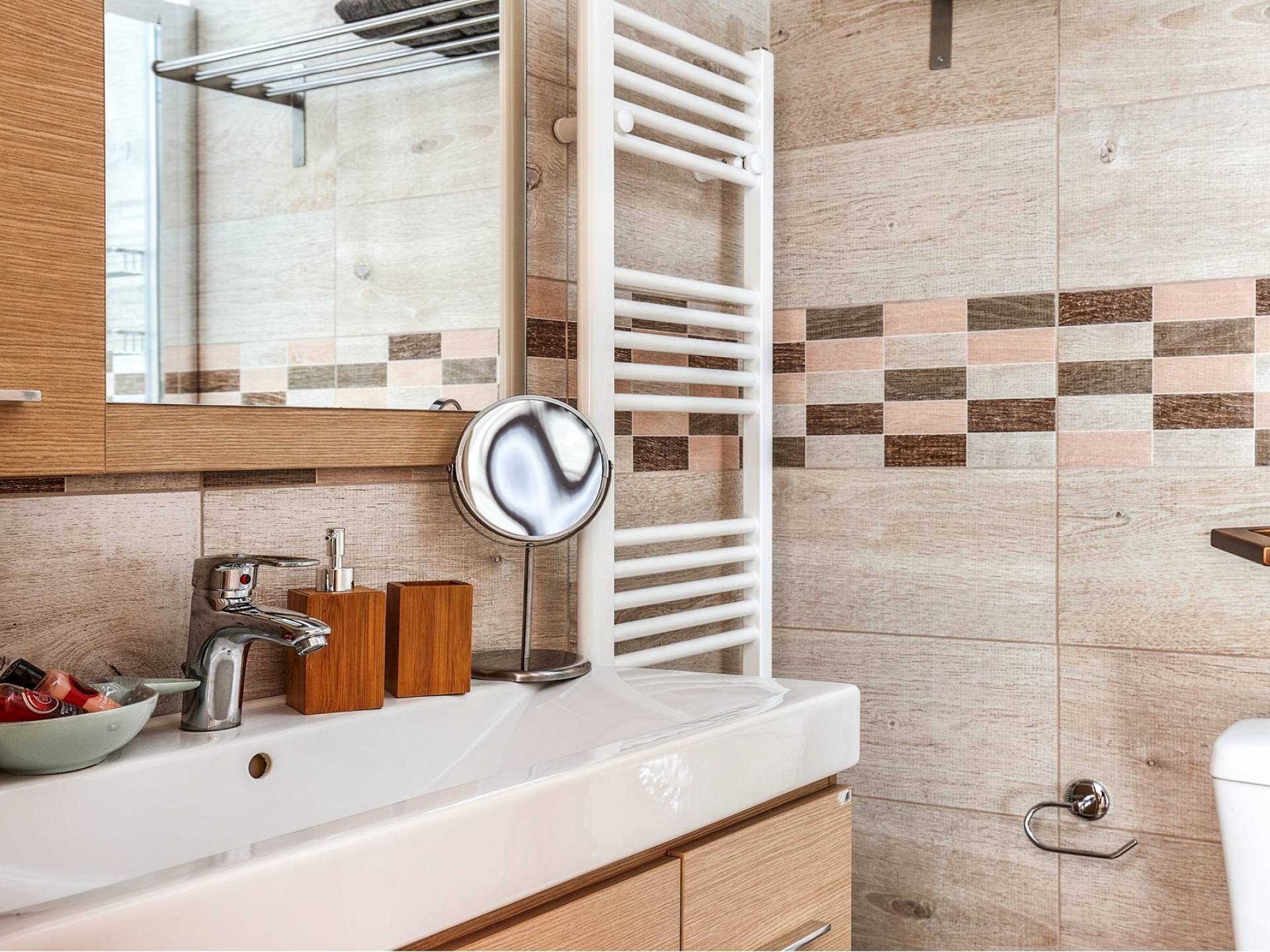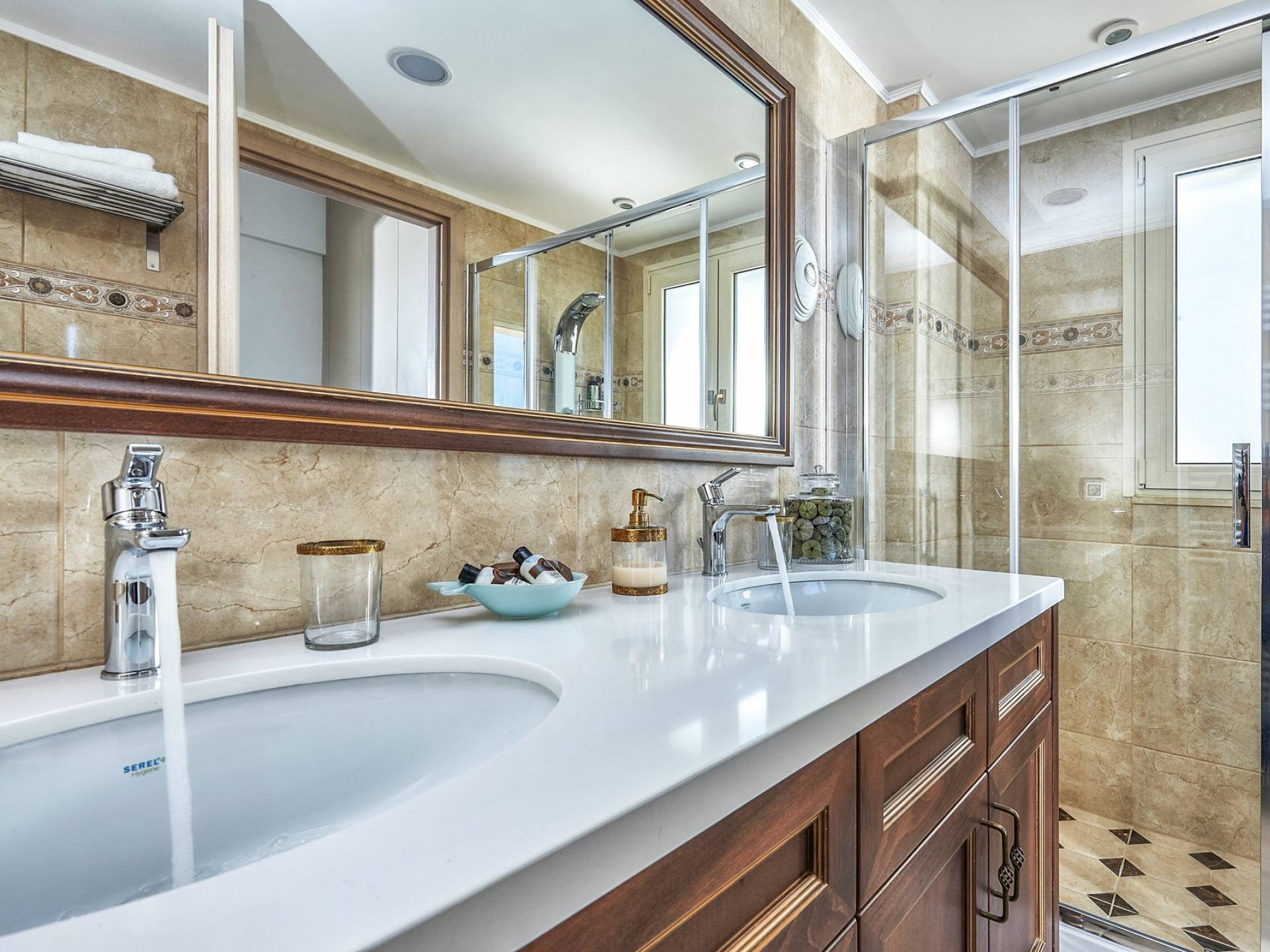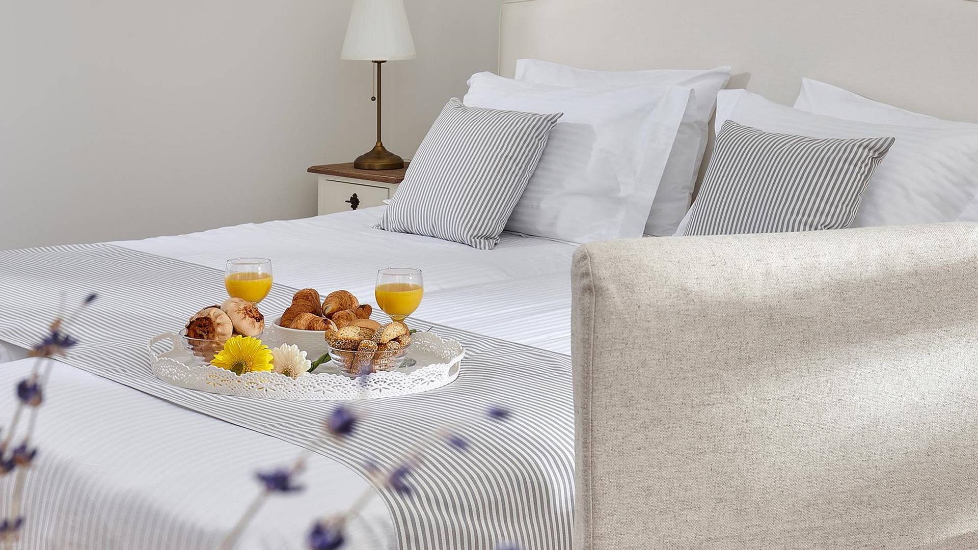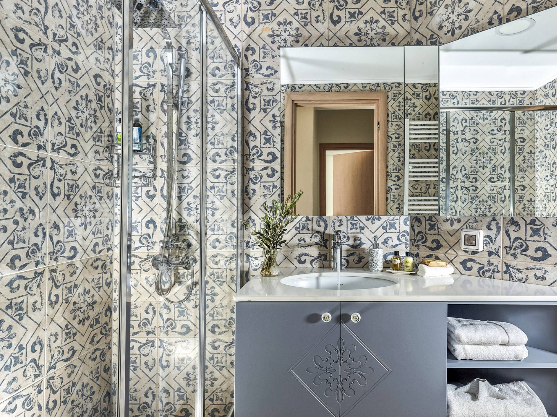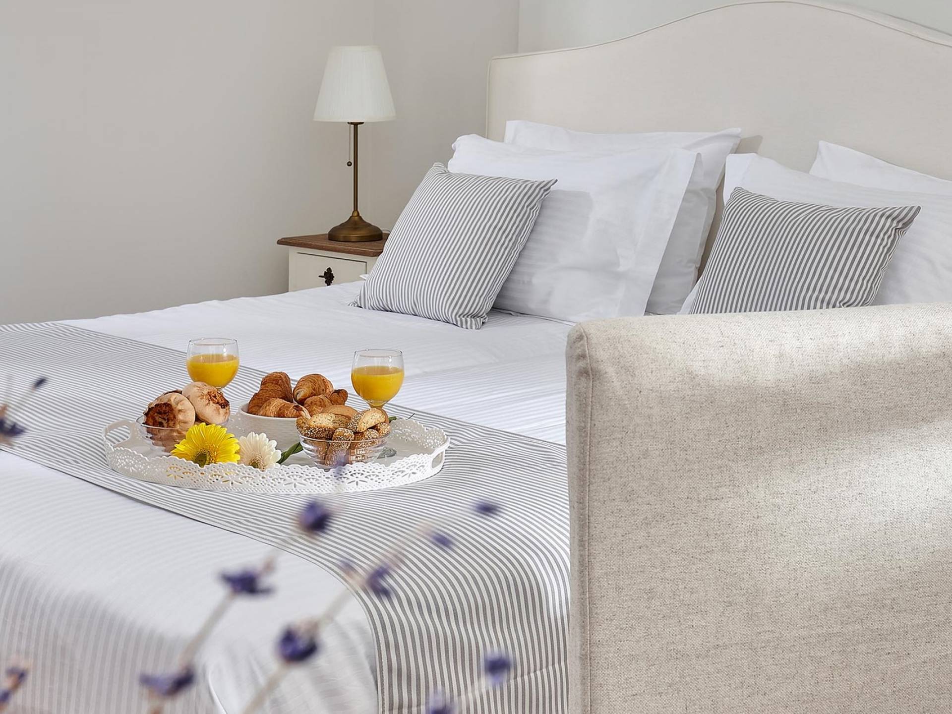 Φτάνοντας στον πρώτο όροφο οι επισκέπτες μπορούν να βρουν τρία υπνοδωμάτια. Το ευρύχωρο κύριο υπνοδωμάτιο διαθέτει κρεβάτι 1,60 x 2,00, άφθονο χώρο ντουλάπας, νιπτήρα, κλιματισμό, τηλεόραση, θυρίδα ασφαλείας και ιδιωτικό μπάνιο με διπλούς νιπτήρες και καμπίνα ντους με στήλη υδρομασάζ. Το δεύτερο υπνοδωμάτιο διαθέτει κρεβάτι 1,80 x 2,00 και ιδιωτικό μπάνιο με καμπίνα ντους. Το τρίτο υπνοδωμάτιο διαθέτει 2 μονά κρεβάτια (0,90 x 2,00 ) που μπορούν να διαμορφωθούν ως κρεβάτι queen size κατόπιν αιτήματος, A/C, τηλεόραση και νιπτήρα. Και τα δύο υπνοδωμάτια έχουν πρόσβαση σε μια ευρύχωρη βεράντα εξοπλισμένη με ξαπλώστρες, το τέλειο μέρος για να απολαύσετε το ηλιοβασίλεμα με ένα δροσιστικό ποτό στο χέρι. Στον πρώτο όροφο υπάρχει επίσης ένα επιπλέον μπάνιο με καμπίνα ντους με στήλη υδρομασάζ.