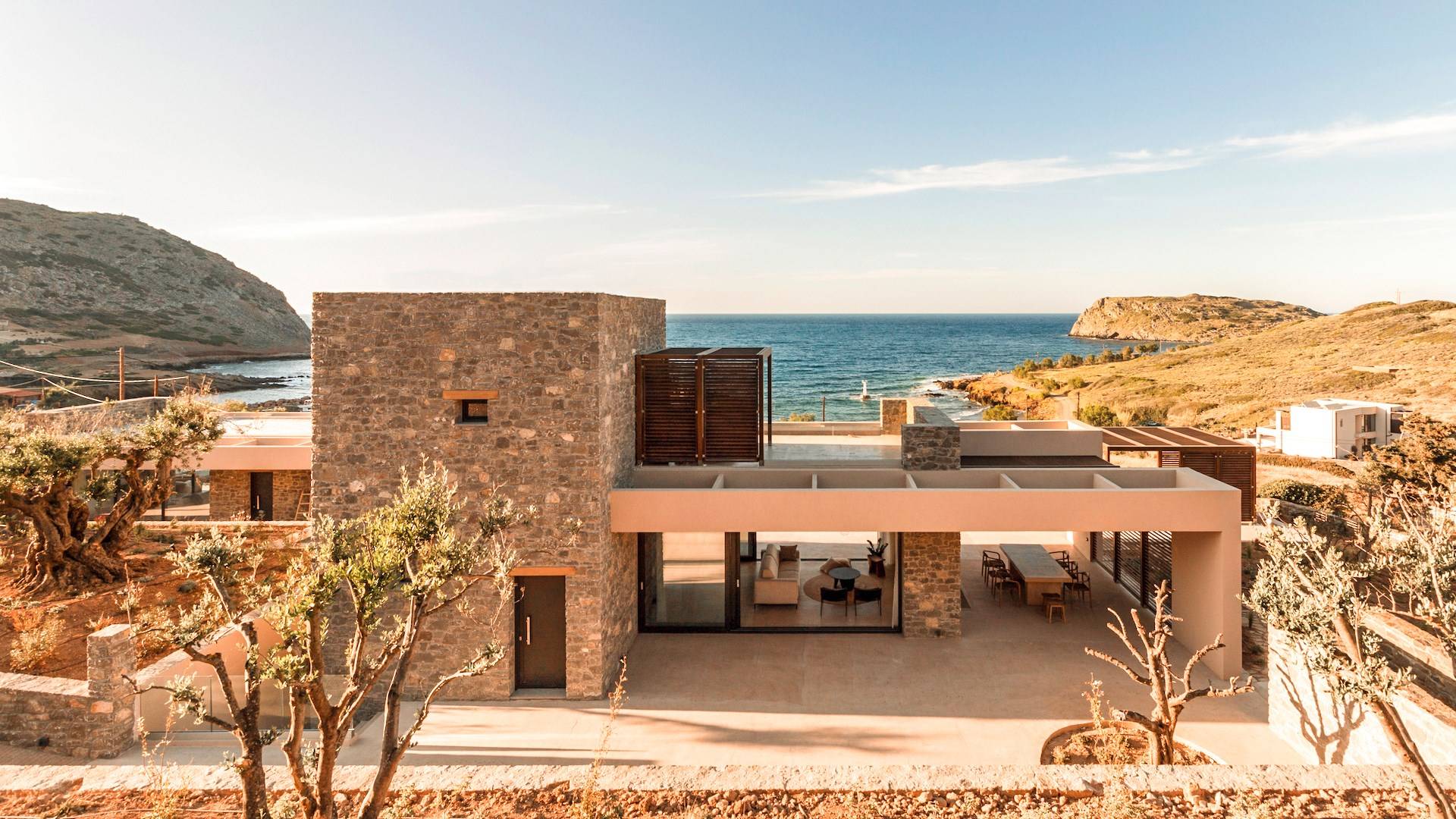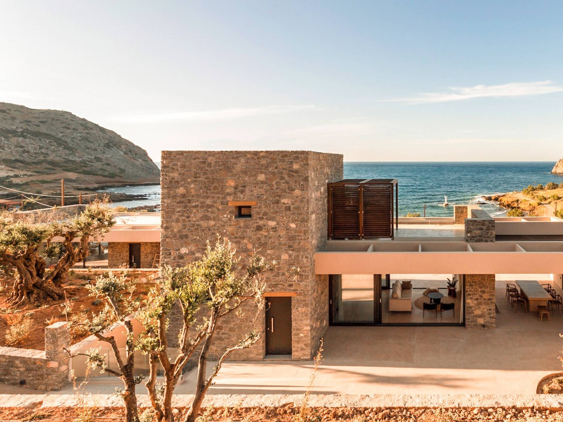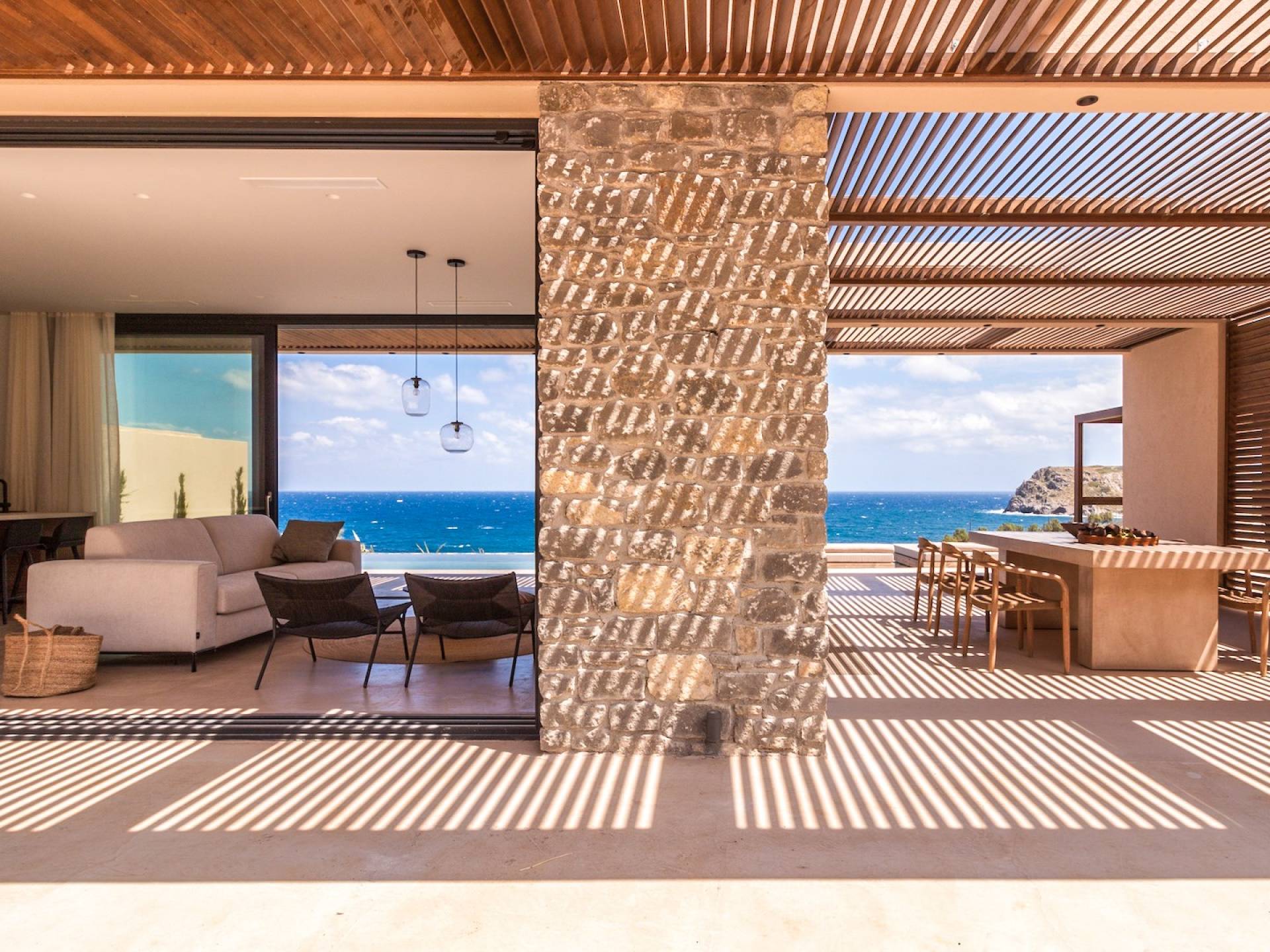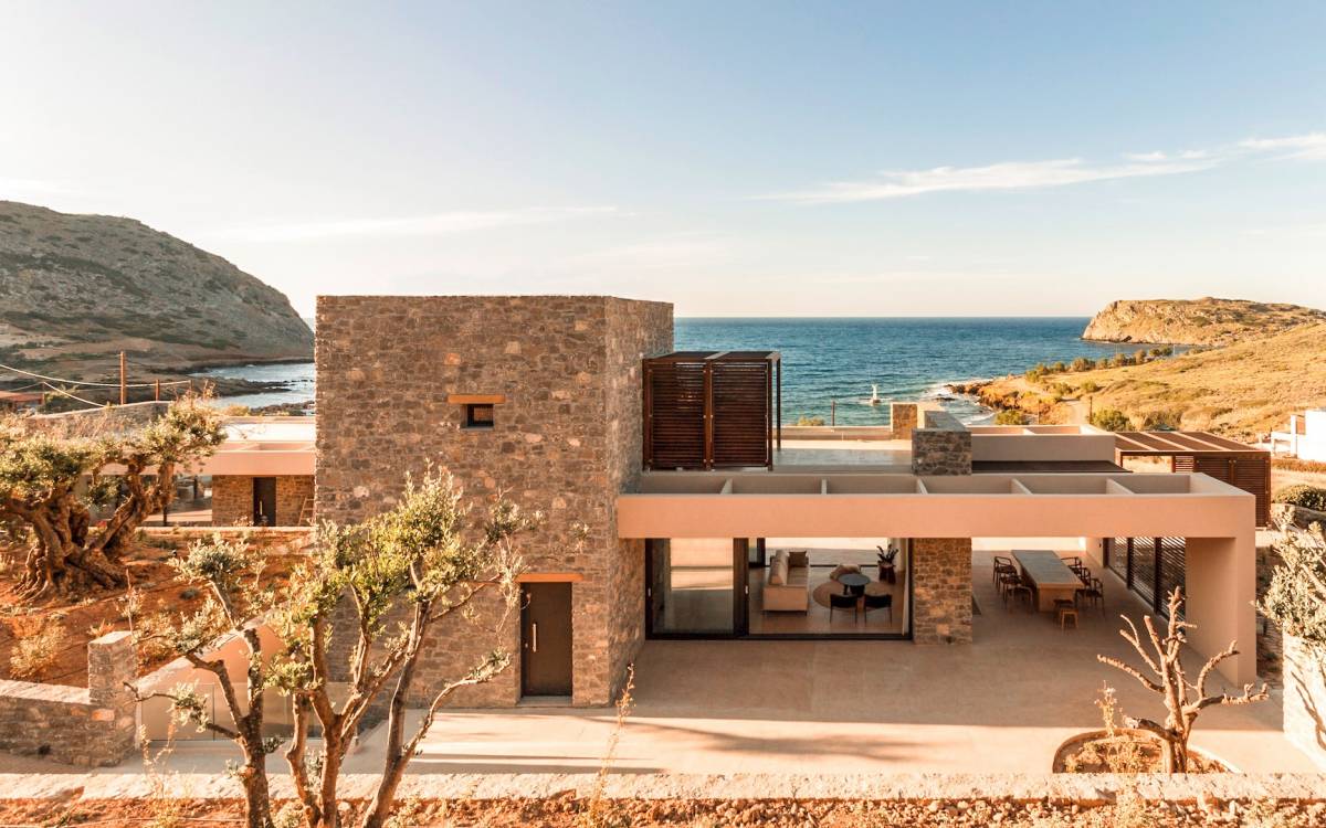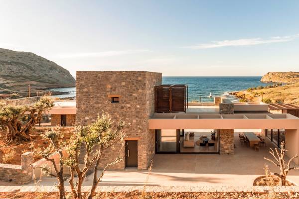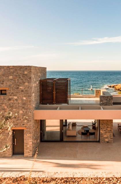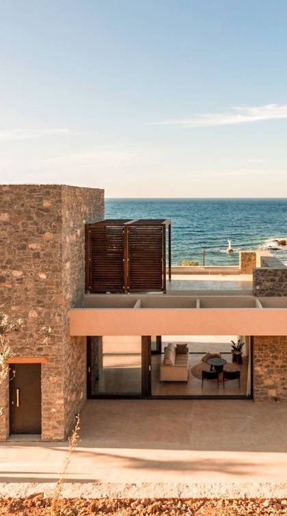Το Sense Two Villa Crete παραπέμπει ταυτόχρονα στην τραχιά και ομαλή αισθητική, οι δομές εμποτίστηκαν με ένα μείγμα από ζεστό ιβουάρ μπετόν και παραδοσιακές πέτρες του νησιού μαζί με τις γεωμετρικές γραμμές με αποτέλεσμα μια αβίαστη σύνδεση με τη φύση.