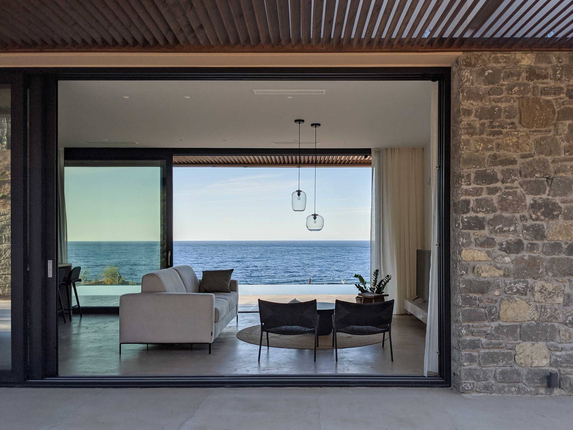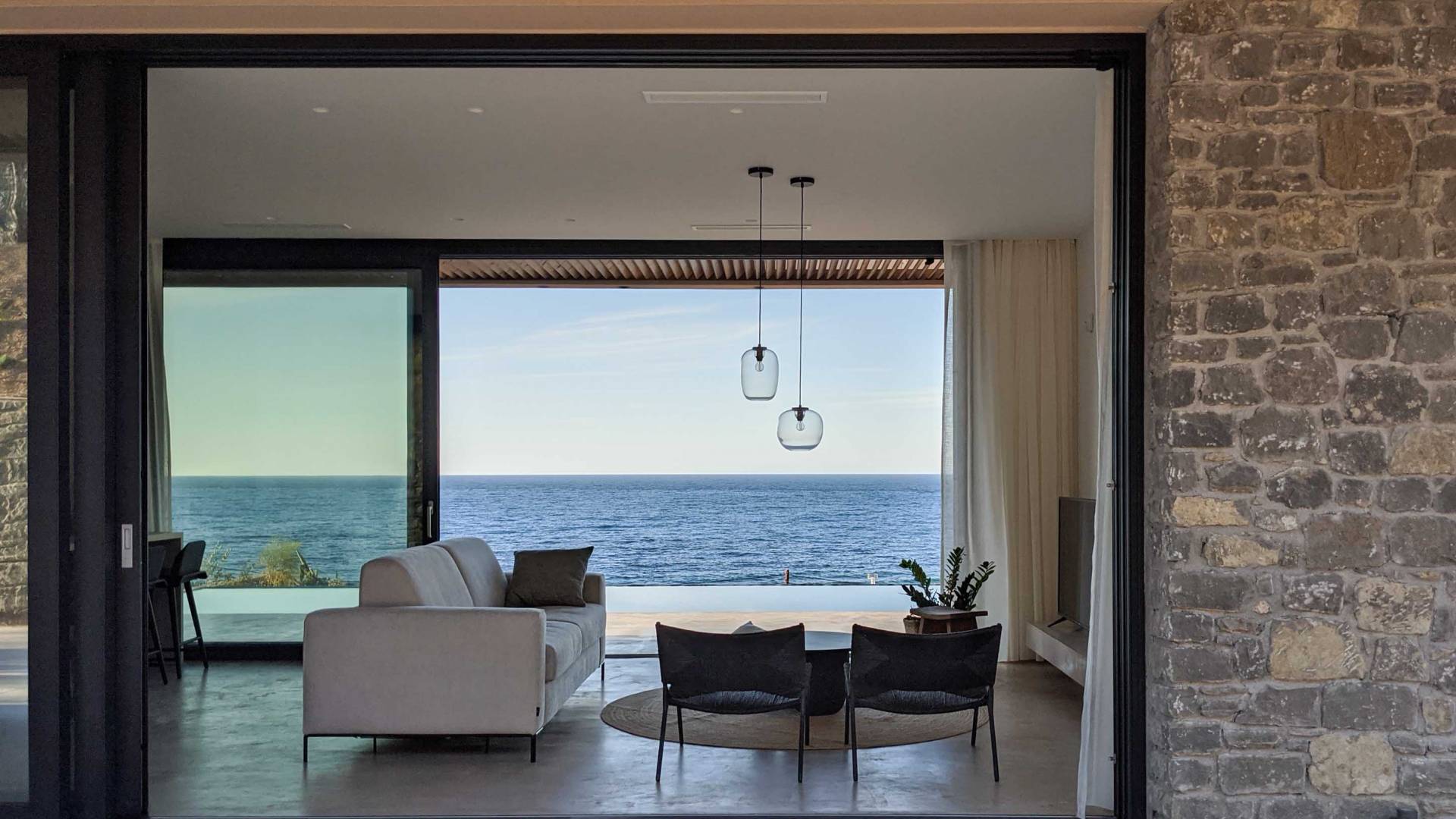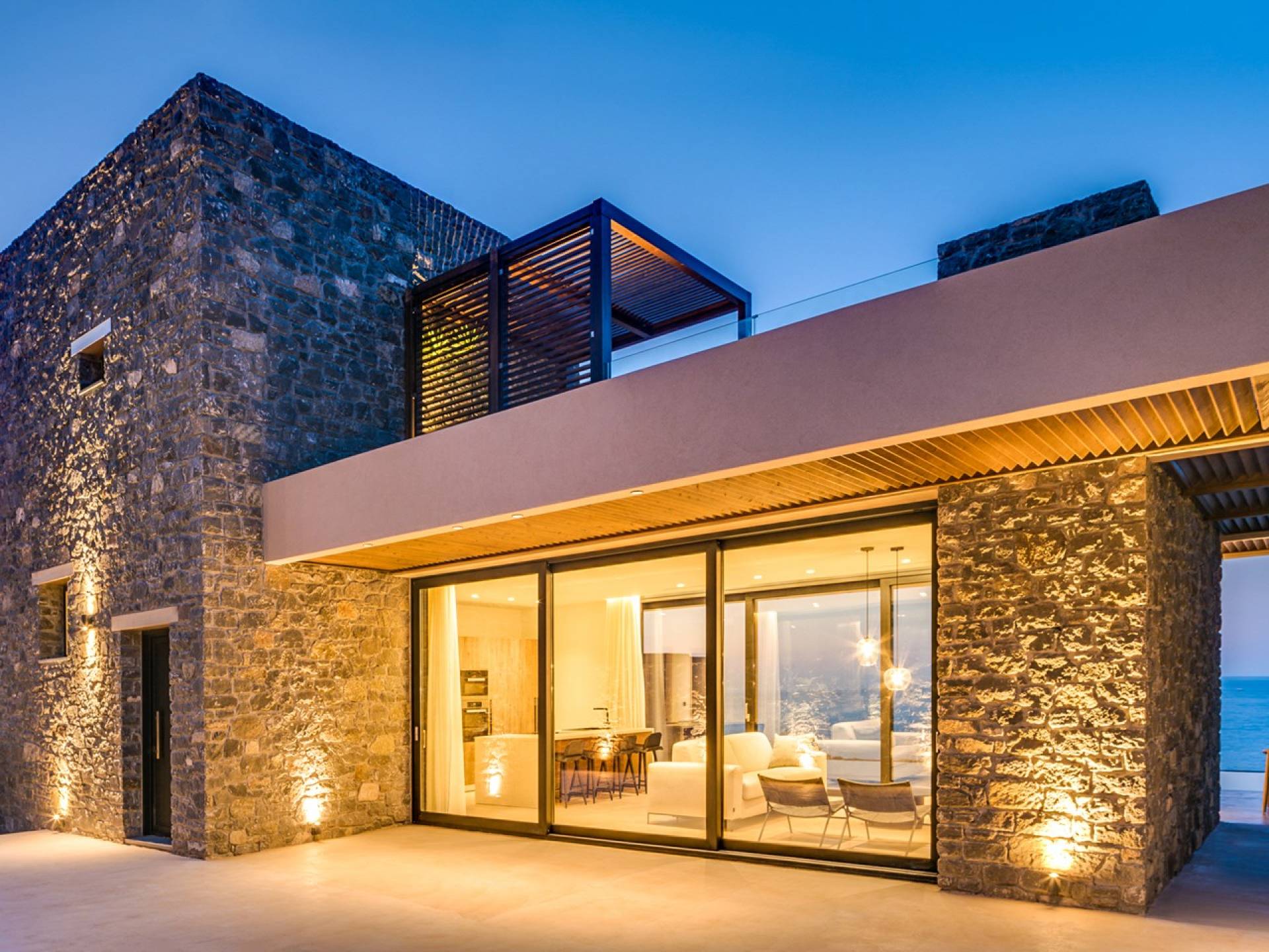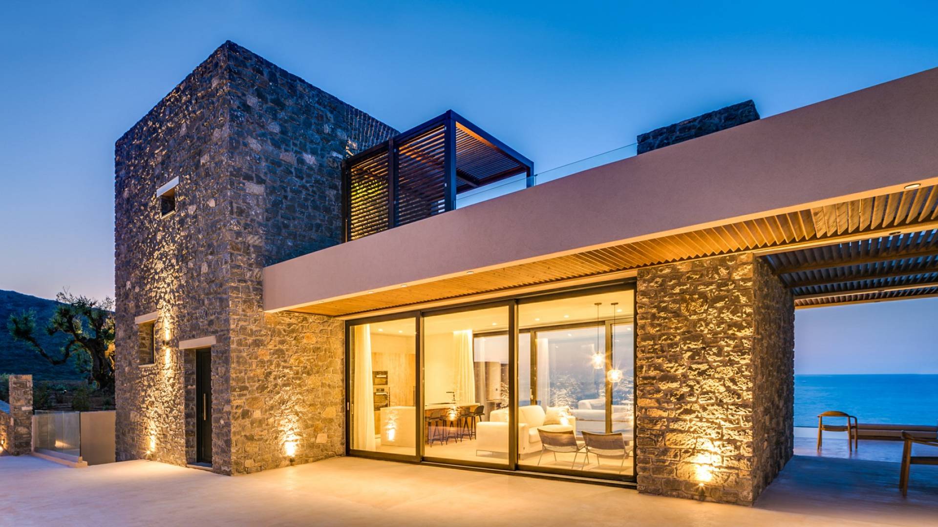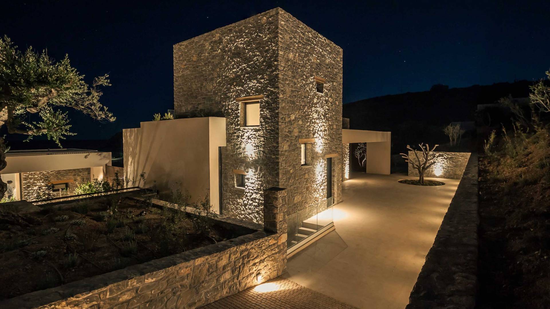 Το Sense Two Villa Crete παραπέμπει ταυτόχρονα στην τραχιά και ομαλή αισθητική, οι δομές εμποτίστηκαν με ένα μείγμα από ζεστό ιβουάρ μπετόν και παραδοσιακές πέτρες του νησιού μαζί με τις γεωμετρικές γραμμές με αποτέλεσμα μια αβίαστη σύνδεση με τη φύση.