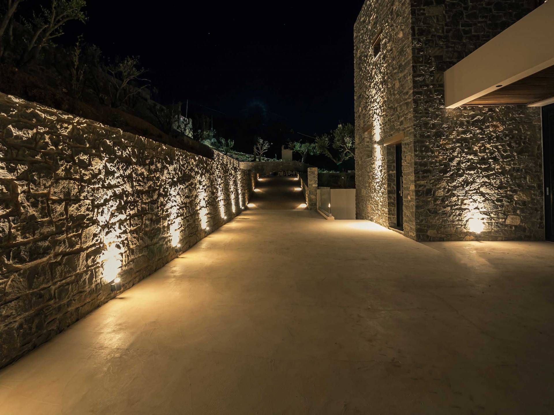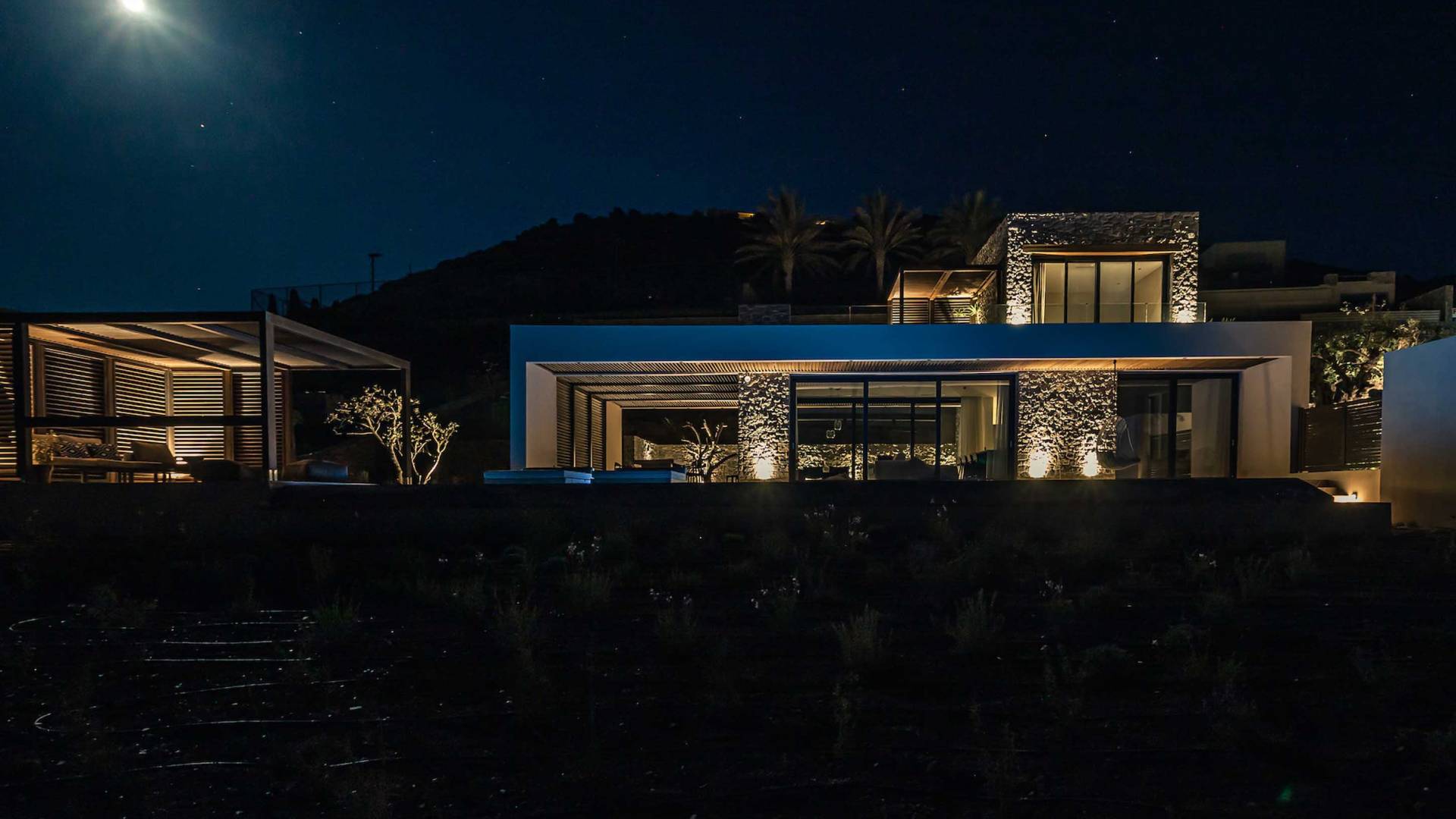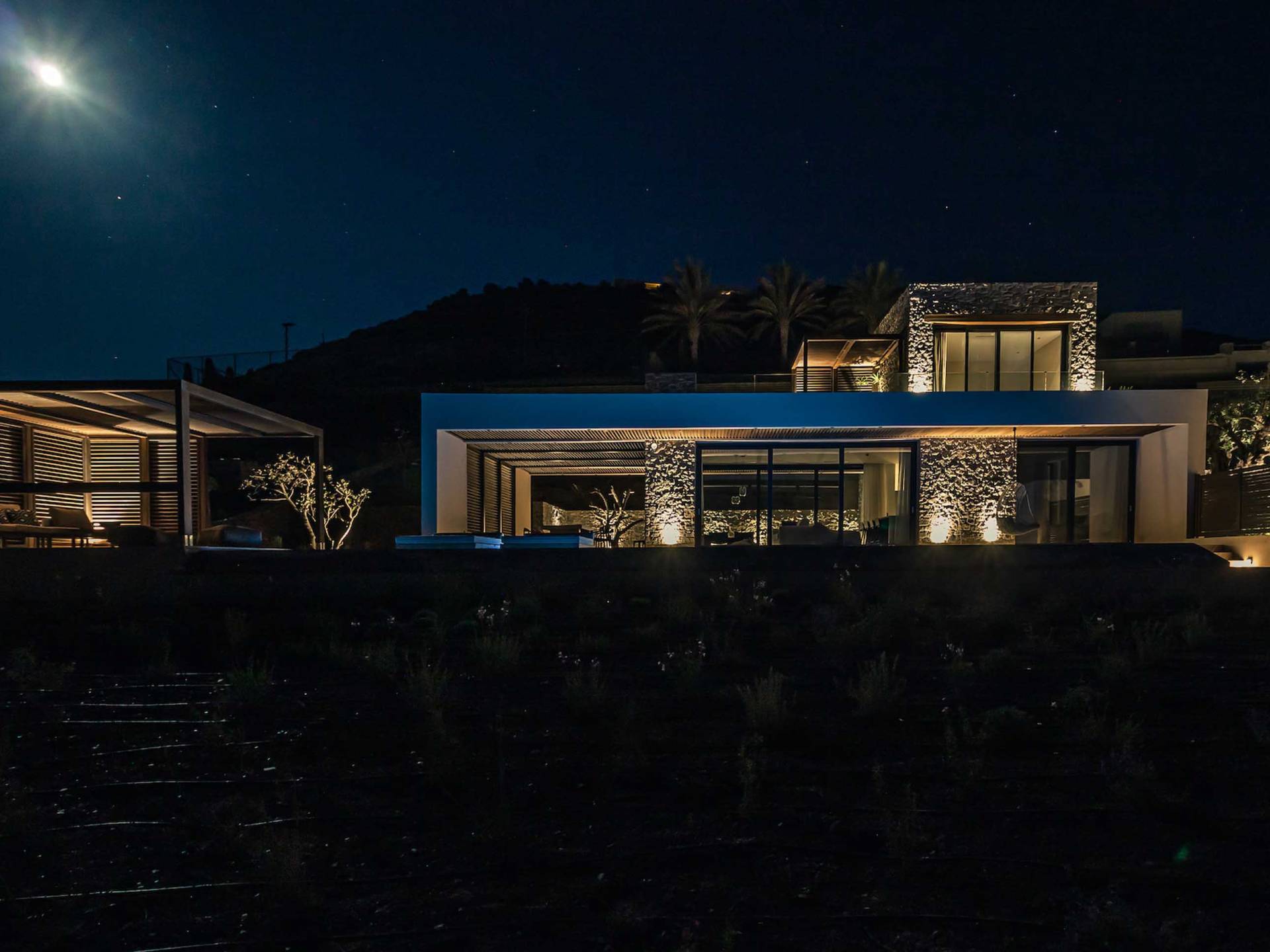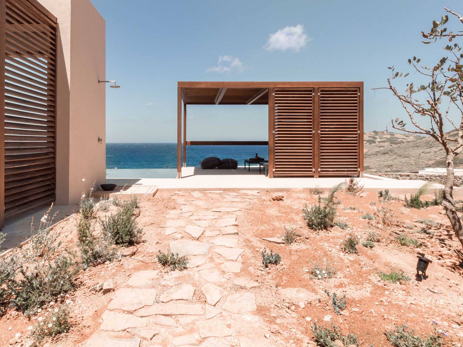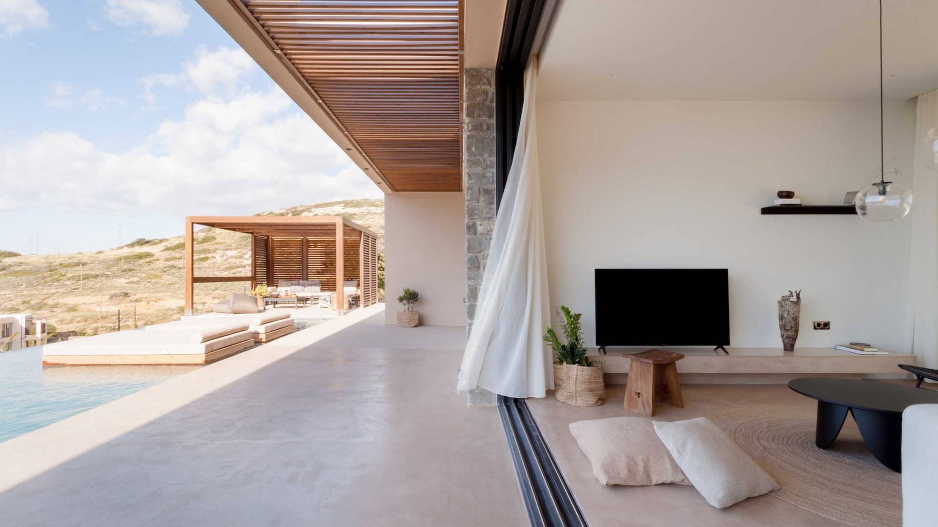 Το Sense Two Villa Crete παραπέμπει ταυτόχρονα στην τραχιά και ομαλή αισθητική, οι δομές εμποτίστηκαν με ένα μείγμα από ζεστό ιβουάρ μπετόν και παραδοσιακές πέτρες του νησιού μαζί με τις γεωμετρικές γραμμές με αποτέλεσμα μια αβίαστη σύνδεση με τη φύση.