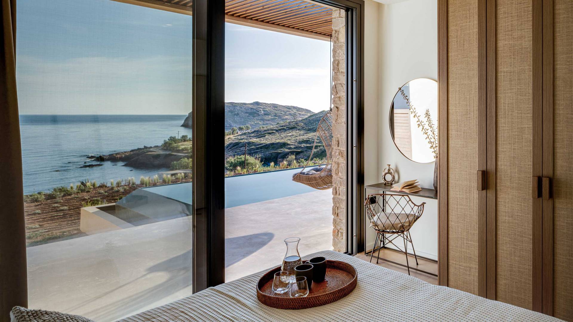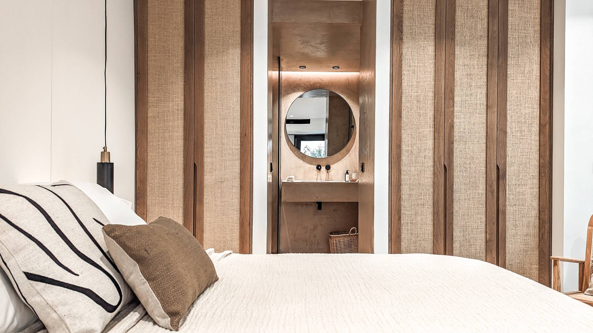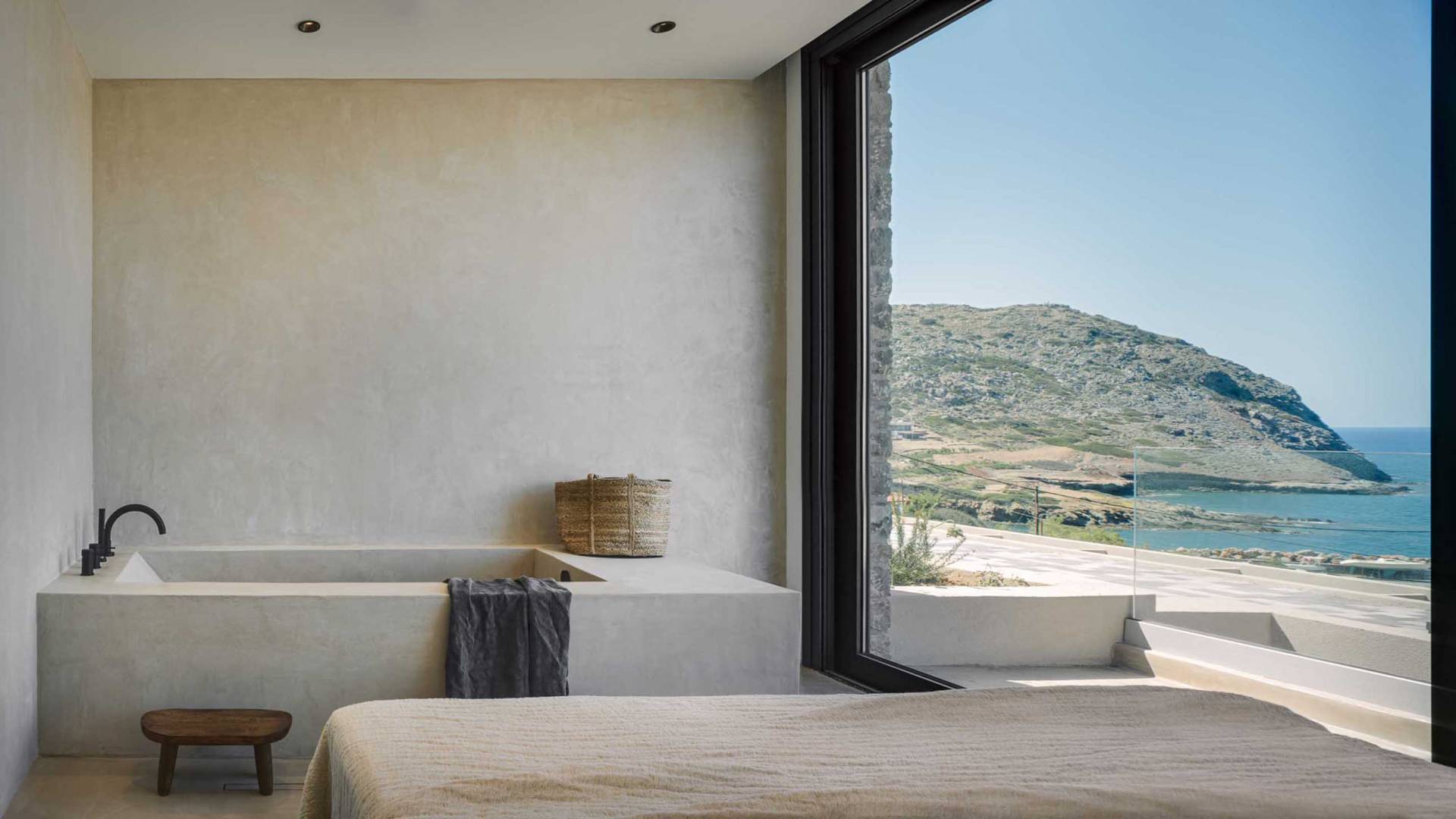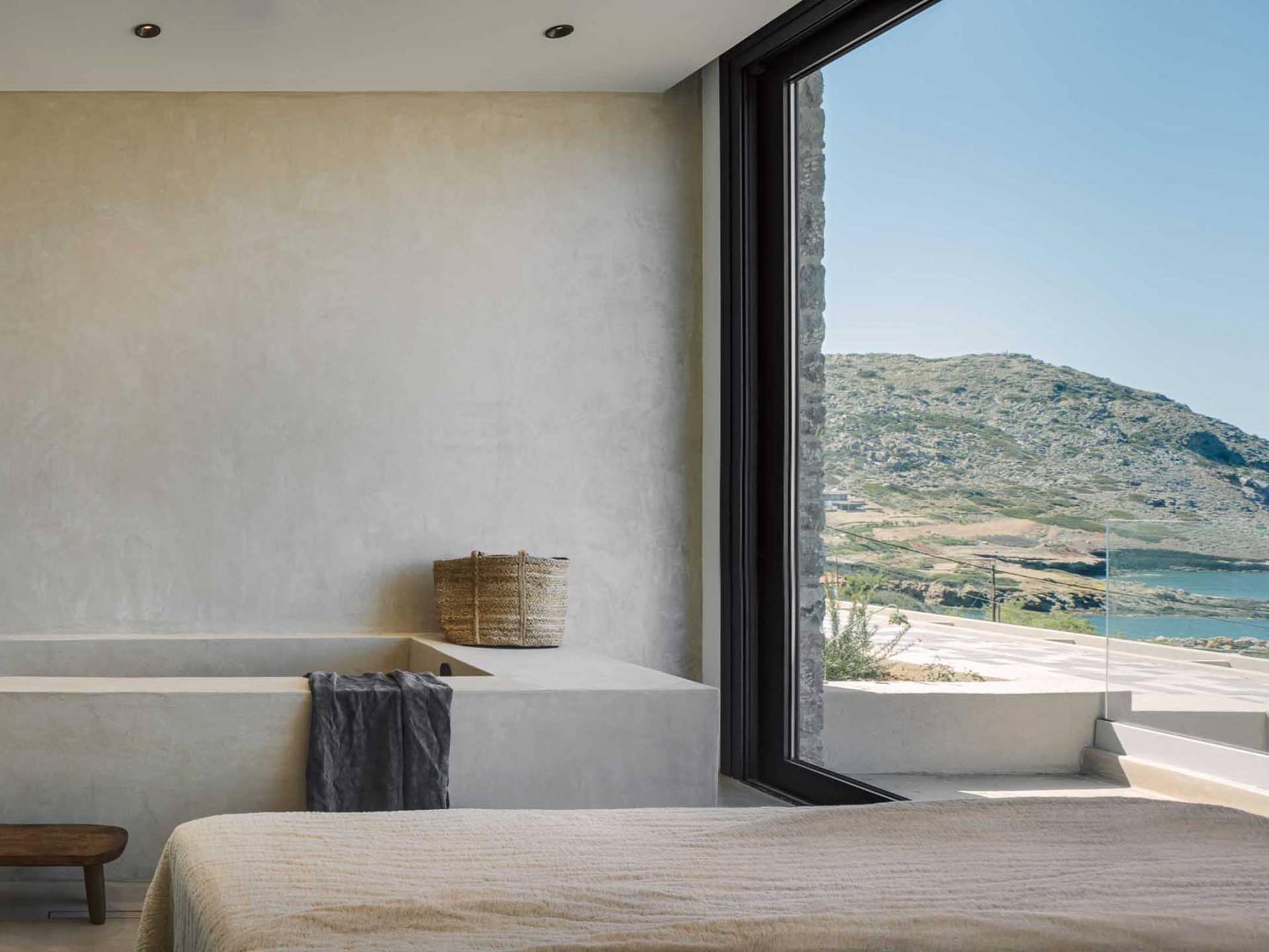 Το Sense Two Villa Crete είναι πραγματική απόδειξη ότι υπάρχει ομορφιά στην απλότητα. Οι δημιουργοί πίσω από αυτό το ολοκαίνουργιο έργο εμπνεύστηκαν από το φυσικό περιβάλλον καθώς και από την ακατέργαστη ομορφιά του κρητικού τοπίου. Η έκθεση στη θάλασσα και η αίσθηση του αλμυρού αέρα κατά μήκος των γήινων και απαλών μυρωδιών των τοπικών αρωματικών βοτάνων δένουν αρμονικά με την αρχιτεκτονική γλώσσα των δύο ιδιοκτησιών. Ένα μείγμα από οργανικά υφάσματα, βαμβάκι και λινά κοσμούν το κρεβάτι και τις κουρτίνες, ενώ τα ξύλινα έπιπλα και τα γήινα χρώματα δημιουργούν ένα ιδιωτικό χαλαρωτικό καταφύγιο Η αίσθηση ηρεμίας και χαλάρωσης ενισχύεται χάρη στα ξύλινα έπιπλα, το κονίαμα και την αντίθεση μεταξύ του ουδέτερου γκρι, της άμμου και του ιβουάρ»