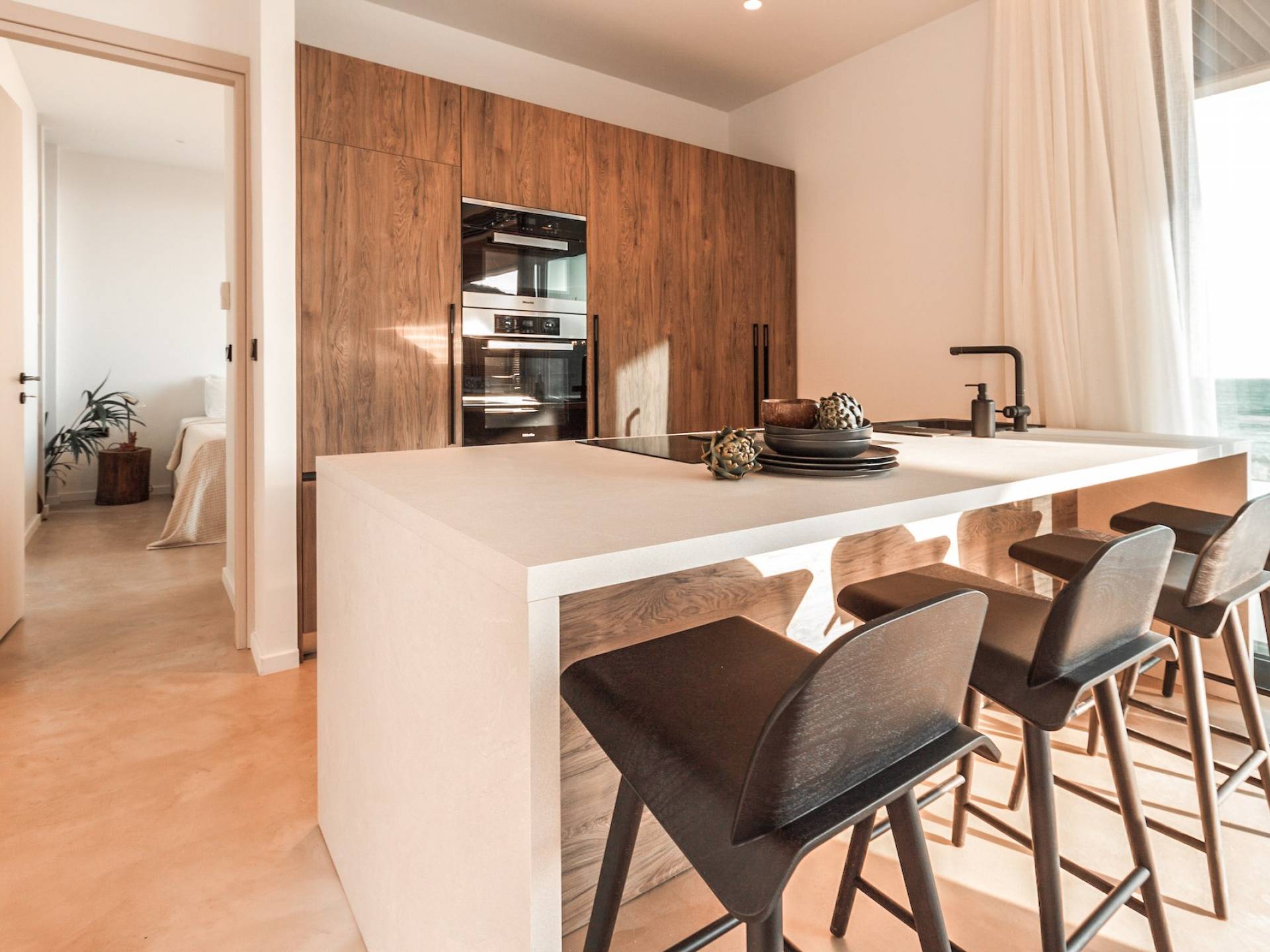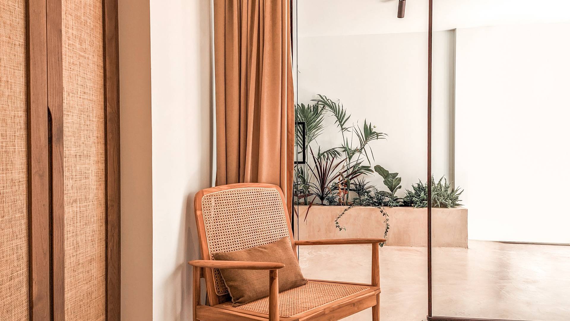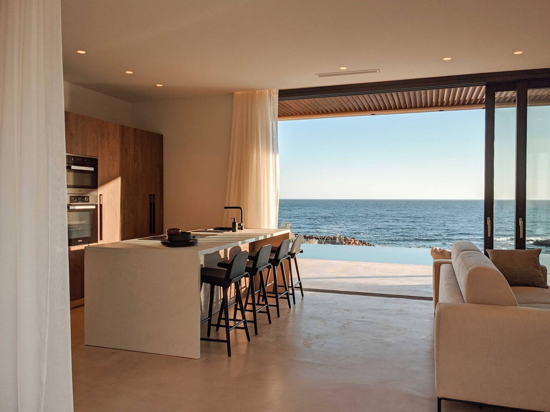 Οι φυσικές επιφάνειες και η χαλαρωτική παλέτα αποχρώσεων είναι συνεπείς στα μπάνια όπου η ενσωματωμένη μπανιέρα και τα πολυτελή ντους βροχής αναδεικνύουν τη σαγηνευτική ατμόσφαιρα των εσωτερικών χώρων. Προσθέστε ένα επιπλέον στρώμα βάθους στα μαύρα μεταλλικά φινιρίσματα και προσφέρετε μια κομψή και μινιμαλιστική αίσθηση. Προχωρώντας από το εξωτερικό στους εσωτερικούς χώρους, η έννοια της εσωτερικής-εξωτερικής διαβίωσης μεταφράζεται σε μια δομή με ογκώδεις συρόμενες πόρτες που συνδέουν το εσωτερικό με το τοπίο και δίνουν την ψευδαίσθηση της ζωής στη φύση