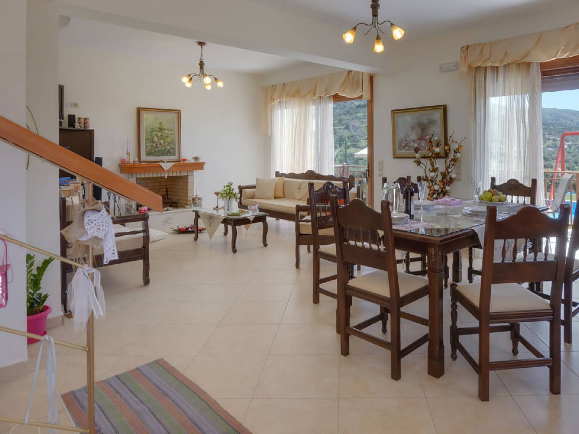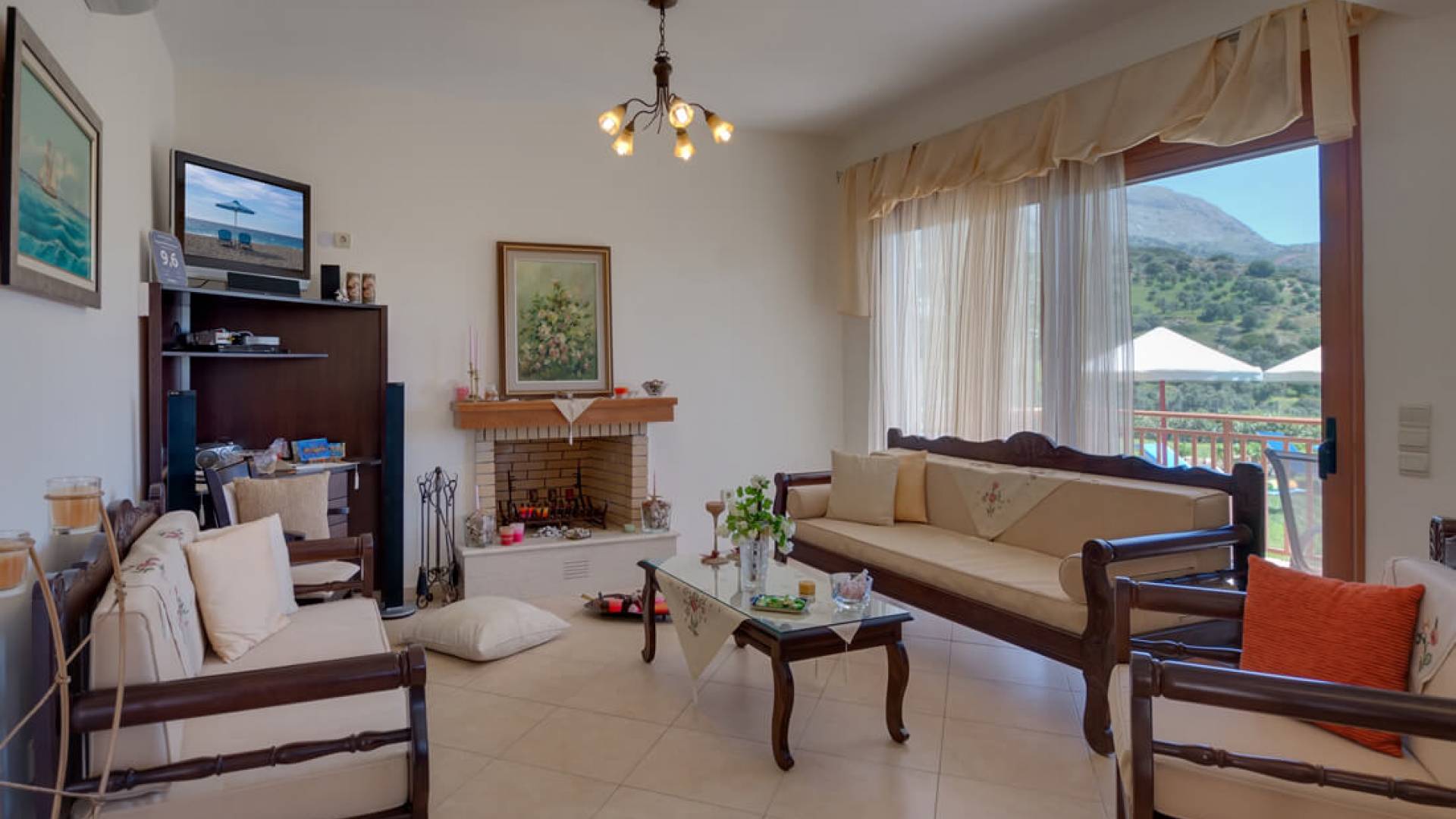 - Open-plan living room with satellite LCD TV, hi-fi system, fireplace