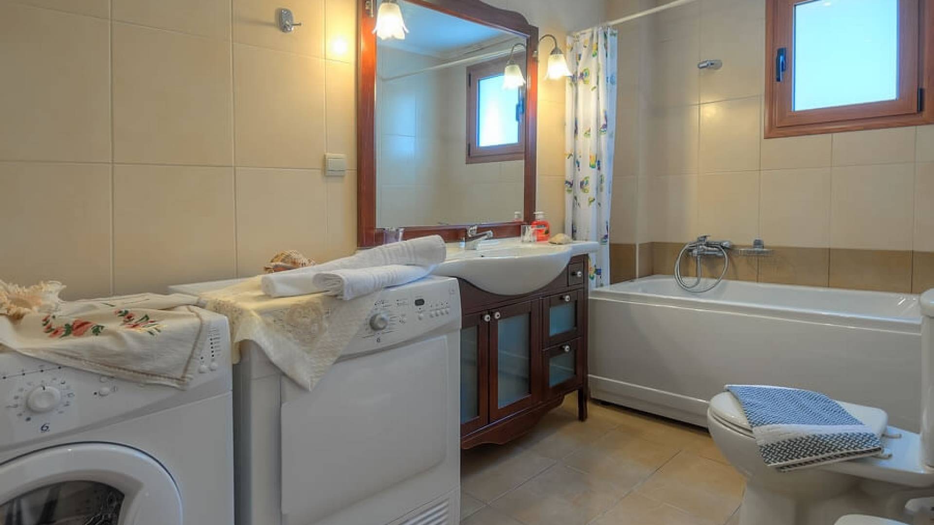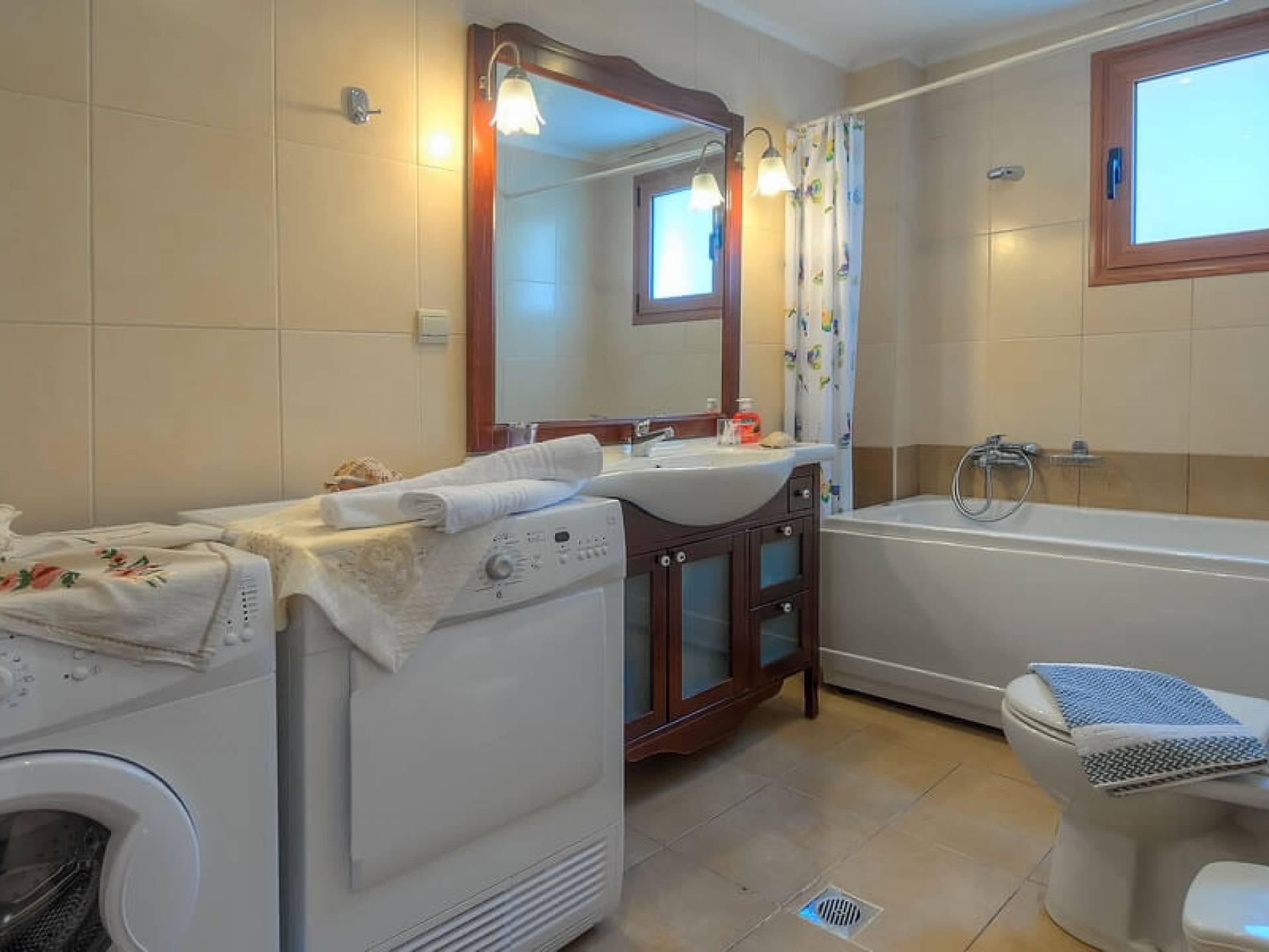 - Luxury family bathroom with washing machine, iron, and ironing board