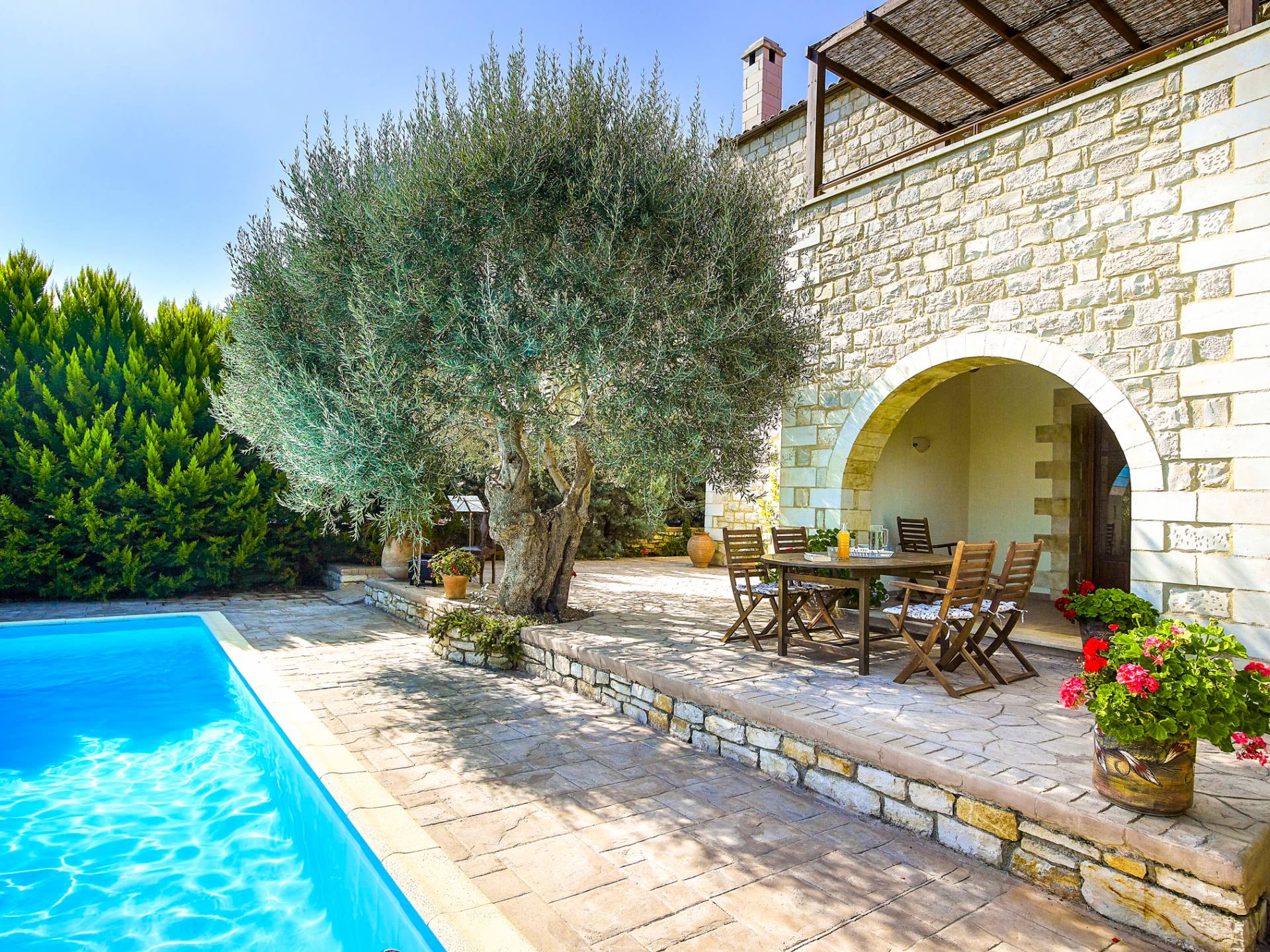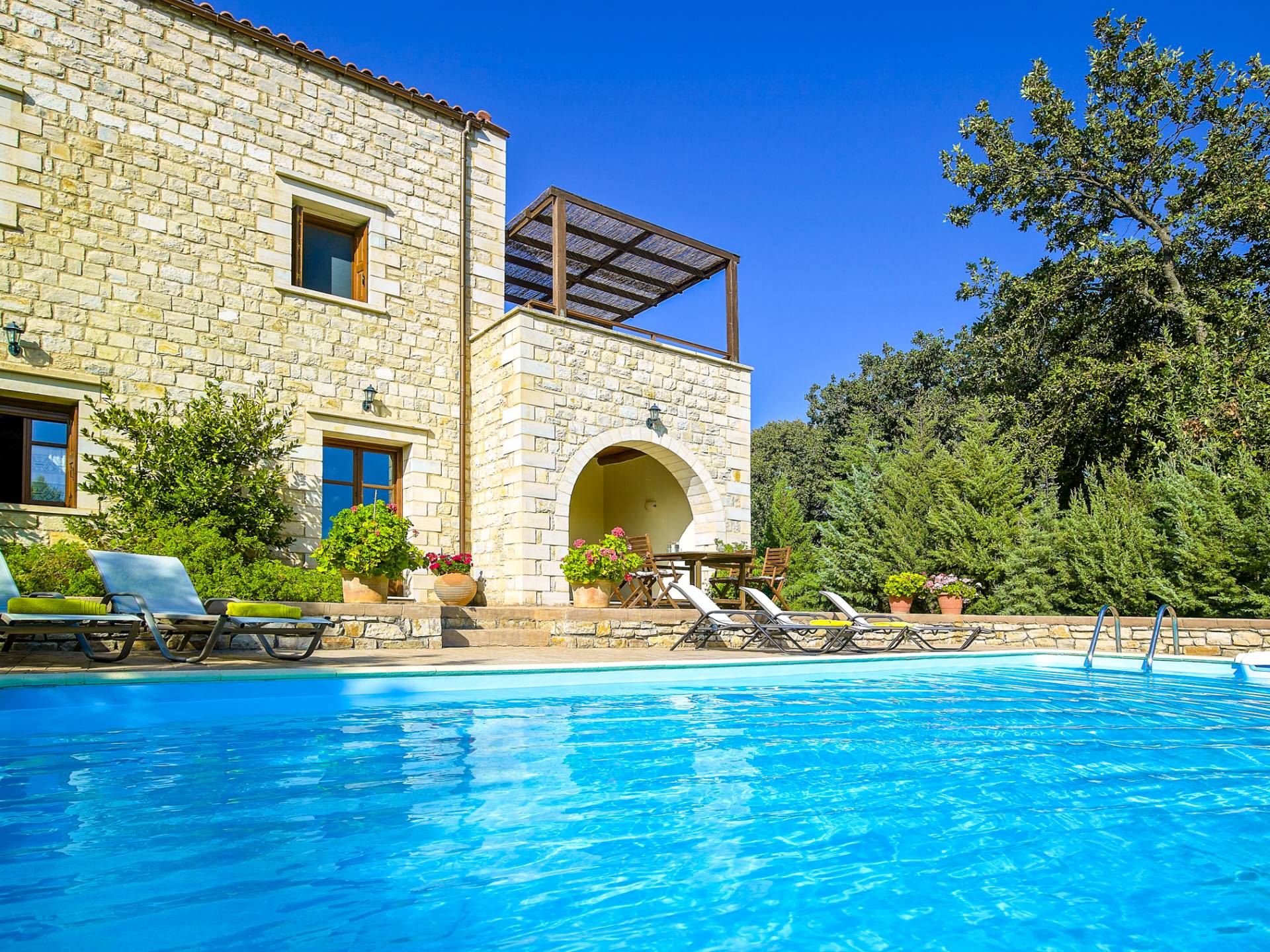 Beautifuly designed, located in a quited area, surrerounded by olive trees, fully equipped and comfortable. The pool is great. There is nothing more you could wish for during your holidays. Host recommended great tavernas with delicious food, where we were treated with a special care.