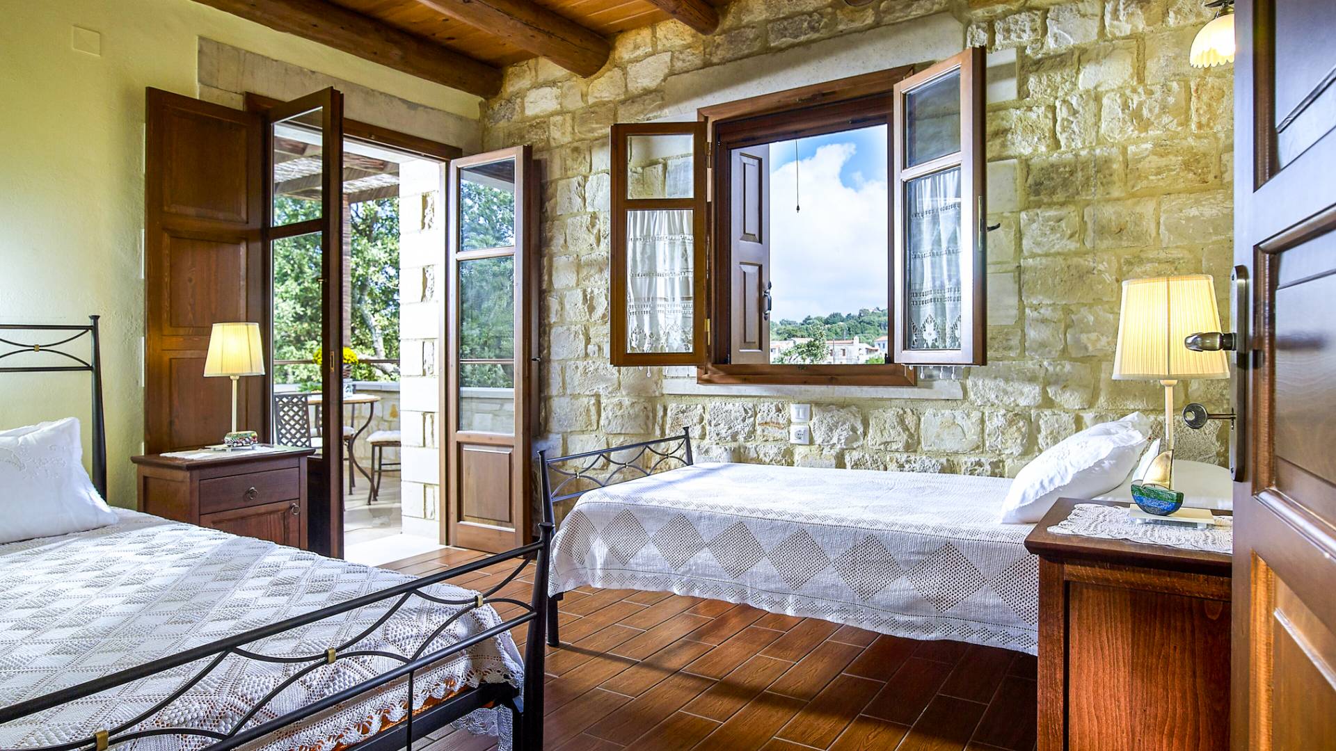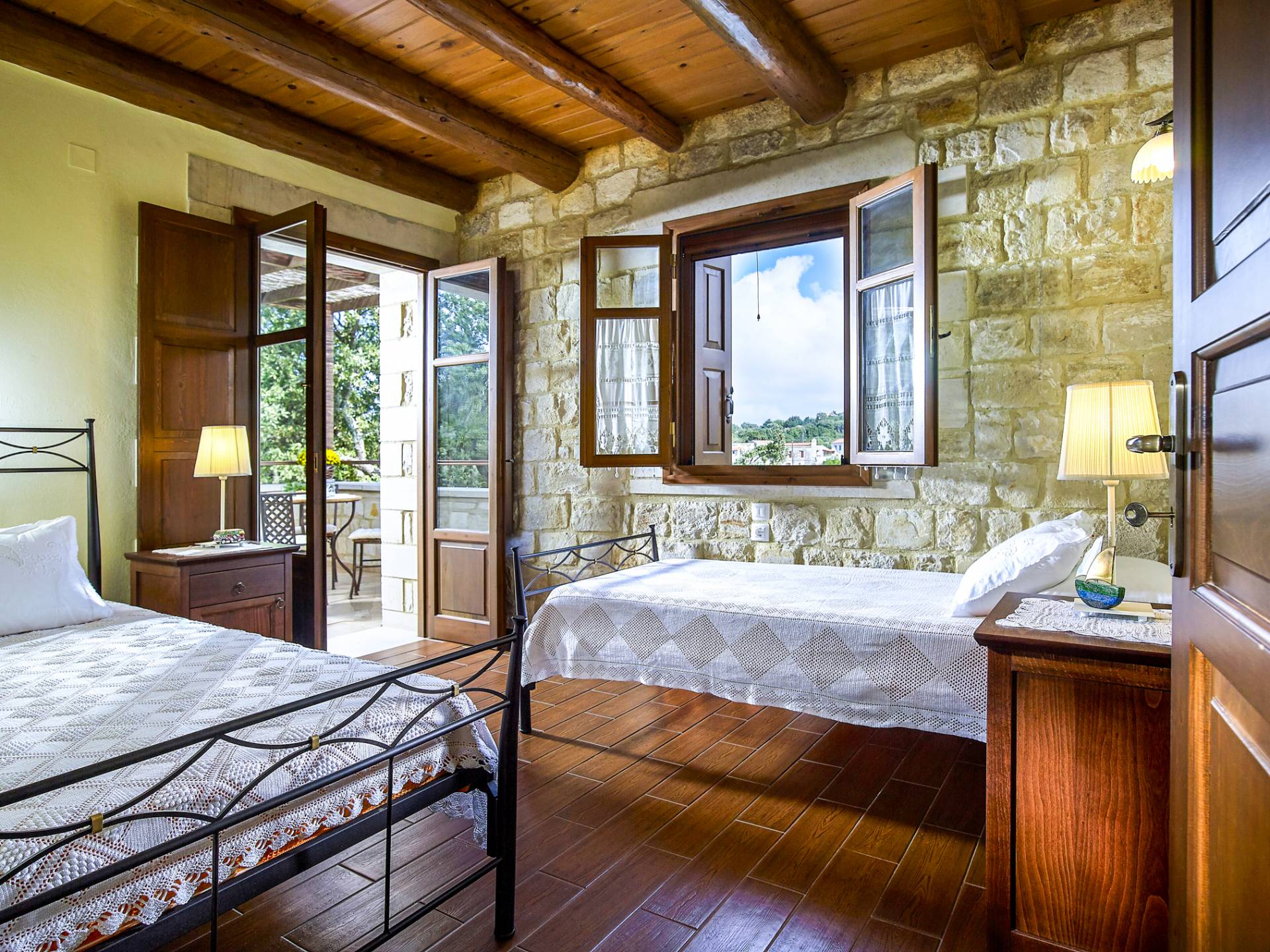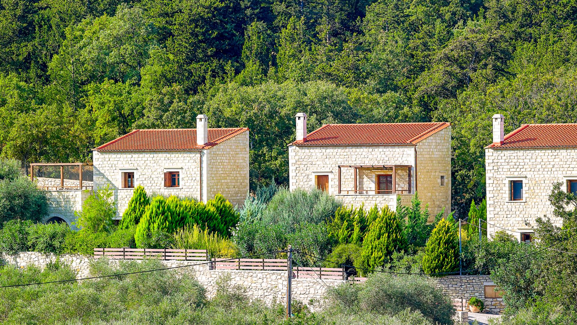 Built with local stone and wood, the villas reflect traditional Cretan style and blend naturally into the landscape.