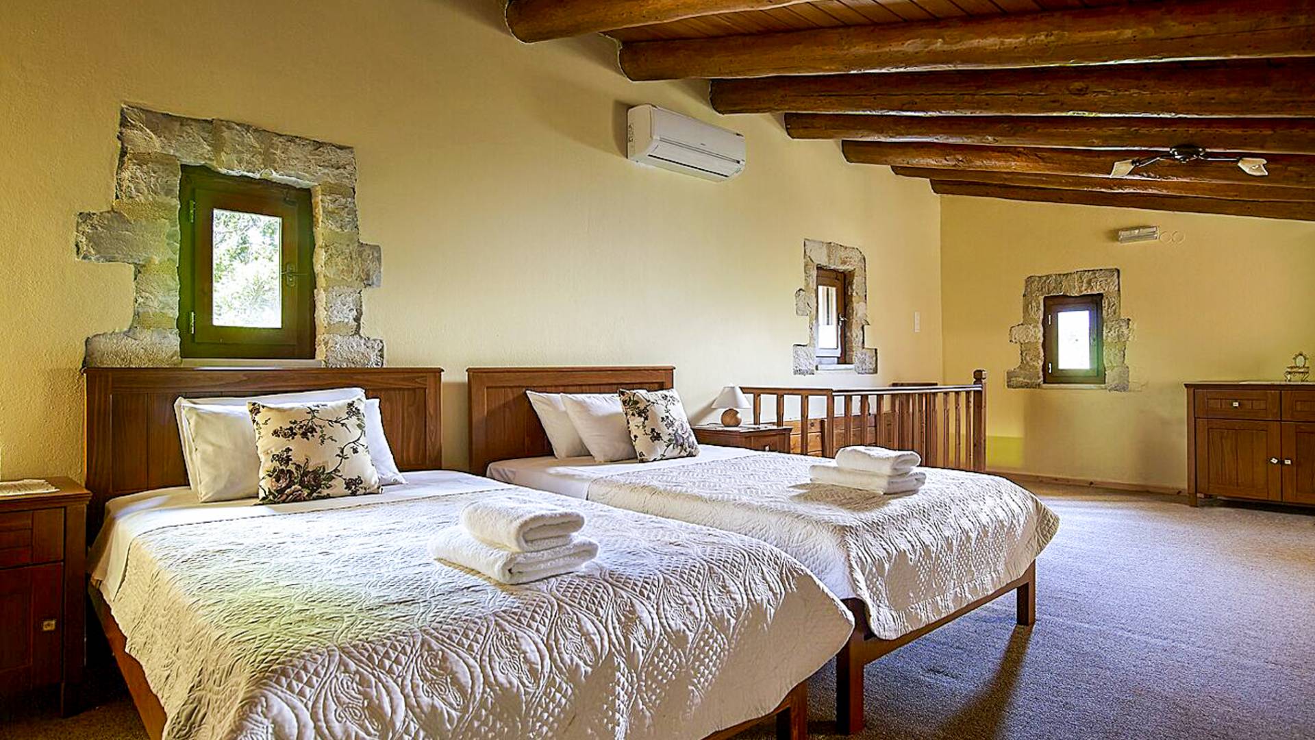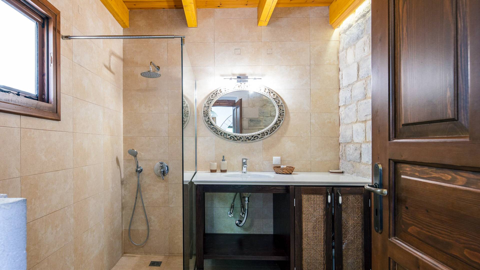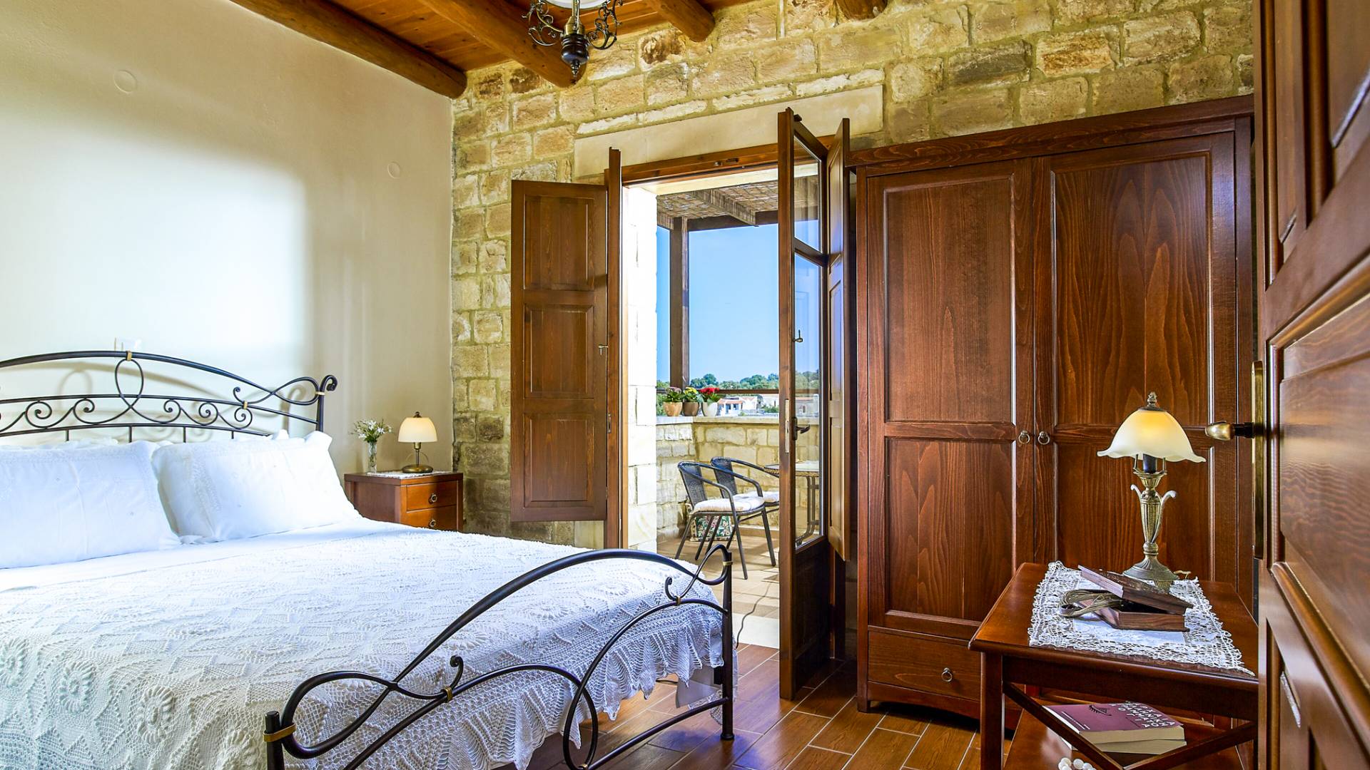 Built with local stone and wood, the villas reflect traditional Cretan style and blend naturally into the landscape.