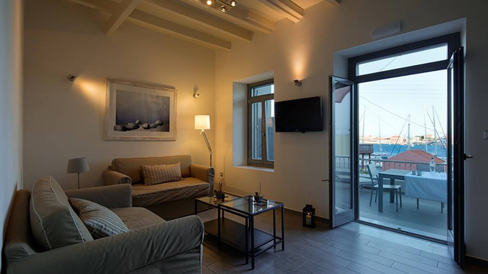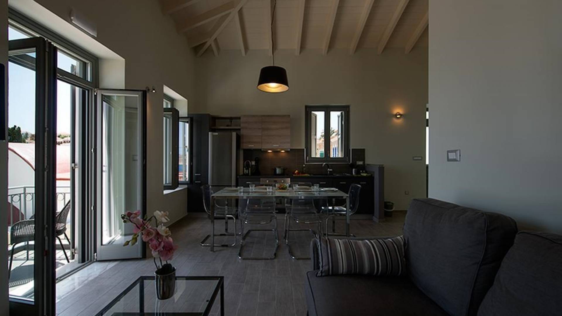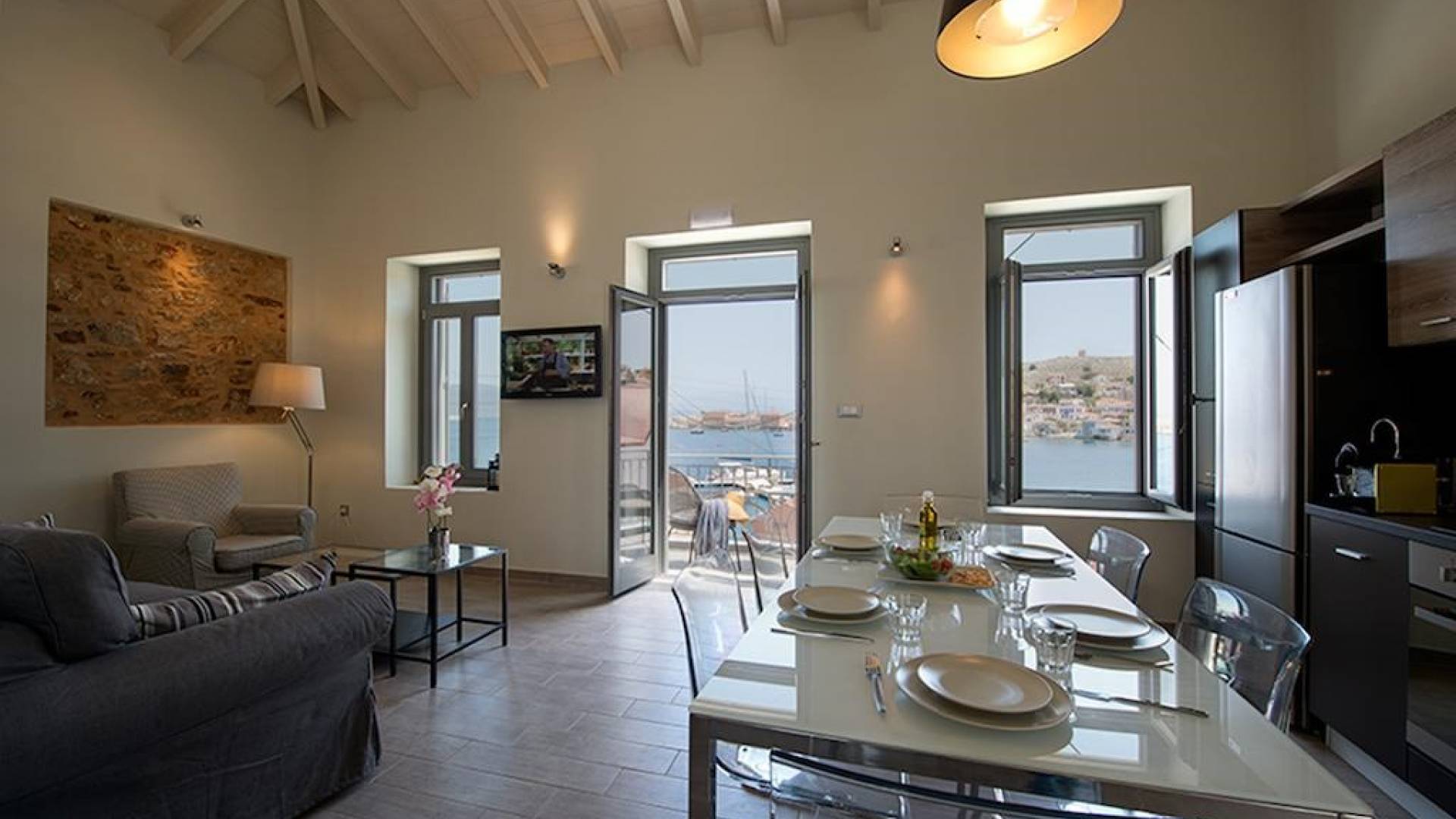 Διαμέρισμα 1ΔΜ στη Villa Kalypso (50 τ.μ.) περιλαμβάνει ένα μεγάλο υπνοδωμάτιο με king-size κρεβάτι και μια μεγάλη ντουλάπα με πλήρως εξοπλισμένο μπάνιο. ευρύχωρη κουζίνα/σαλόνι, που περιλαμβάνει πλήρως εξοπλισμένη κουζίνα, μεγάλη τραπεζαρία, 2 καναπέδες-κρεβάτια που μπορούν να φιλοξενήσουν 2-3 άτομα, τηλεόραση LCD 32 ιντσών και ραδιόφωνο/σταθμό σύνδεσης για το iPod/iPhone/MP3 player σας. μια μεγάλη βεράντα (ισόγειο διαμέρισμα) ή ένα μεγάλο μπαλκόνι (πάνω διαμέρισμα) με καθιστικές καρέκλες, ξαπλώστρες (ισόγειο) και ένα τραπέζι, ιδανικό για πρωινό, μεσημεριανό γεύμα, δείπνο ή ένα τελευταίο ποτό πριν τον ύπνο, απολαμβάνοντας εκπληκτική θέα στο Χάλκη παραδοσιακό χωριό.