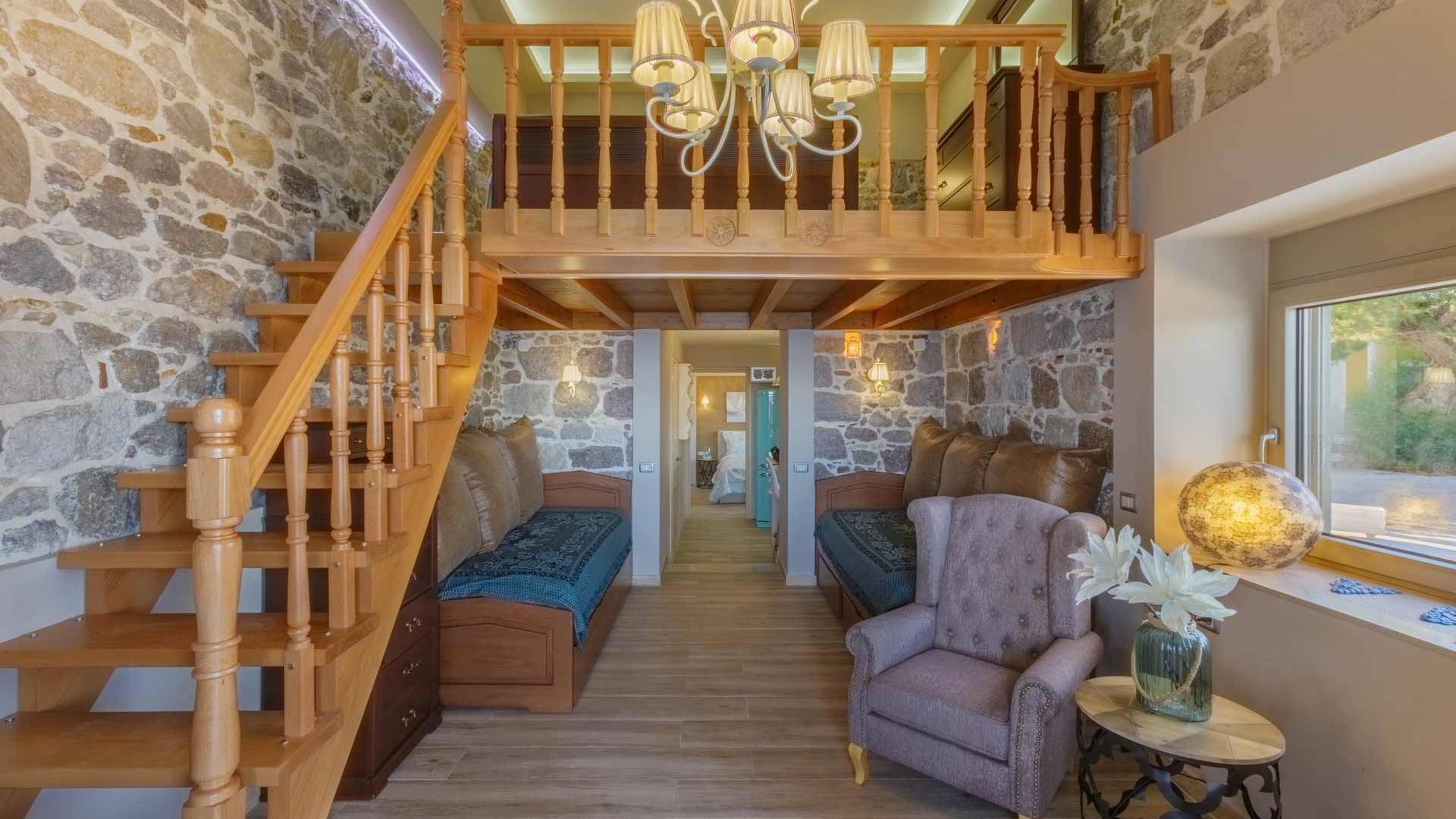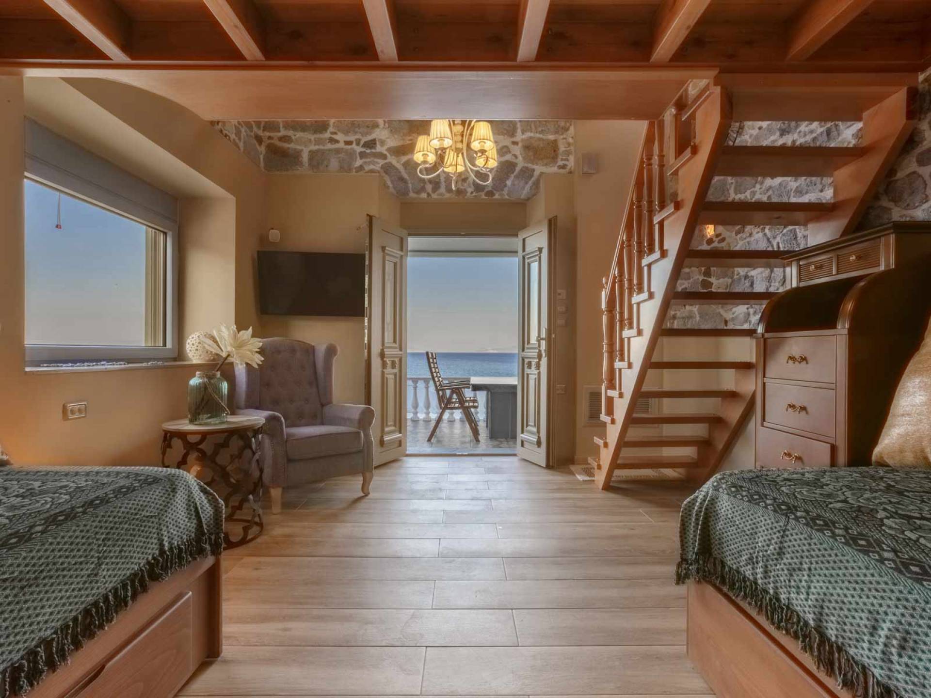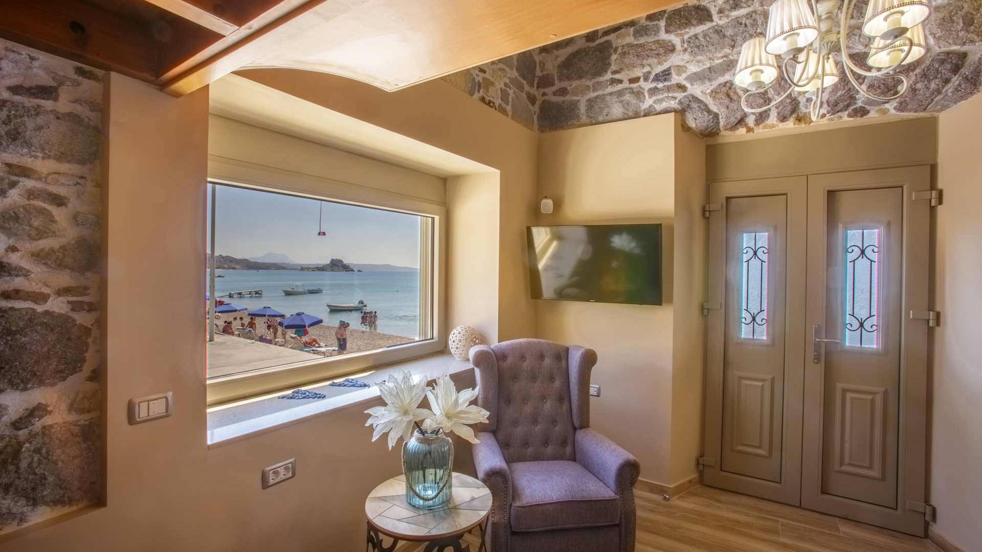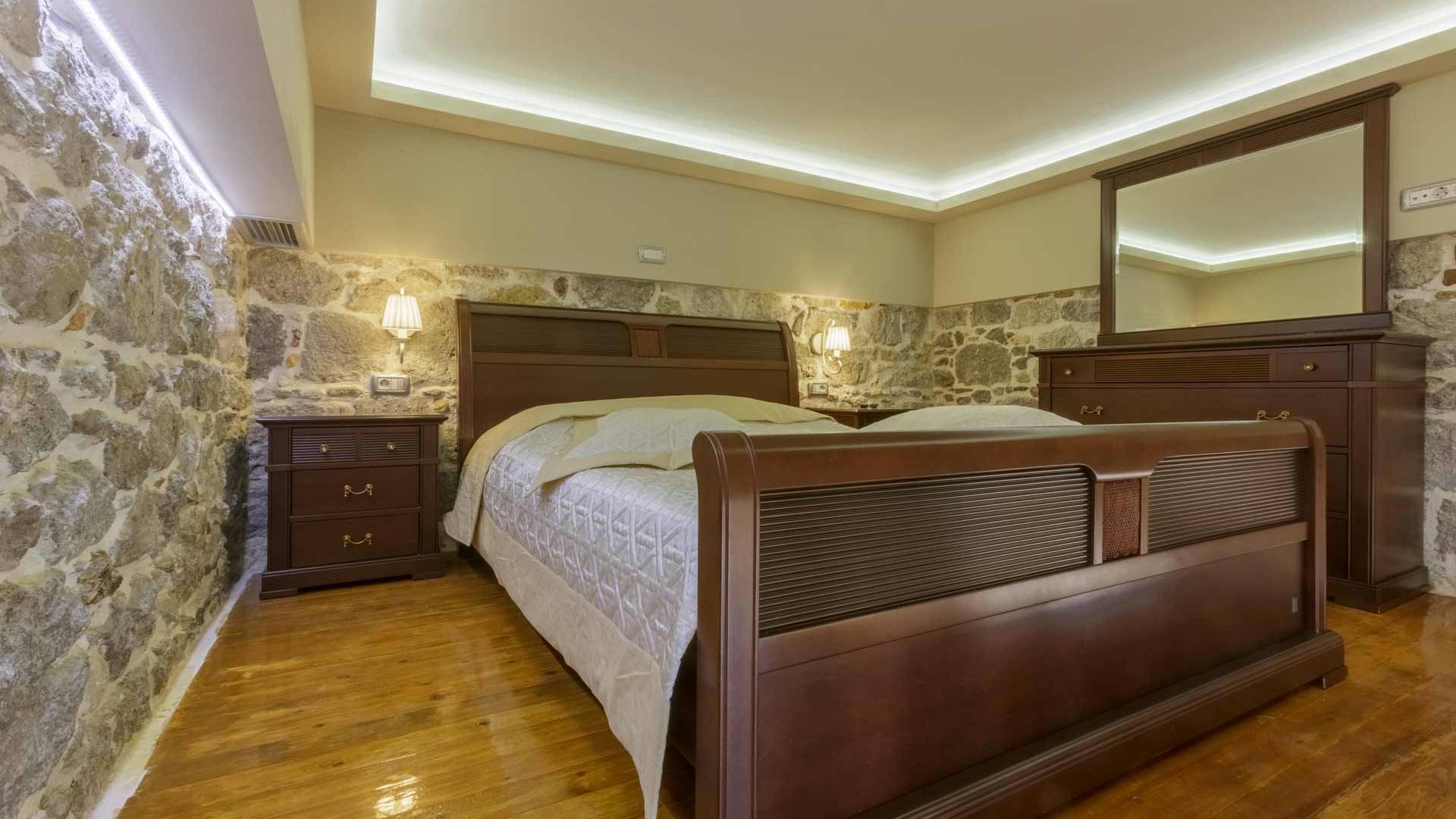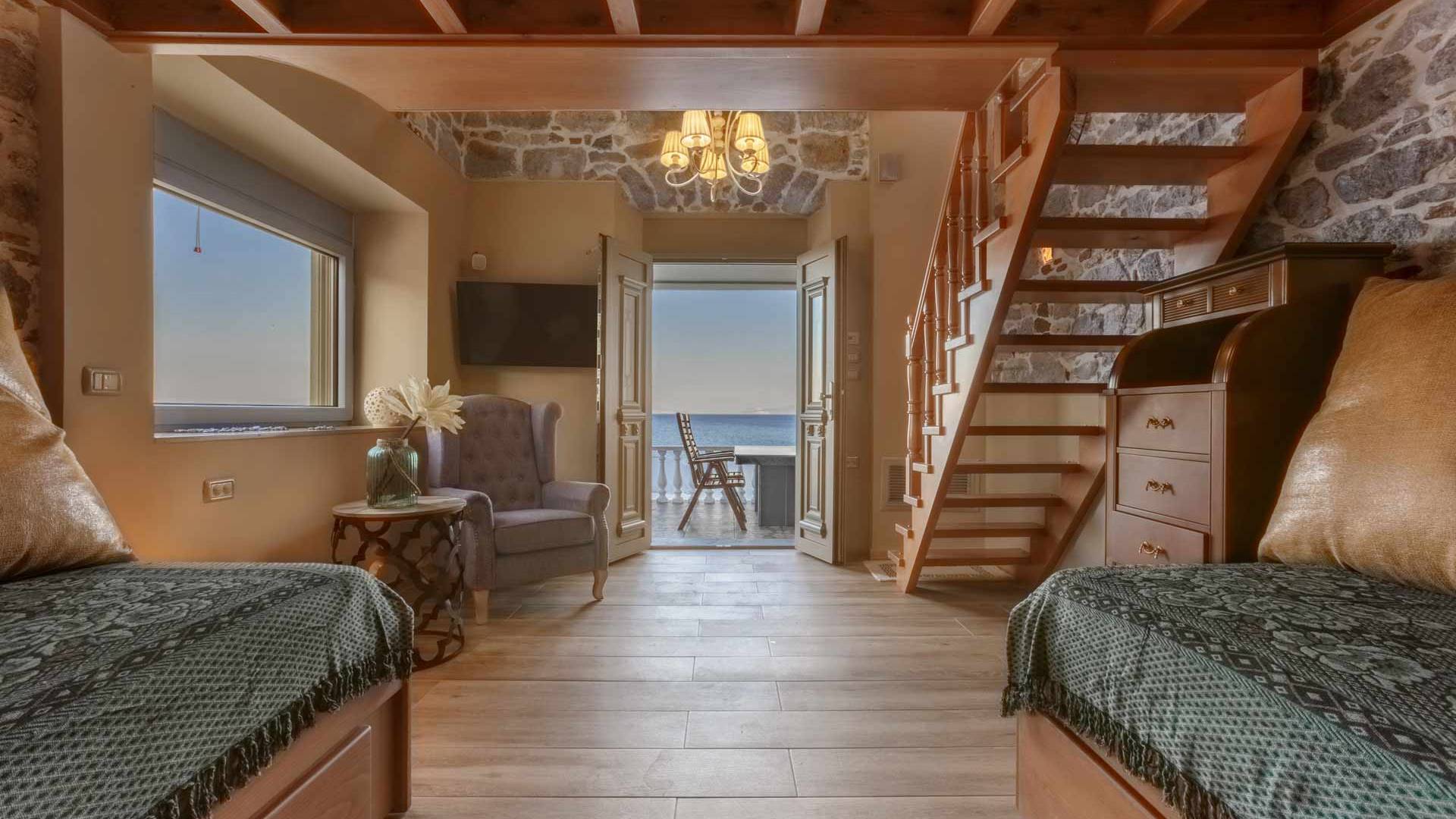 Το εσωτερικό της βίλας αποτελείται από δύο υπέροχα δίκλινα υπνοδωμάτια με διπλά κρεβάτια, επίσης δύο μονά κρεβάτια διακοσμημένα με πολυτελείς ρομαντικές κουβέρτες και μια τηλεόραση LED 42 ιντσών. Όλες οι περιοχές είναι ηλιόλουστες και έχουν θέα στη θάλασσα από τα μεγάλα παράθυρά τους. Το χαρακτηριστικό της Villa Valeria Kos είναι η πέτρα και η πολυτέλεια σε συνδυασμό με την εκπληκτική θέα, δημιουργώντας για εσάς ένα ευχάριστο περιβάλλον.