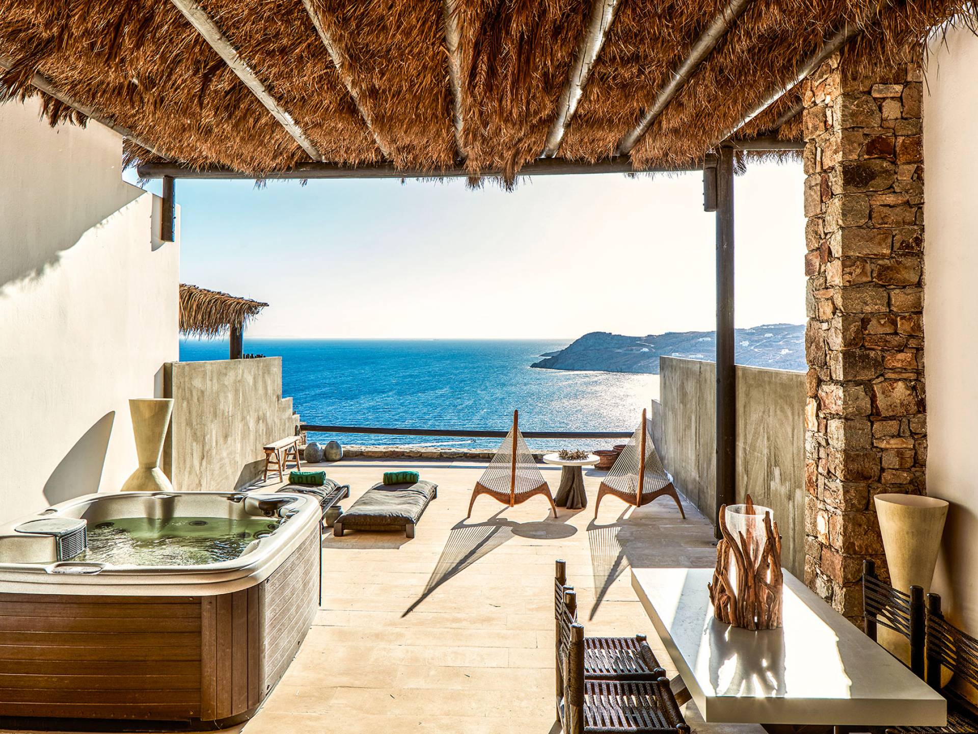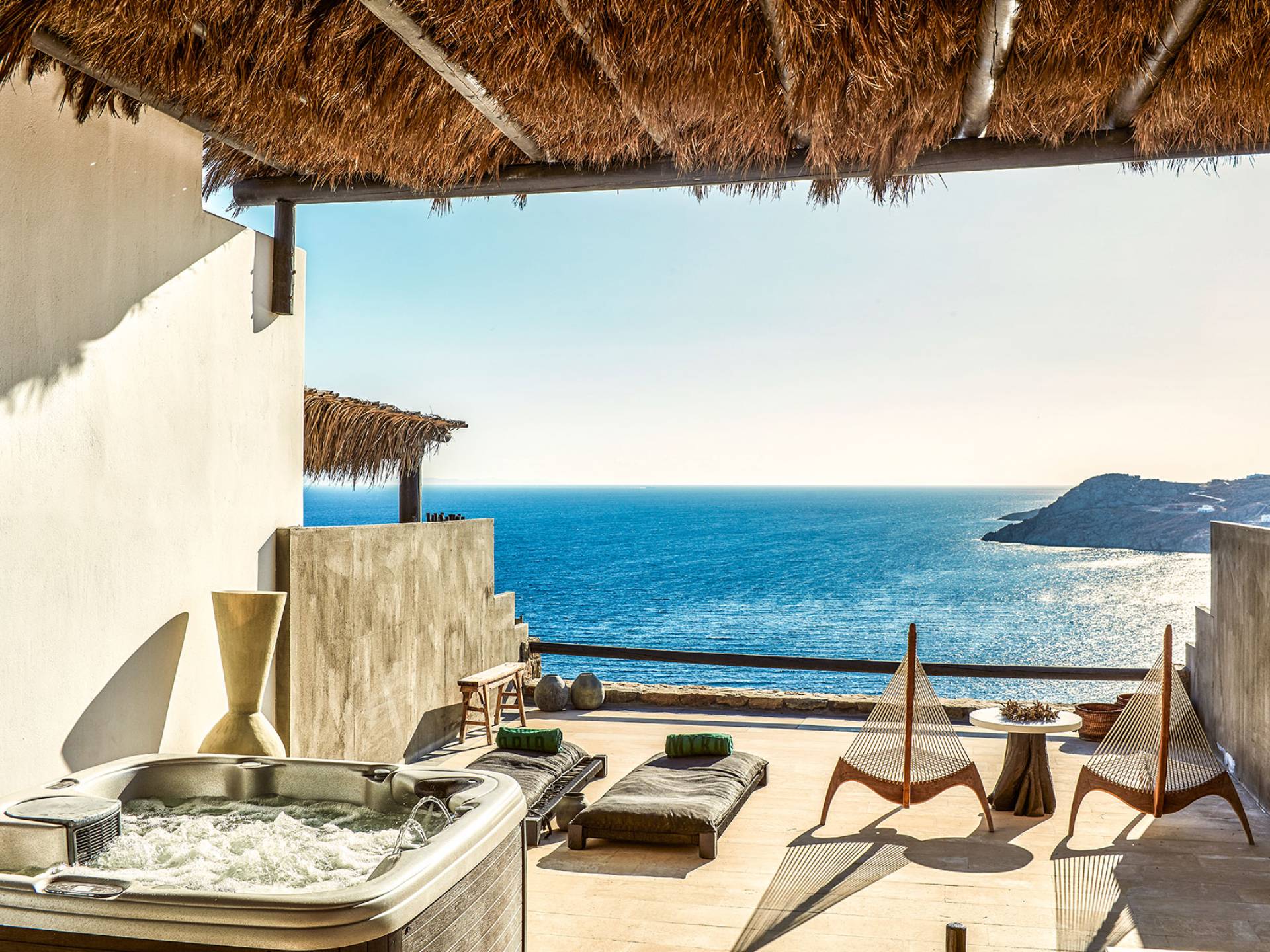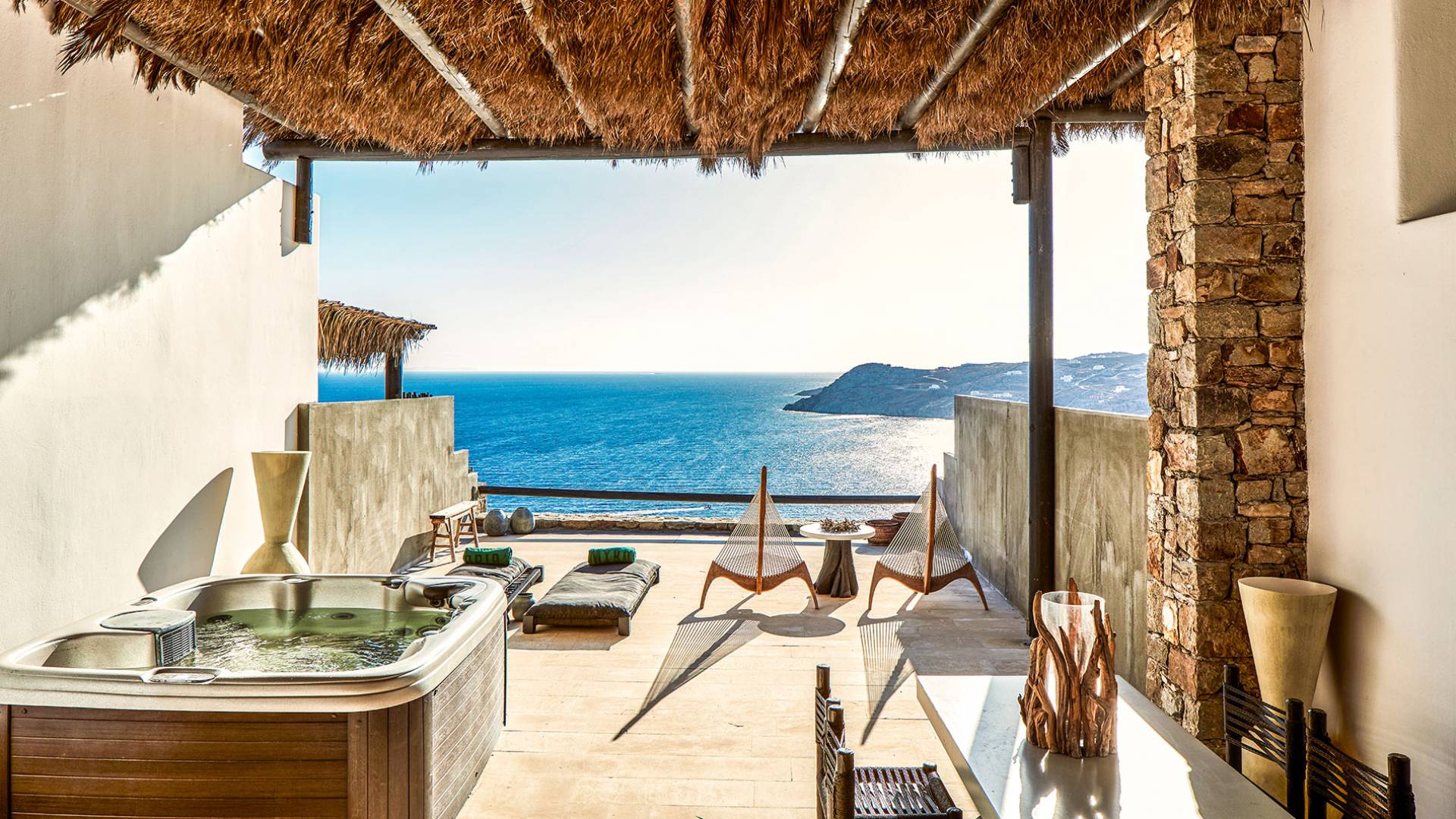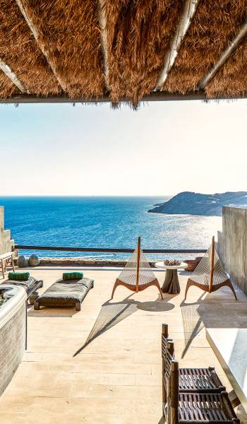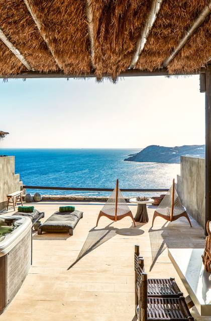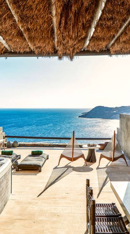 Πολυτελή superior δωμάτια με γενναιόδωρο χώρο 35μ² και ιδιωτική πλήρως επιπλωμένη βεράντα με υπαίθριο τζακούζι που προσφέρει πανοραμική θέα στη θάλασσα στην παραλία Ελιά στη Μύκονο. Μπάνια υψηλής αισθητικής με μπανιέρα και/ή ντους ψιλής βροχής και μπορούν να φιλοξενήσουν έως τρεις ενήλικες ή δύο ενήλικες και ένα παιδί έως 12 ετών.