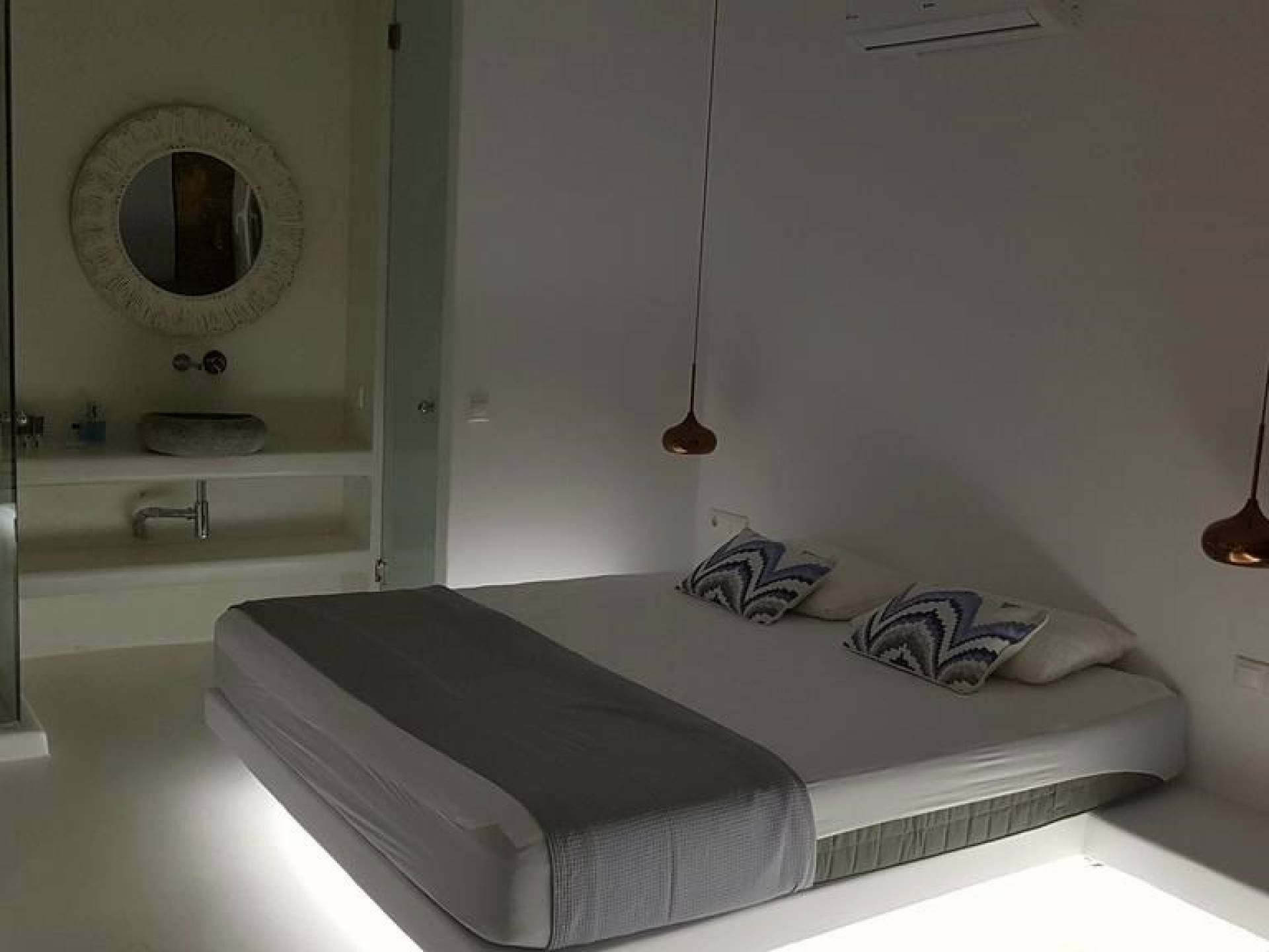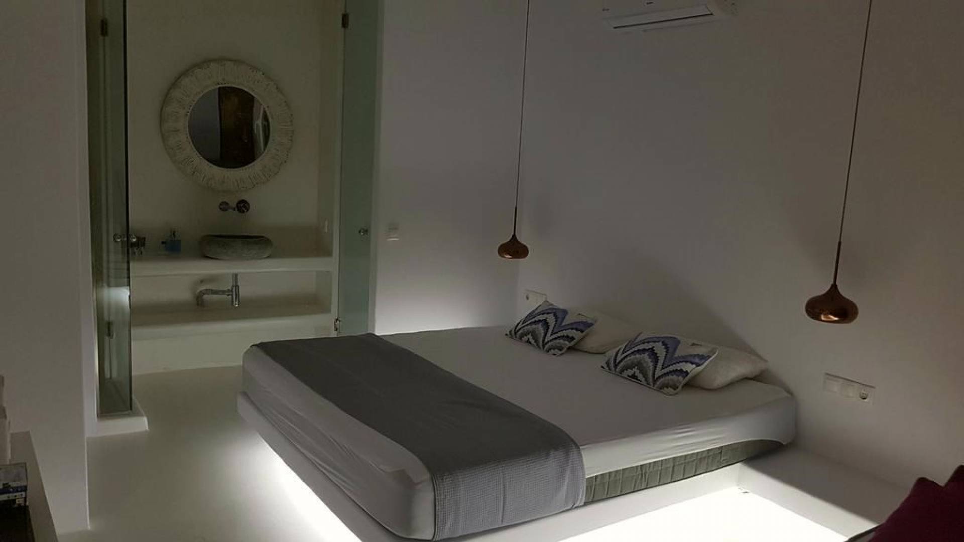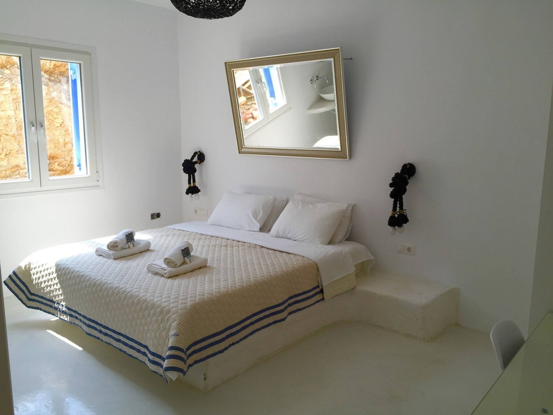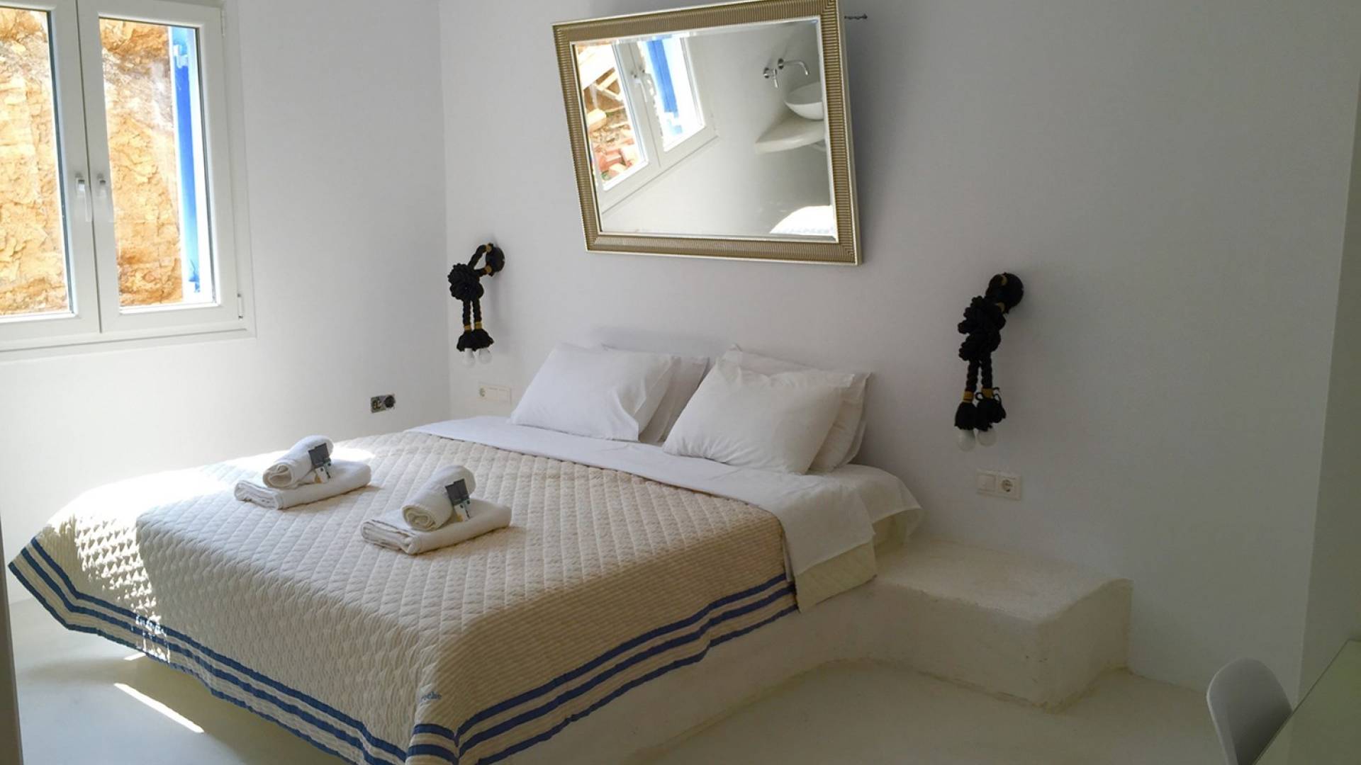 Στη Aphrodite Suite, στο ισόγειο, μπορείτε να απολαύσετε στιγμές χαλάρωσης ατενίζοντας τη θέα στο μοναδικό γαλάζιο του Αιγαίου. Η σουίτα μπορεί να φιλοξενήσει έως και 6 άτομα που θέλουν μια υπέροχη εμπειρία διαμονής στη Μύκονο με minimal διακόσμηση.