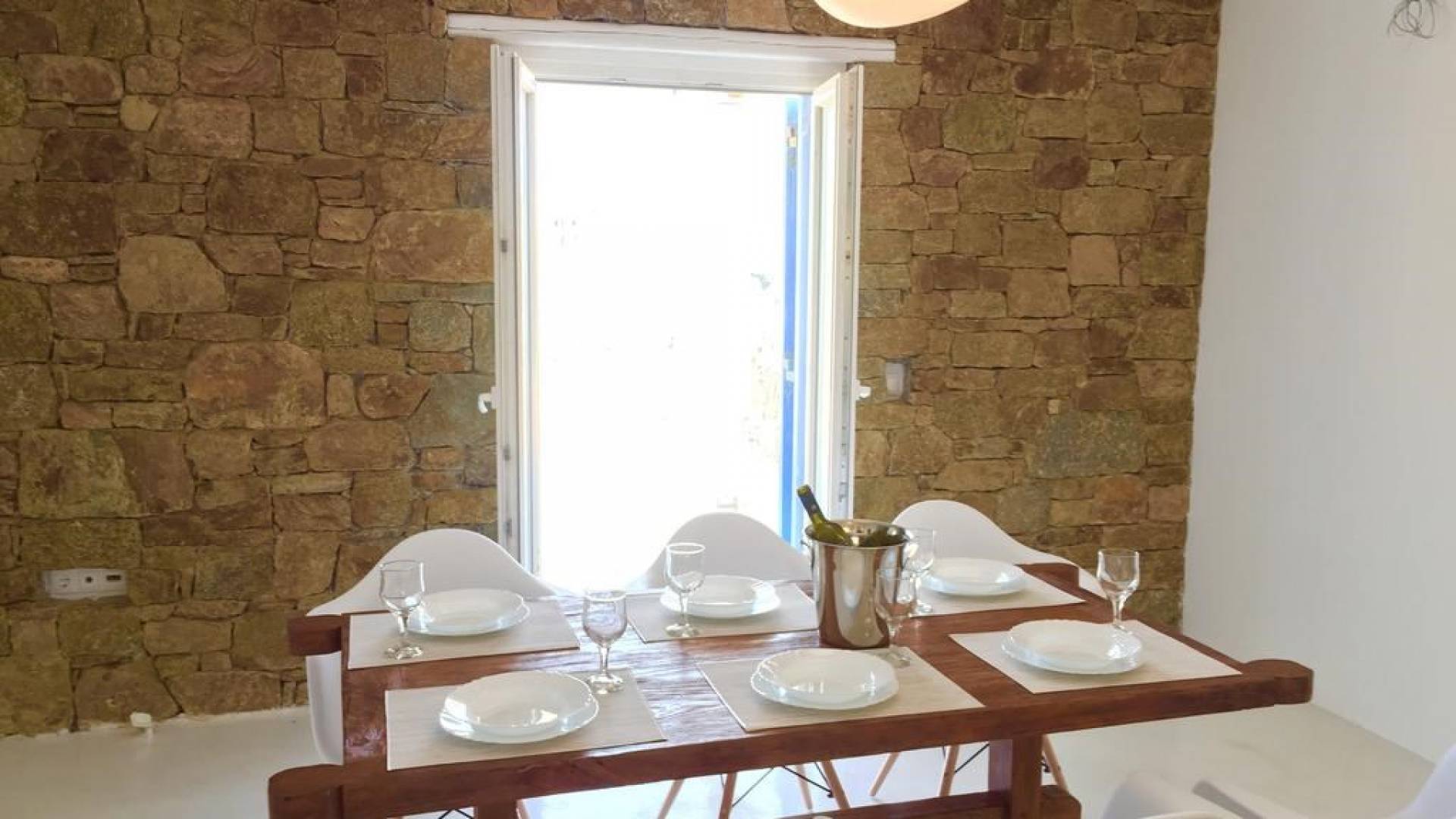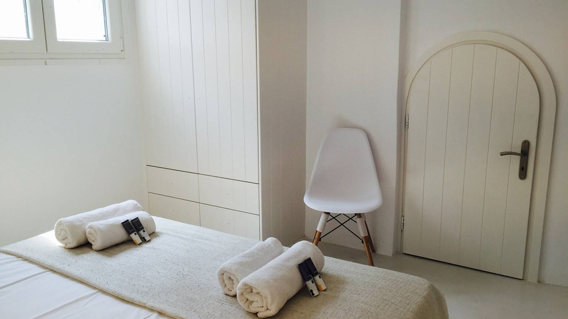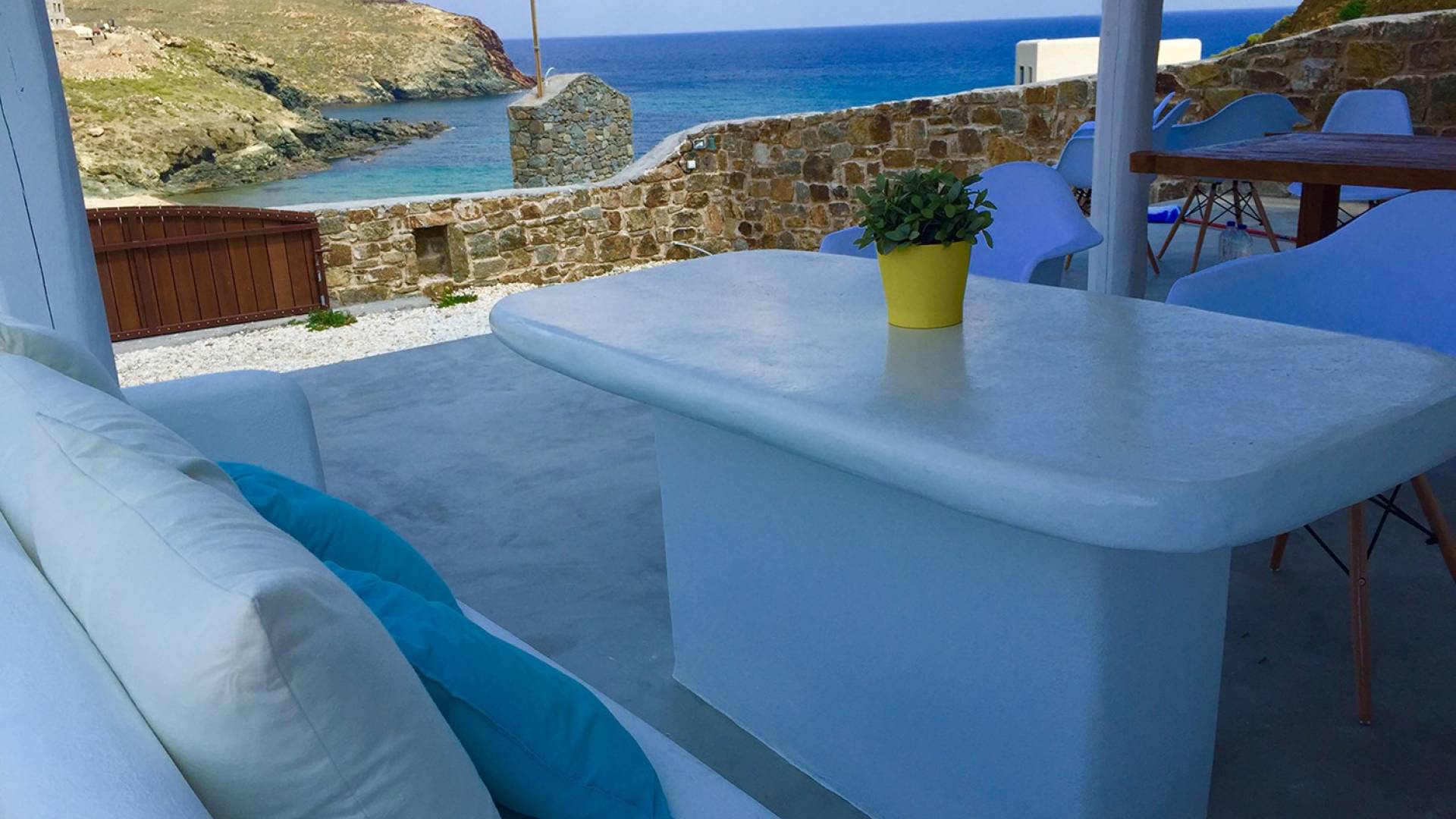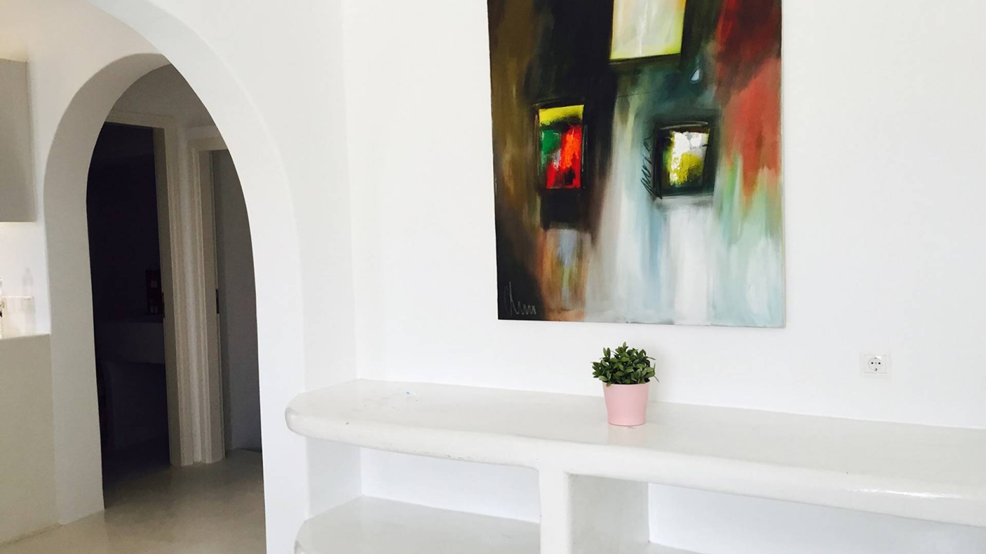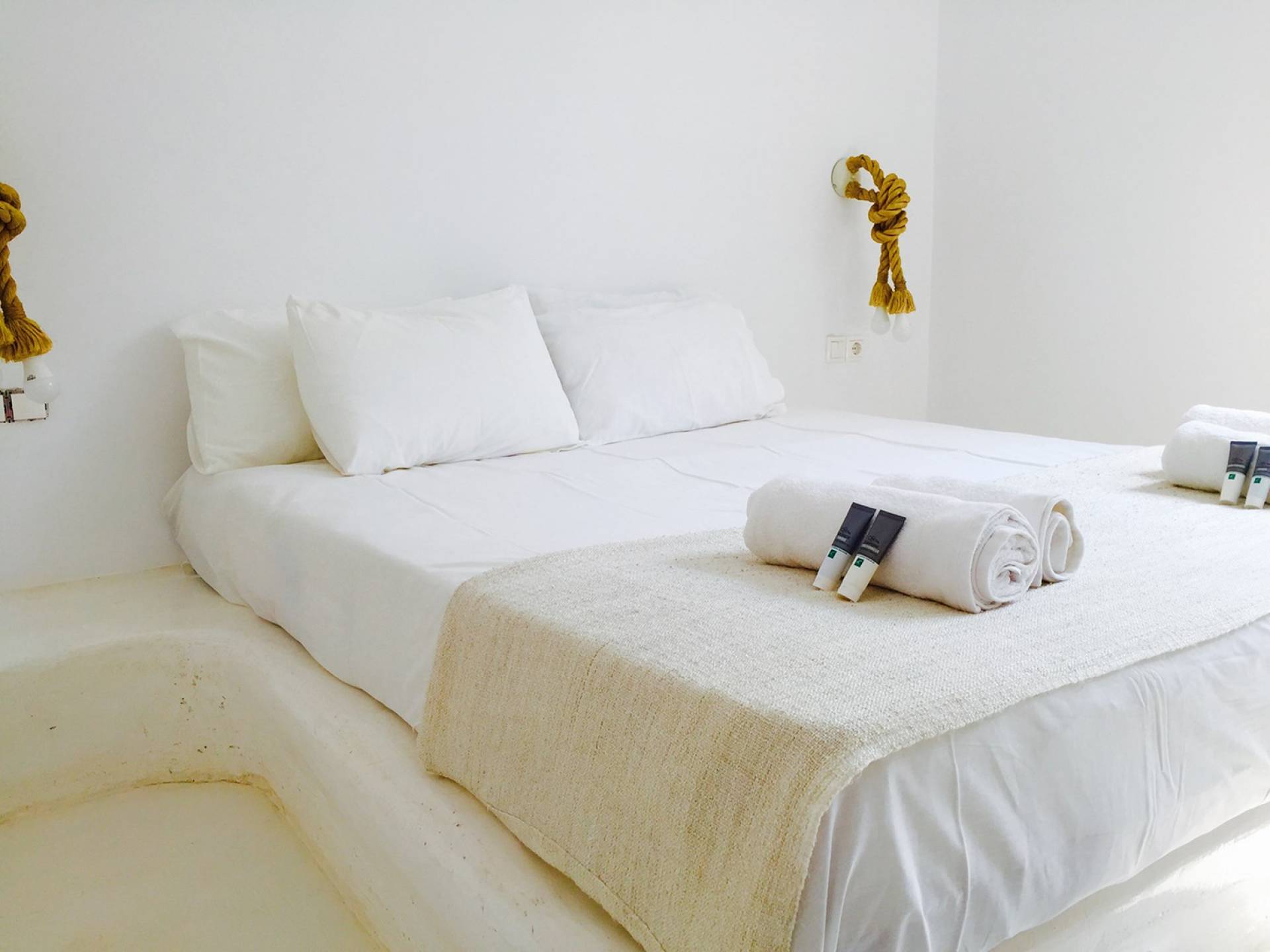 Στη Aphrodite Suite, στο ισόγειο, μπορείτε να απολαύσετε στιγμές χαλάρωσης ατενίζοντας τη θέα στο μοναδικό γαλάζιο του Αιγαίου. Η σουίτα μπορεί να φιλοξενήσει έως και 6 άτομα που θέλουν μια υπέροχη εμπειρία διαμονής στη Μύκονο με minimal διακόσμηση.