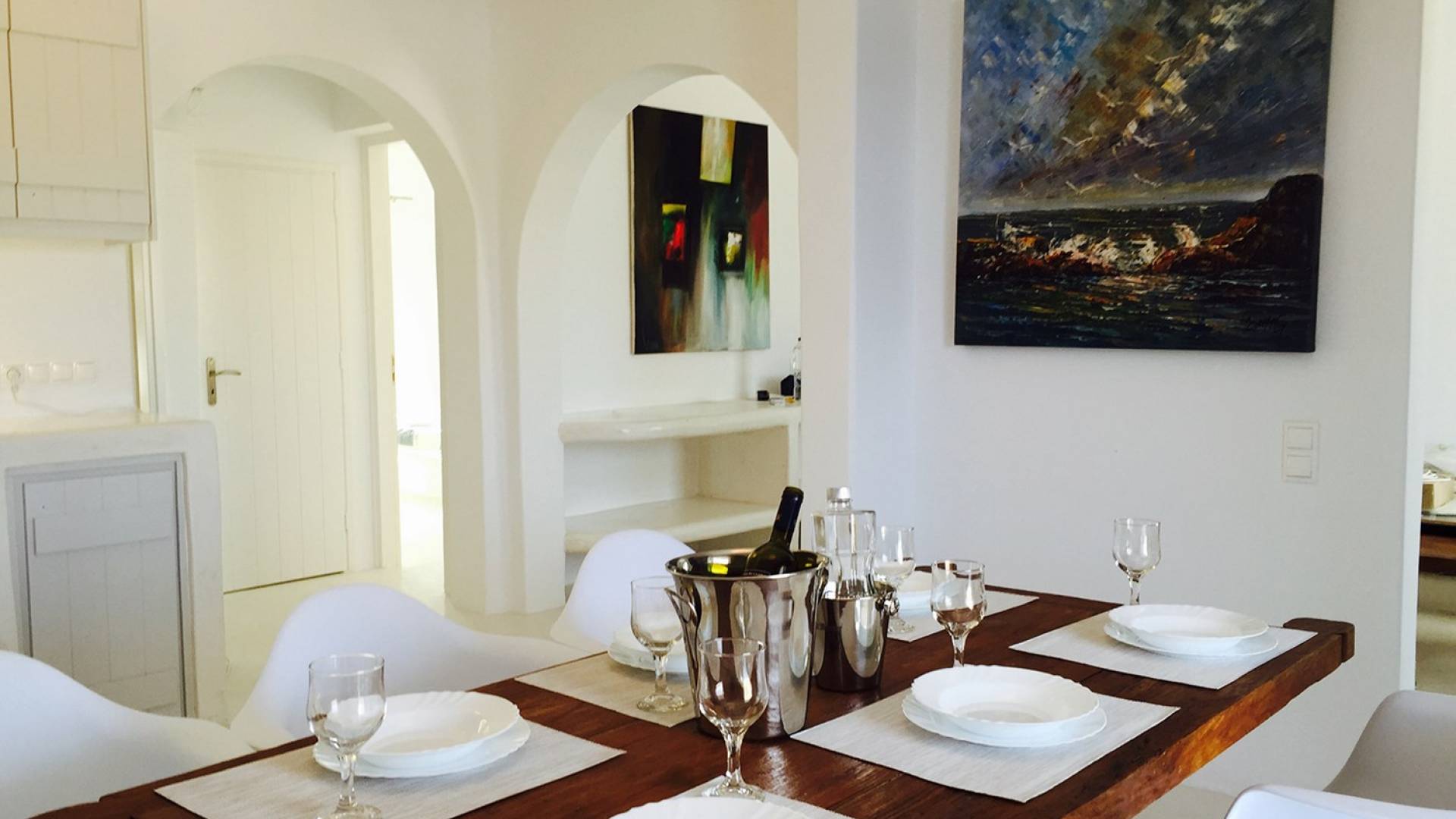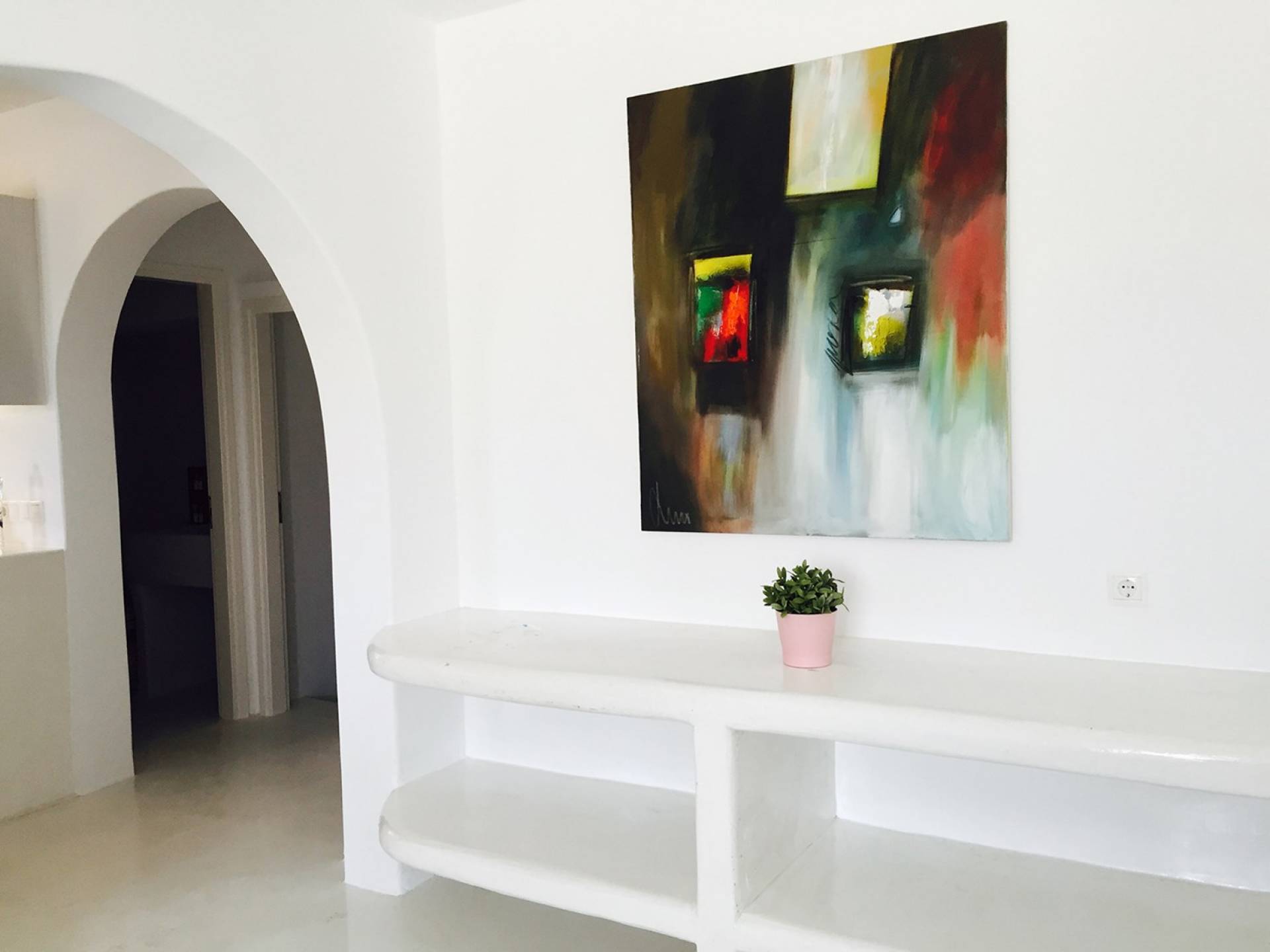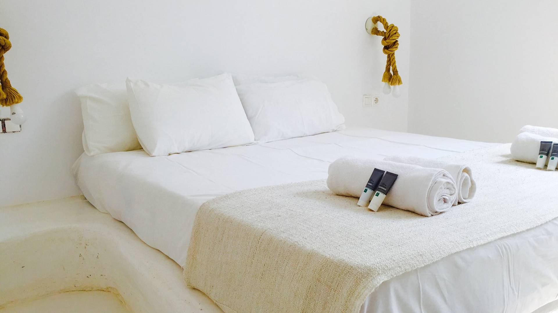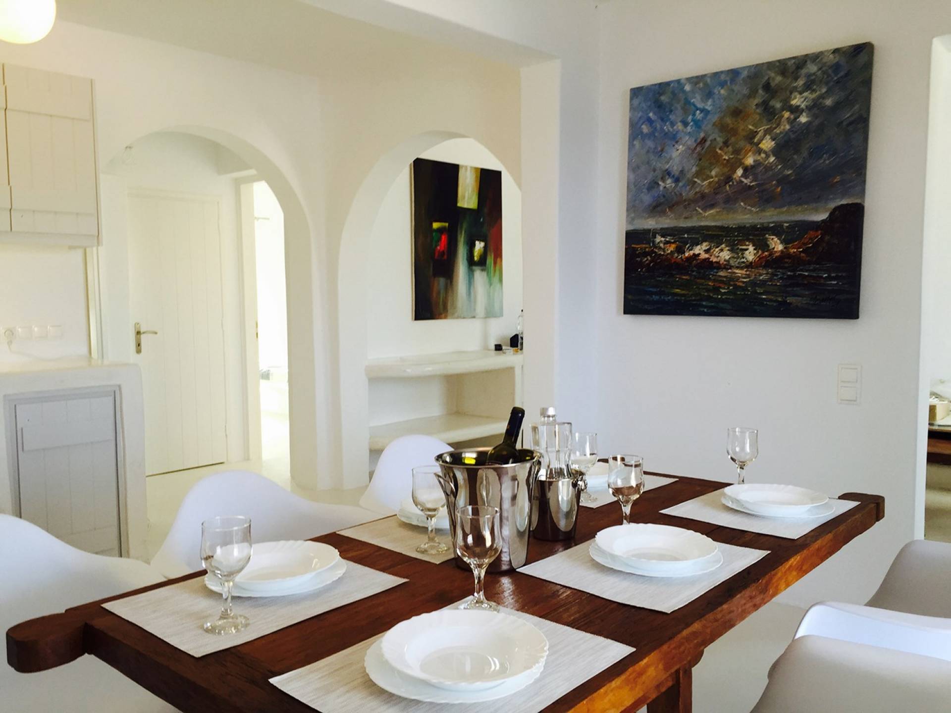 Στη Aphrodite Suite, στο ισόγειο, μπορείτε να απολαύσετε στιγμές χαλάρωσης ατενίζοντας τη θέα στο μοναδικό γαλάζιο του Αιγαίου. Η σουίτα μπορεί να φιλοξενήσει έως και 6 άτομα που θέλουν μια υπέροχη εμπειρία διαμονής στη Μύκονο με minimal διακόσμηση.