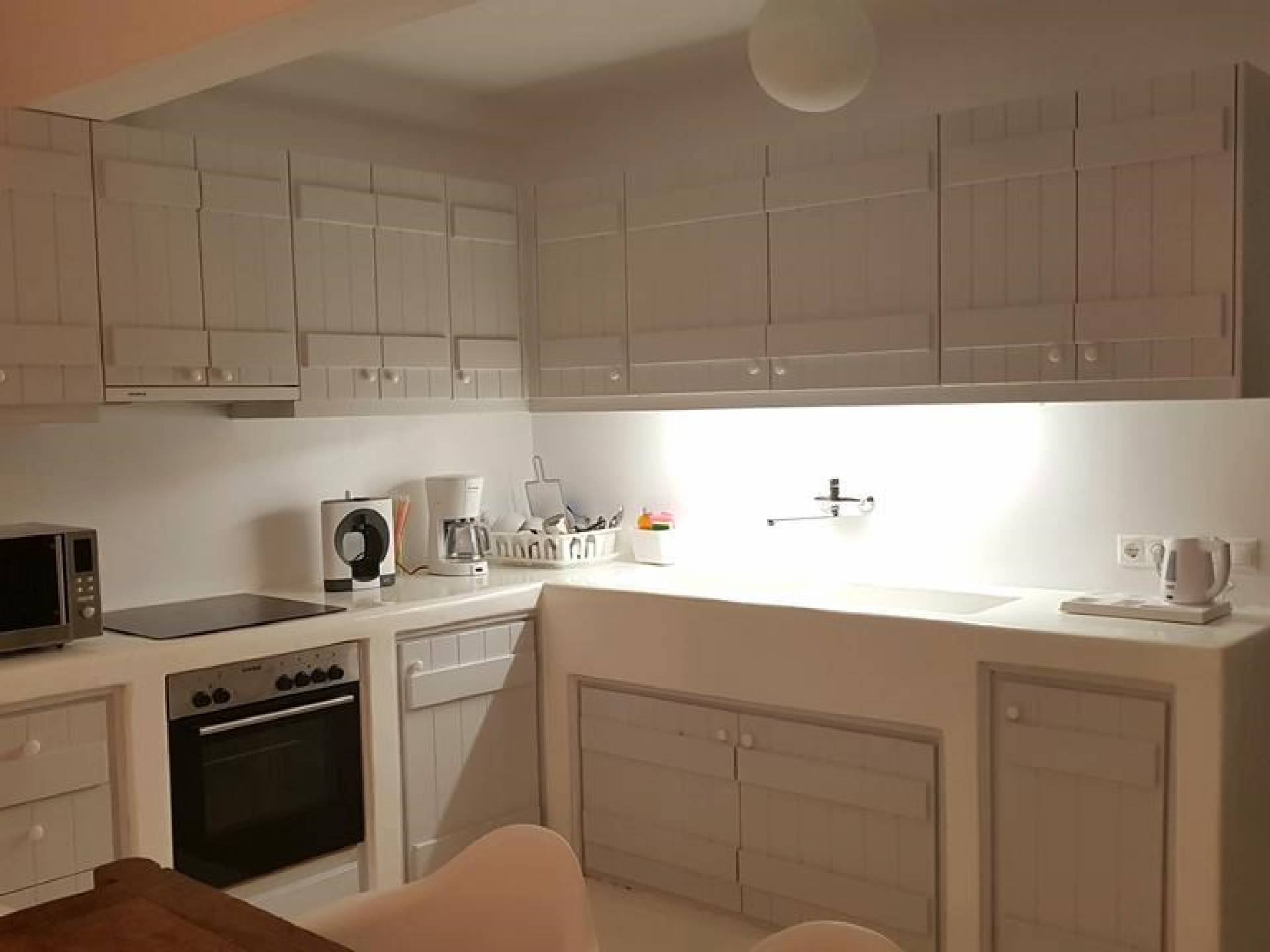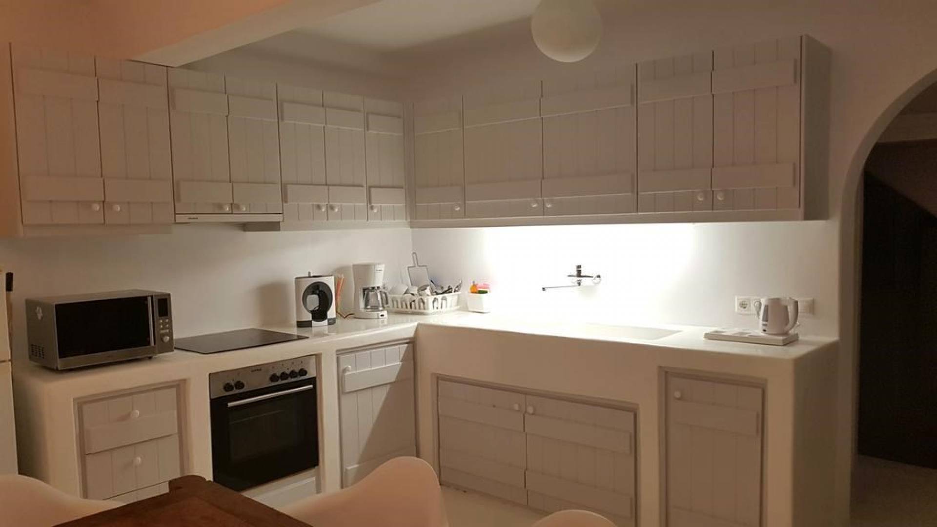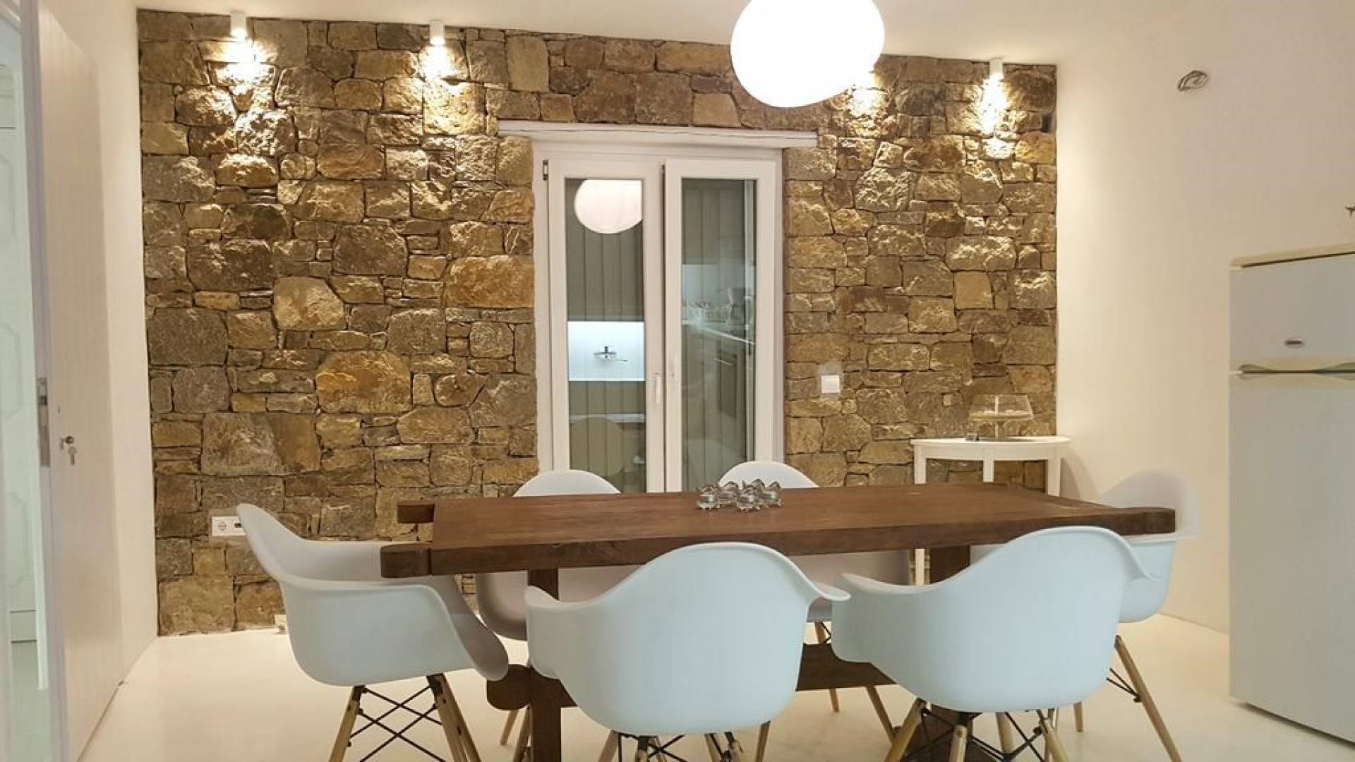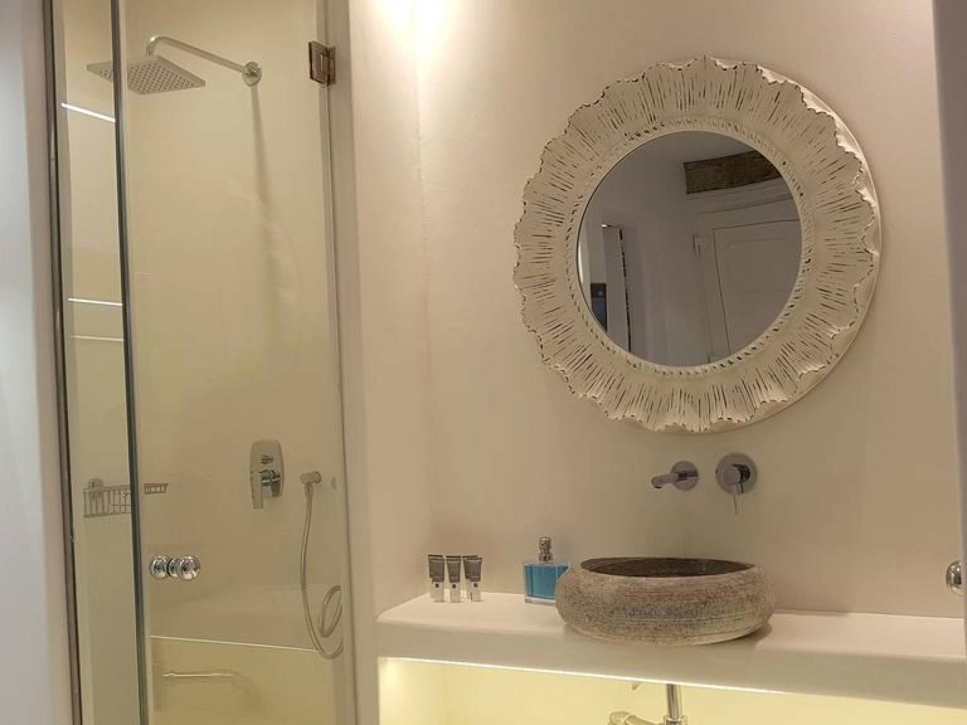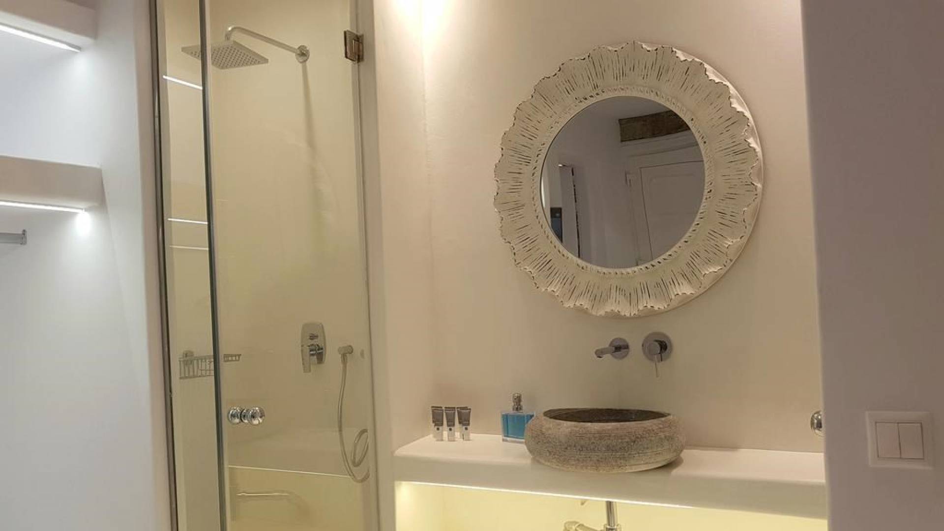 Στη Aphrodite Suite, στο ισόγειο, μπορείτε να απολαύσετε στιγμές χαλάρωσης ατενίζοντας τη θέα στο μοναδικό γαλάζιο του Αιγαίου. Η σουίτα μπορεί να φιλοξενήσει έως και 6 άτομα που θέλουν μια υπέροχη εμπειρία διαμονής στη Μύκονο με minimal διακόσμηση.