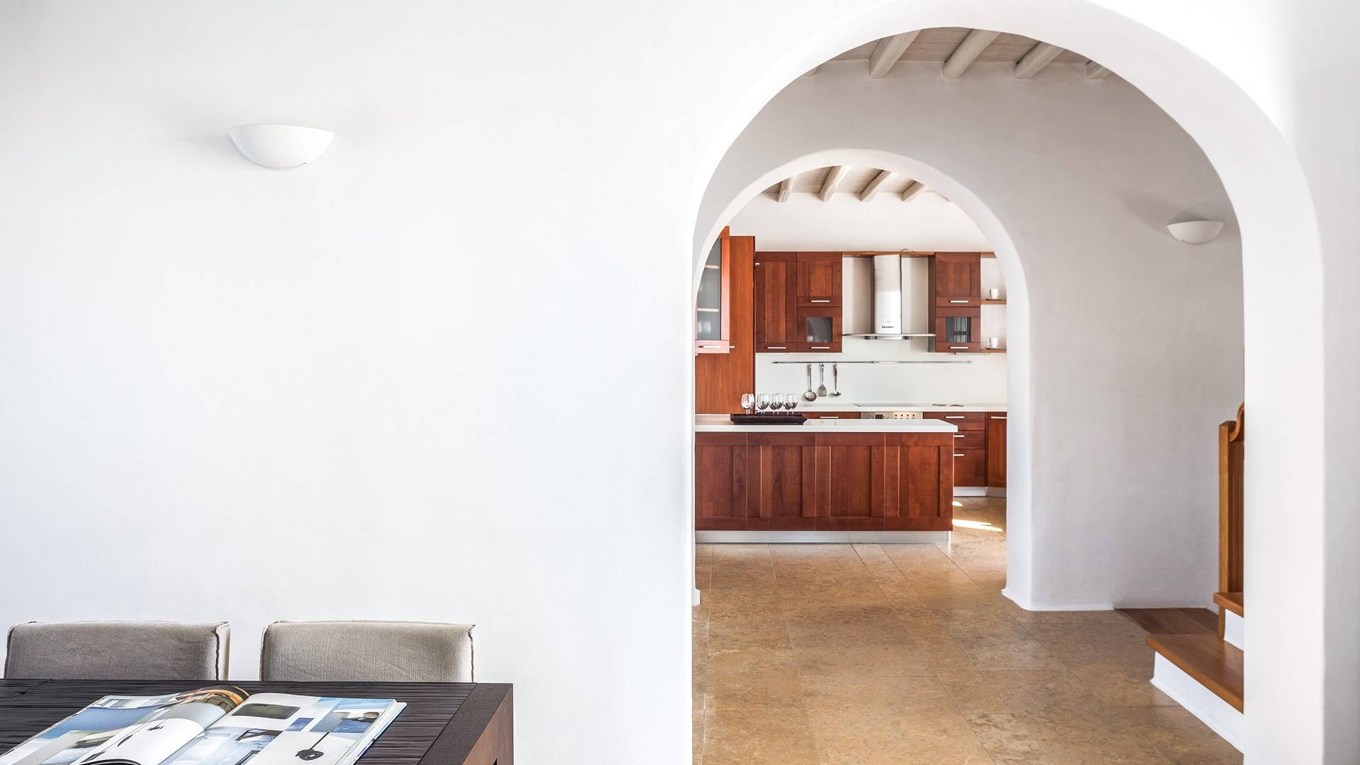 Η βίλα AMBROSIA έχει μια κύρια είσοδο (στο επίπεδο της πισίνας) που ανοίγει στην τραπεζαρία στα αριστερά και στην κουζίνα προς τα δεξιά, πιο πέρα είναι το εκτεταμένο καθιστικό όπου η θέα προς τη θάλασσα είναι μαγευτική.