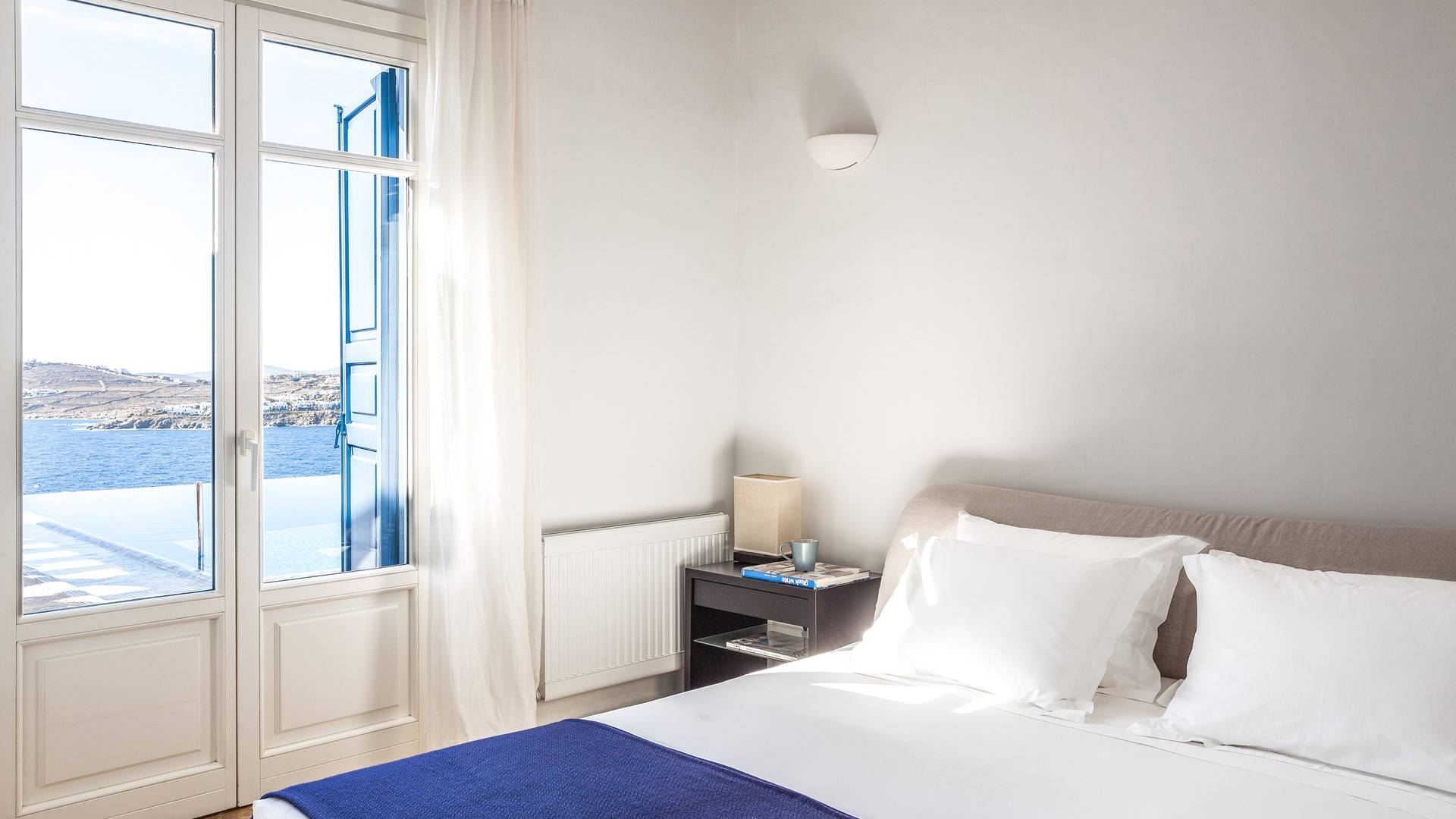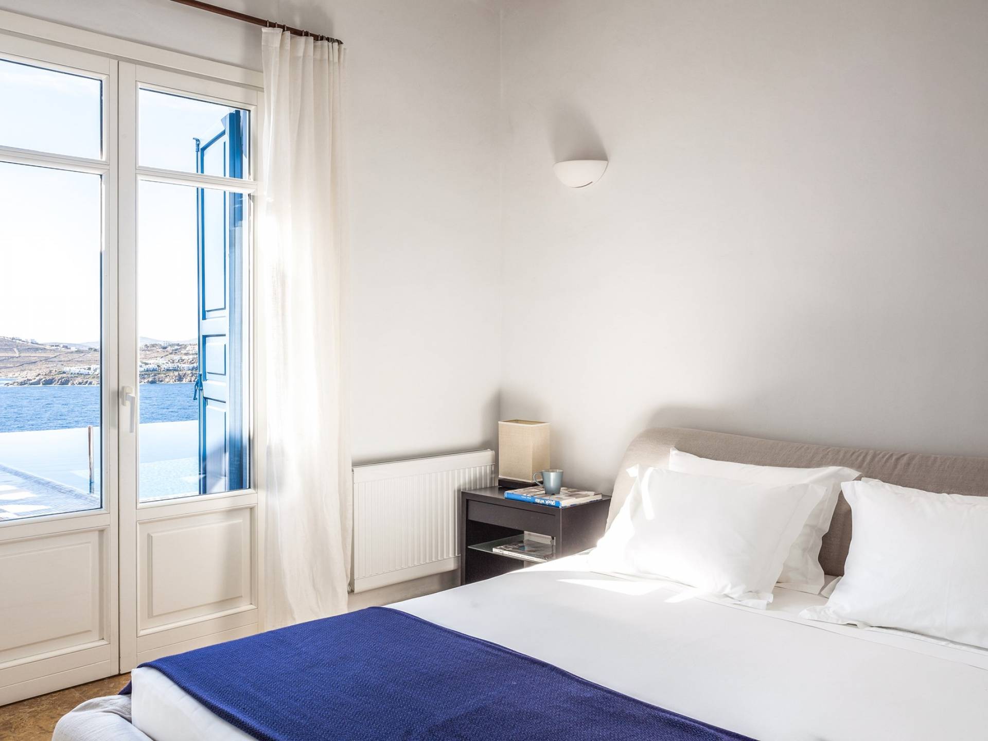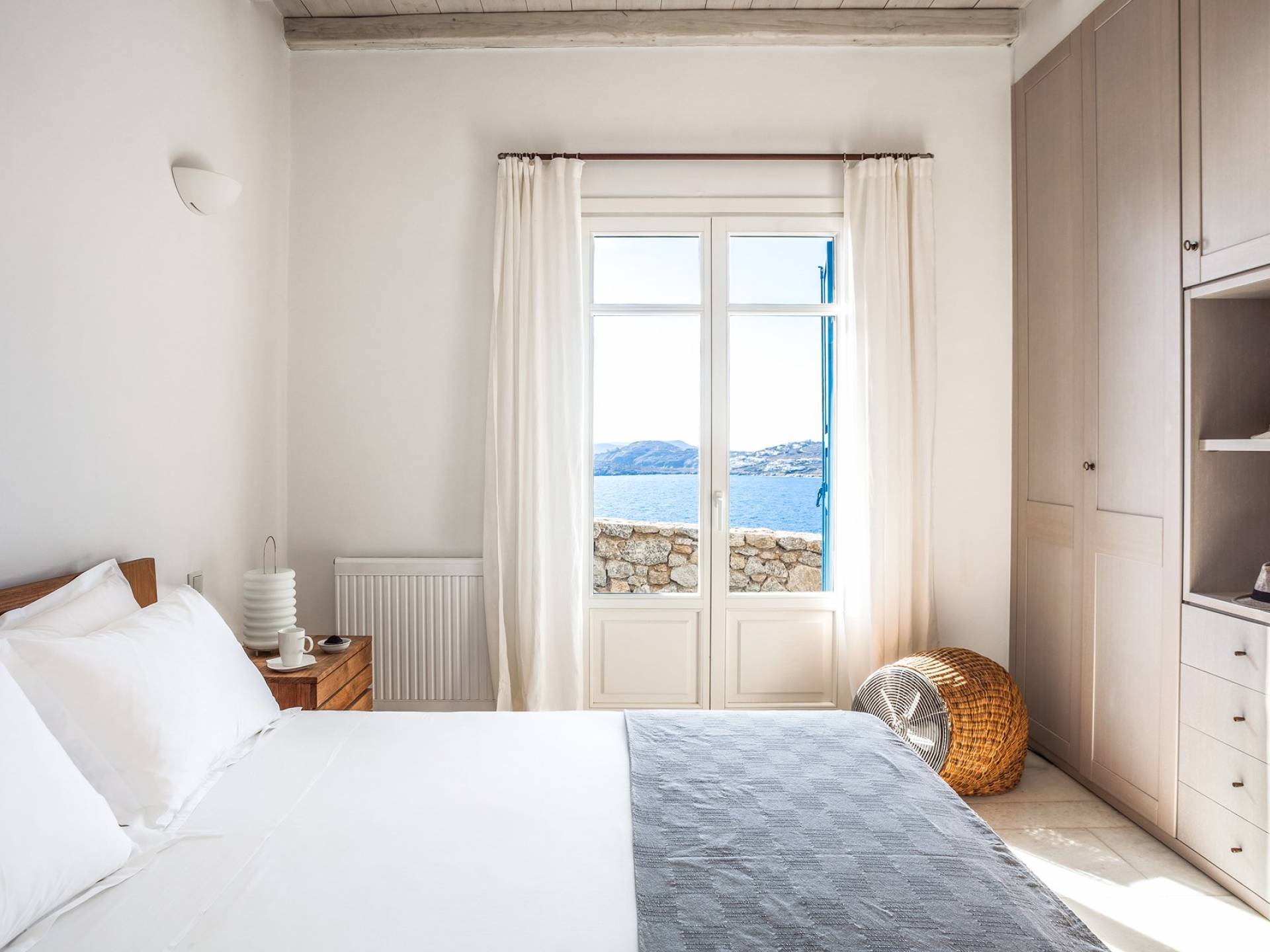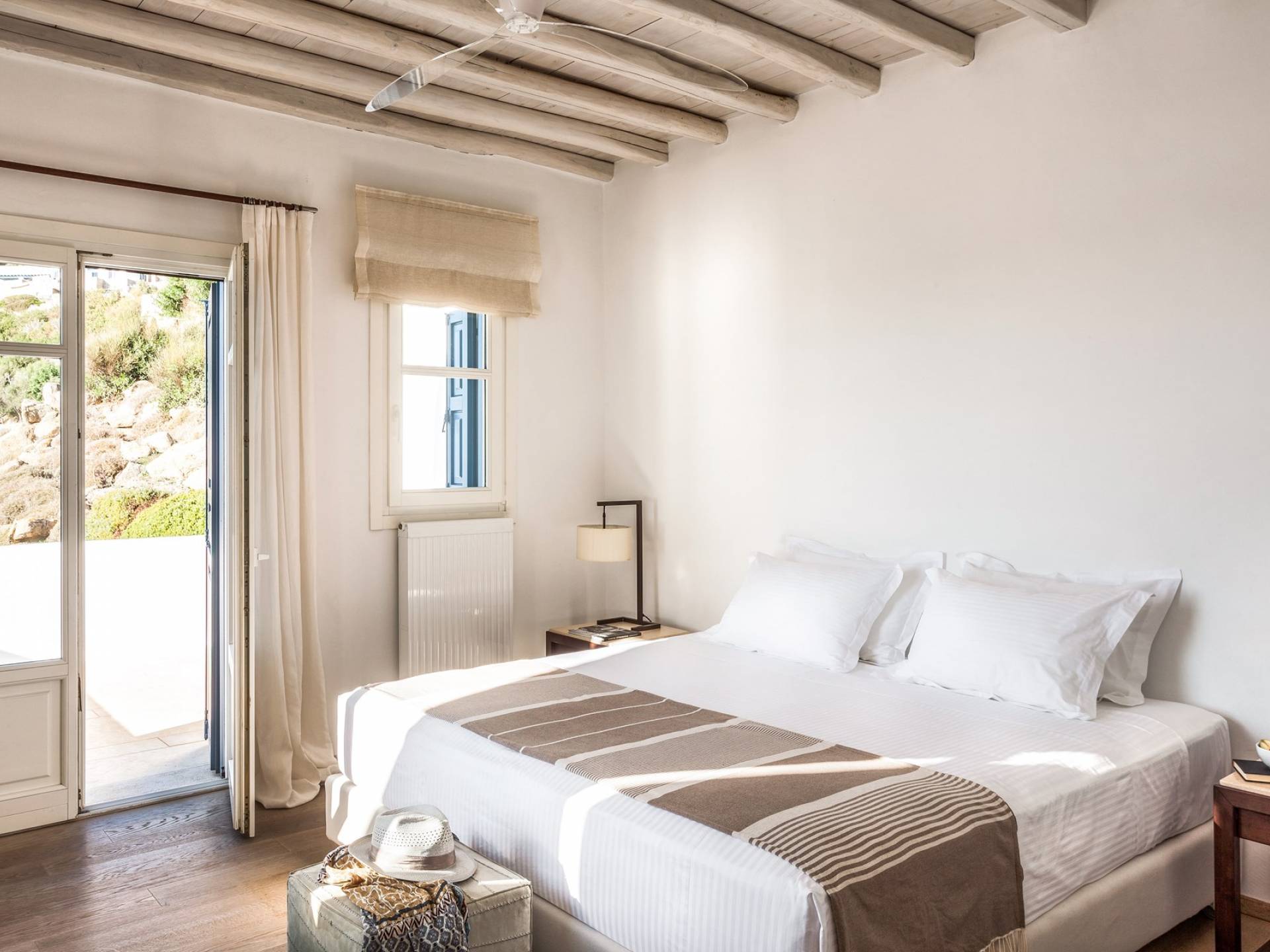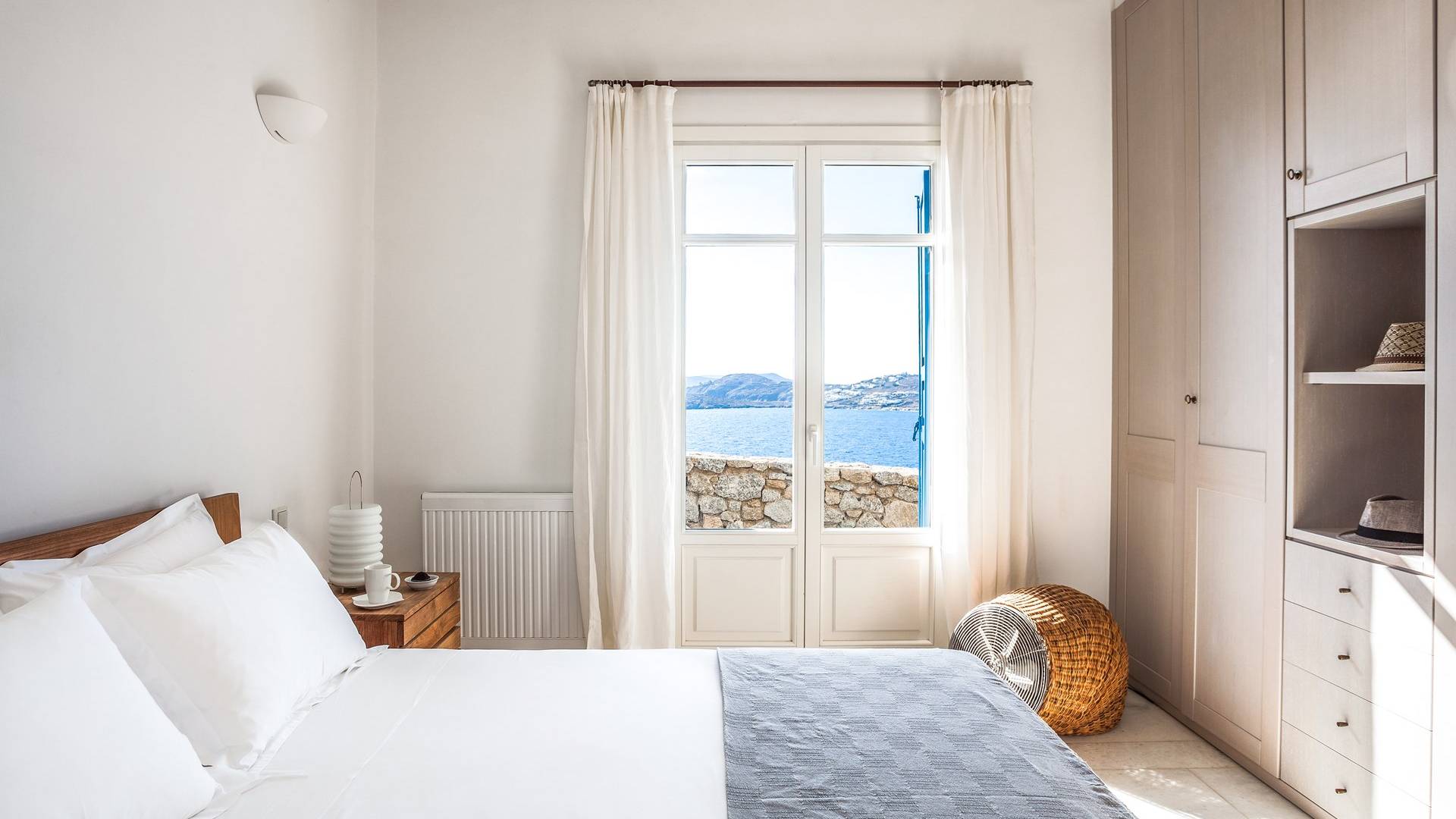 Στο επάνω επίπεδο υπάρχει ένα μεγάλο υπνοδωμάτιο με Super King w / en-suite μπάνιο με τζακούζι και ιδιωτικό μπαλκόνι που προσφέρει εκπληκτική θέα στα γειτονικά νησιά των Κυκλάδων. Στο επίπεδο της πισίνας υπάρχει επίσης ένα άλλο υπνοδωμάτιο με κρεβάτι king size (ή 2S) με ιδιωτικό μπάνιο. Στο ισόγειο βρίσκονται: 2 υπνοδωμάτια, το καθένα με king-size κρεβάτια και μπαλκονόπορτα με άμεση πρόσβαση στην πισίνα. μοιράζονται 2 μπάνια. Η πισίνα μπορεί να θερμανθεί με επιπλέον χρέωση. Οι λαμπροί λευκοί εσωτερικοί και εξωτερικοί χώροι και οι λεπτές καλαίσθητες διακοσμήσεις αντικατοπτρίζουν τη μυκονιάτικη κομψότητα για την οποία είναι γνωστό το νησί, ώστε να μπορείτε να βυθιστείτε πλήρως στο πνεύμα του νησιού.