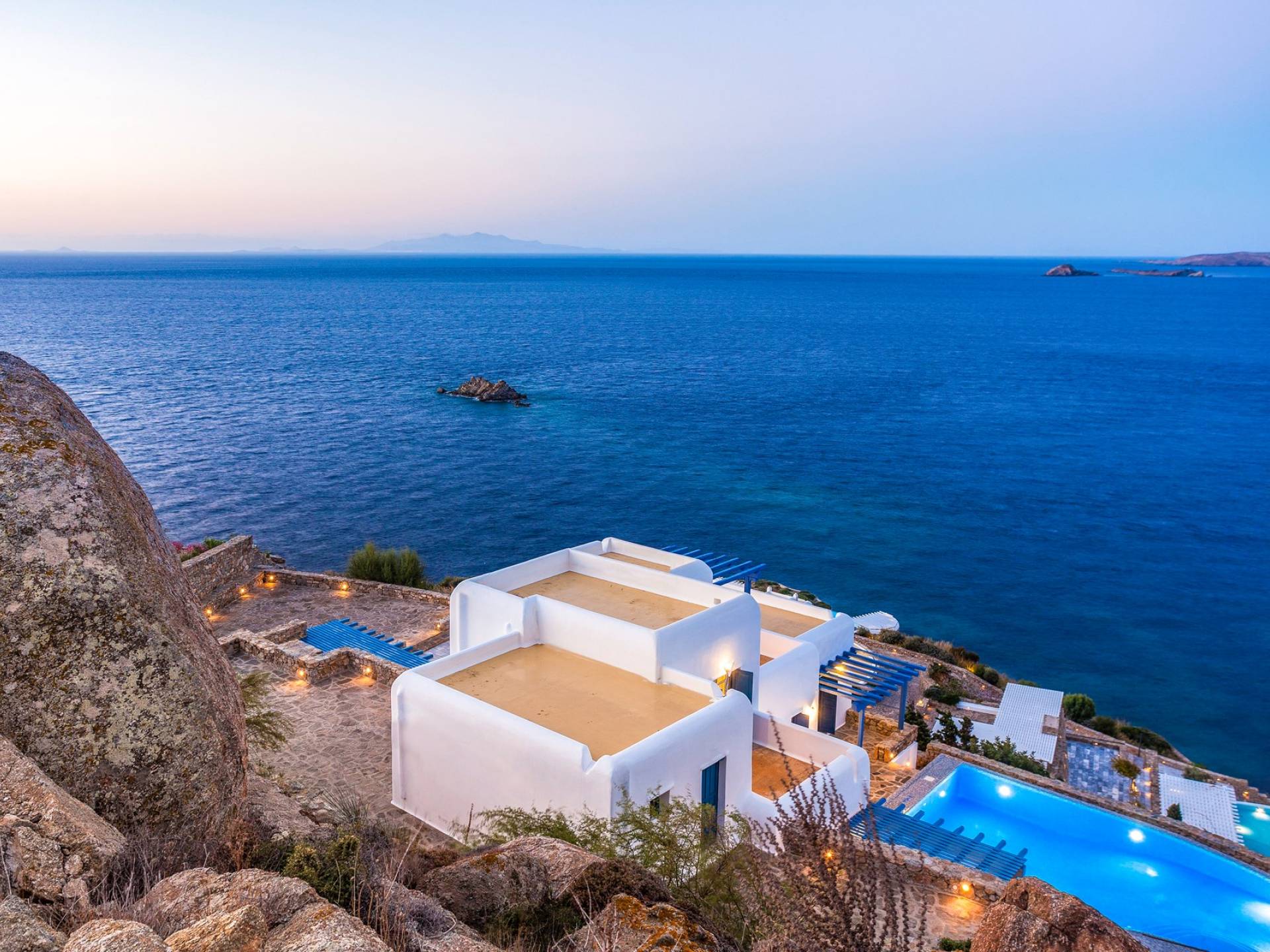 Το Villa Ambrosia, μία από τις πιο υπέροχες ιδιωτικές βίλες της Μυκόνου, βρίσκεται στην άκρη του ιδιωτικού συγκροτήματος 11-Villa του Αγίου Λαζάρου Μυκόνου και απολαμβάνει απρόσκοπτη θέα στα νησιά της Δήλου και της Ρήνας πάνω από μια μαγευτική πτώση στη θάλασσα , προσφέροντας το τέλειο ηλιοβασίλεμα στη Μύκονο.