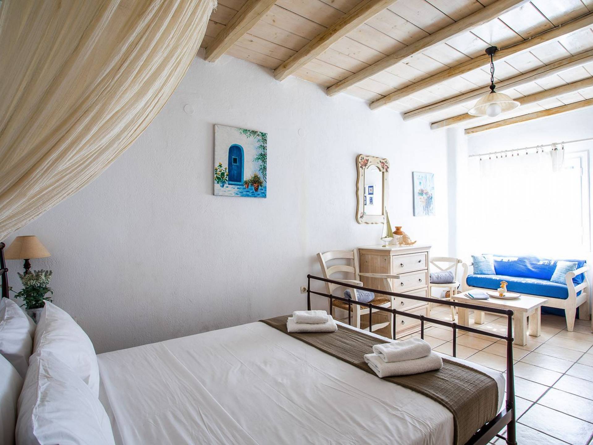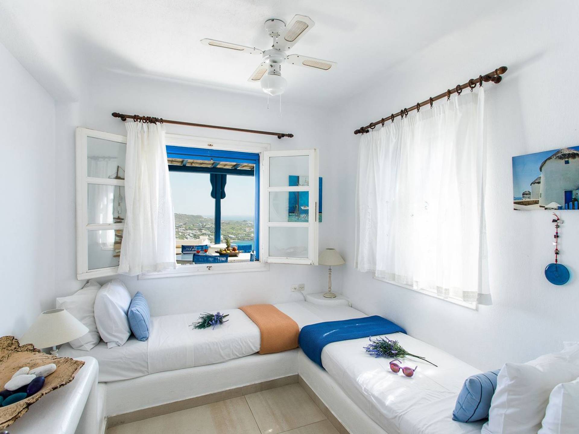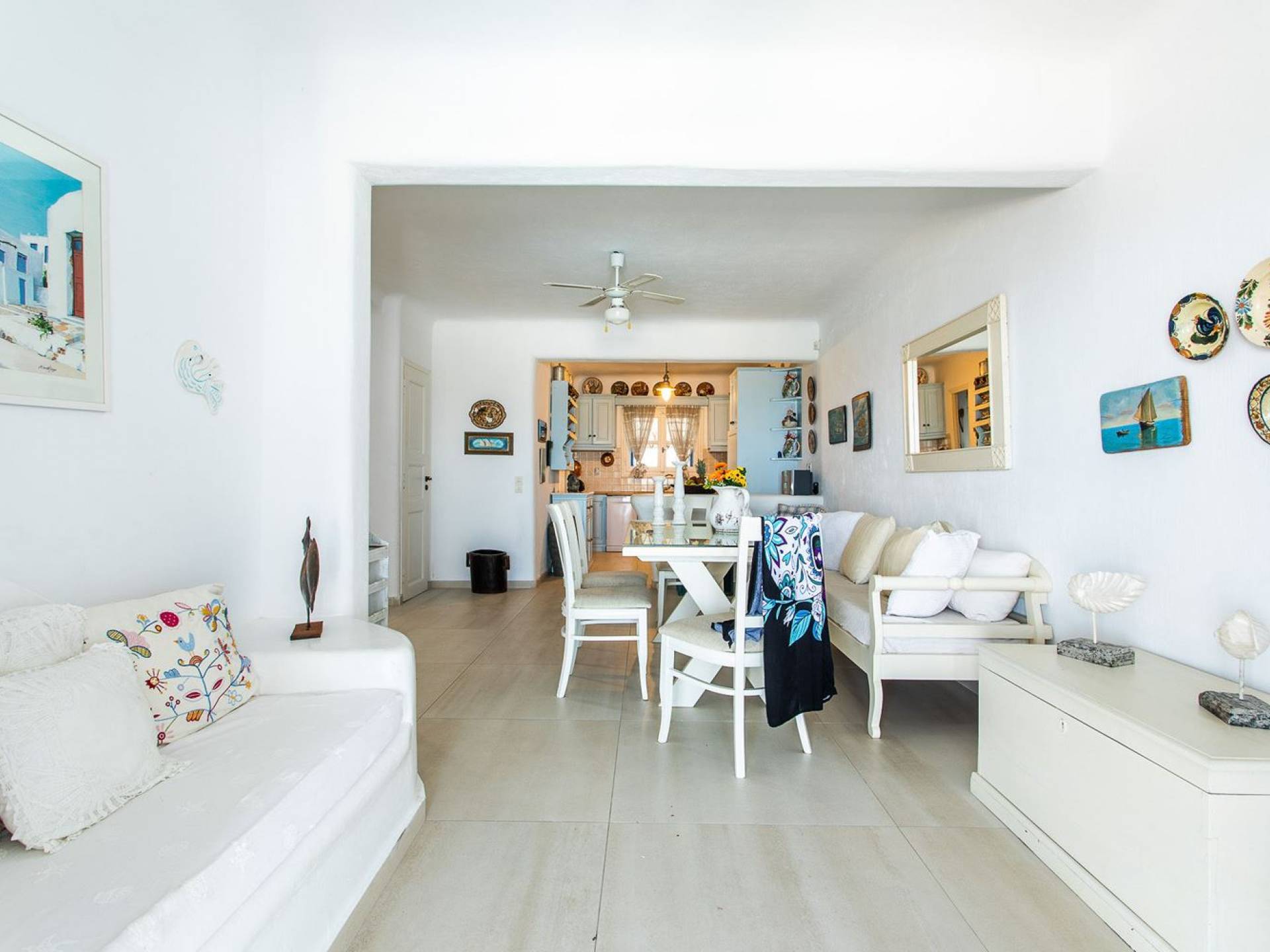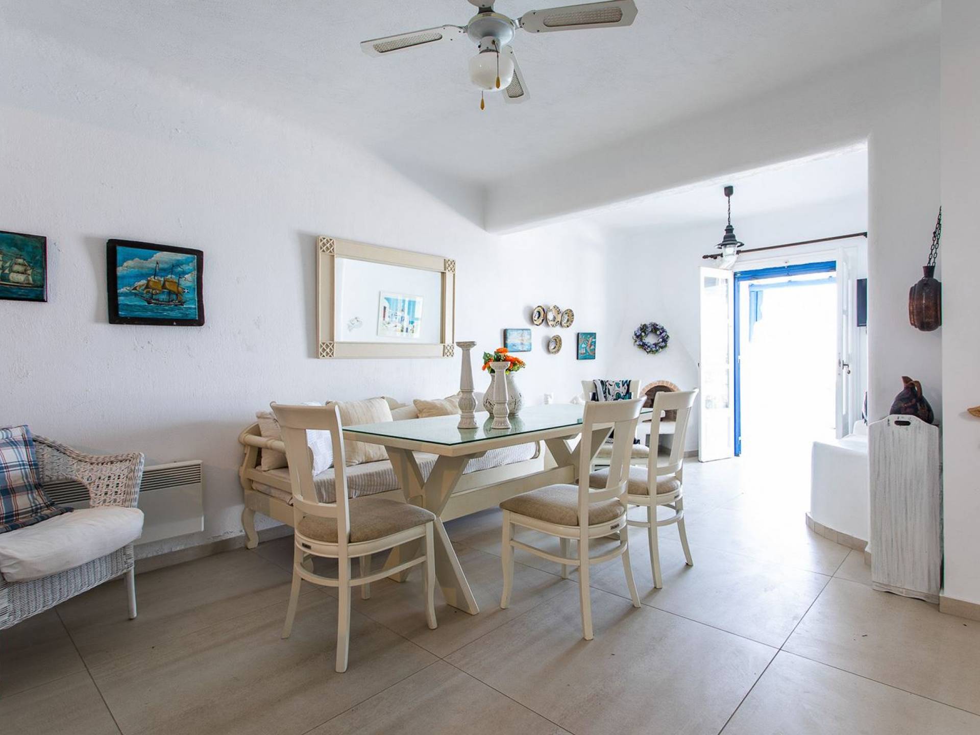 Το υπέροχο ρουστίκ εσωτερικό του είναι ένα τυπικό παράδειγμα κυκλαδίτικης παράδοσης με χώρους που μπορούν να φιλοξενήσουν έως 6 άτομα σε τρία υπνοδωμάτια, ενώ διαθέτει επίσης φωτεινό σαλόνι, καθώς και κουζίνα ενιαίας διαρρύθμισης και τραπεζαρία με γοητευτικό τζάκι.