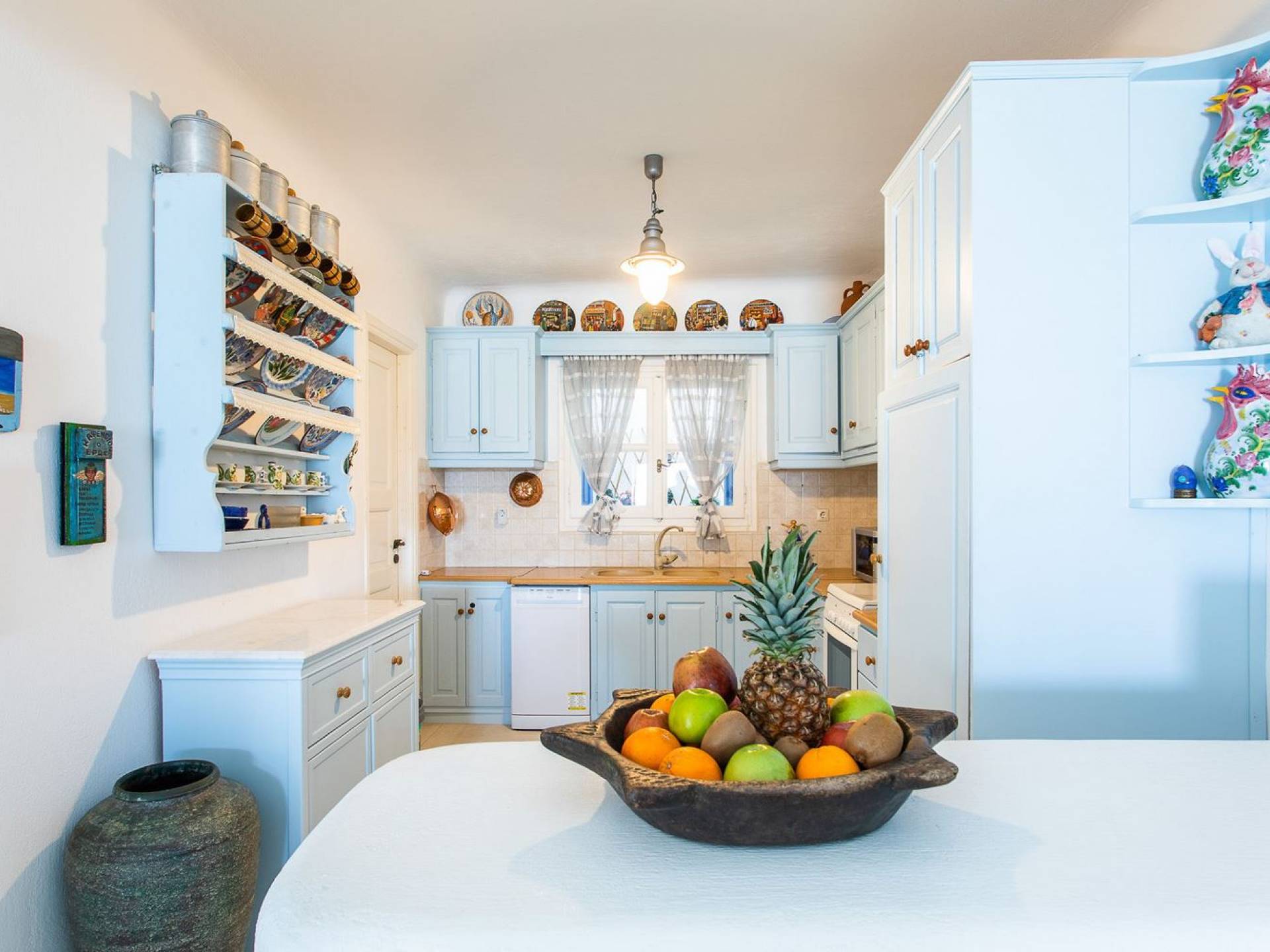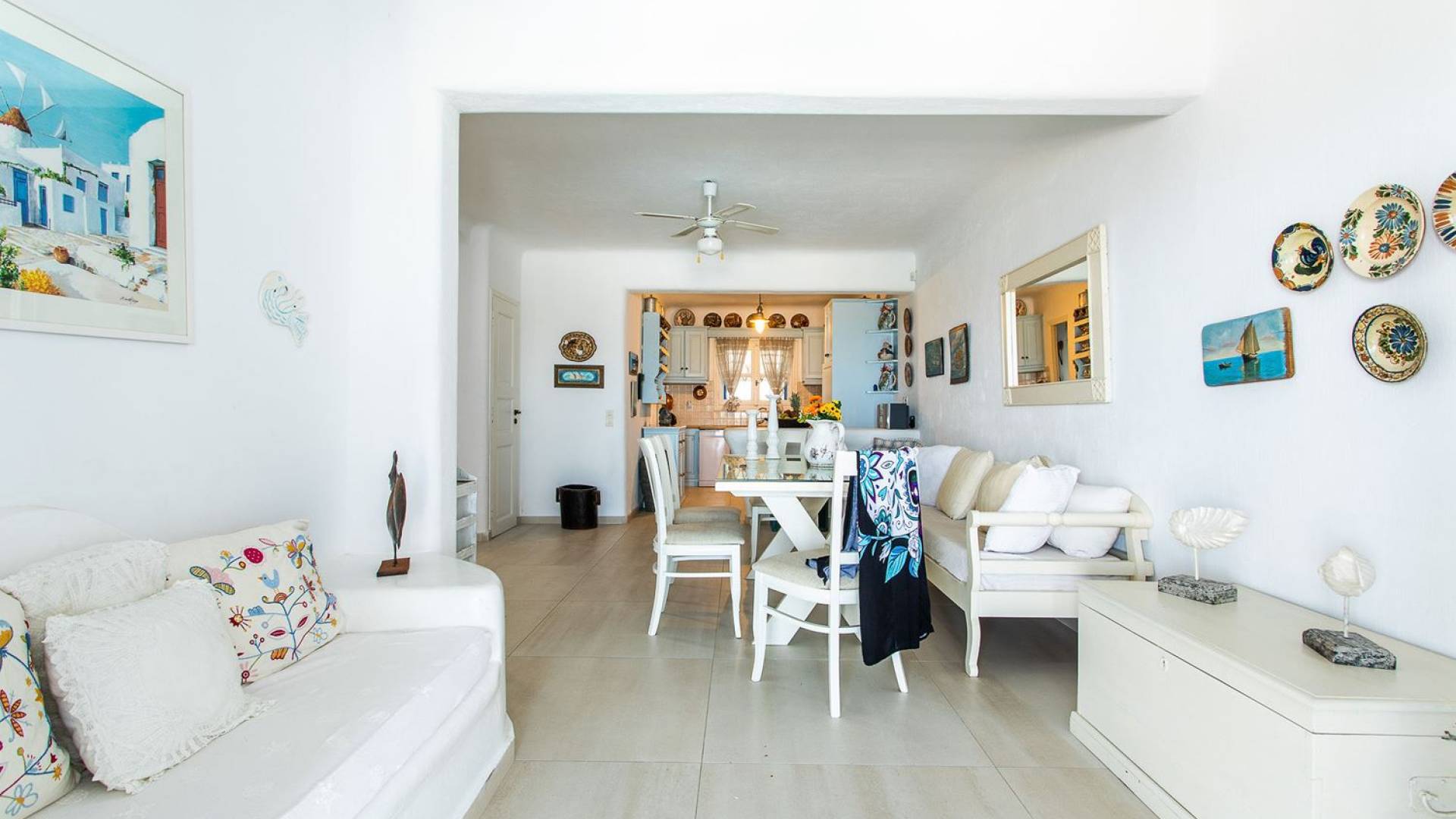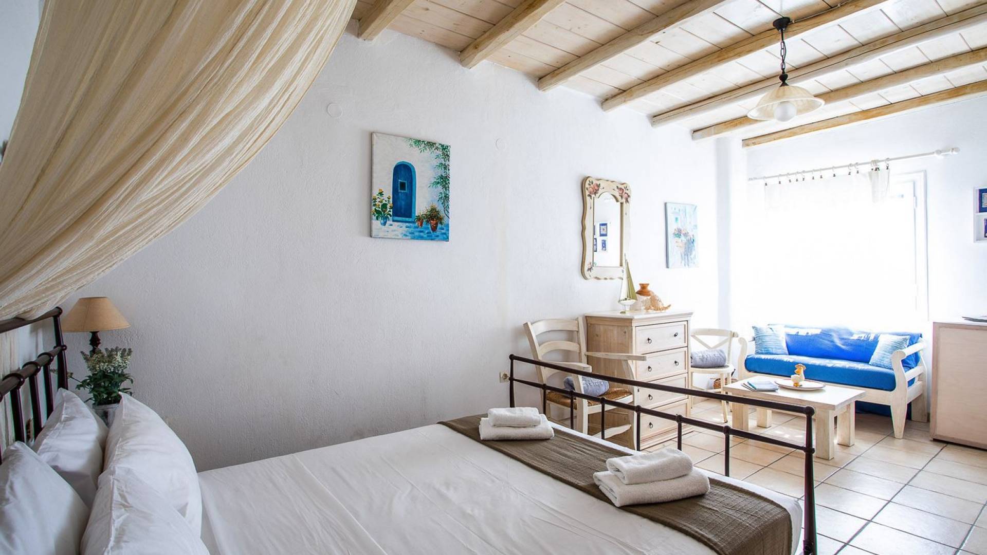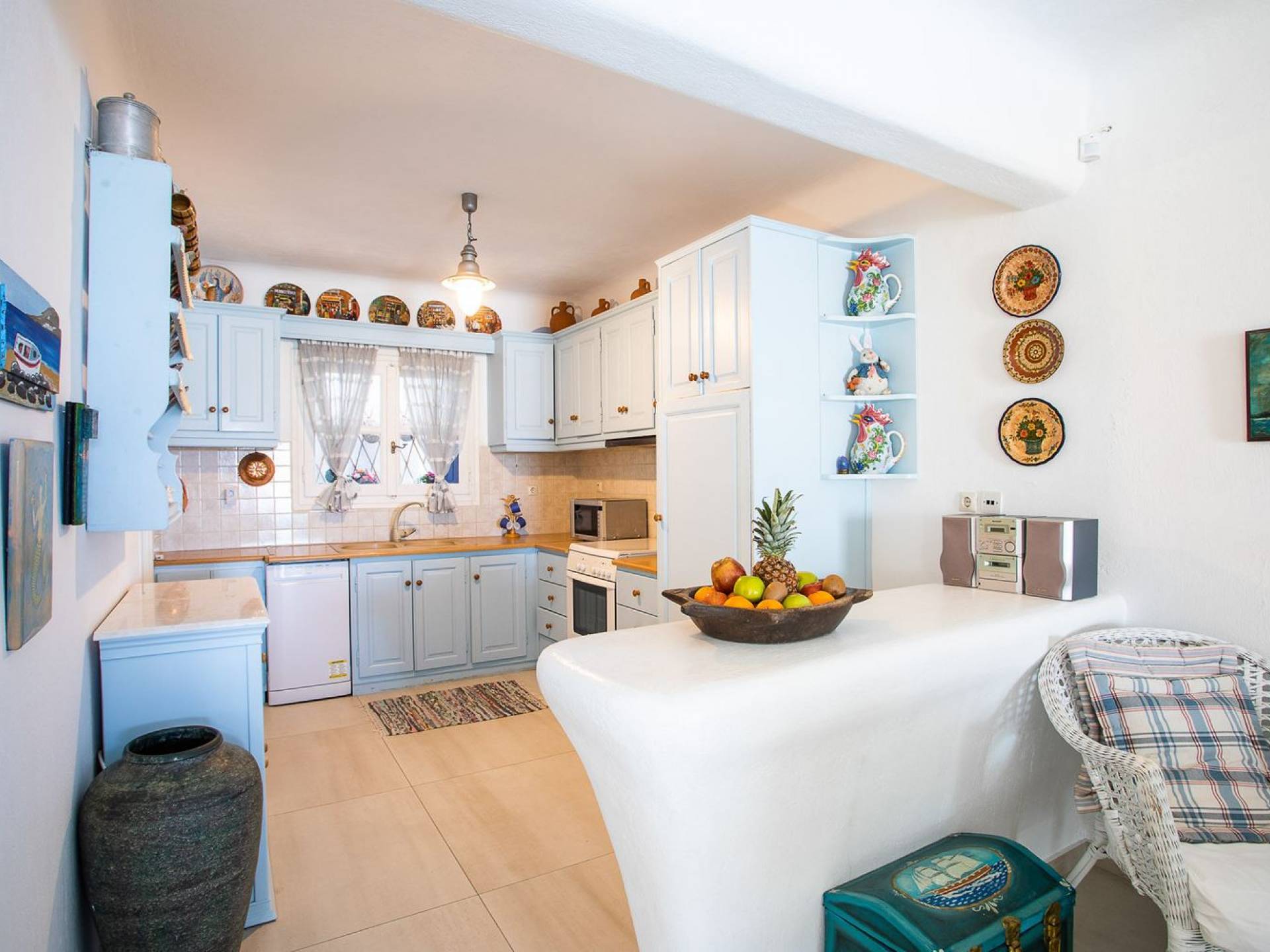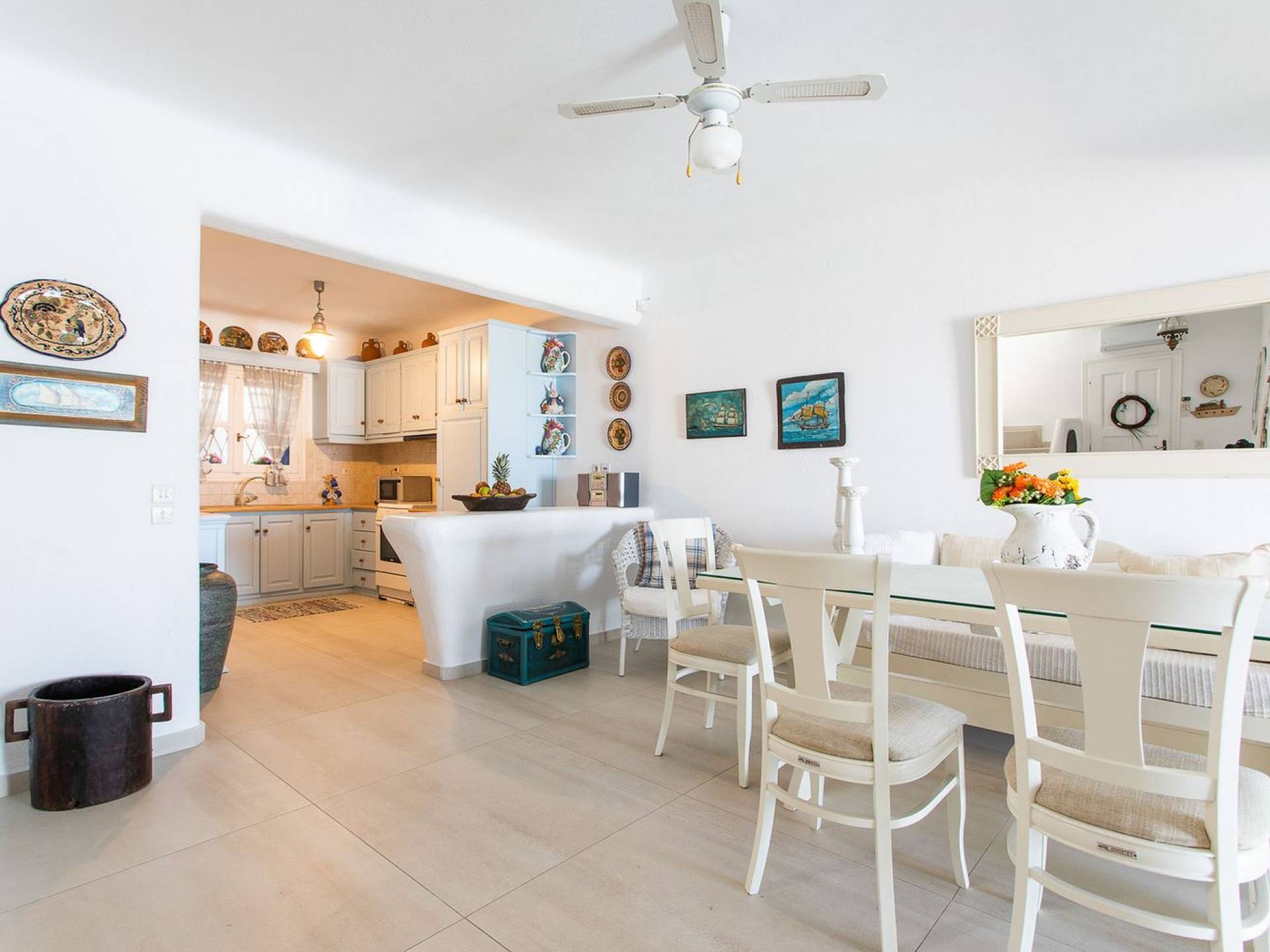 Το υπέροχο ρουστίκ εσωτερικό του είναι ένα τυπικό παράδειγμα κυκλαδίτικης παράδοσης με χώρους που μπορούν να φιλοξενήσουν έως 6 άτομα σε τρία υπνοδωμάτια, ενώ διαθέτει επίσης φωτεινό σαλόνι, καθώς και κουζίνα ενιαίας διαρρύθμισης και τραπεζαρία με γοητευτικό τζάκι.