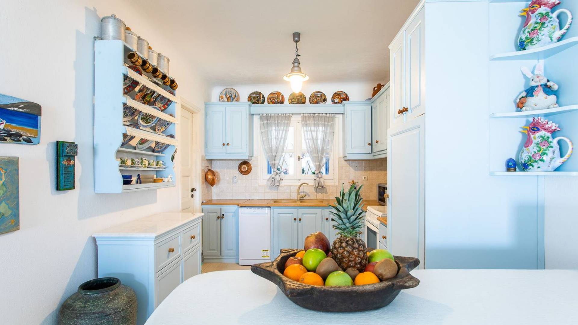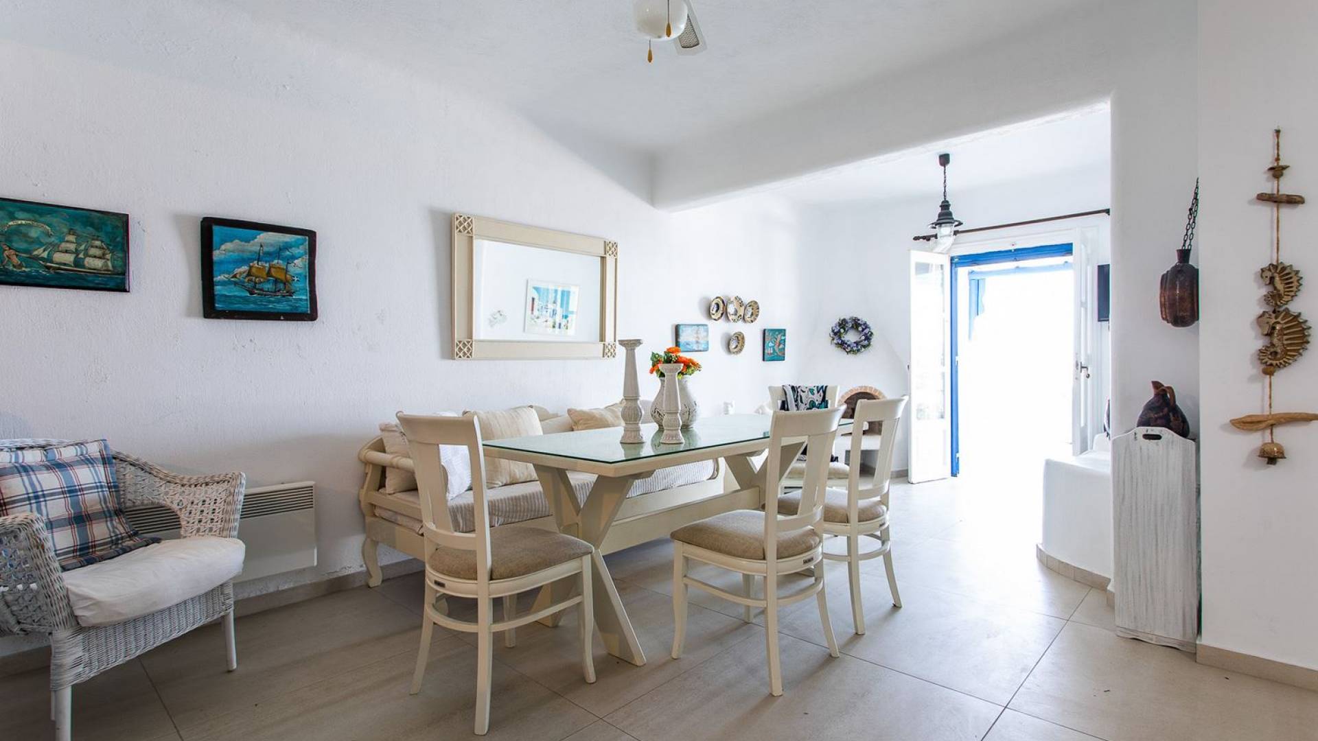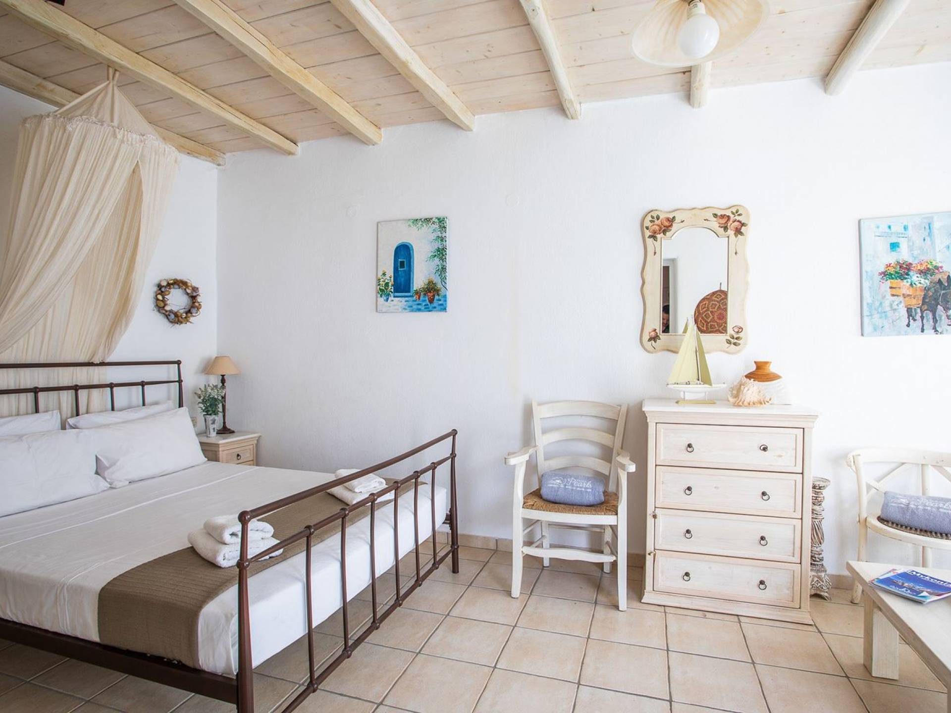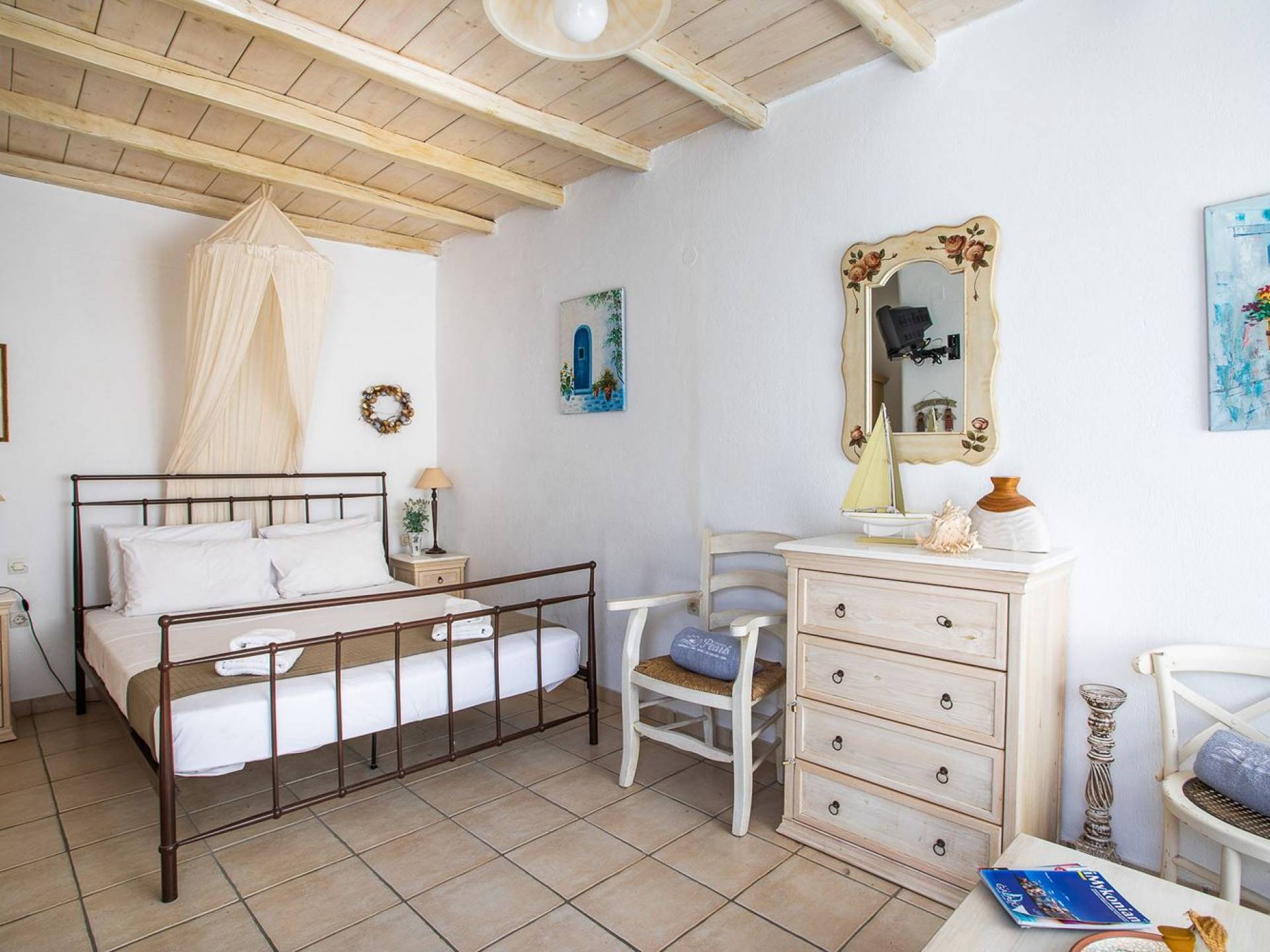 Το υπέροχο ρουστίκ εσωτερικό του είναι ένα τυπικό παράδειγμα κυκλαδίτικης παράδοσης με χώρους που μπορούν να φιλοξενήσουν έως 6 άτομα σε τρία υπνοδωμάτια, ενώ διαθέτει επίσης φωτεινό σαλόνι, καθώς και κουζίνα ενιαίας διαρρύθμισης και τραπεζαρία με γοητευτικό τζάκι.