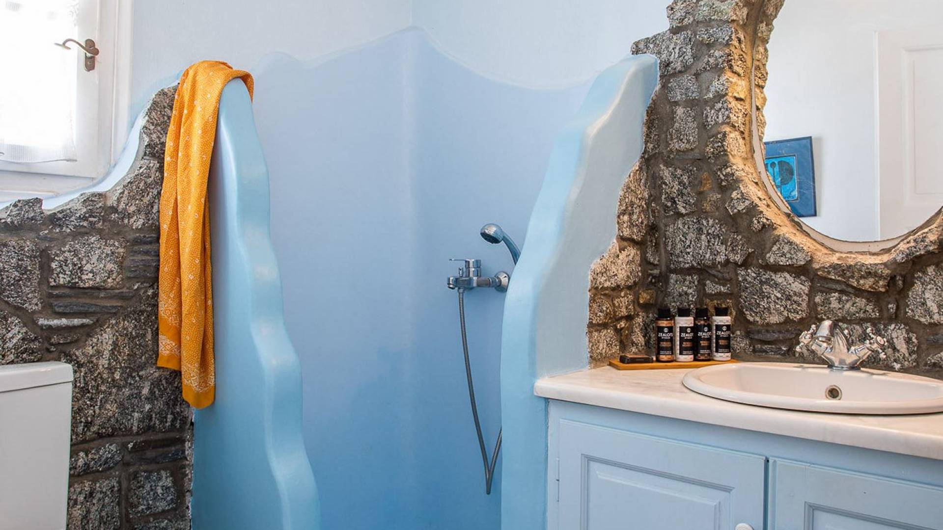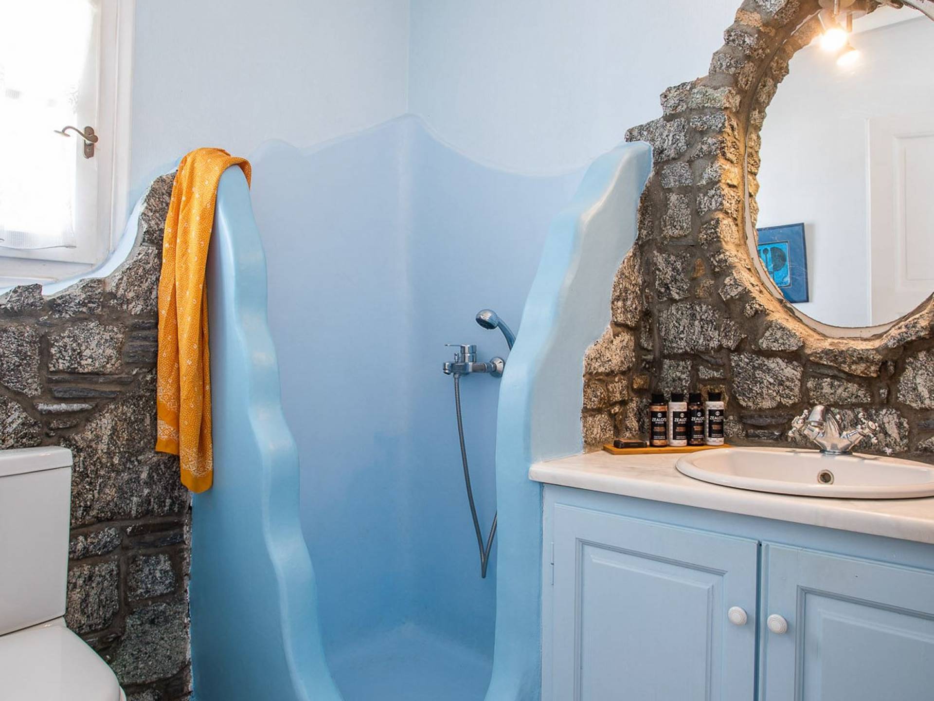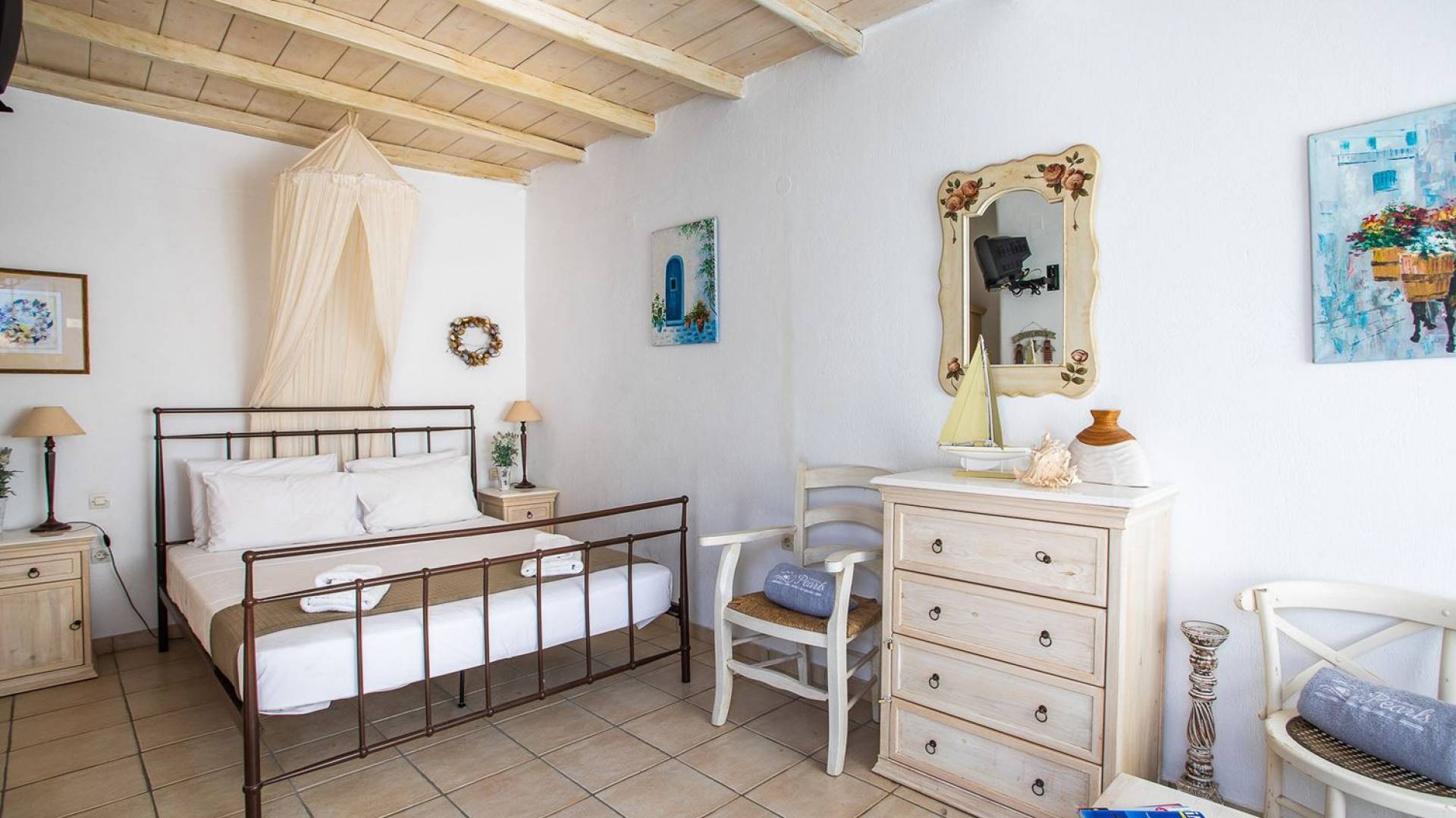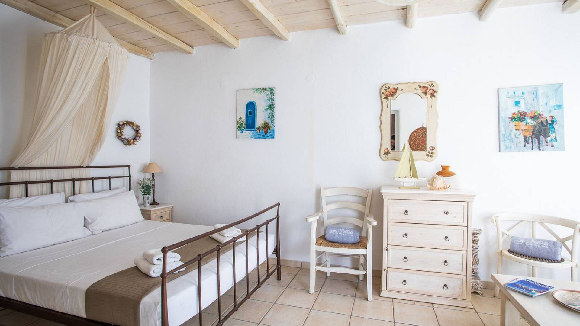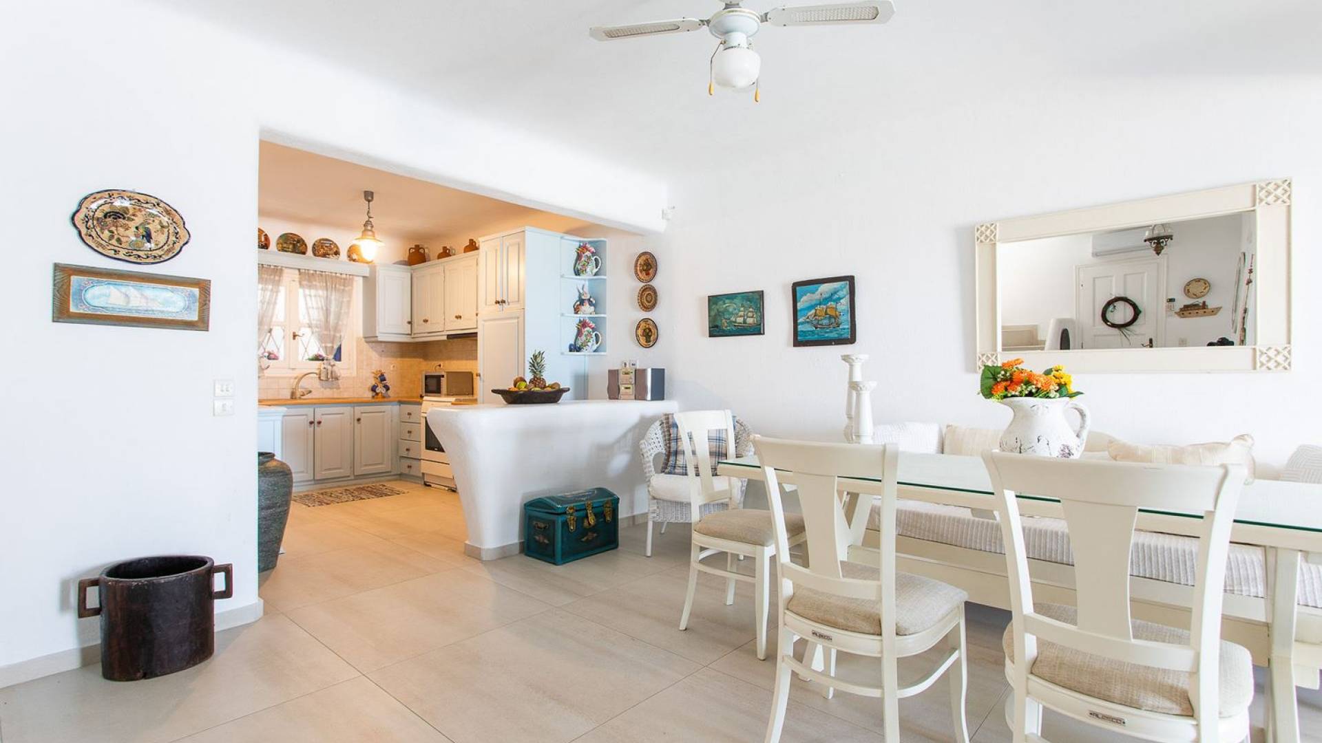 Το υπέροχο ρουστίκ εσωτερικό του είναι ένα τυπικό παράδειγμα κυκλαδίτικης παράδοσης με χώρους που μπορούν να φιλοξενήσουν έως 6 άτομα σε τρία υπνοδωμάτια, ενώ διαθέτει επίσης φωτεινό σαλόνι, καθώς και κουζίνα ενιαίας διαρρύθμισης και τραπεζαρία με γοητευτικό τζάκι.