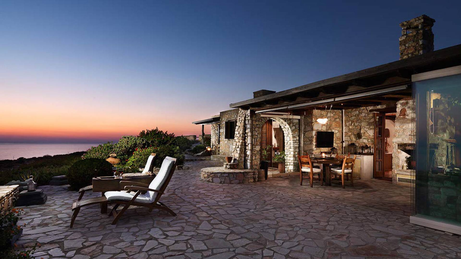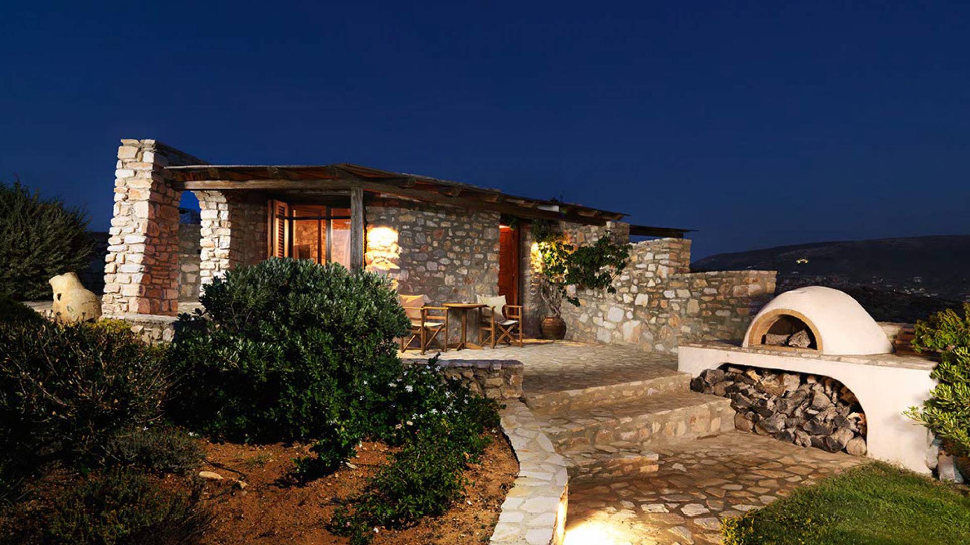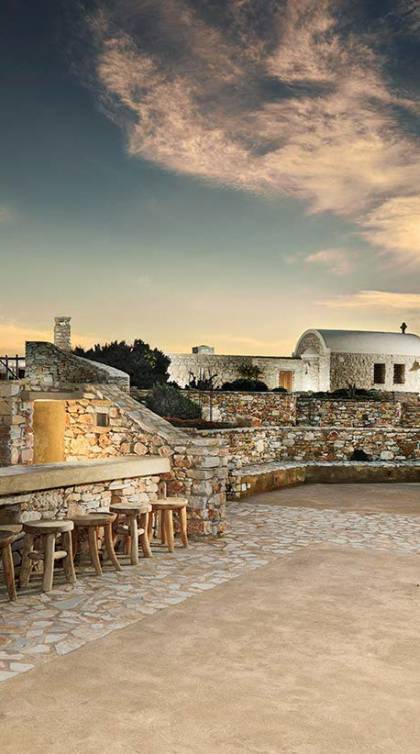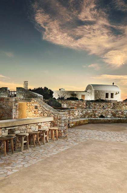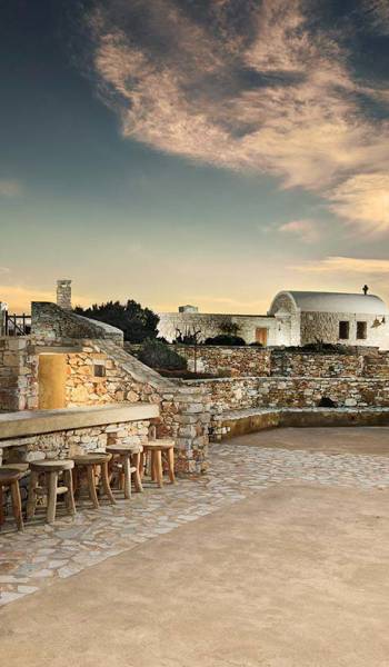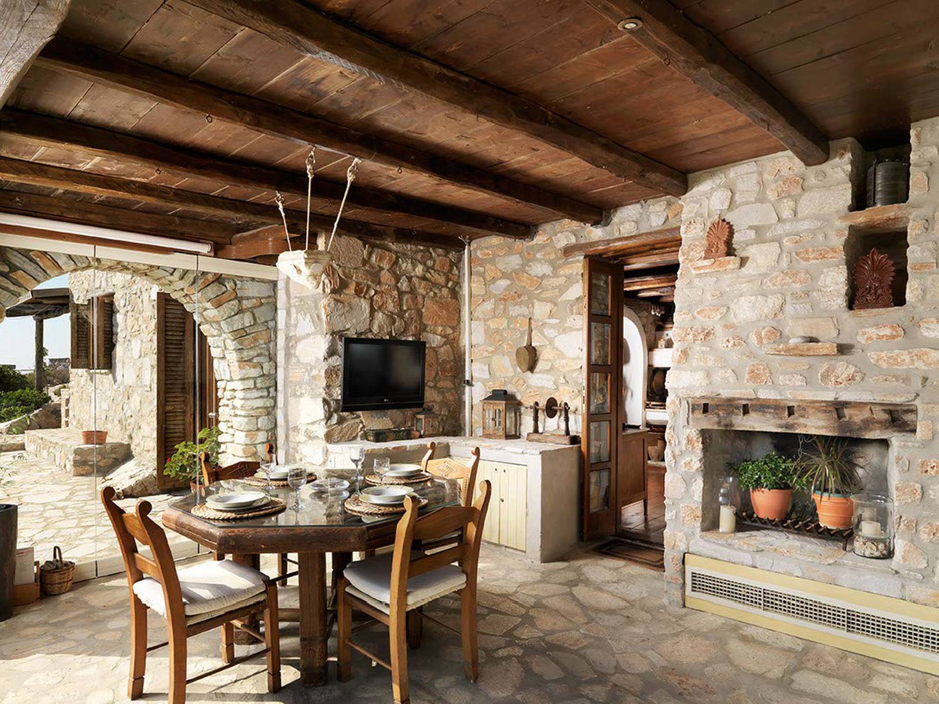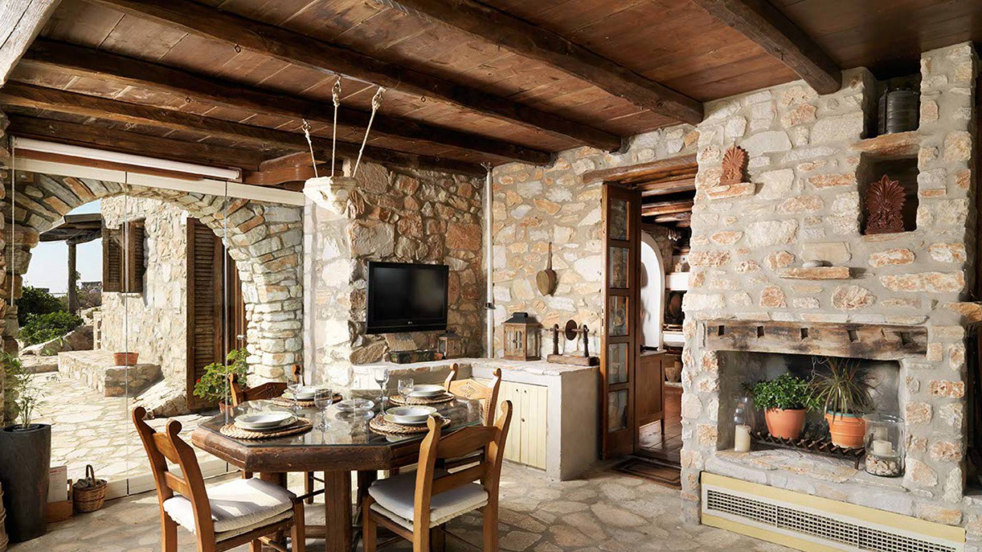 Οι ζεστές αποχρώσεις της ξύλινης επένδυσης συνδυάζονται υπέροχα με τους ακατέργαστους πέτρινους τοίχους, ενώ το εκθαμβωτικό φως του ήλιου και η υπέροχη ατμόσφαιρα ευνοούν την πλήρη απόλαυση του άγριου κυκλαδίτικου τοπίου.