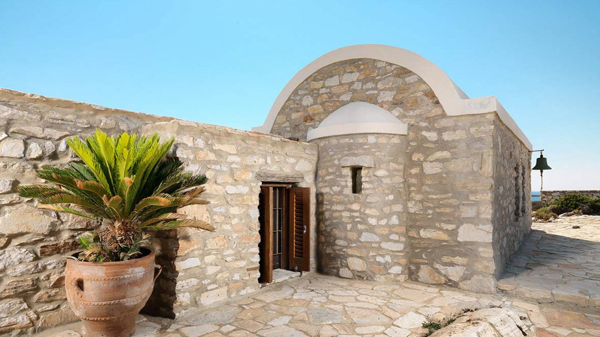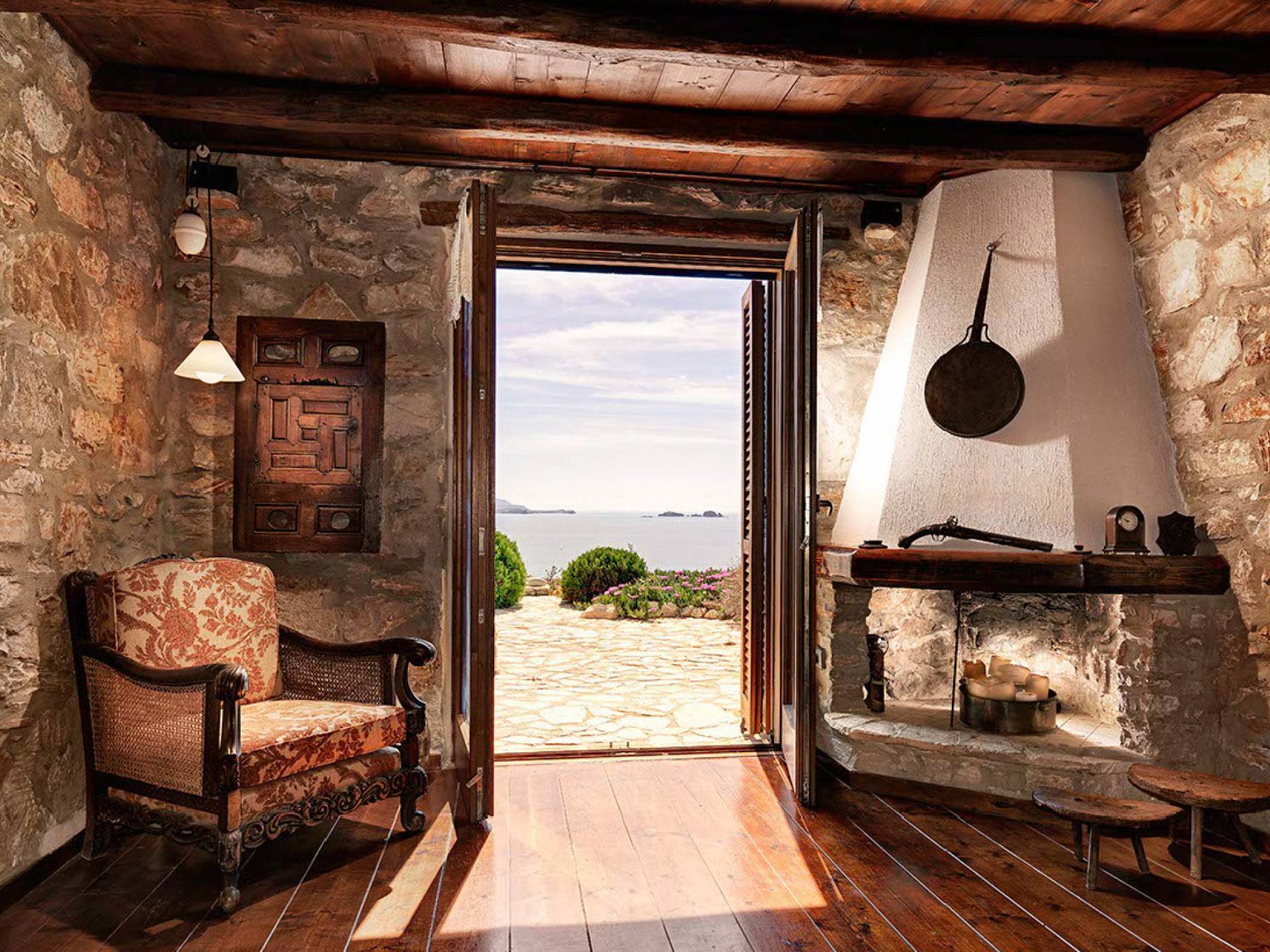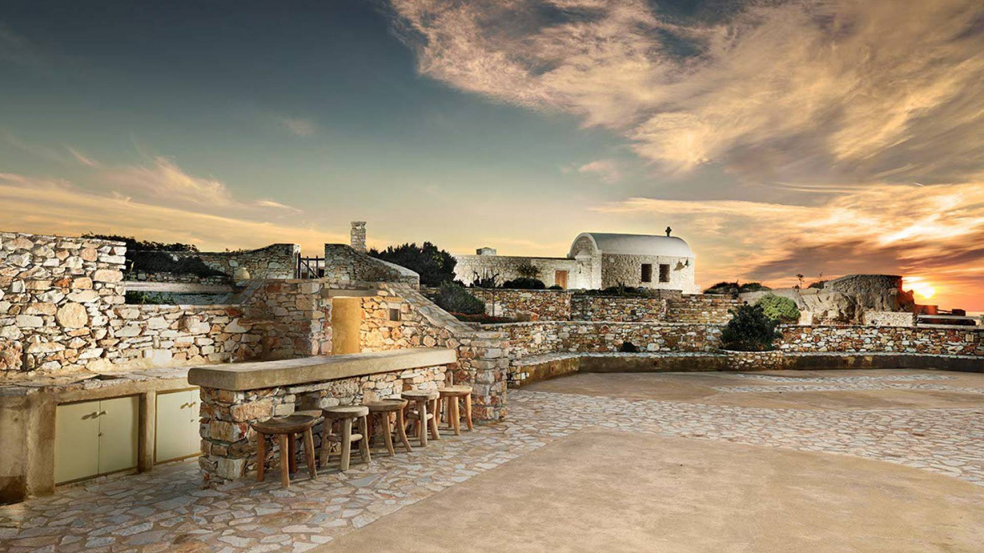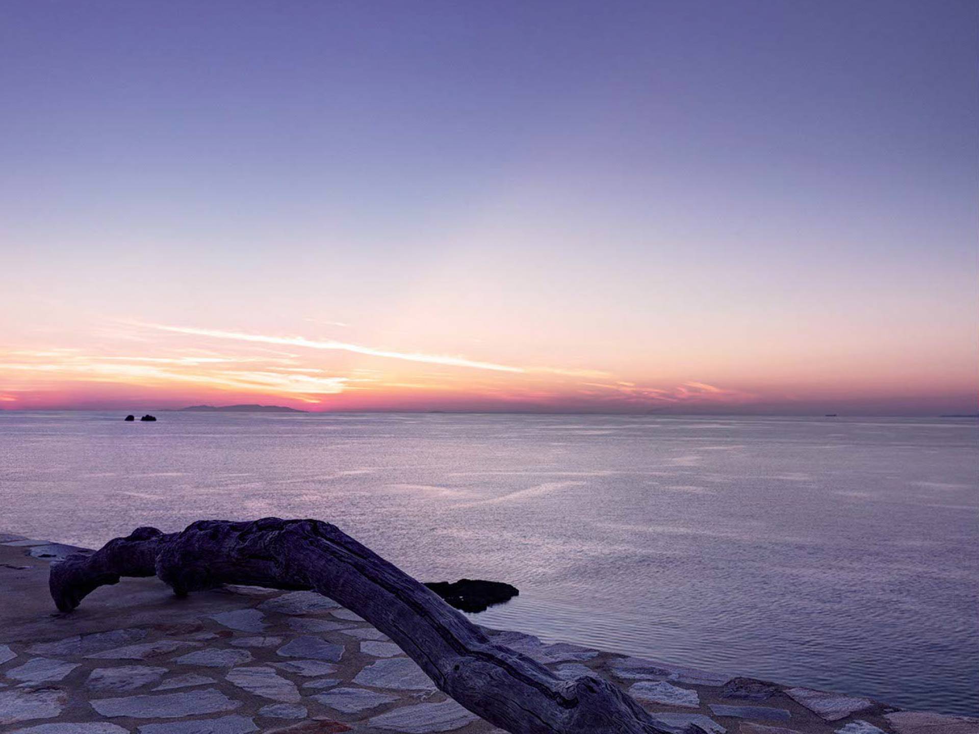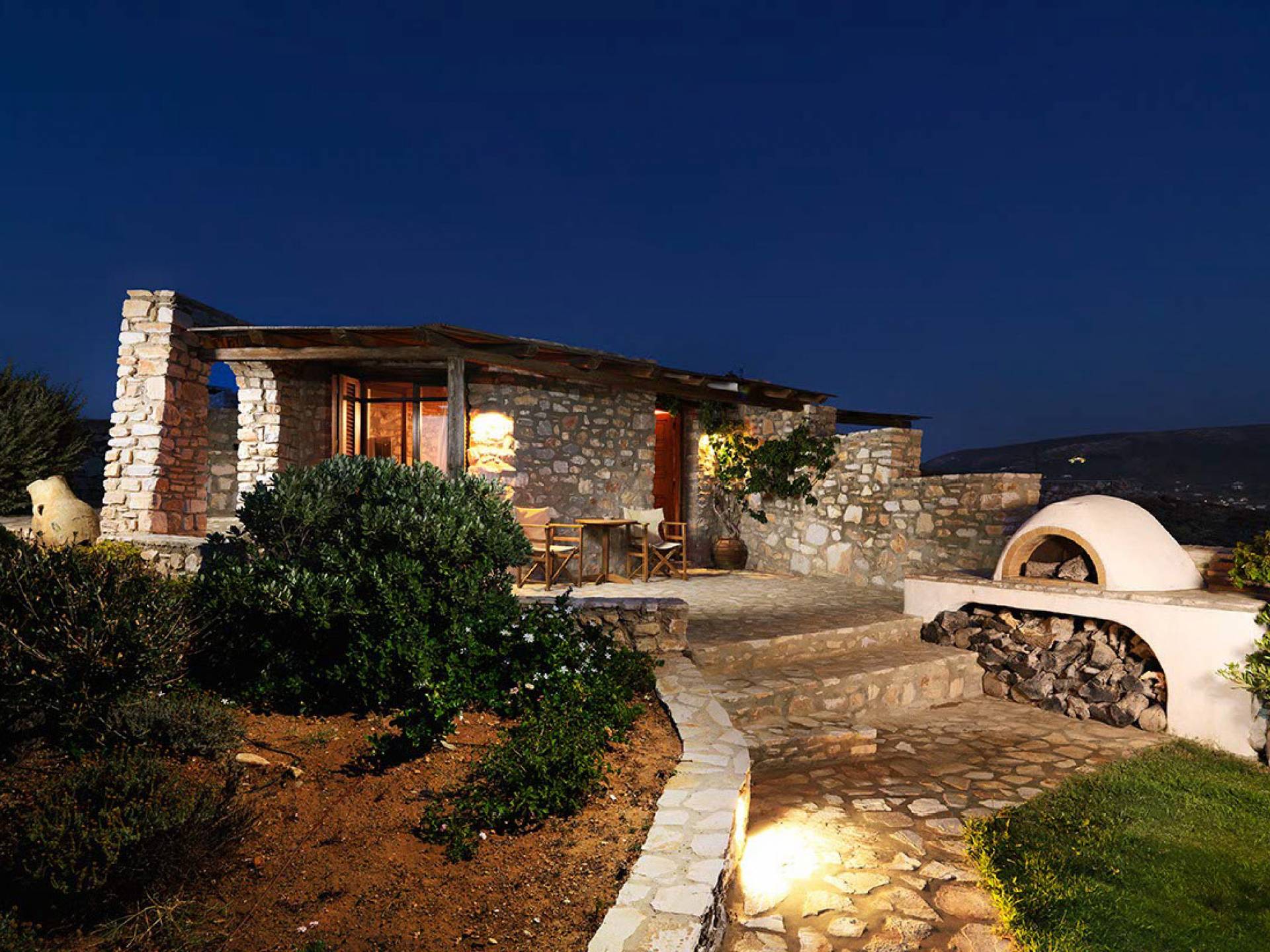 Οι ζεστές αποχρώσεις της ξύλινης επένδυσης συνδυάζονται υπέροχα με τους ακατέργαστους πέτρινους τοίχους, ενώ το εκθαμβωτικό φως του ήλιου και η υπέροχη ατμόσφαιρα ευνοούν την πλήρη απόλαυση του άγριου κυκλαδίτικου τοπίου.