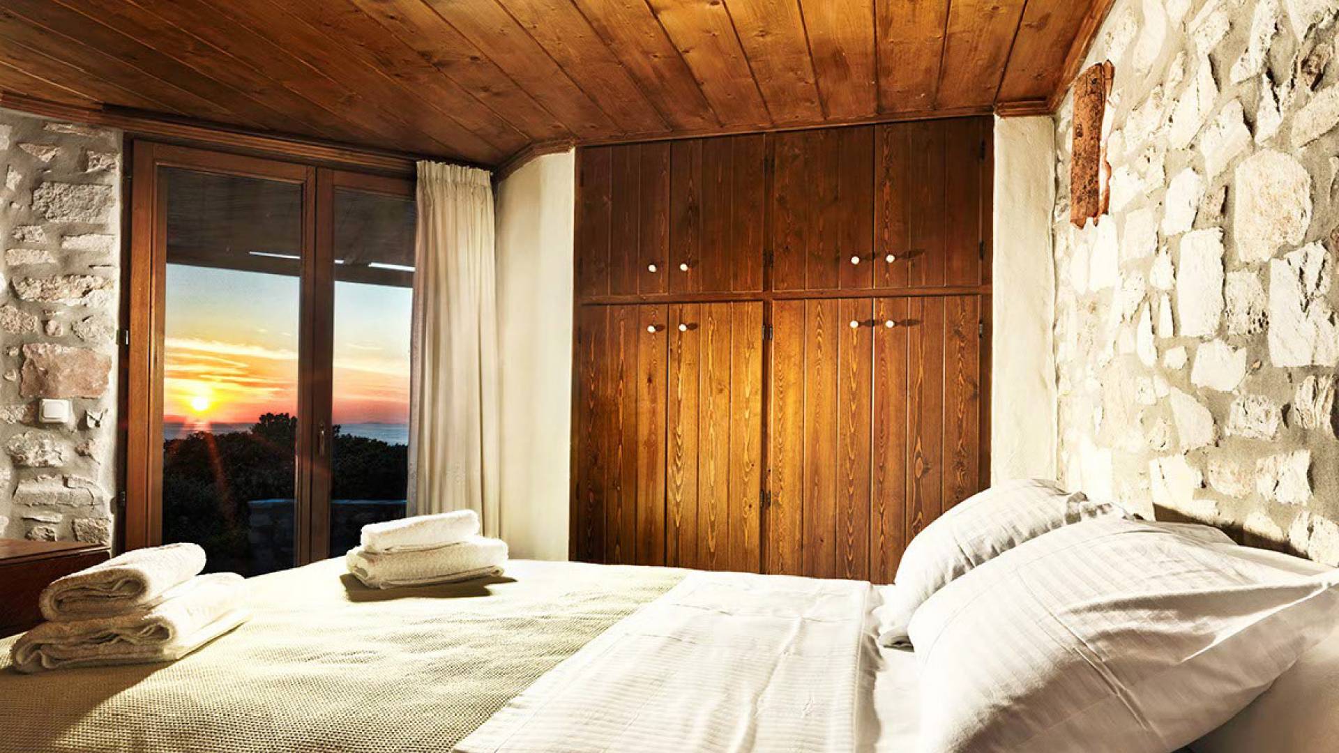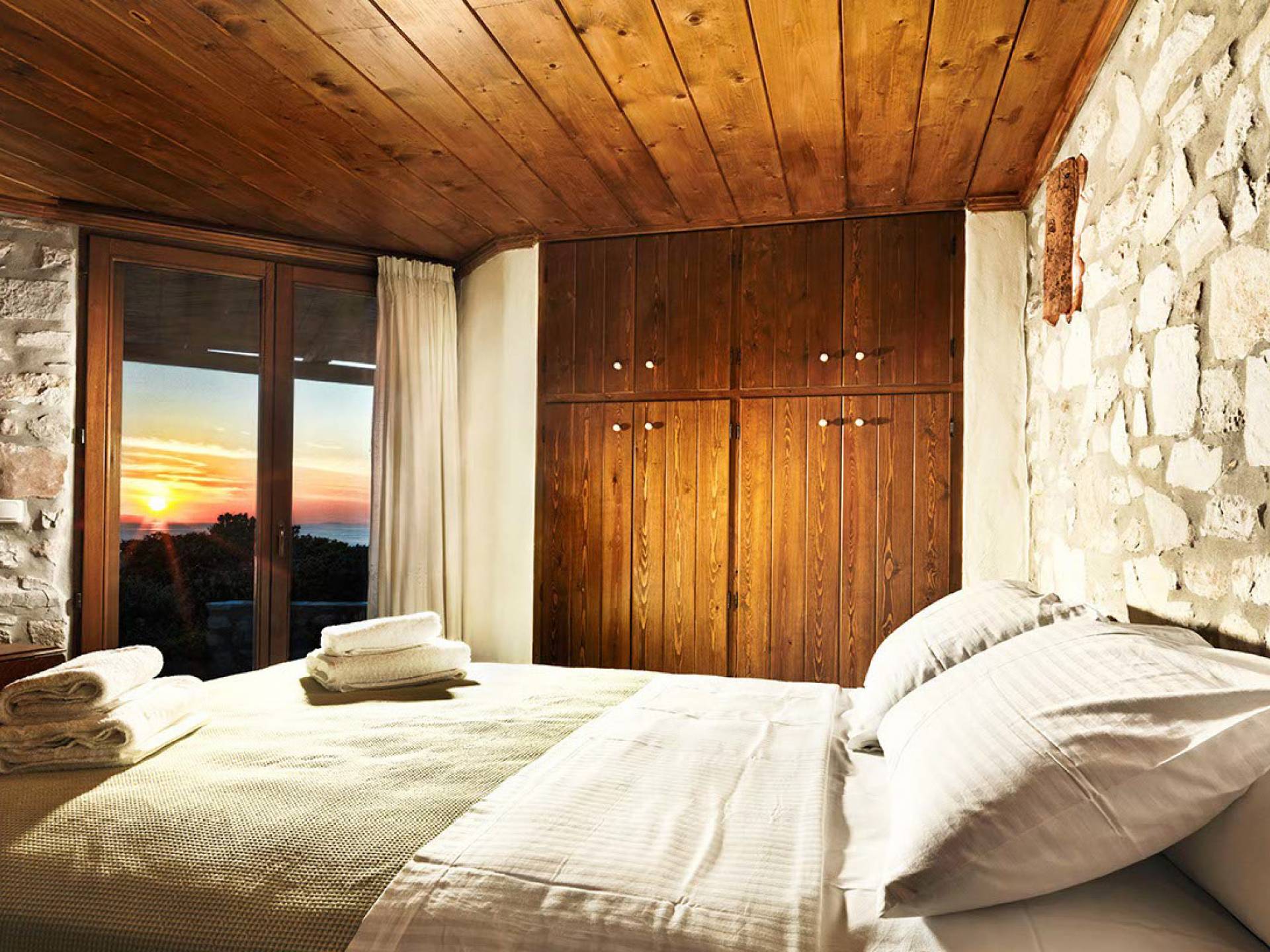 Η βίλα έχει σχεδιαστεί με σεβασμό στην παραδοσιακή κυκλαδίτικη αρχιτεκτονική, ώστε οι επισκέπτες να έχουν μια άνετη διαμονή σε δύο ξεχωριστά υπνοδωμάτια. Το κύριο υπνοδωμάτιο στο κυρίως σπίτι διαθέτει ένα κρεβάτι king size, κλιματισμό, τηλεόραση και ένα μικρό γραφείο. Υπάρχει ξεχωριστός αυτόνομος ξενώνας, 5 μέτρα μακριά με κρεβάτι king size, τηλεόραση, air-condition, μικρή κουζίνα, ψυγείο και βεράντα με πέργκολα όπου οι επισκέπτες μπορούν να καθίσουν για να πάρουν το πρωινό τους ή να πιουν ένα καλό ποτήρι κρασί, παρακολουθώντας ήλιος που αγγίζει τη θάλασσα.