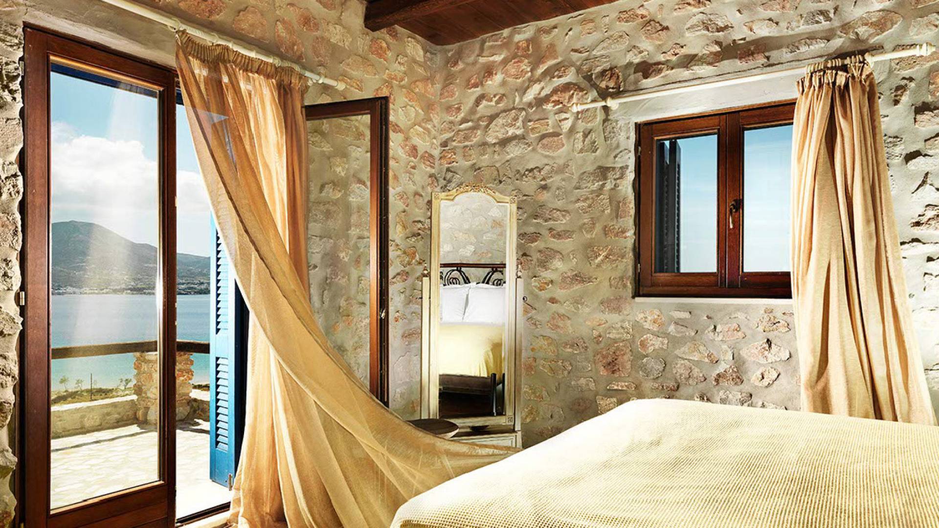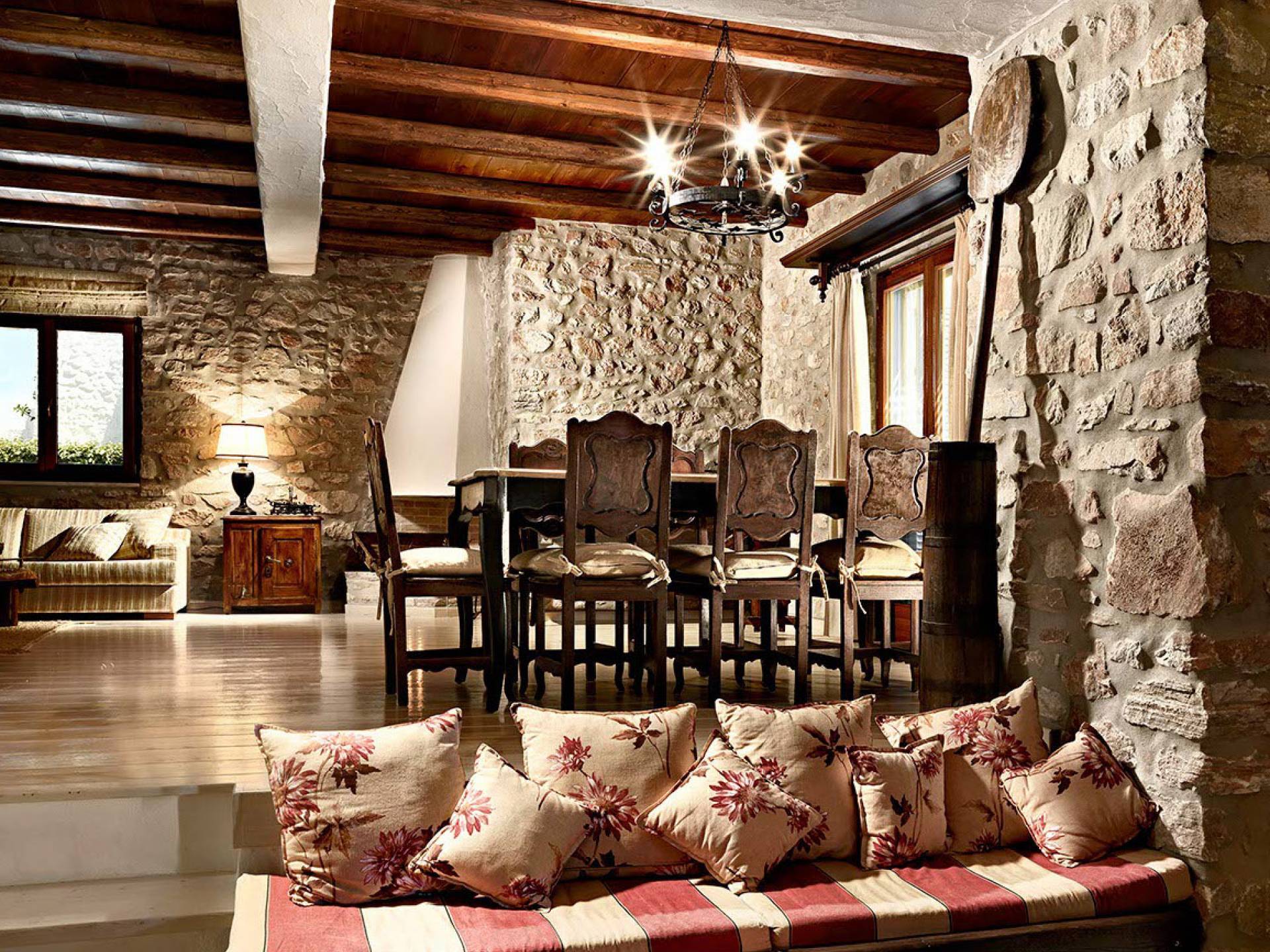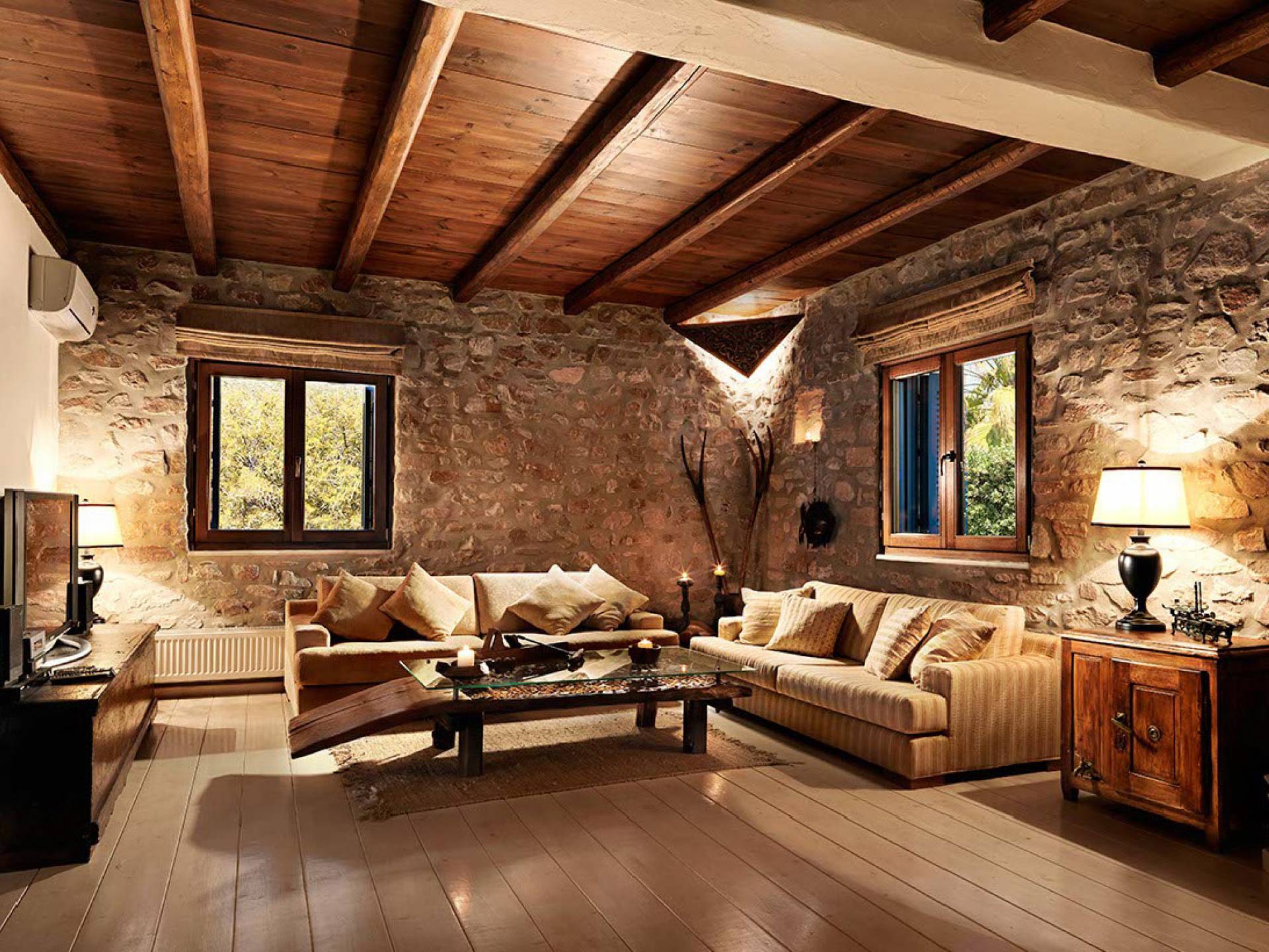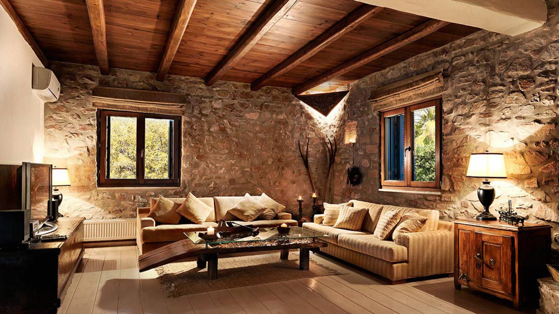 Οι ζεστές αποχρώσεις της ξύλινης επένδυσης συνδυάζονται υπέροχα με τους τραχούς πέτρινους τοίχους, ενώ το εκθαμβωτικό φως του ήλιου και η υπέροχη ατμόσφαιρα ευνοούν την πλήρη απόλαυση του άγριου κυκλαδίτικου τοπίου.