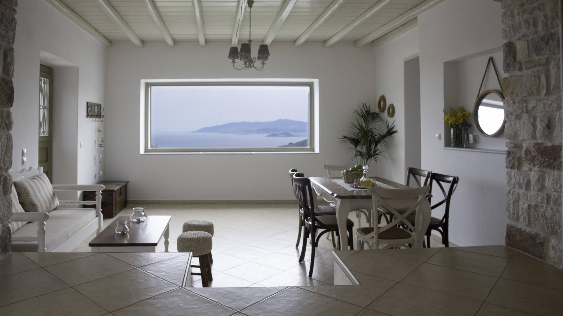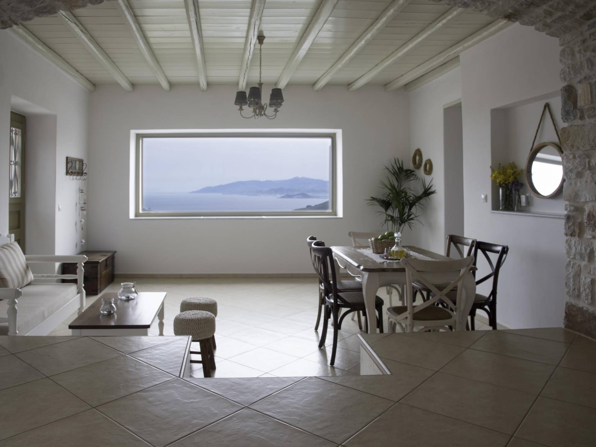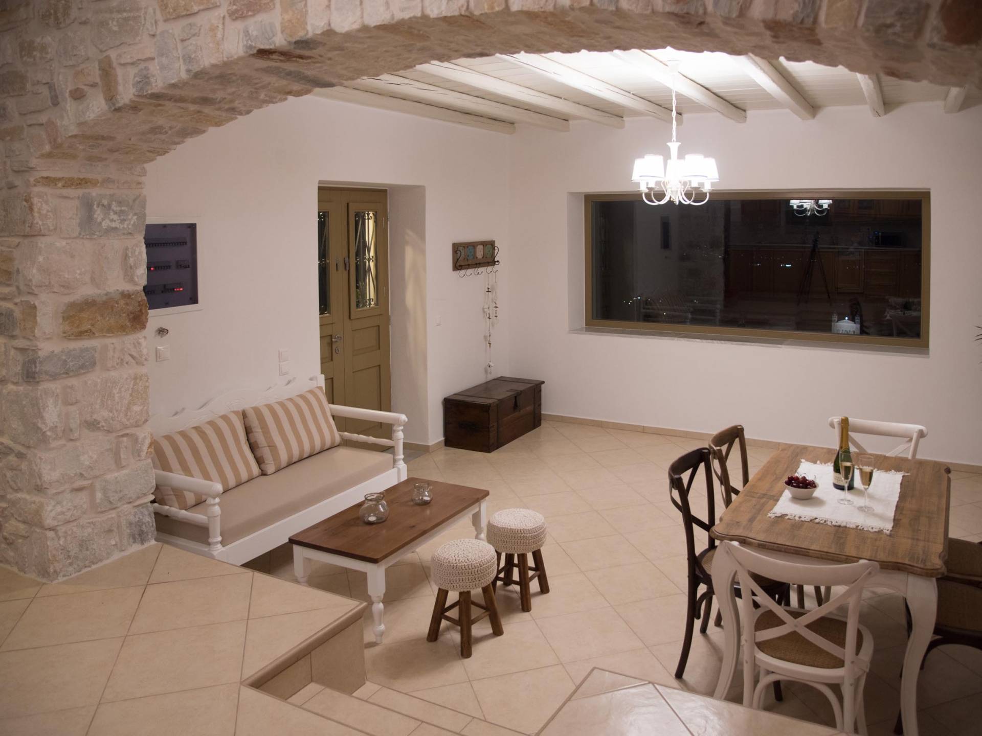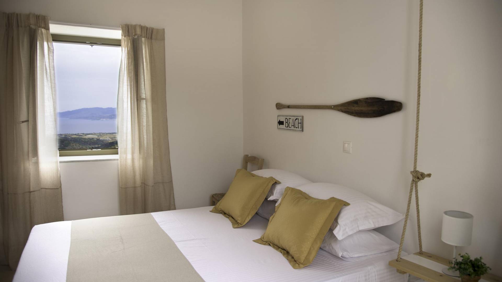 Στο χαμηλότερο επίπεδο, μπορείτε να βρείτε μια μίνι κουζίνα με εστίες μαγειρέματος, ένα μίνι ψυγείο και στο ίδιο σημείο έναν καναπέ που μπορεί να φιλοξενήσει ένα άτομο. Εδώ υπάρχουν επίσης δύο υπνοδωμάτια. Το μπάνιο διαθέτει ντους. Όλα τα υπνοδωμάτια έχουν θέα στο χωριό και στο Αιγαίο και χτιστά διπλά κρεβάτια (1,60μ x 2,0μ) και ένα (1,80μ x2,00μ). Υπάρχει επίσης πλυντήριο-στεγνωτήριο και σιδερώστρα.