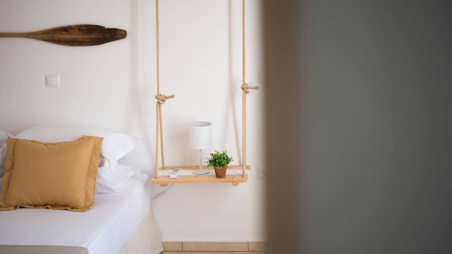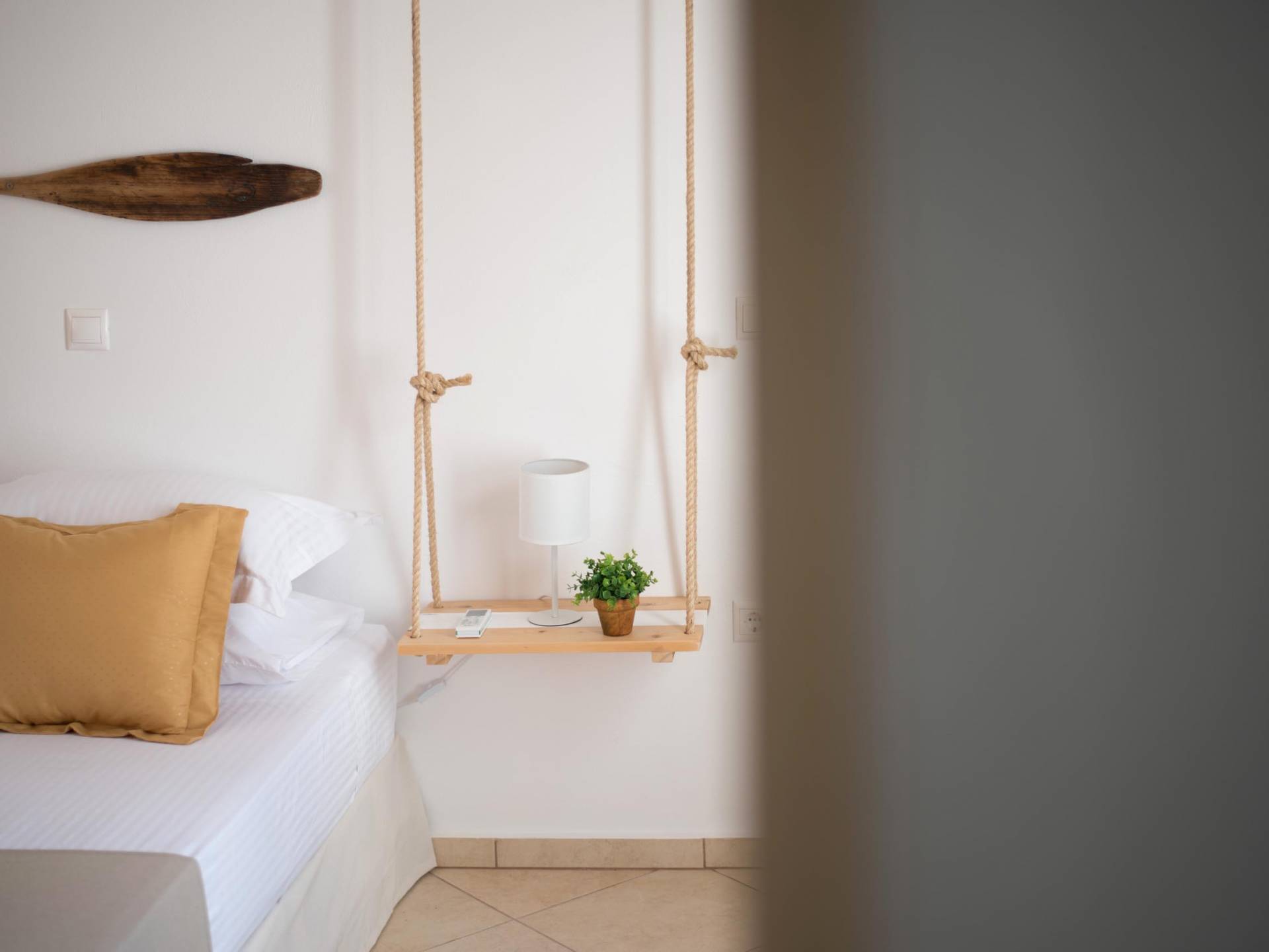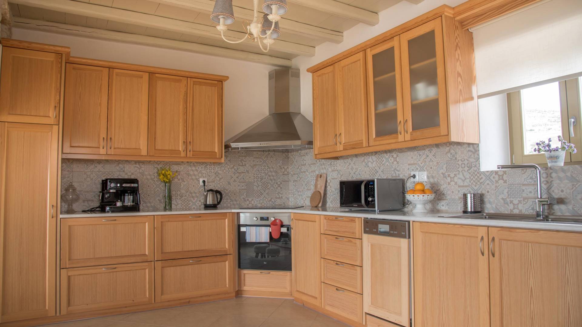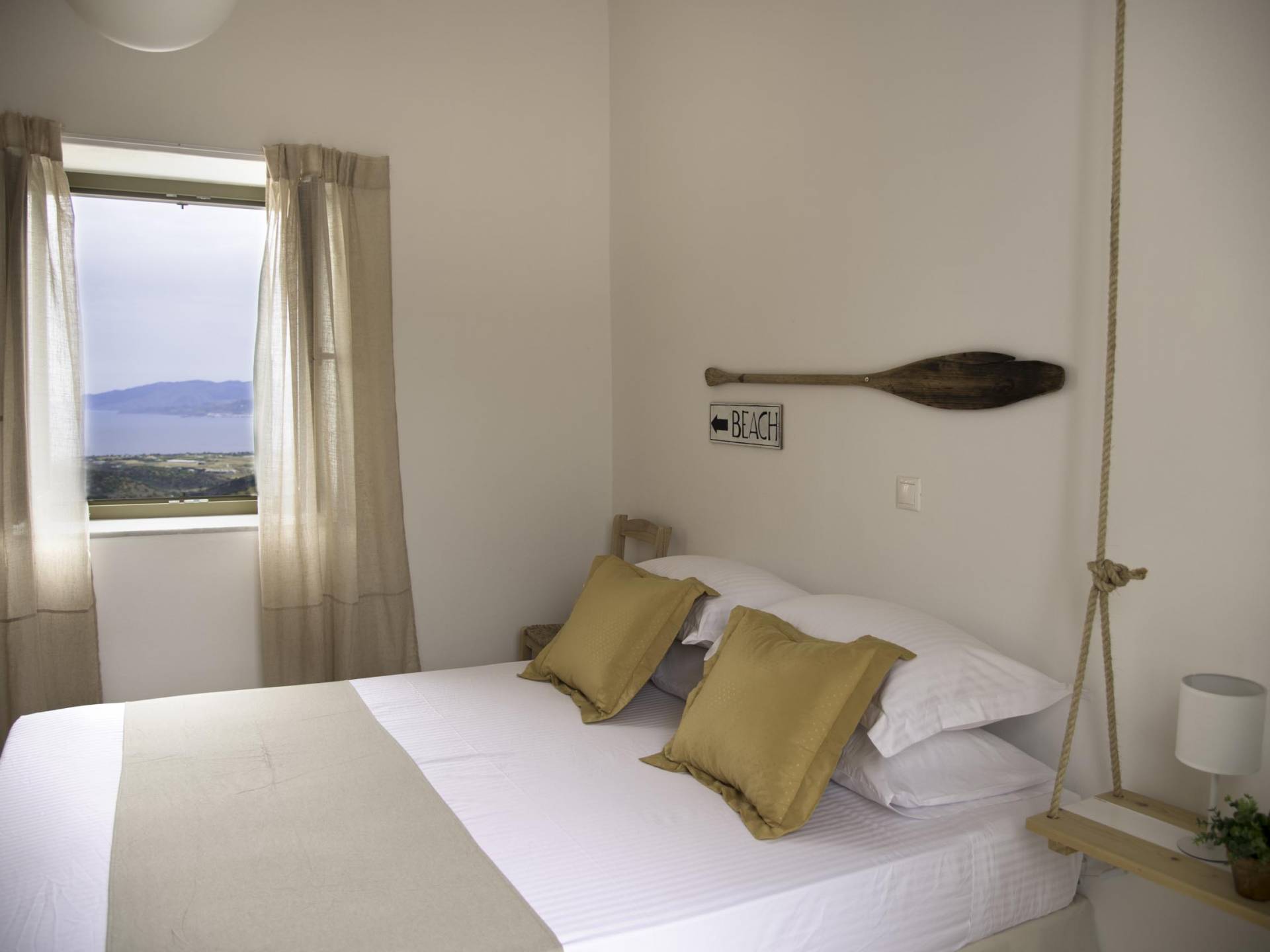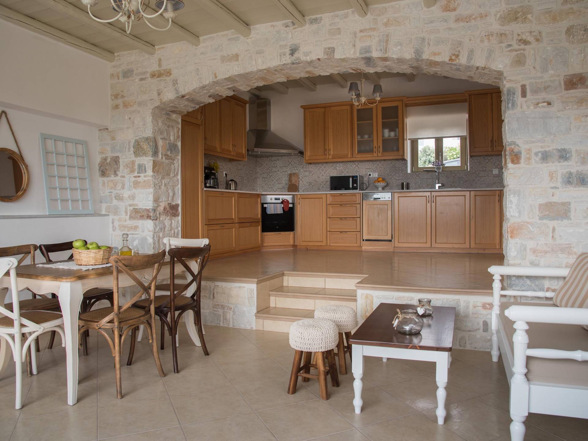 Στο χαμηλότερο επίπεδο, μπορείτε να βρείτε μια μίνι κουζίνα με εστίες μαγειρέματος, ένα μίνι ψυγείο και στο ίδιο σημείο έναν καναπέ που μπορεί να φιλοξενήσει ένα άτομο. Εδώ υπάρχουν επίσης δύο υπνοδωμάτια. Το μπάνιο διαθέτει ντους. Όλα τα υπνοδωμάτια έχουν θέα στο χωριό και στο Αιγαίο και χτιστά διπλά κρεβάτια (1,60μ x 2,0μ) και ένα (1,80μ x2,00μ). Υπάρχει επίσης πλυντήριο-στεγνωτήριο και σιδερώστρα.
