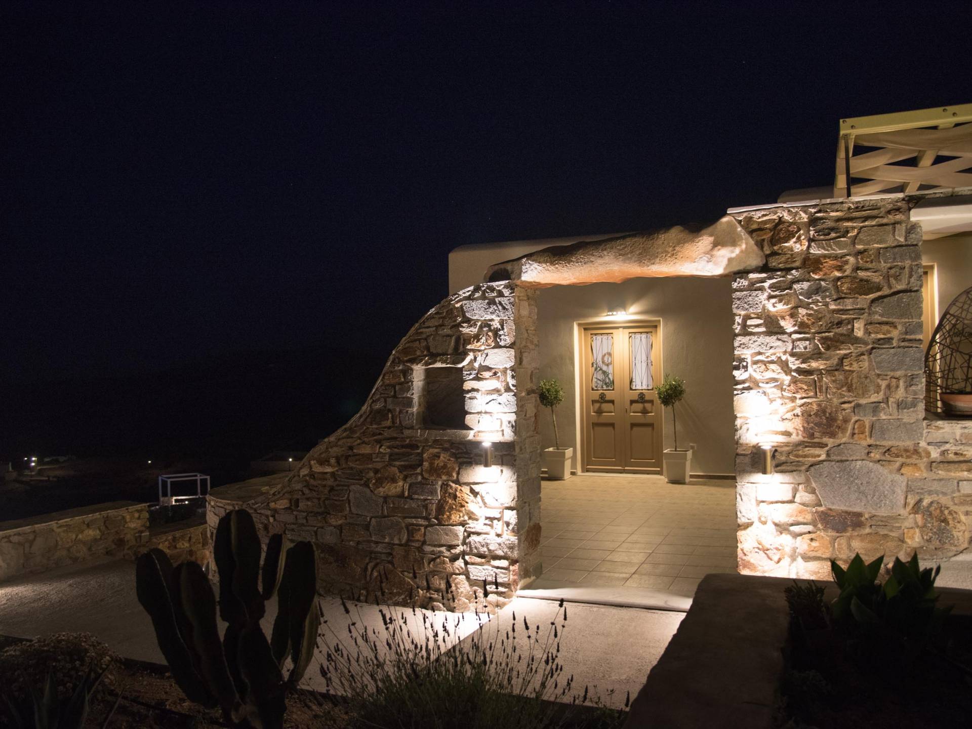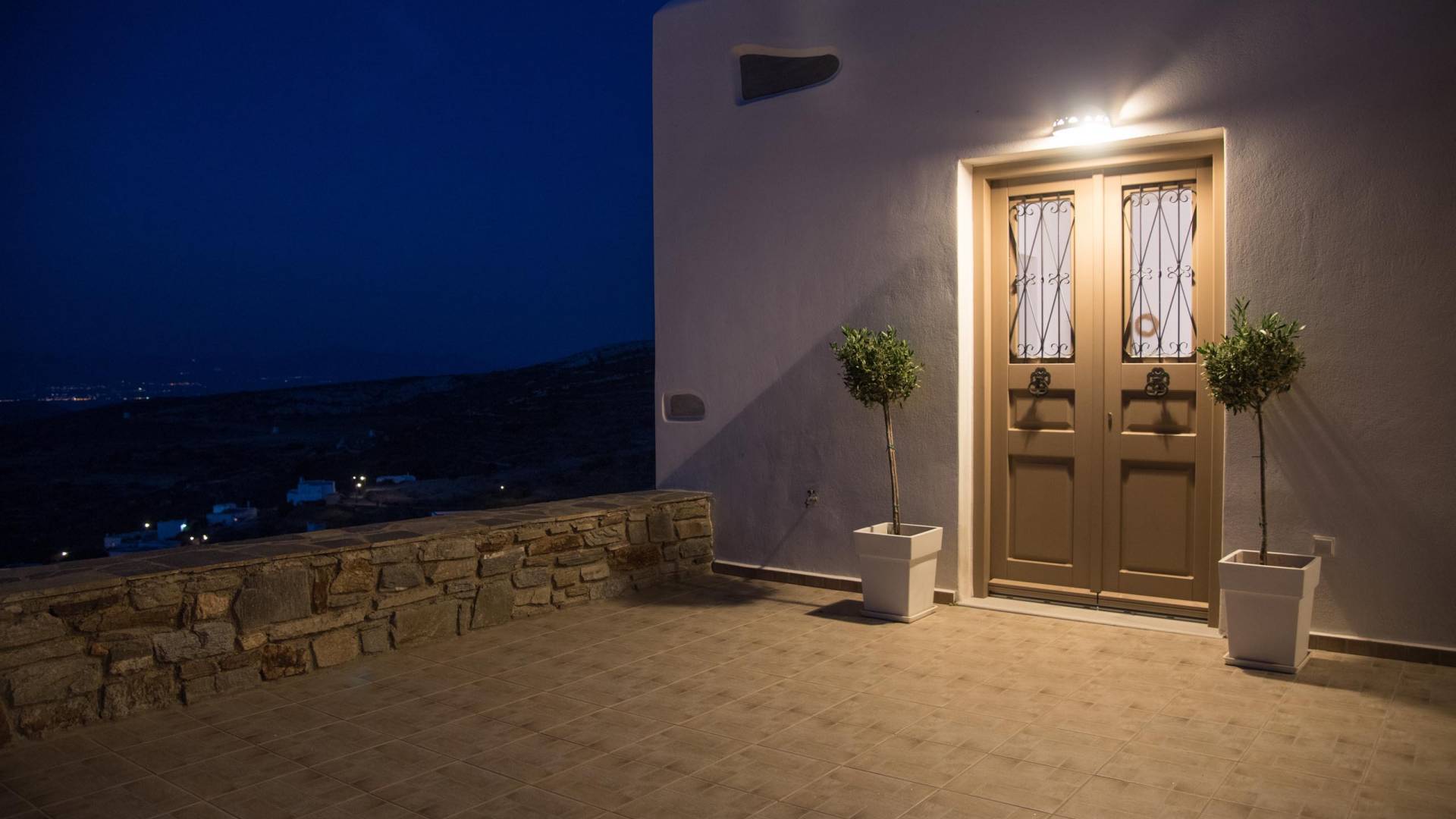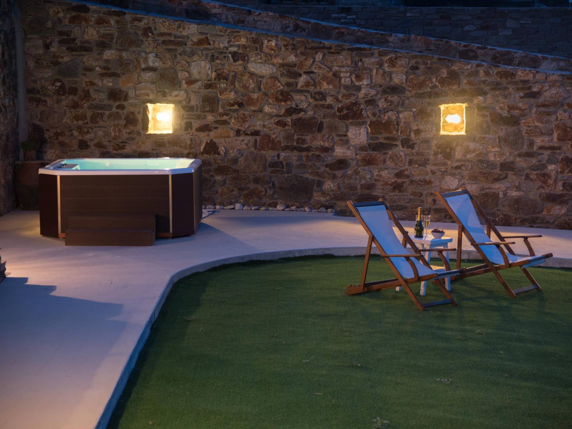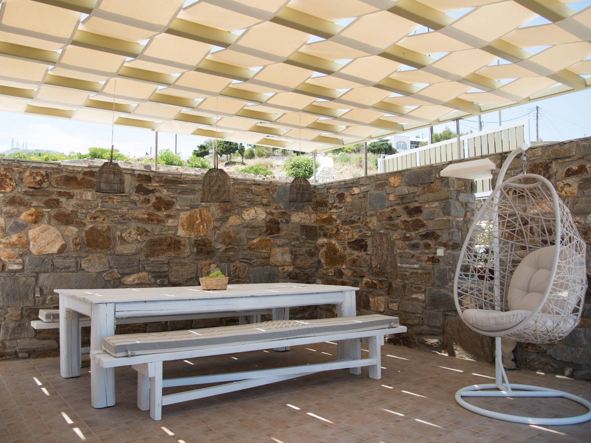 Υπαίθρια στον επάνω όροφο υπάρχει μια μεγάλη βεράντα όπου μπορείτε να απολαύσετε το γεύμα σας στην απεριόριστη θέα στο Αιγαίο. Το τραπέζι μπορεί εύκολα να φιλοξενήσει 12 άτομα και μπορείτε να ψήσετε σε μπάρμπεκιου αερίου. Κάτω υπάρχει ένα υπαίθριο τζακούζι για 5 άτομα και ένας όμορφος κήπος με δέντρα και γρασίδι.