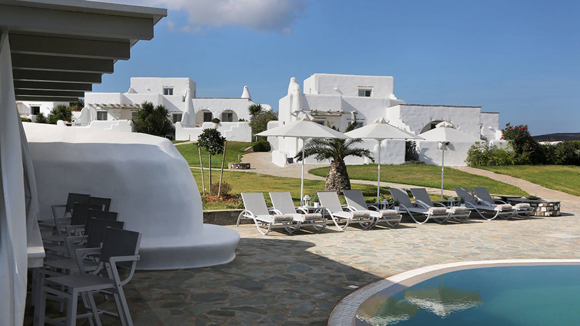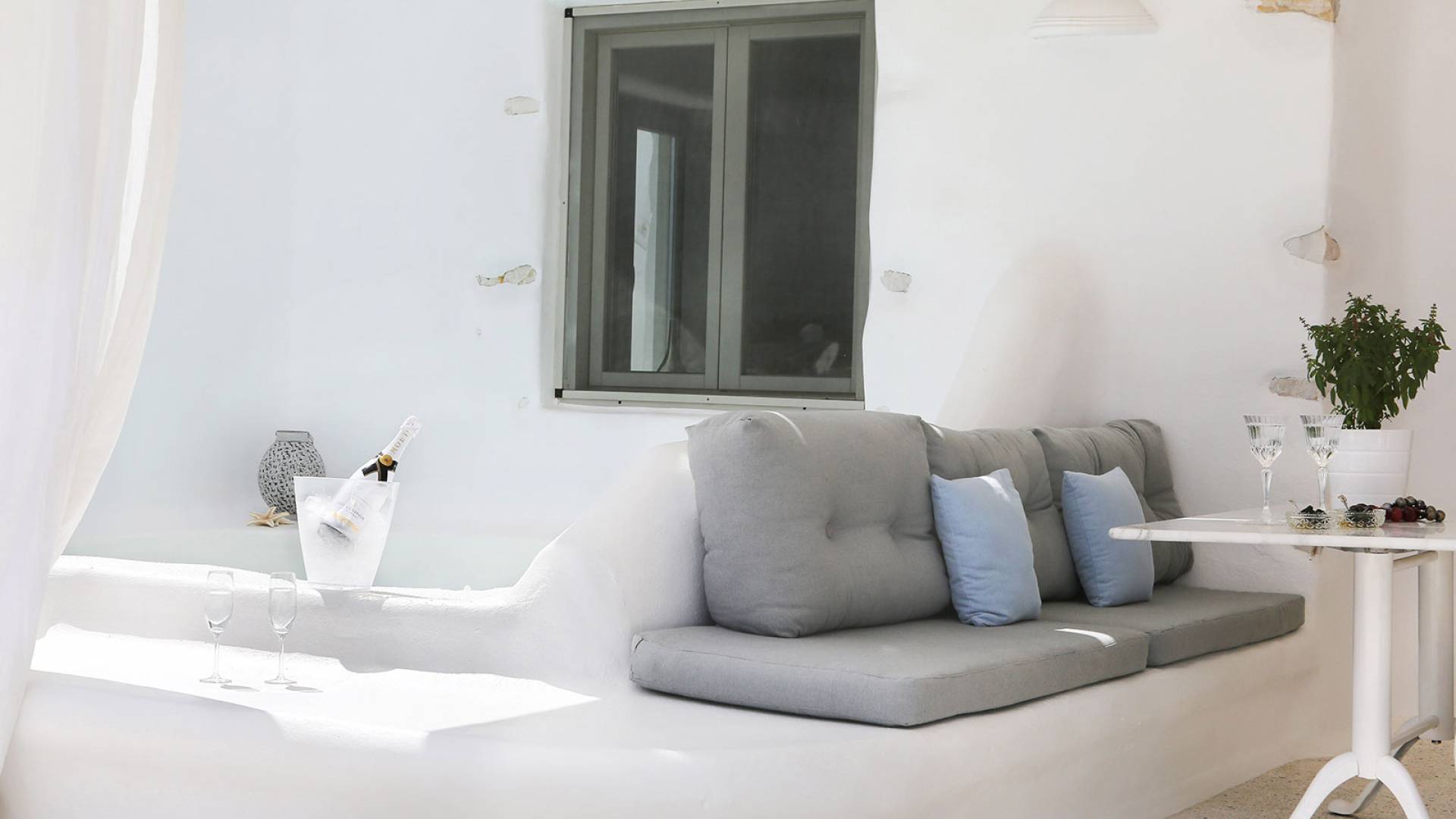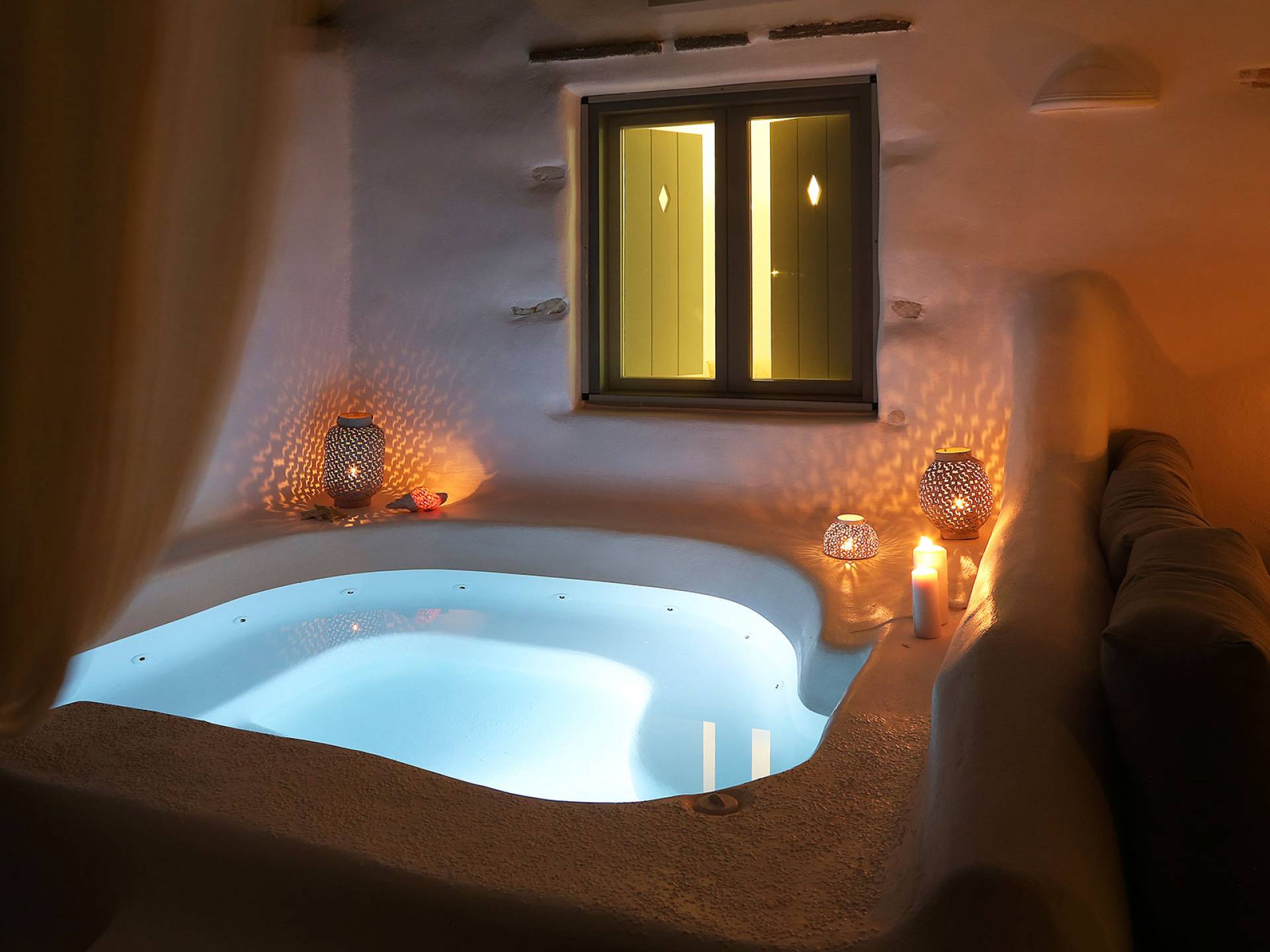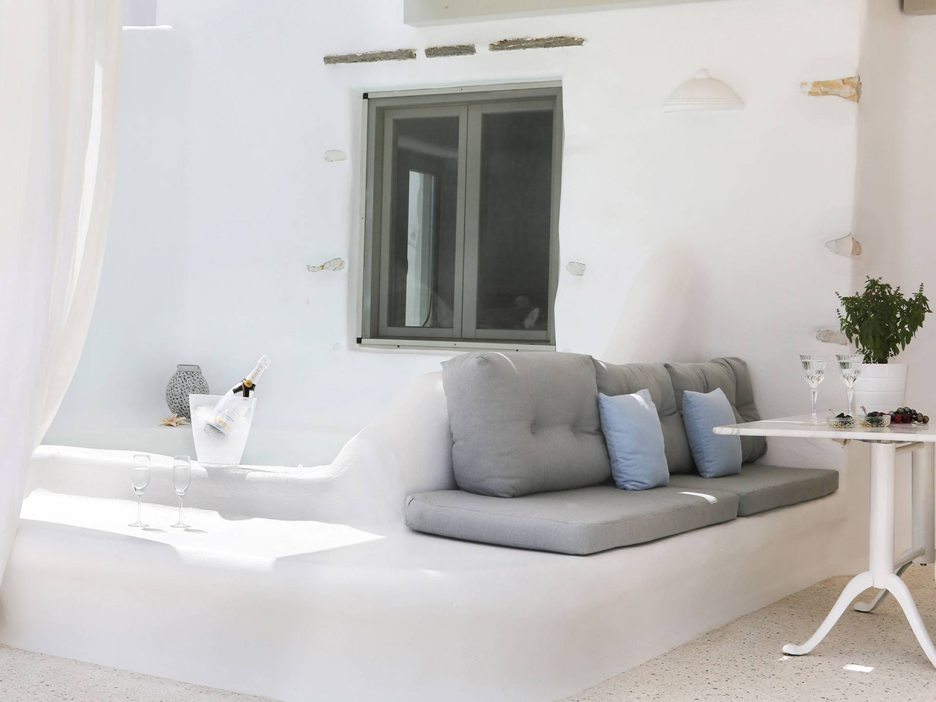 Μπορείτε να χαλαρώσετε και να χαλαρώσετε στην φιλική προς το περιβάλλον πισίνα ή στο ιδιωτικό υδρομασάζ στο μπαλκόνι σας και θα νιώσετε σαν στο σπίτι σας στα άνετα και πολυτελή καταλύματά μας με παραδοσιακή κυκλαδίτικη αρχιτεκτονική, ψηφιδωτά δάπεδα, χτιστά κρεβάτια και καναπέδες.