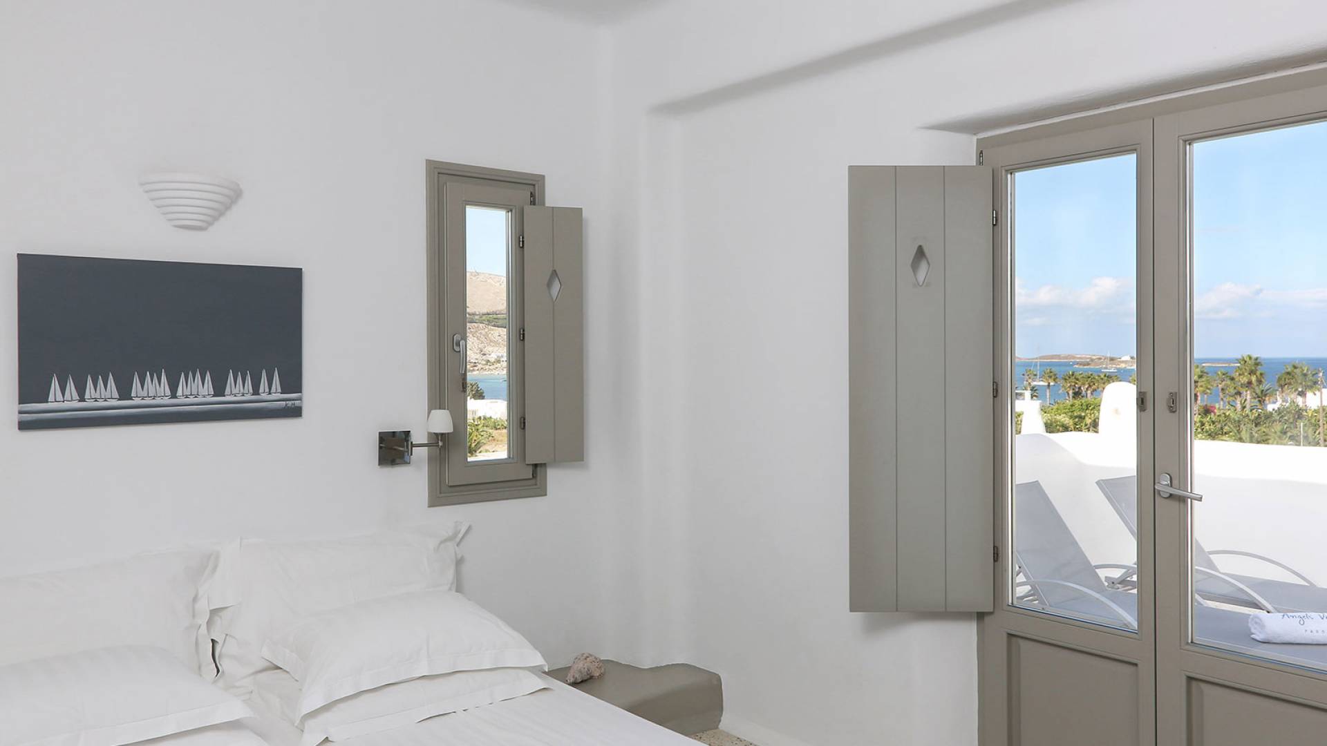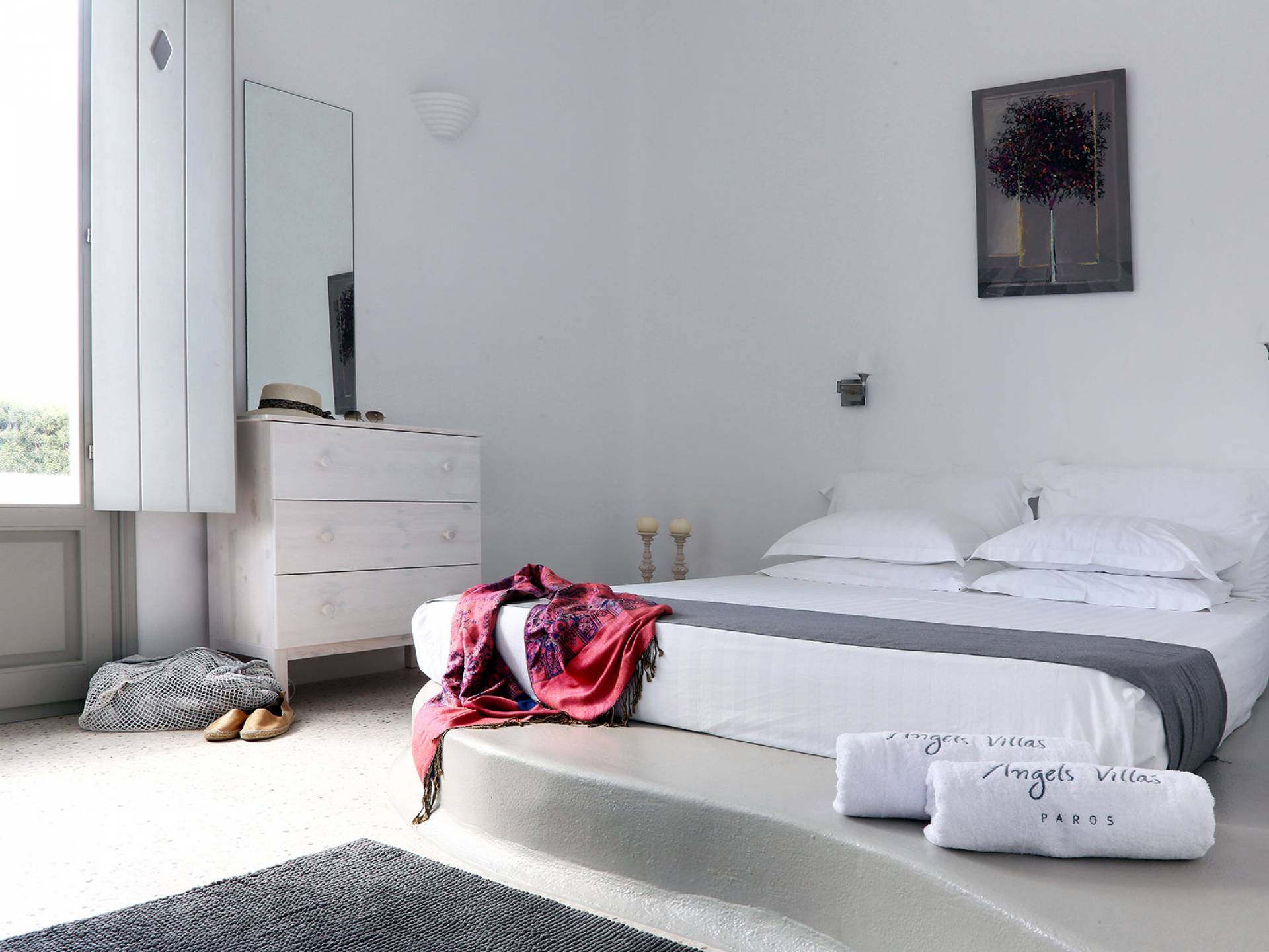 Επιπλέον, υπάρχει μπαλκόνι με καθιστικό, ενσωματωμένο υδρομασάζ και ξαπλώστρες, όπου μπορείτε να απολαύσετε την όμορφη θέα στον κόλπο της Νάουσας. Ανεβαίνοντας τη σκάλα στον πρώτο όροφο, υπάρχει ένα άλλο μεγάλο ιδιωτικό υπνοδωμάτιο με διπλό χτιστό κρεβάτι και άλλο ιδιωτικό μπαλκόνι με υπέροχη θέα στη Νάουσα και τις Κολυμπήθρες.