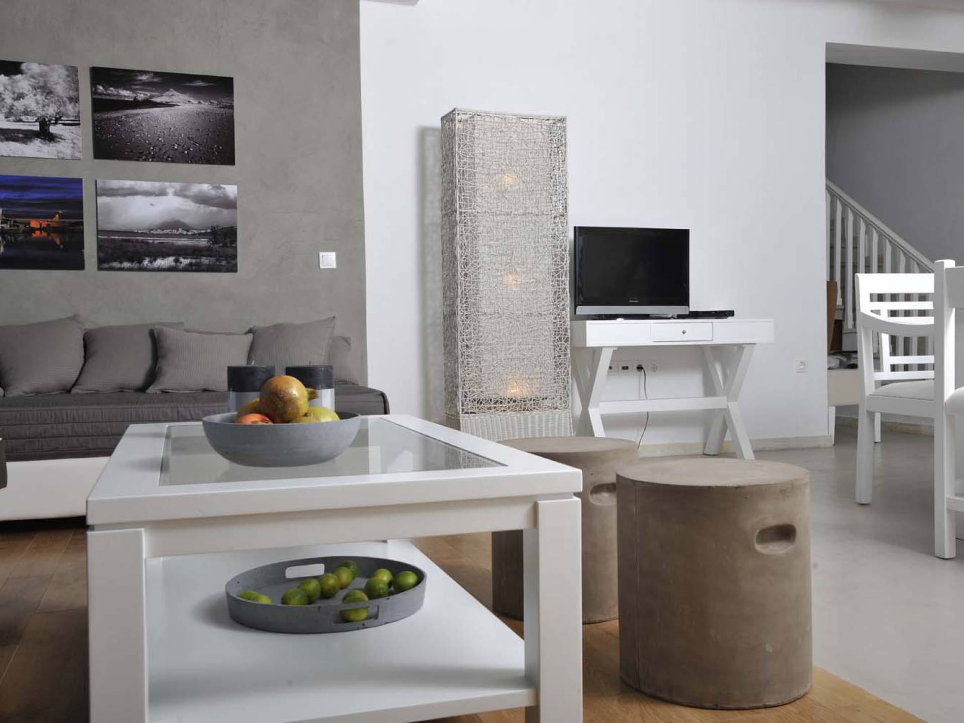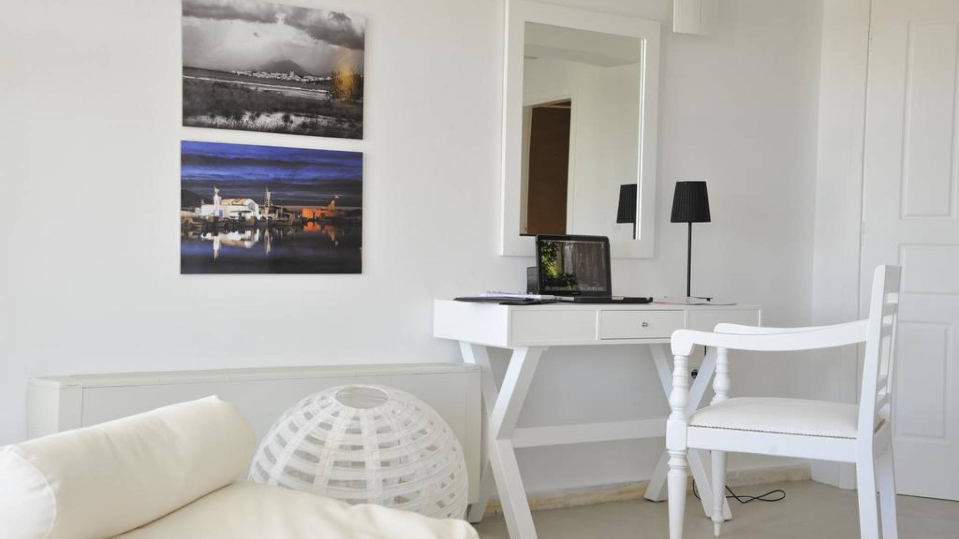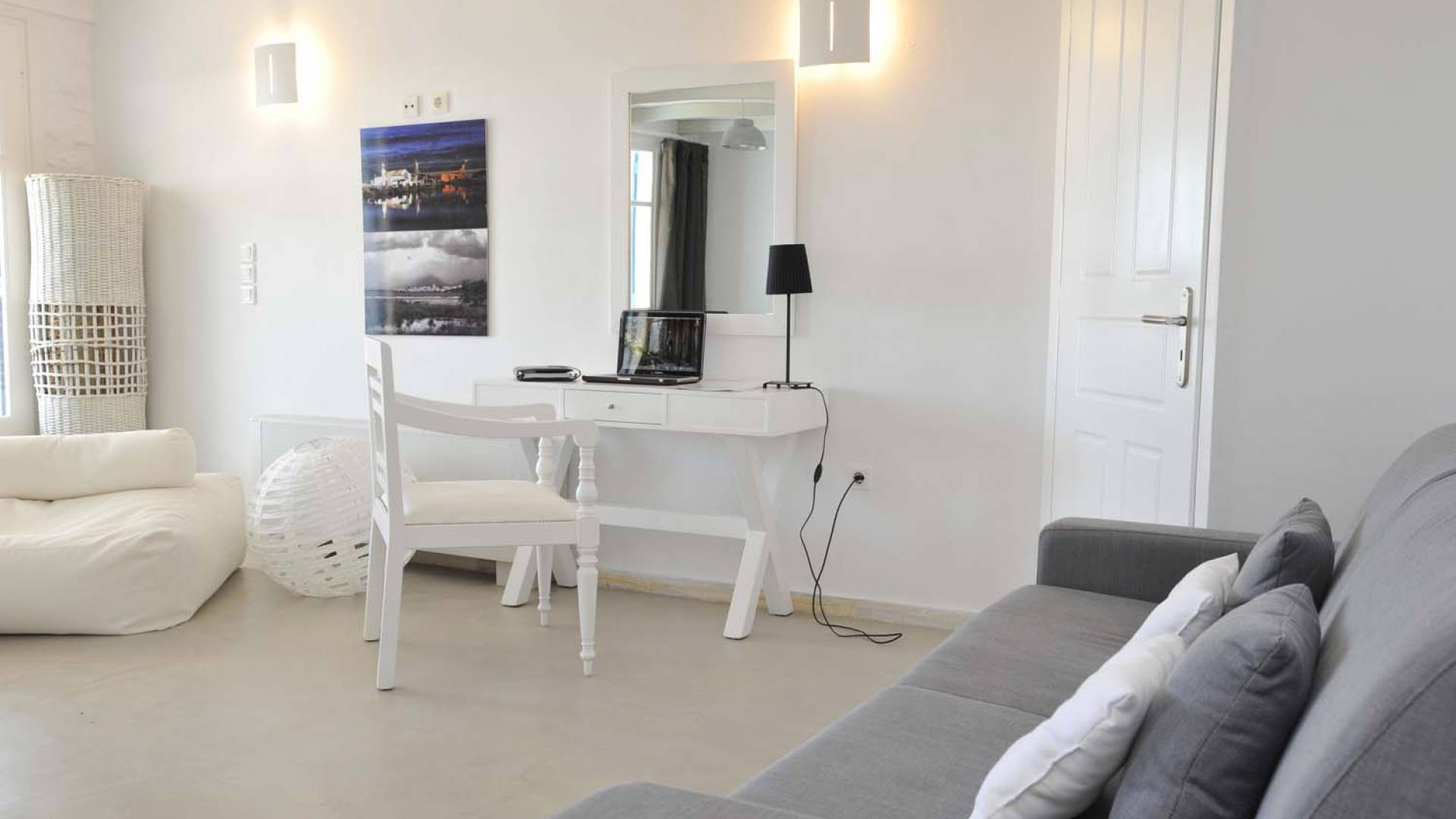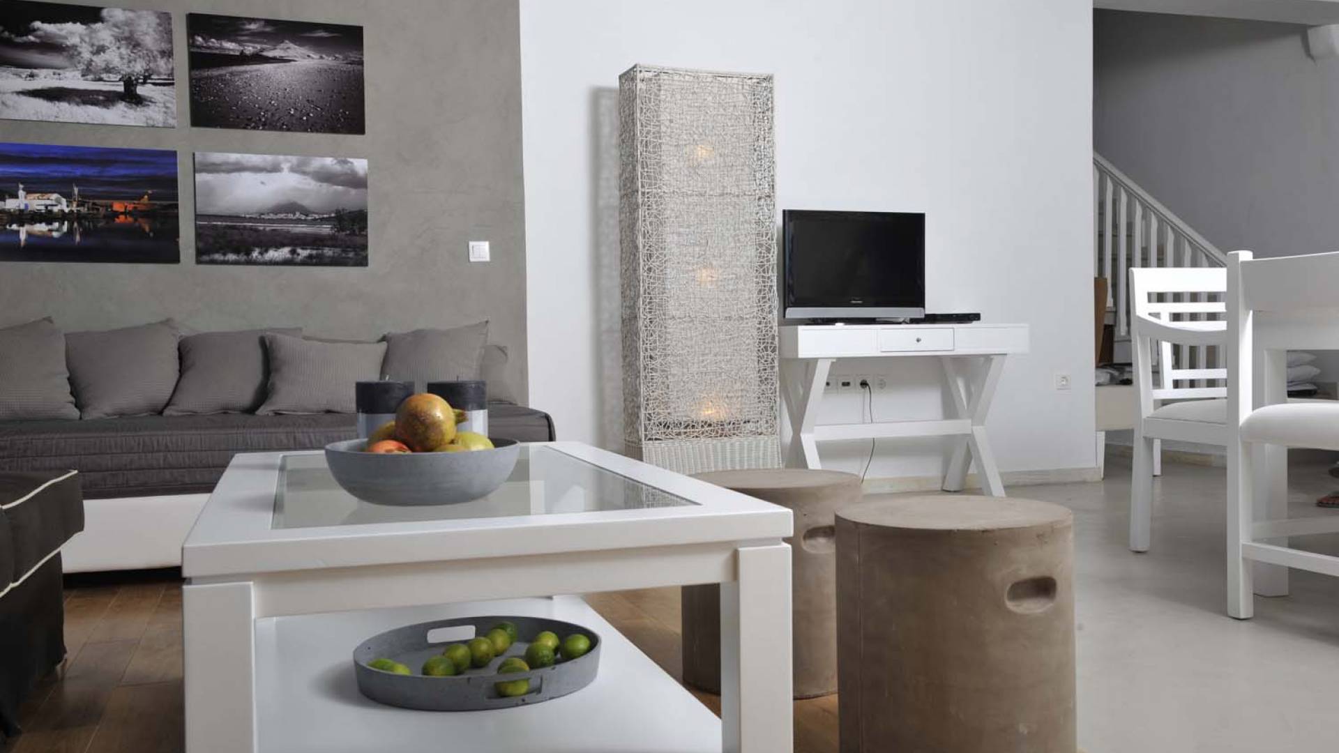 Διαθέτει ένα ευρύχωρο σαλόνι με τζάκι και πολλά πηγάδια σχεδιασμένα με έπιπλα όπως 2 ξύλινες πολυθρόνες, έναν λευκό καναπέ-κρεβάτι και έναν γκρι χνουδωτό καναπέ δίπλα στο παράθυρο με θέα στη Santa Maria. Ένα ξεχωριστό master υπνοδωμάτιο με κρεβάτι king-size και μπάνιο με καμπίνα ντους βρίσκεται στο ίδιο επίπεδο όπου βρίσκεται η κύρια είσοδος από μέταλλο με ξύλινη επένδυση. Η μικρή κουζίνα βρίσκεται στο ίδιο επίπεδο. Στον πρώτο όροφο βρίσκεται το 2ο master υπνοδωμάτιο 25 τ.μ. με king-size κρεβάτι και μπάνιο με καμπίνα ντους. Τα έπιπλα είναι εξ ολοκλήρου σε λευκά χρώματα. Στο κάτω επίπεδο βρίσκονται τα άλλα 2 master υπνοδωμάτια, το ένα είναι 45 τ.μ με μπάνιο 15 τ.μ.! Όλα έχουν king-size κρεβάτια και ξεχωριστά μπάνια. Τα δάπεδα του μπάνιου είναι σε λευκό χρώμα και οι τοίχοι και οι οροφές είναι από ιταλική ρητίνη & τσιμέντο στόκου. Ολόκληρο το οικόπεδο είναι 2.000τμ και η βίλα μπορεί να φιλοξενήσει εύκολα 8 ενήλικες. Χώρος στάθμευσης για 2 αυτοκίνητα.
