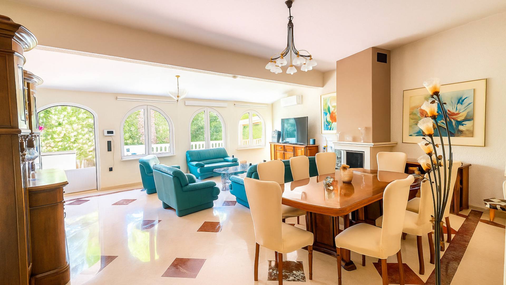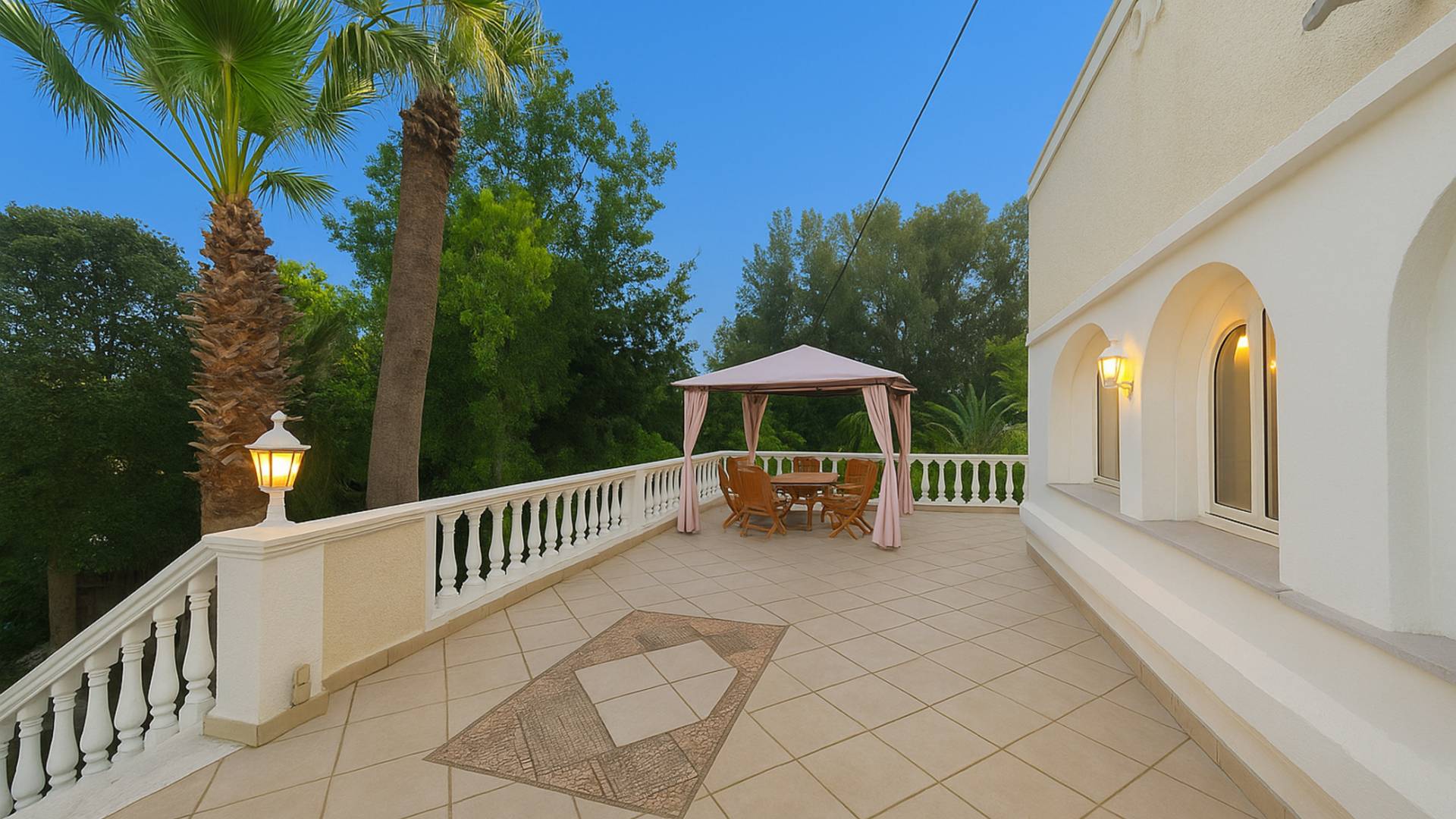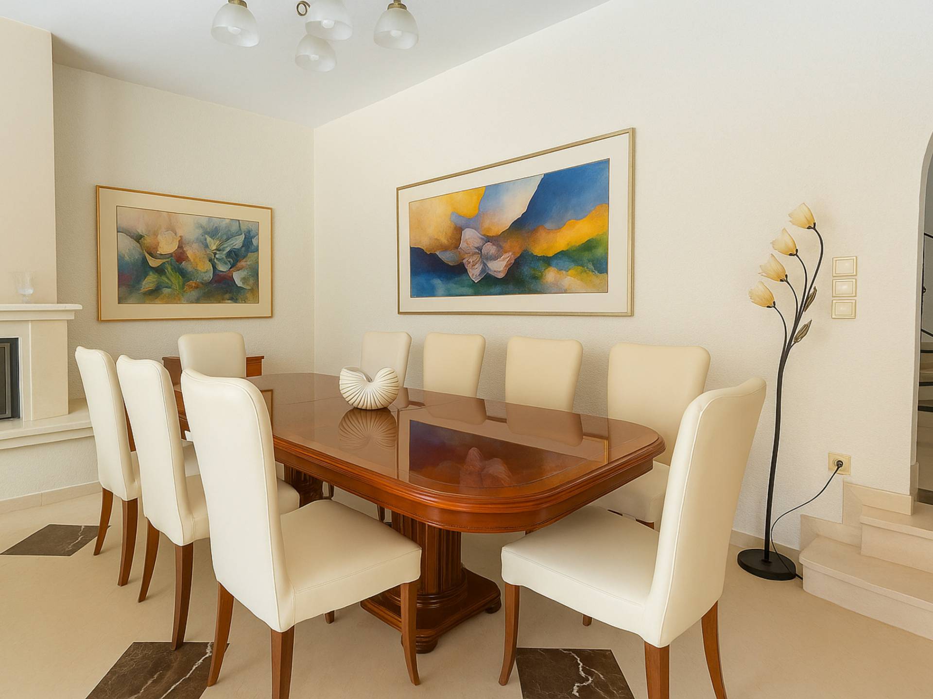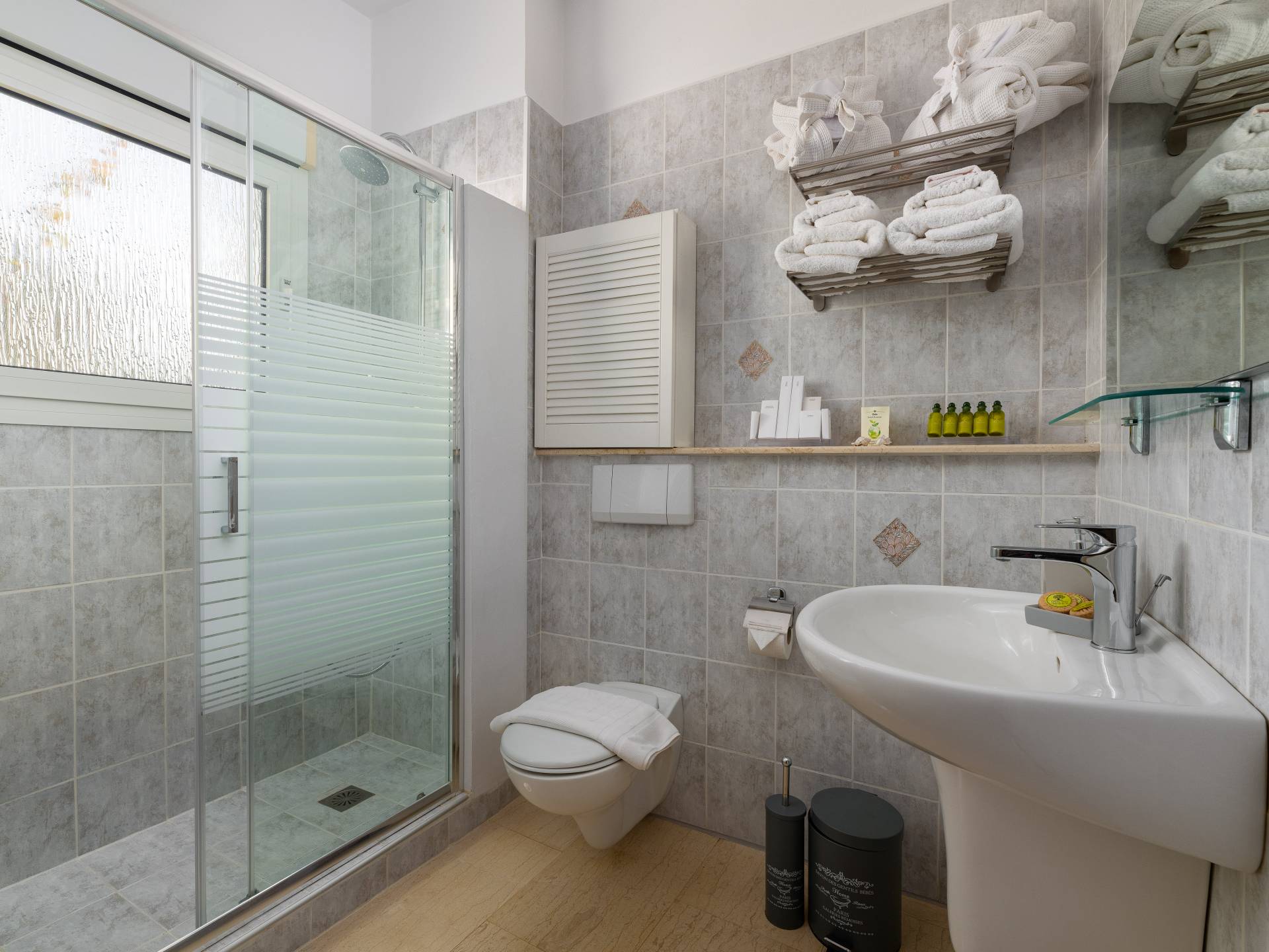 Το εσωτερικό είναι παρόμοια διακοσμημένο σε νεοκλασικό και μοντέρνο στιλ, είναι λειτουργικό και προσφέρει όλες τις απαραίτητες εγκαταστάσεις και σύγχρονες ανέσεις για μια ευχάριστη, χαλαρωτική και αξέχαστη διαμονή. Αποτελείται από 3 υπνοδωμάτια που μπορούν να φιλοξενήσουν έως 8 άτομα, 3 μπάνια, ξεχωριστό μεγάλο χώρο κουζίνας και μεγάλο σαλόνι. Κάθε δωμάτιο οδηγεί σε μπαλκόνι ή βεράντα με πανοραμική και απρόσκοπτη θέα στον κήπο, την πισίνα και το μαγευτικό τοπίο, το οποίο μπορεί κανείς να αγναντέψει ακόμη και από το εσωτερικό. Εκτός από την κύρια είσοδο, η Βίλα είναι προσβάσιμη μέσω μιας αυτόματης μεγάλης πύλης με άφθονο χώρο στάθμευσης. Η βίλα περιβάλλεται από έναν πανέμορφο κήπο 2000 τμ, ο οποίος περιλαμβάνει όμορφα μεσογειακά δέντρα και φυτά, τα οποία σε συνδυασμό με την πισίνα, τη μικρή παιδική πισίνα, την παιδική χαρά, το περίπτερο με το υδρομασάζ και την ξύλινη τραπεζαρία, θα σε κάνουν να νιώθεις ότι βρίσκεσαι σε έναν επίγειο «Μικρό Παράδεισο». Όλα τα παραπάνω βρίσκονται σε απόλυτη ιδιωτικότητα και μακριά από τα αδιάκριτα βλέμματα αφού η Βίλα είναι περιφραγμένη και το εσωτερικό δεν φαίνεται από έξω.